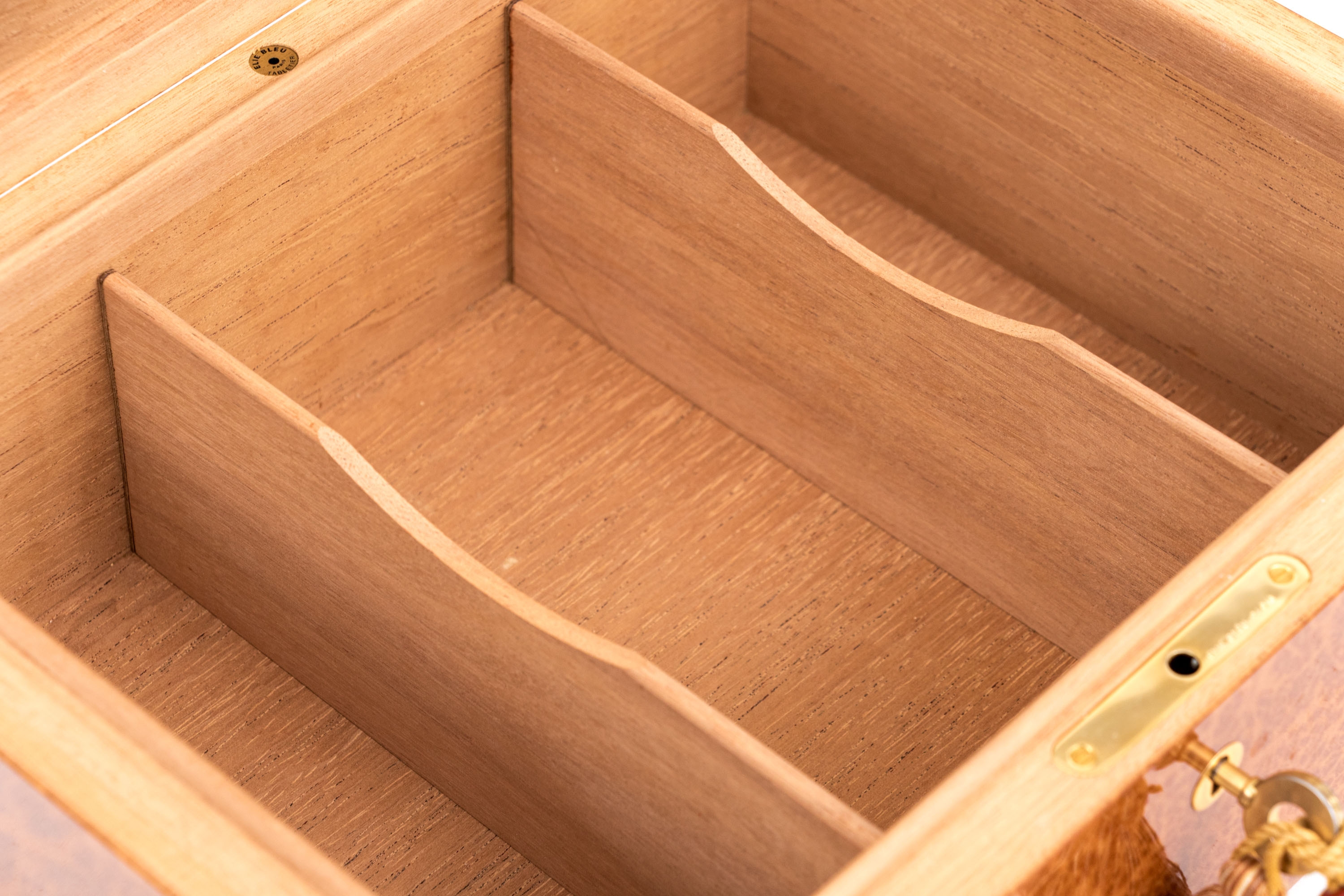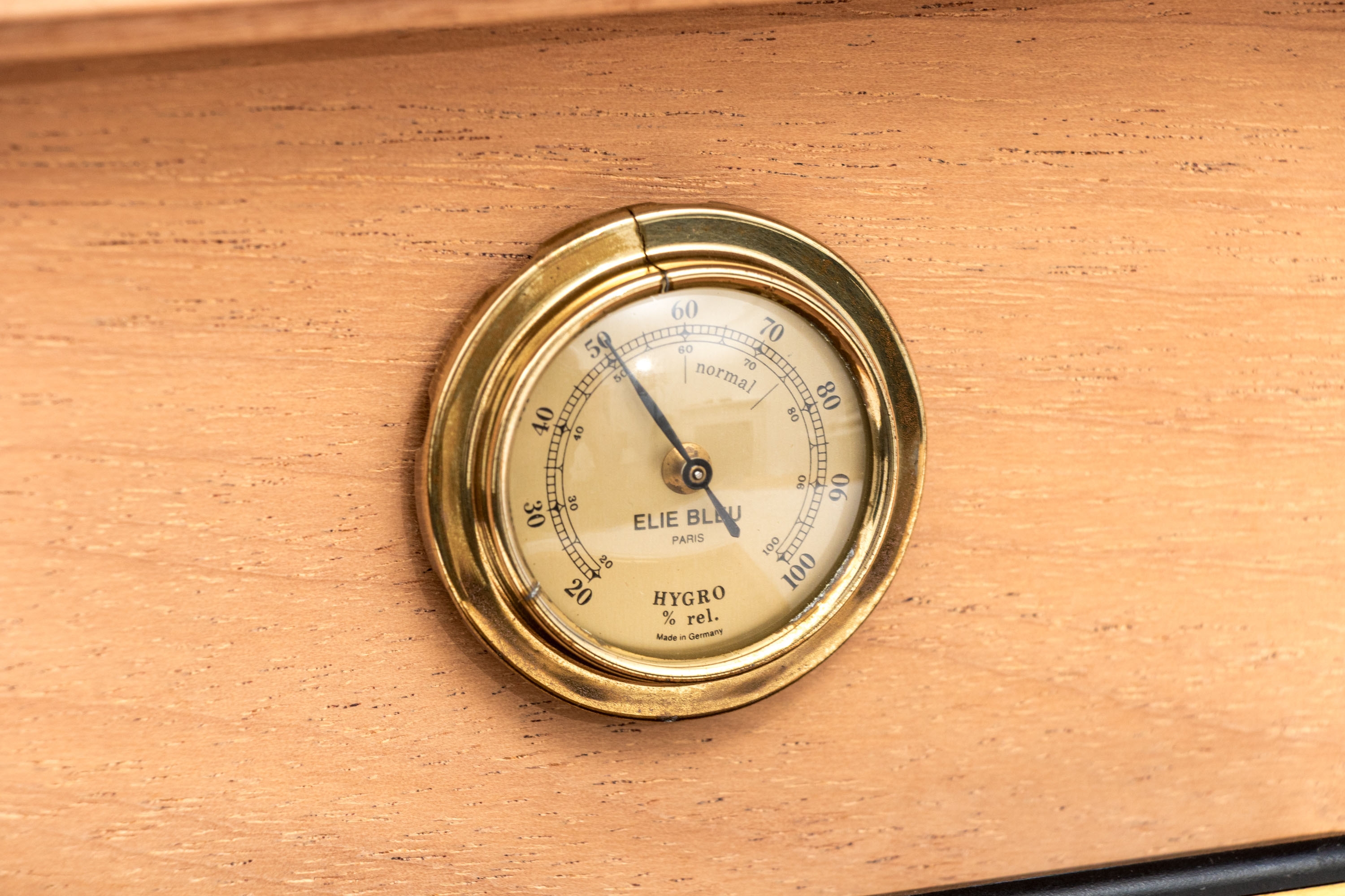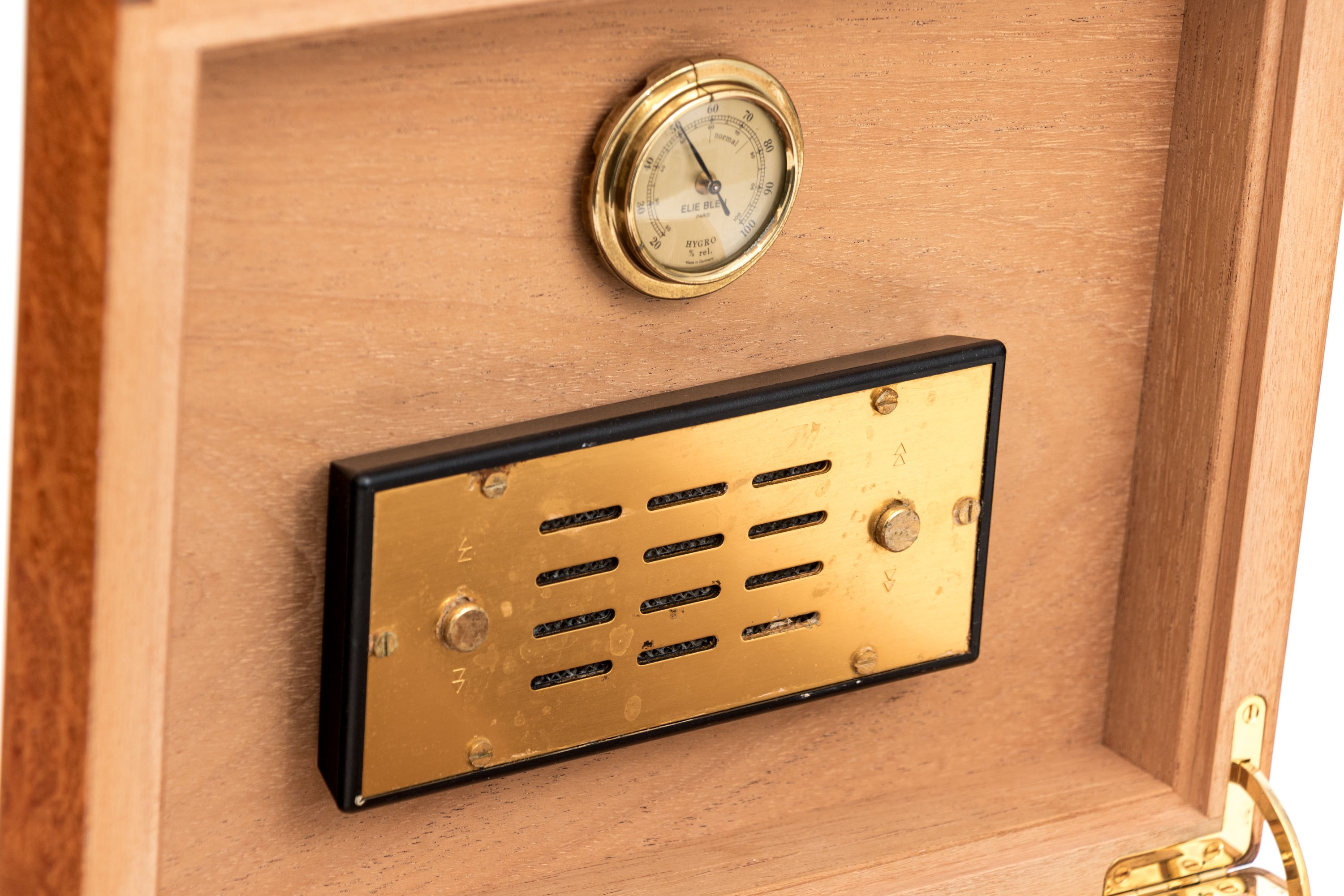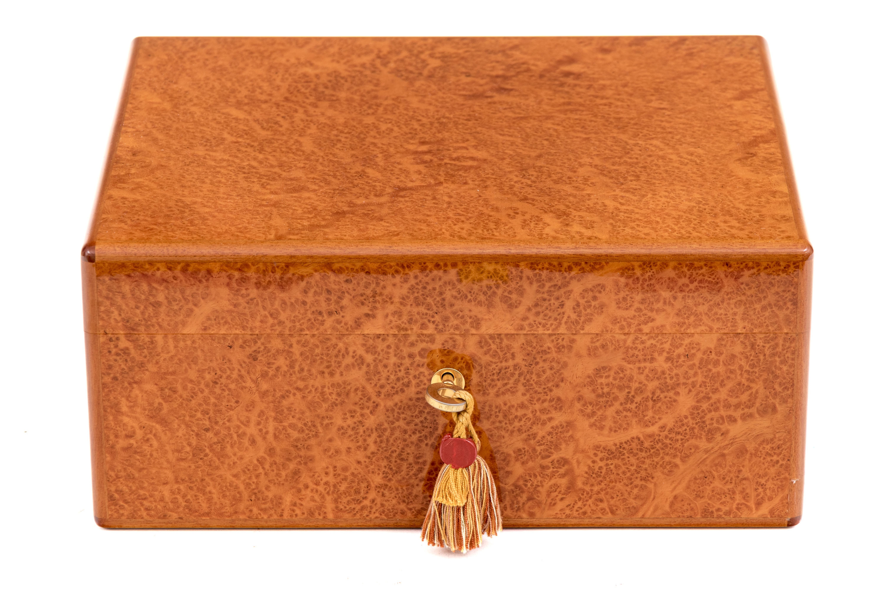 A high quality Elie Bleu cigar humidor box veneered in gorgeous orange-brown burlwood. The hinged lid opens to a humidor humidifier and a hygrometer on the inside. The interior is compartmented with two partitions.