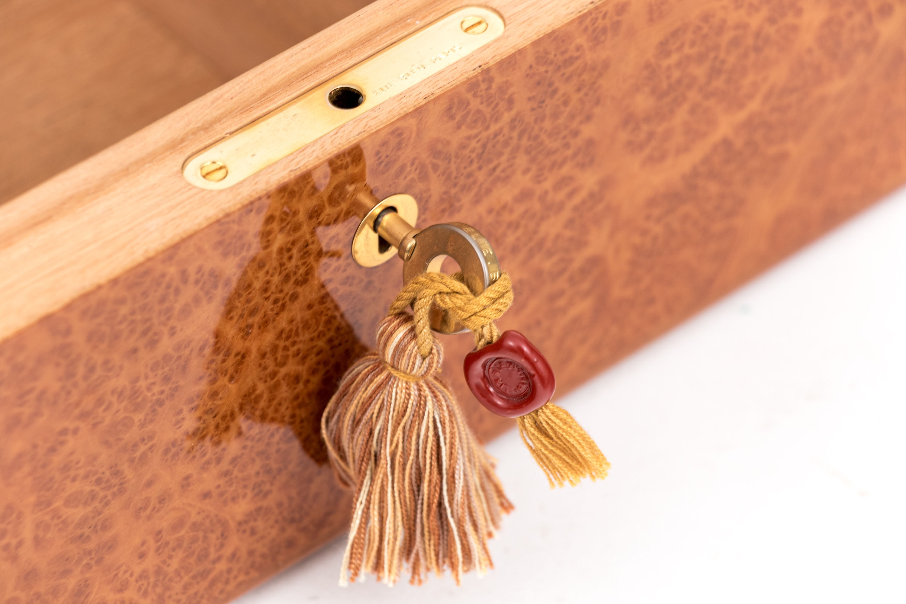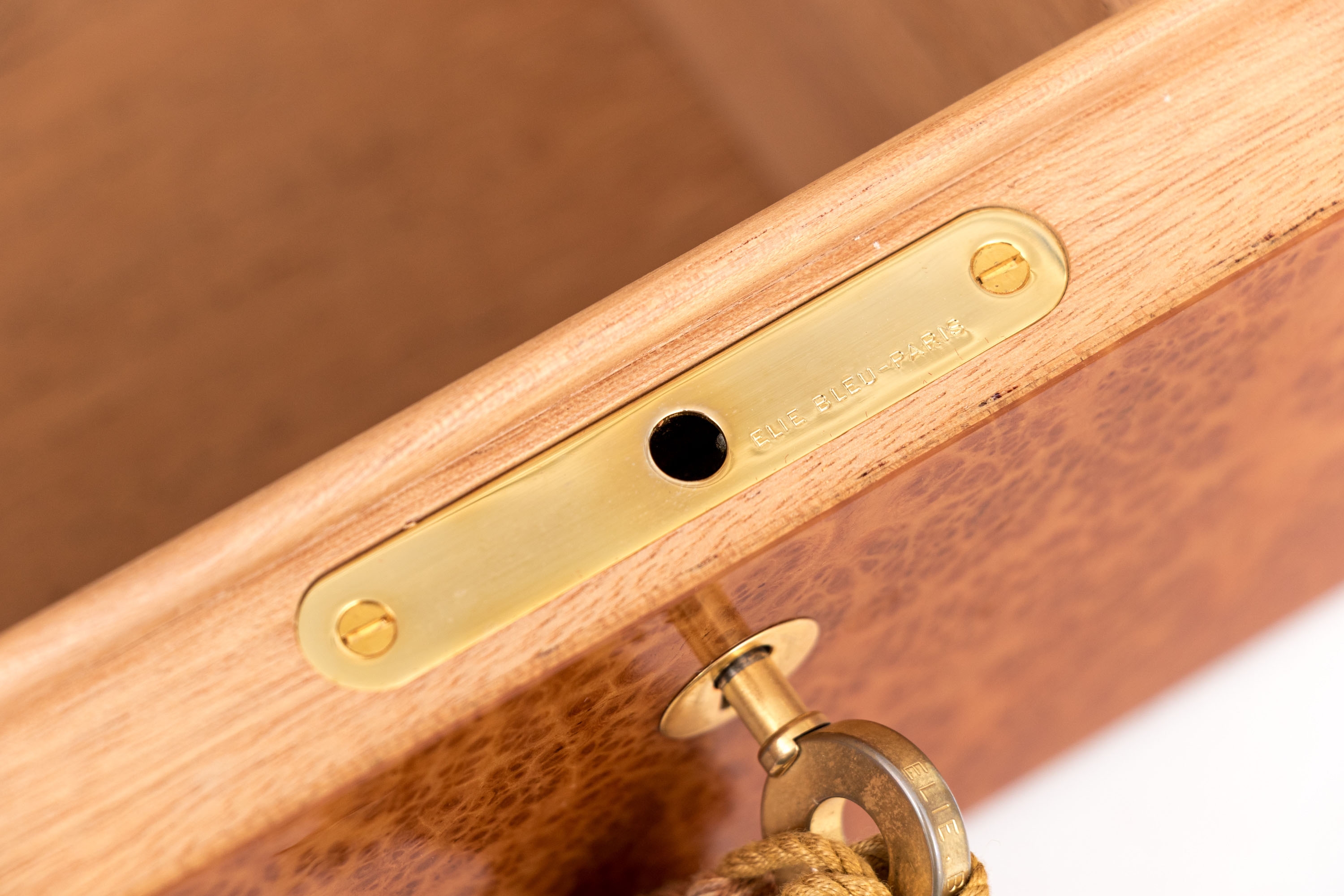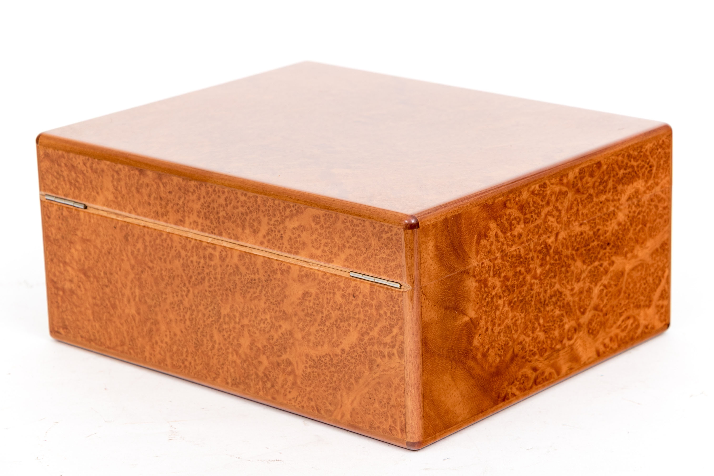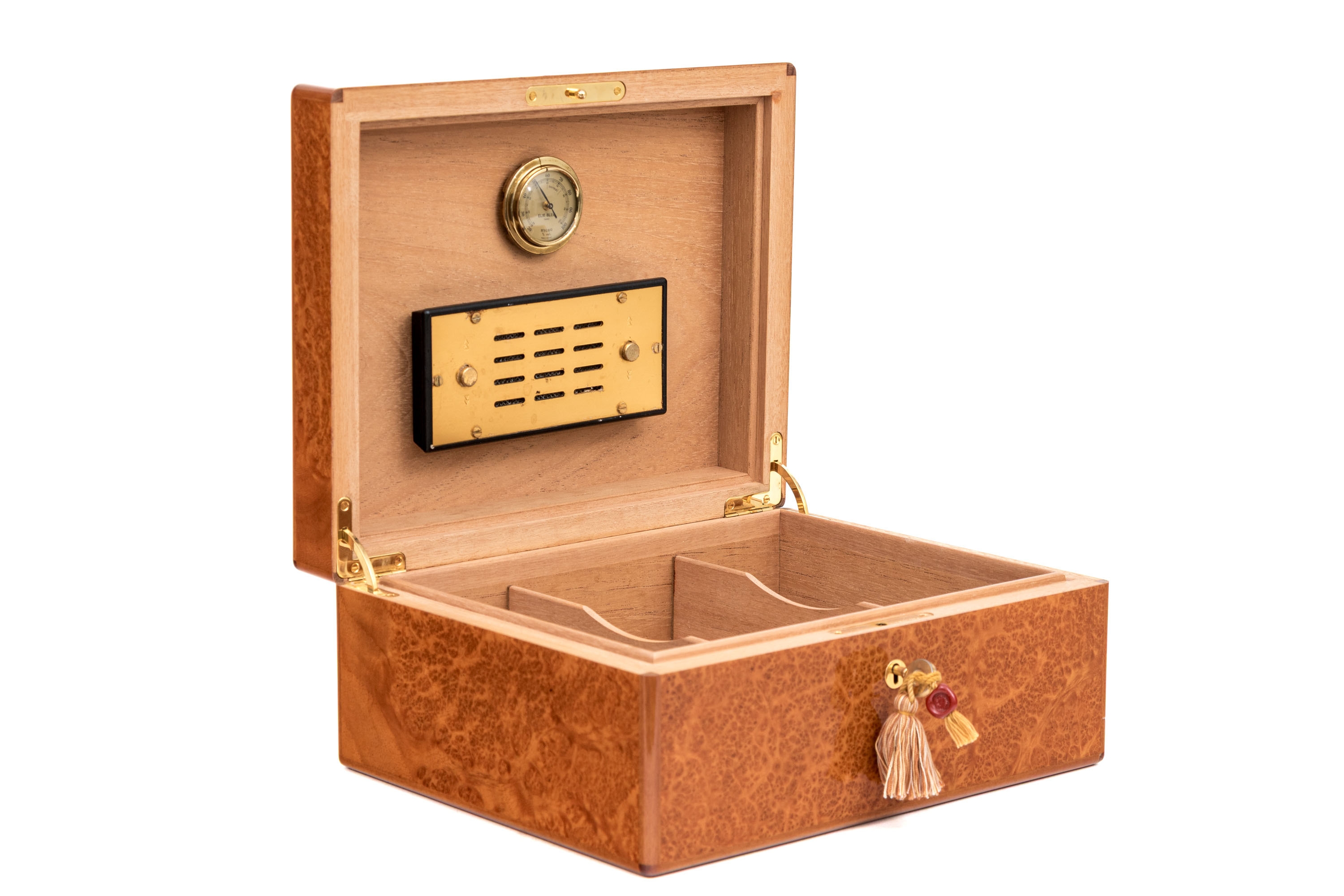 A high quality Elie Bleu cigar humidor box veneered in gorgeous orange-brown burlwood. The hinged lid opens to a humidor humidifier and a hygrometer on the inside. The interior is compartmented with two partitions.