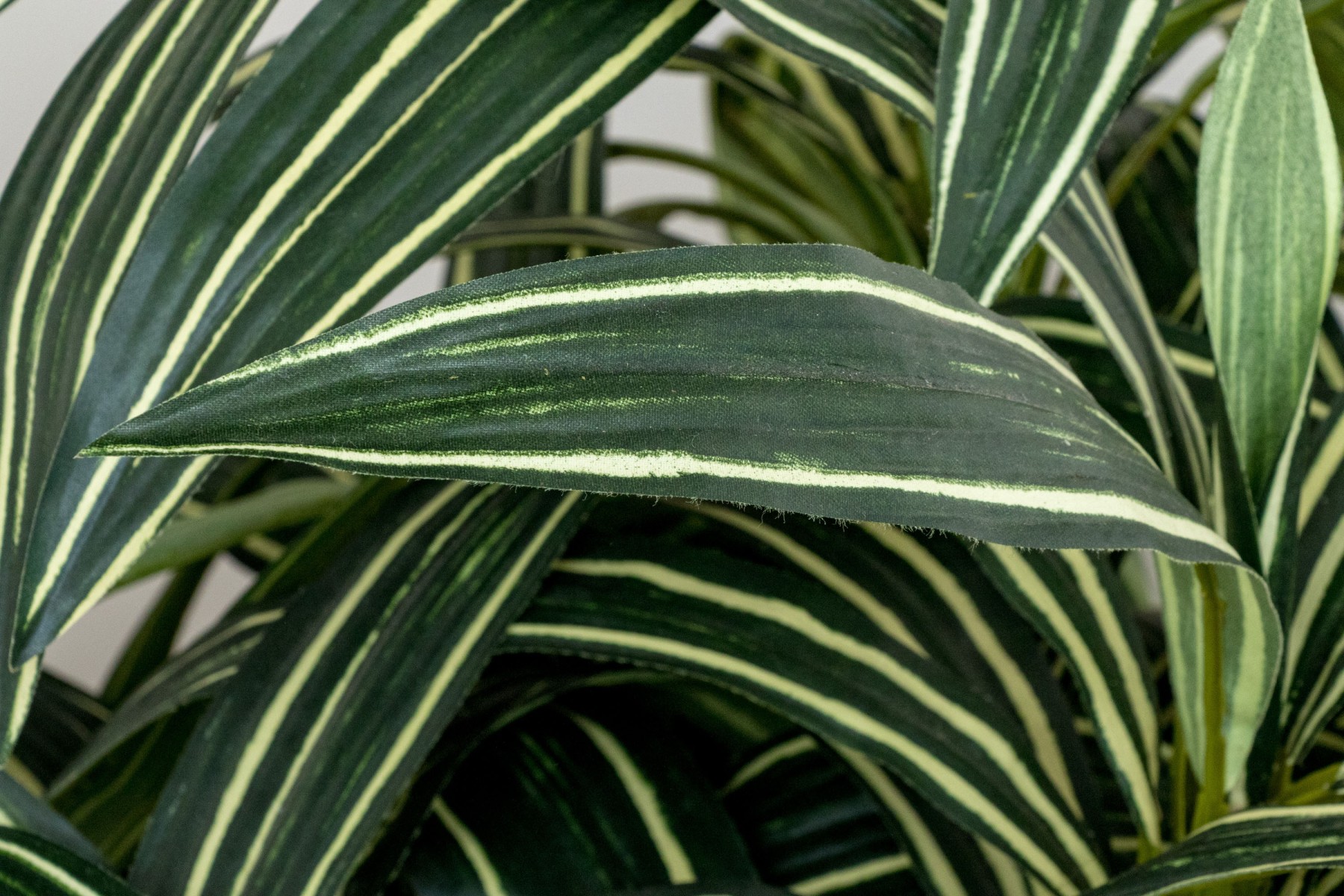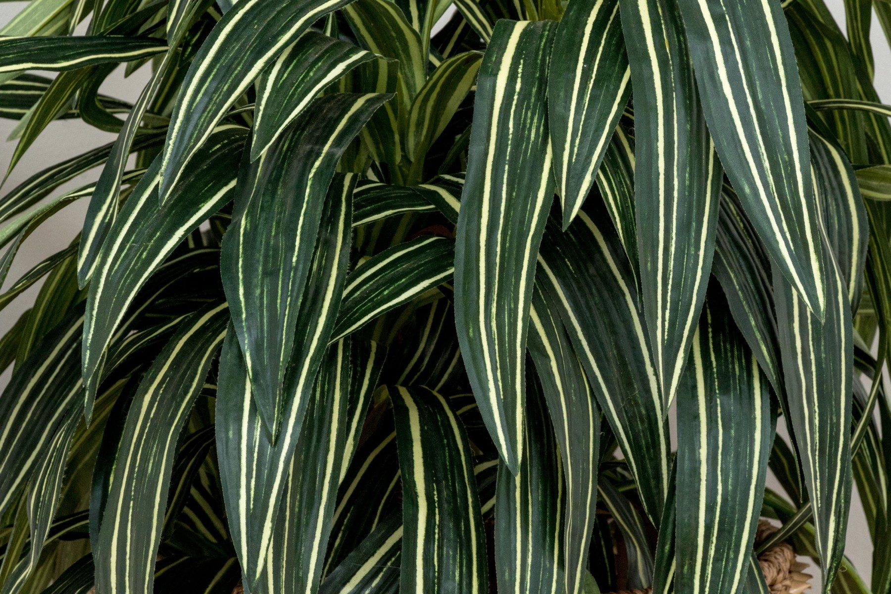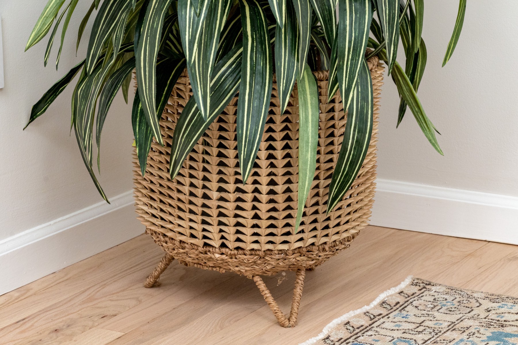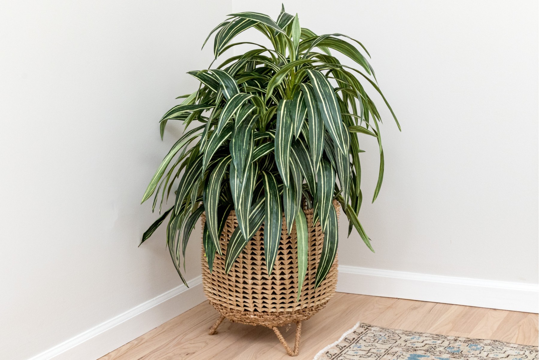 A quality faux dracaena plant with impressive, convincingly detailed foliage in rich, dark green with light green stripes along long, pointed leaves. Displayed in a highly decorative natural fiber planter raised on hairpin legs.
