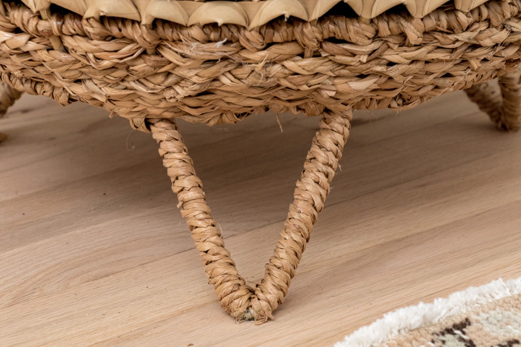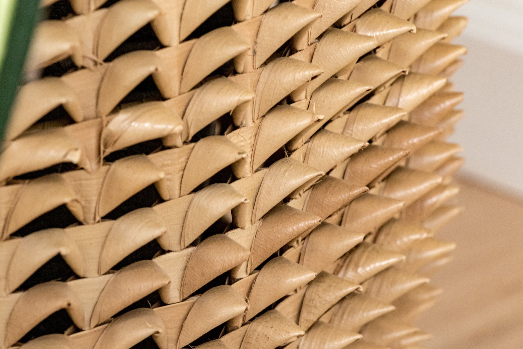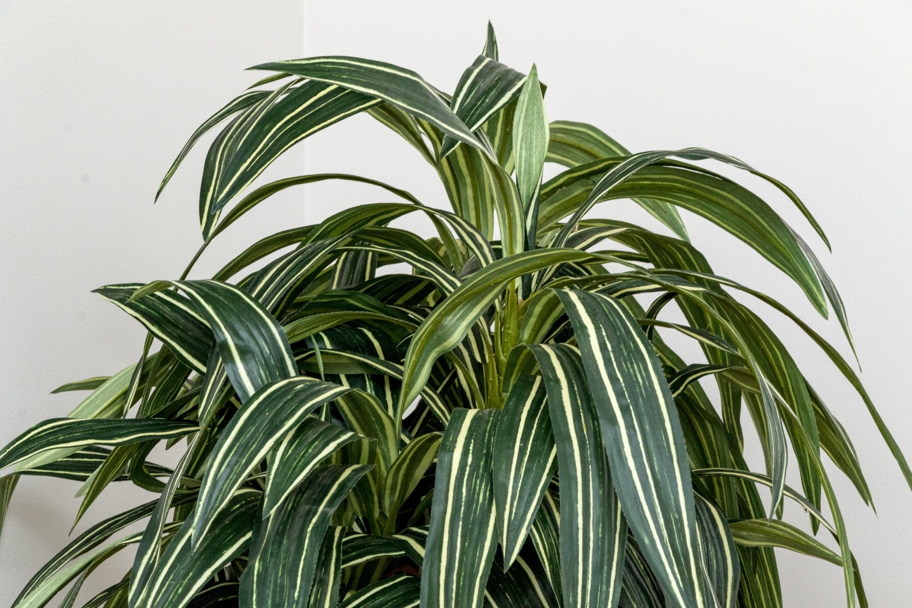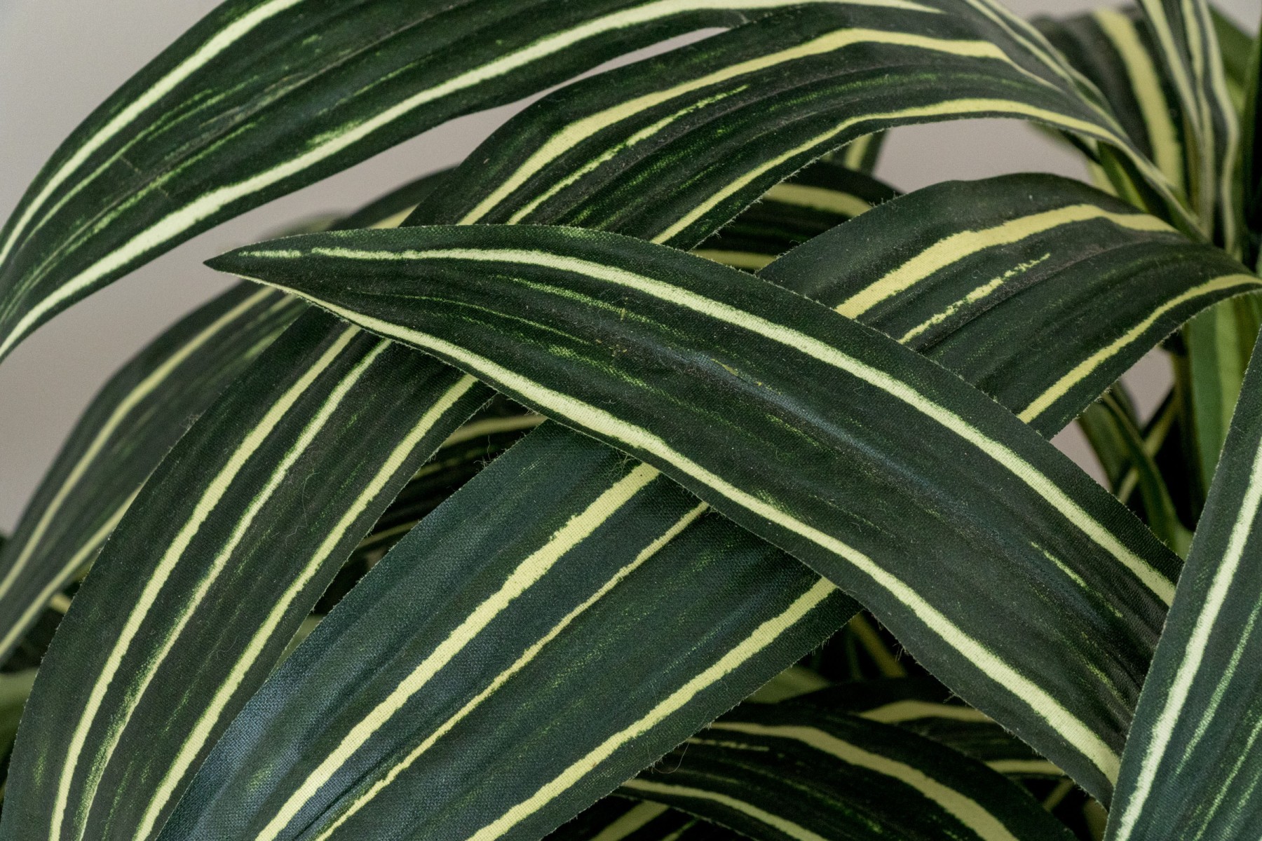 A quality faux dracaena plant with impressive, convincingly detailed foliage in rich, dark green with light green stripes along long, pointed leaves. Displayed in a highly decorative natural fiber planter raised on hairpin legs.