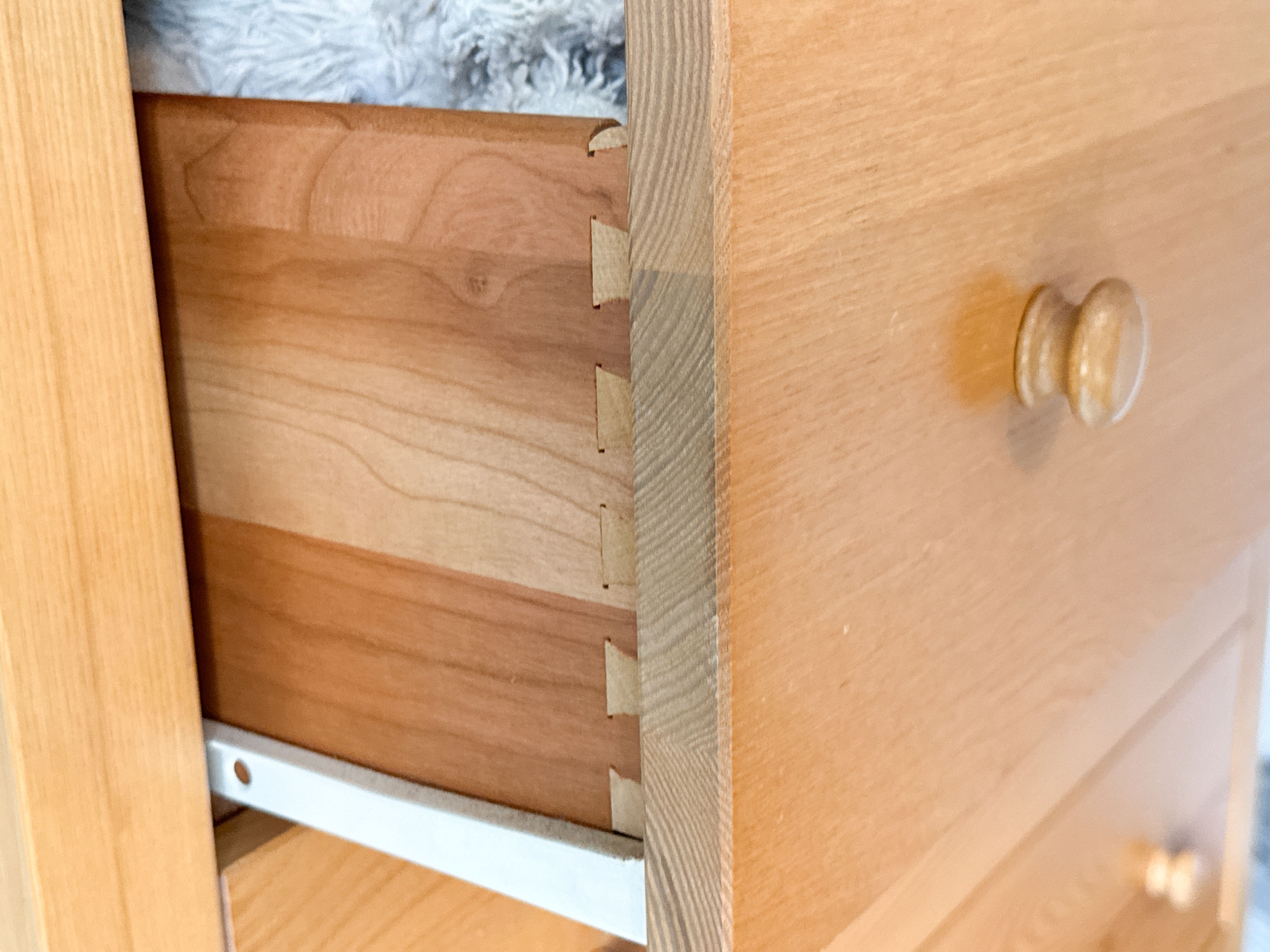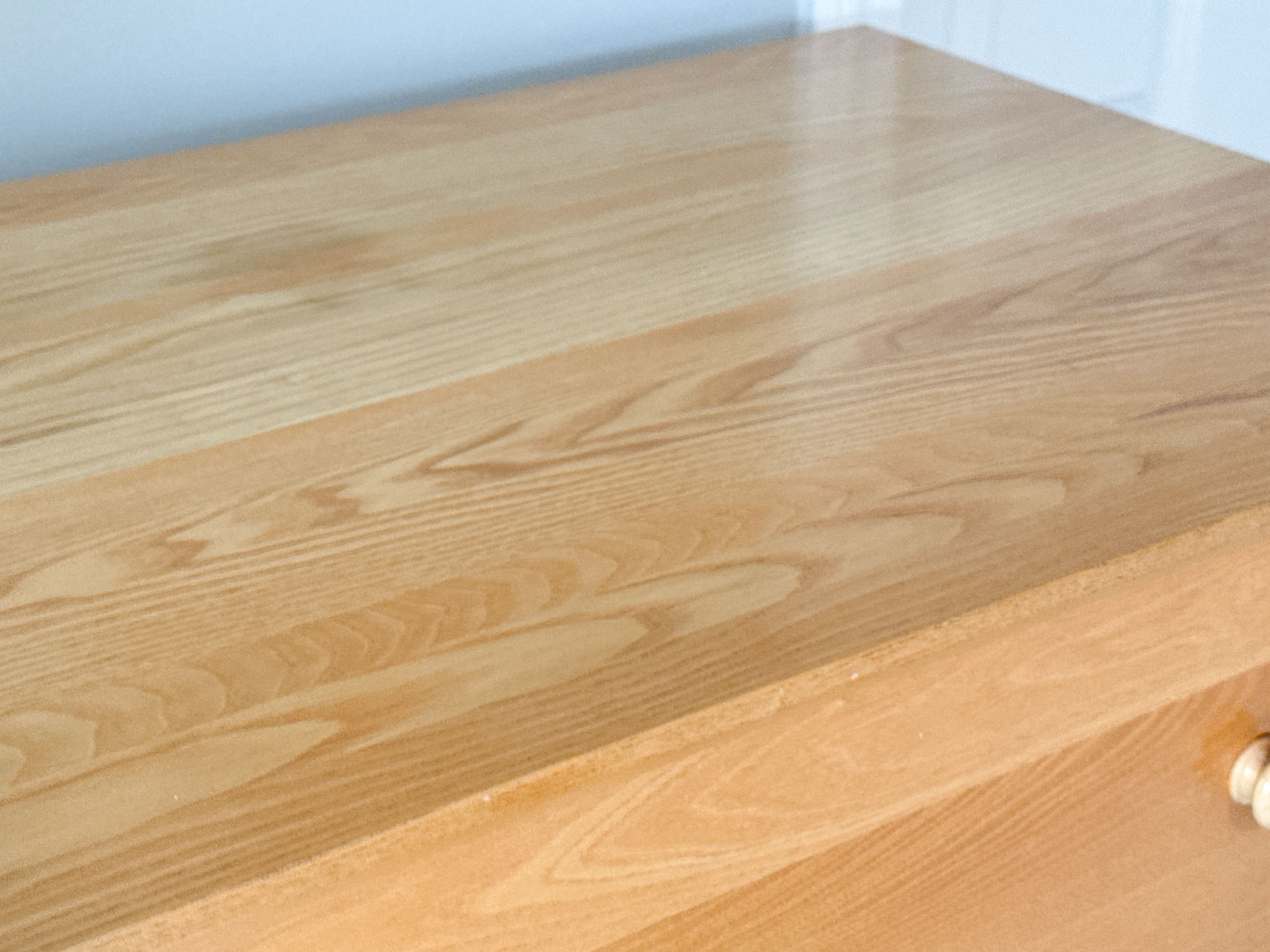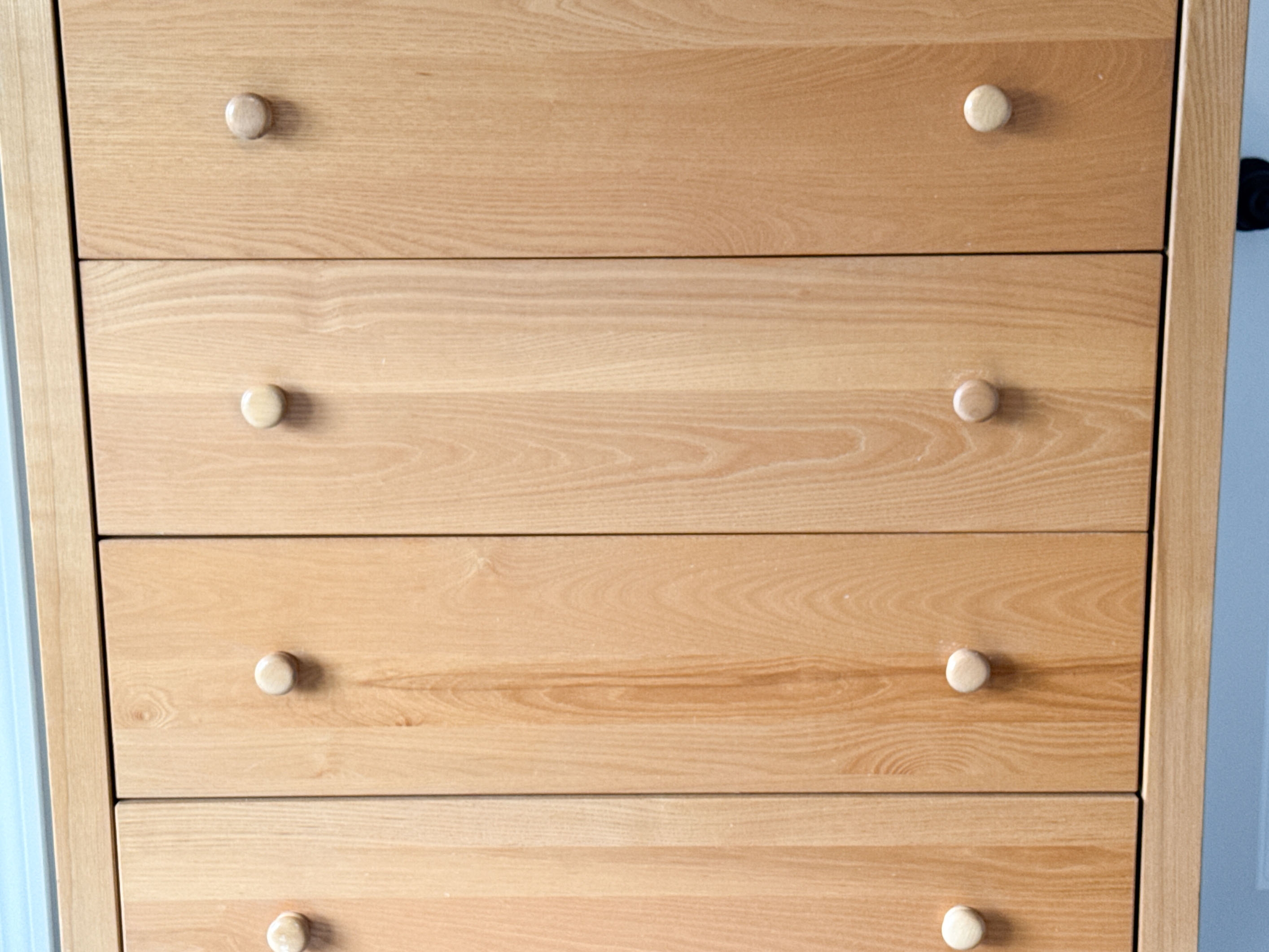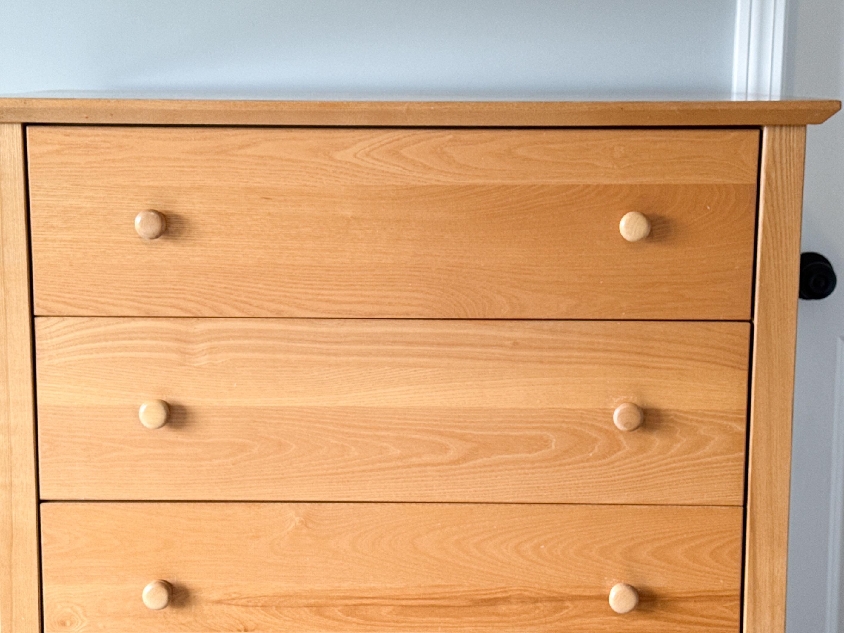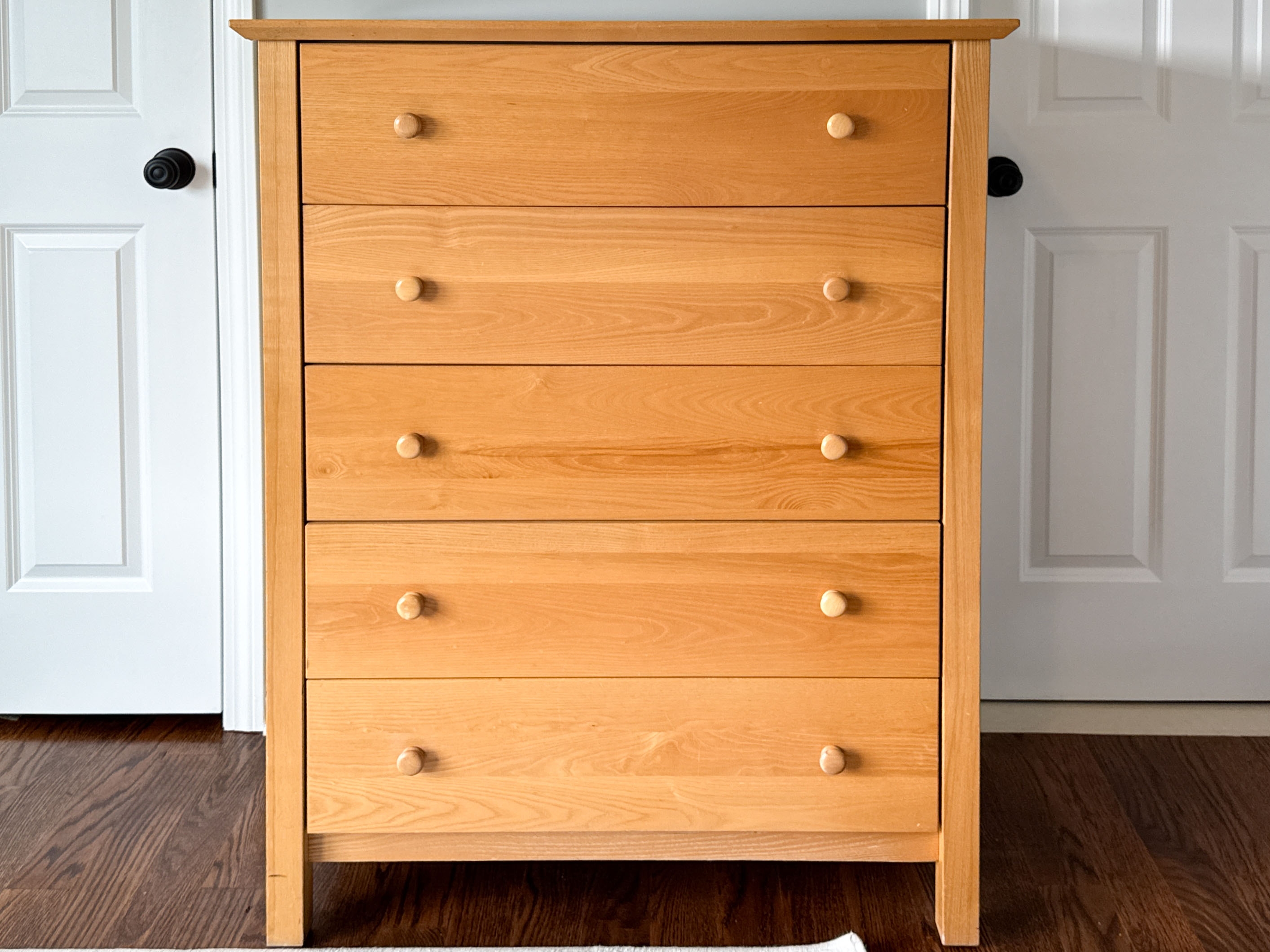 A quality dresser chest with versatile transitional style, well crafted in honeyed blonde wood with a rectangular top overhanging five drawers with double knobs. Raised on simple and sleek rectangular legs.