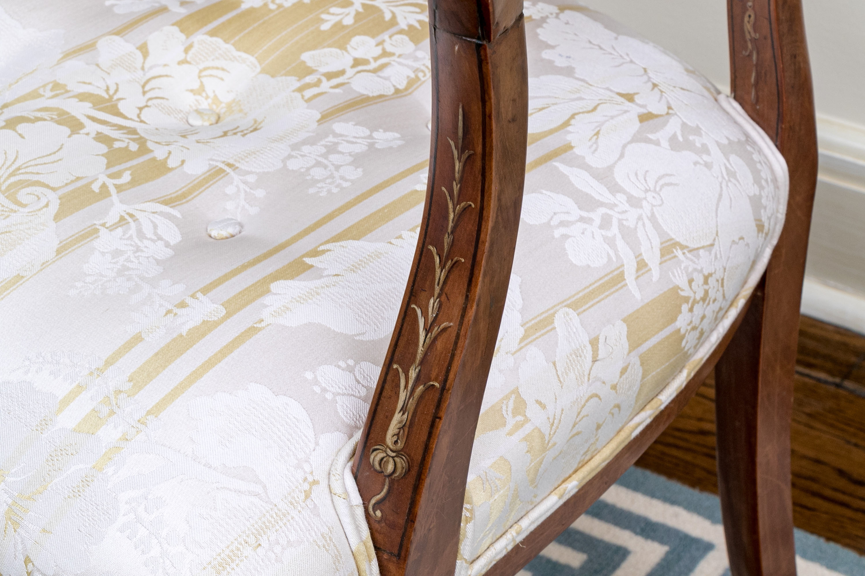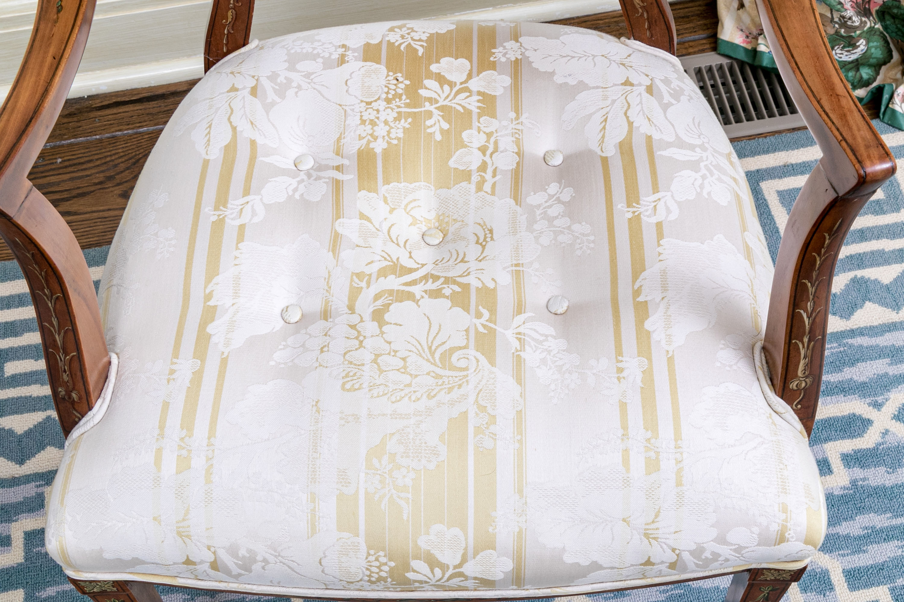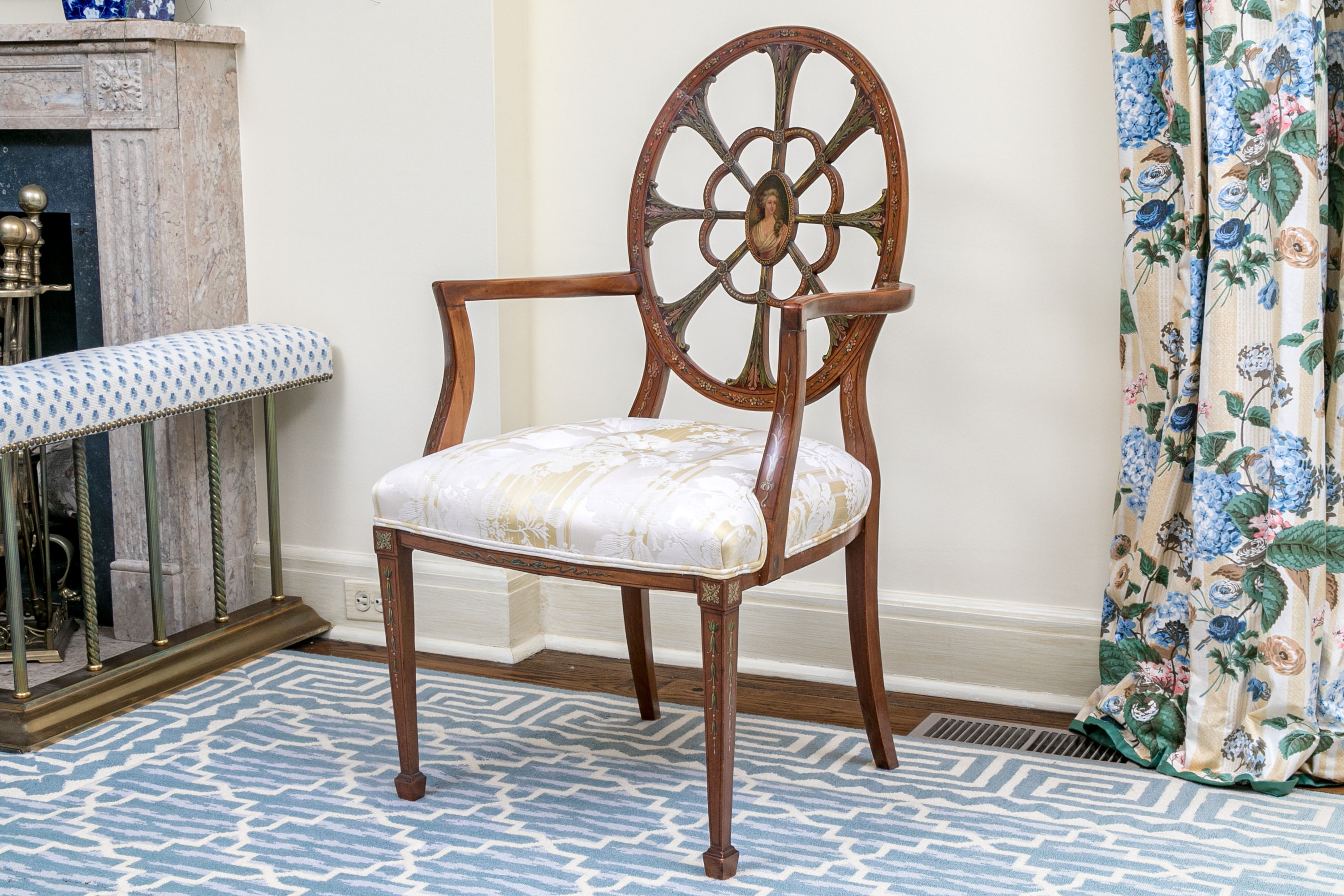 On squared tapered front legs with spade form feet. The chair has a custom upholstered and button tufted yellow and white striped and floral decorated upholstery with openwork spiderweb medallion back with central oval female bust.