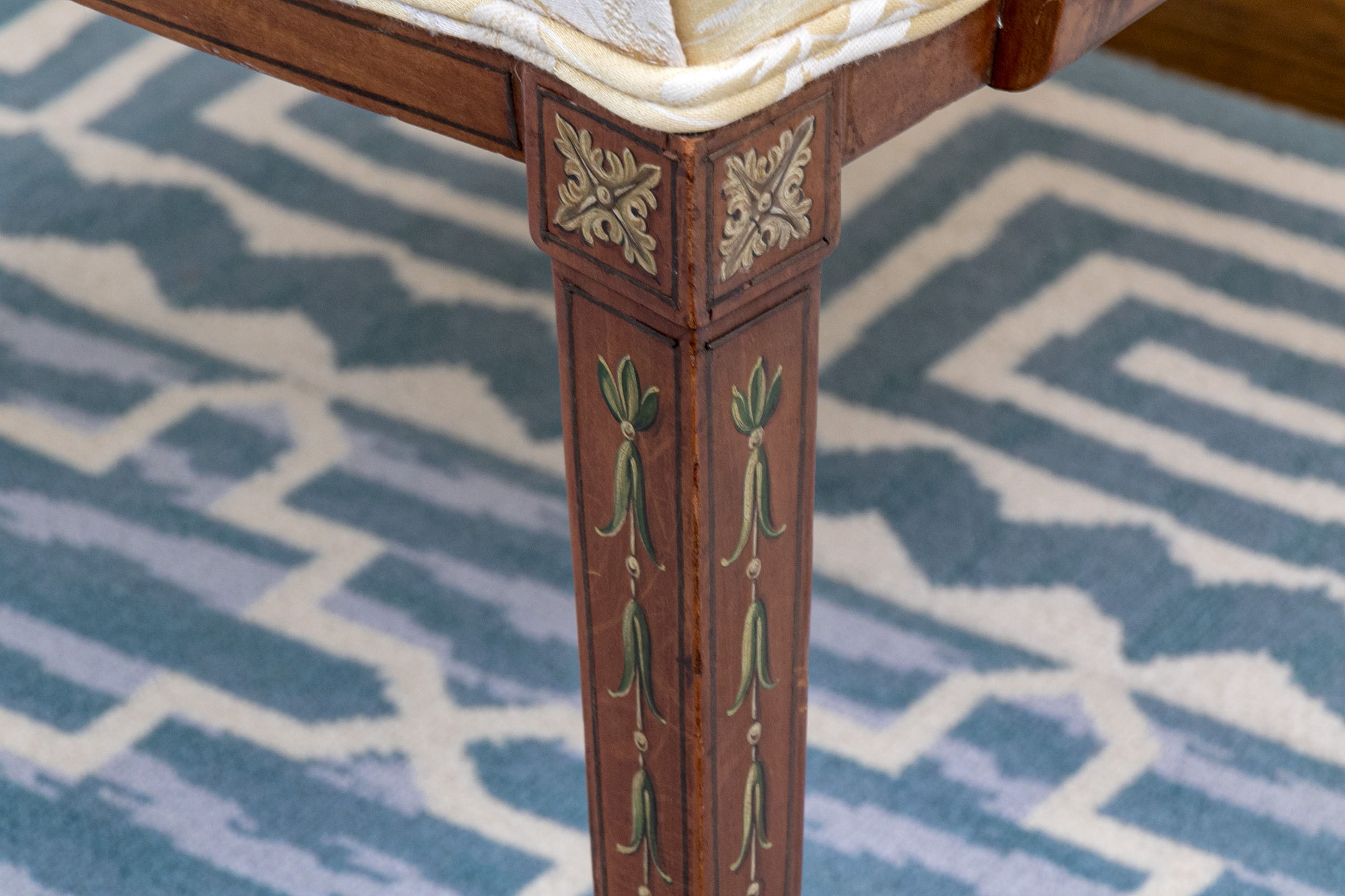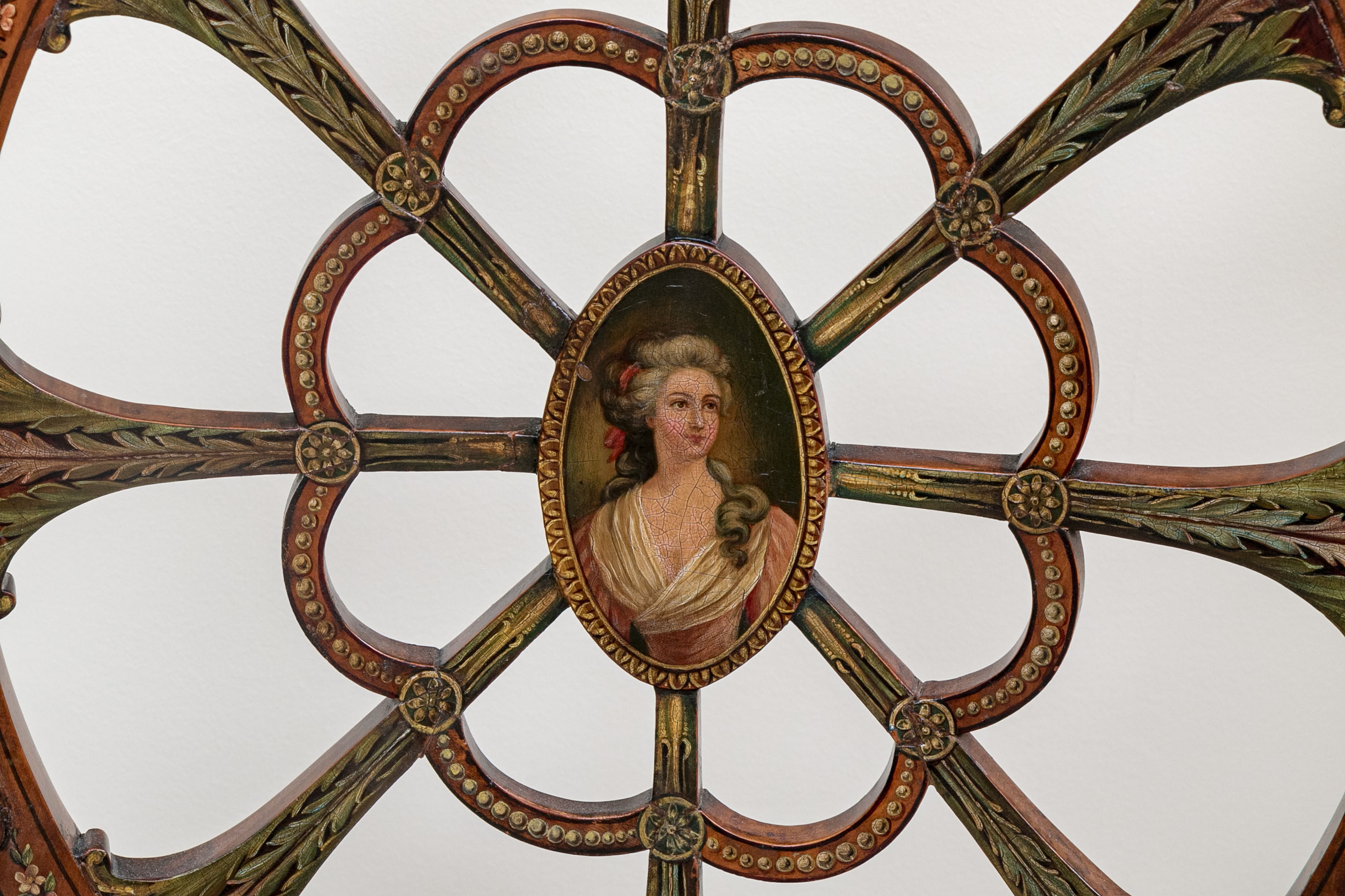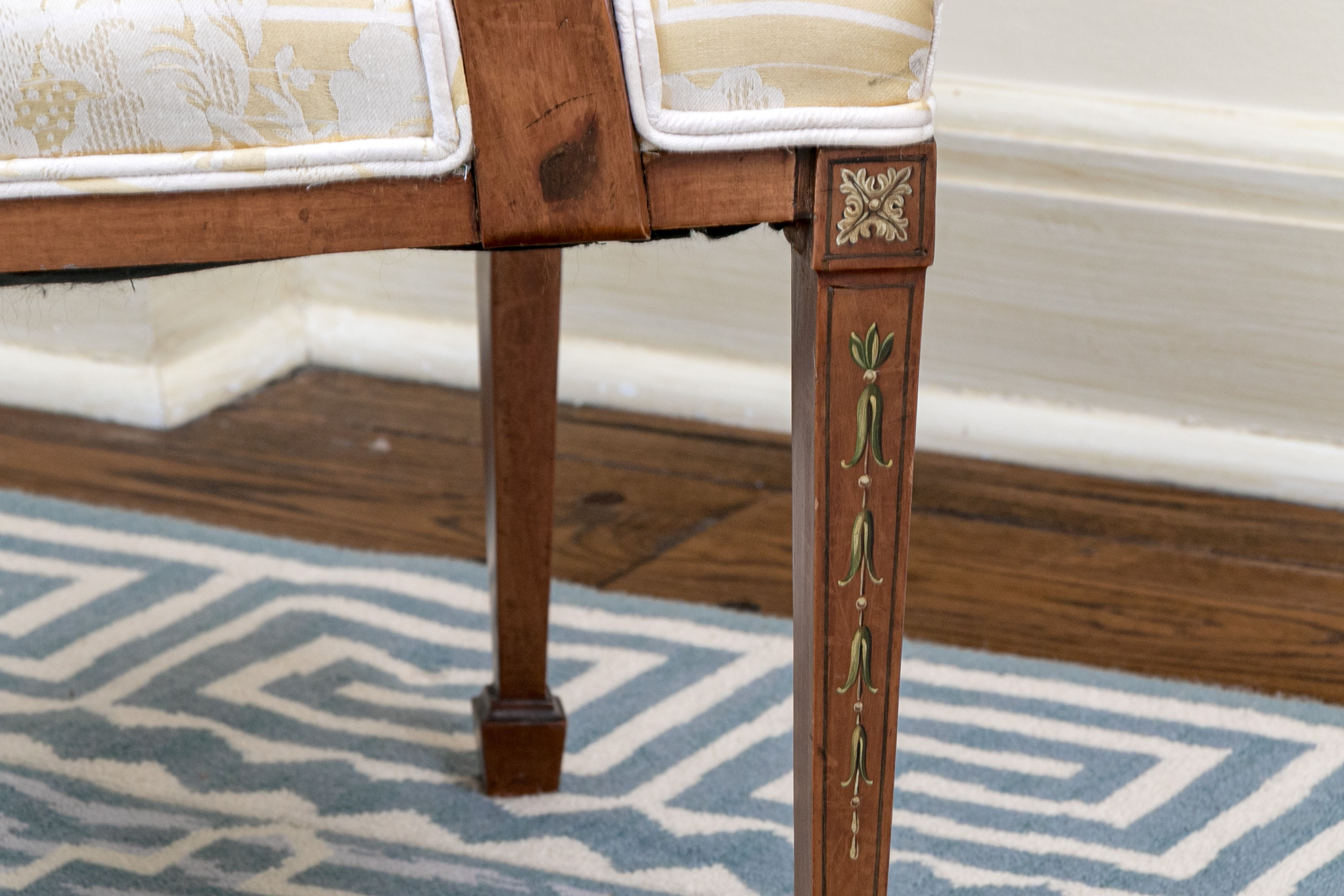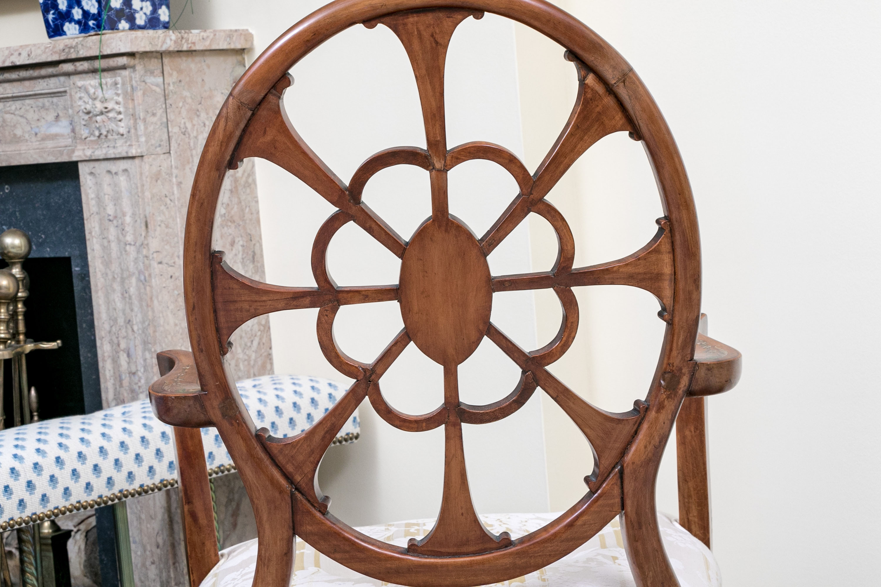 On squared tapered front legs with spade form feet. The chair has a custom upholstered and button tufted yellow and white striped and floral decorated upholstery with openwork spiderweb medallion back with central oval female bust.