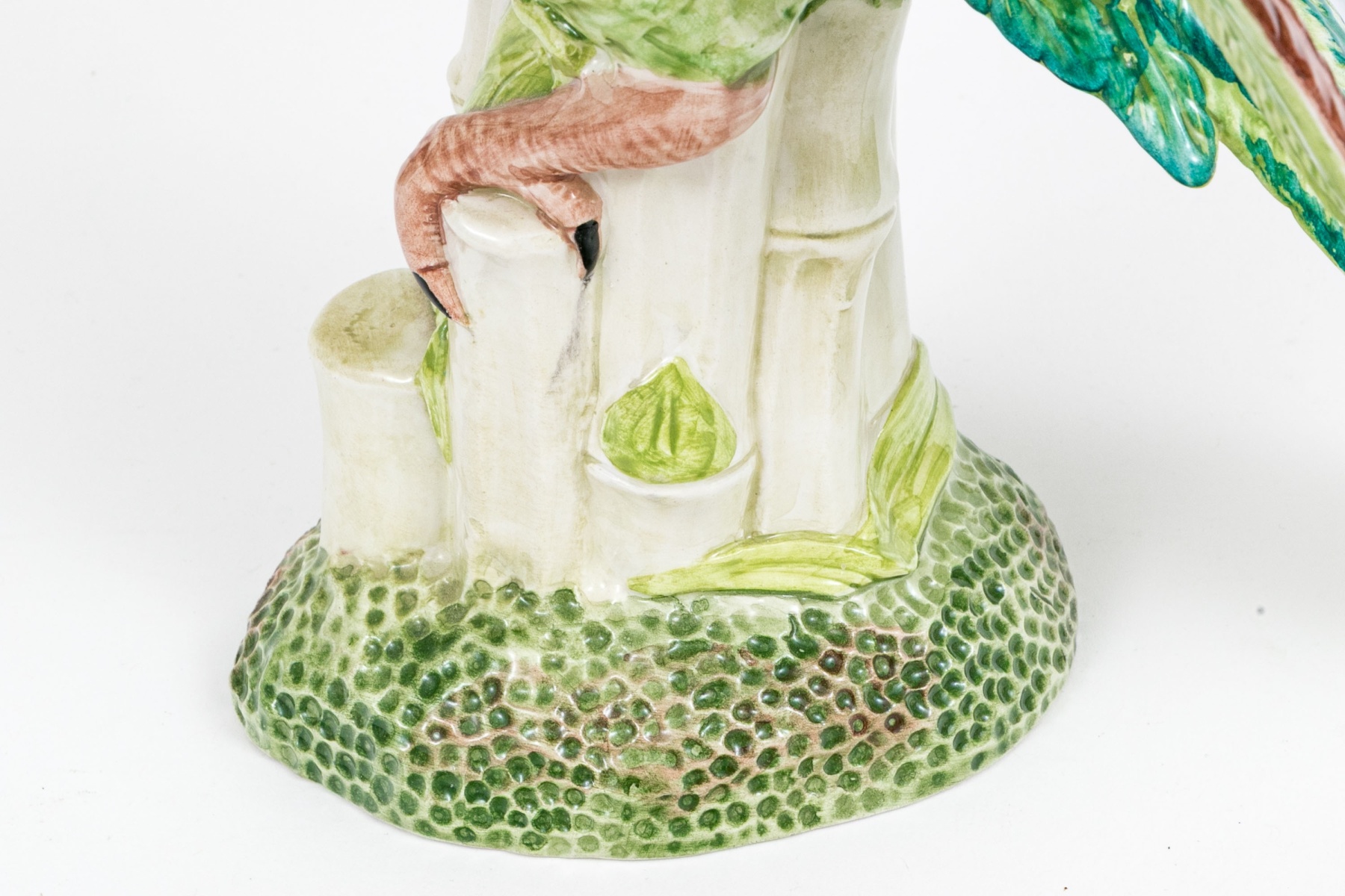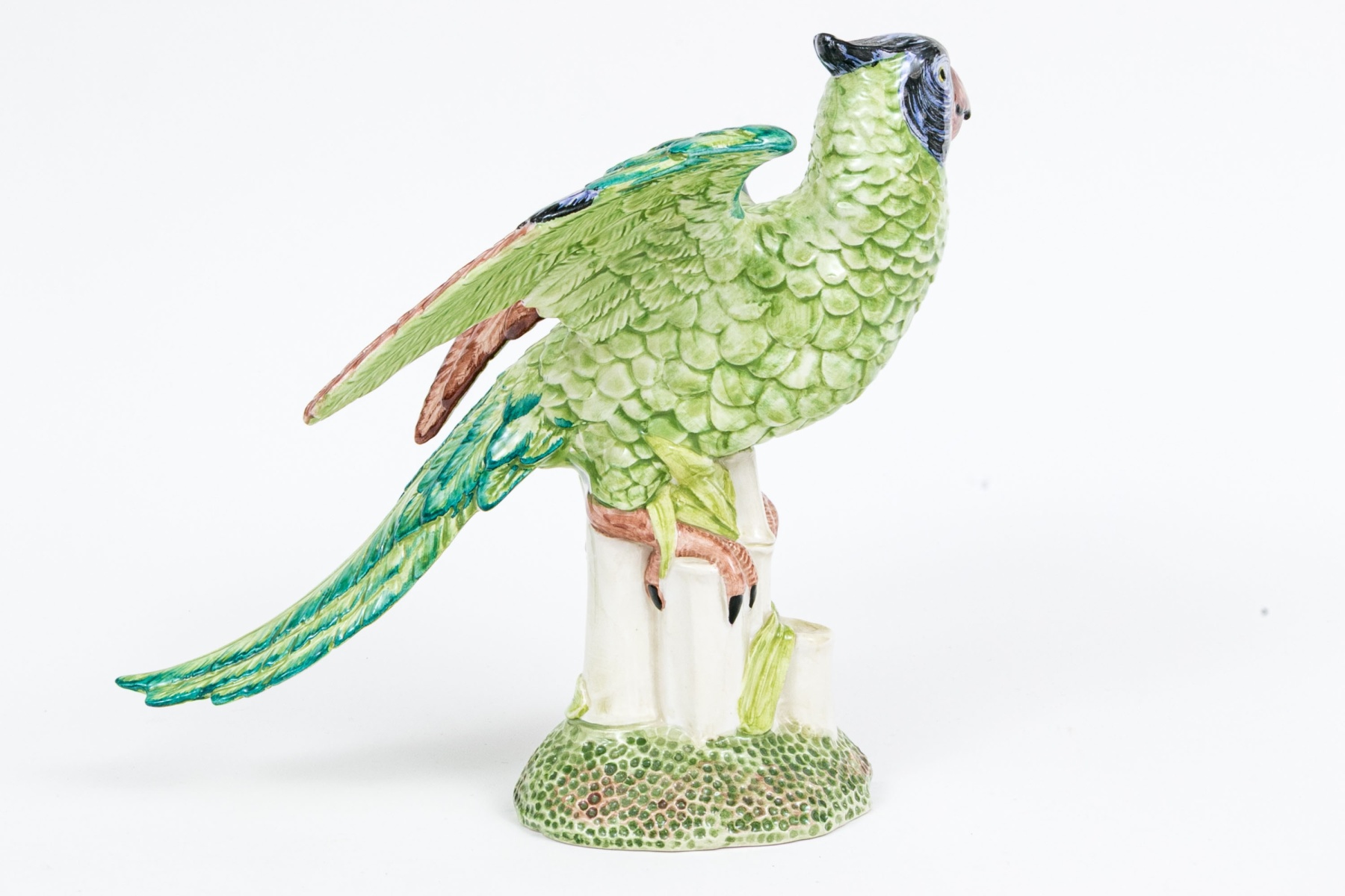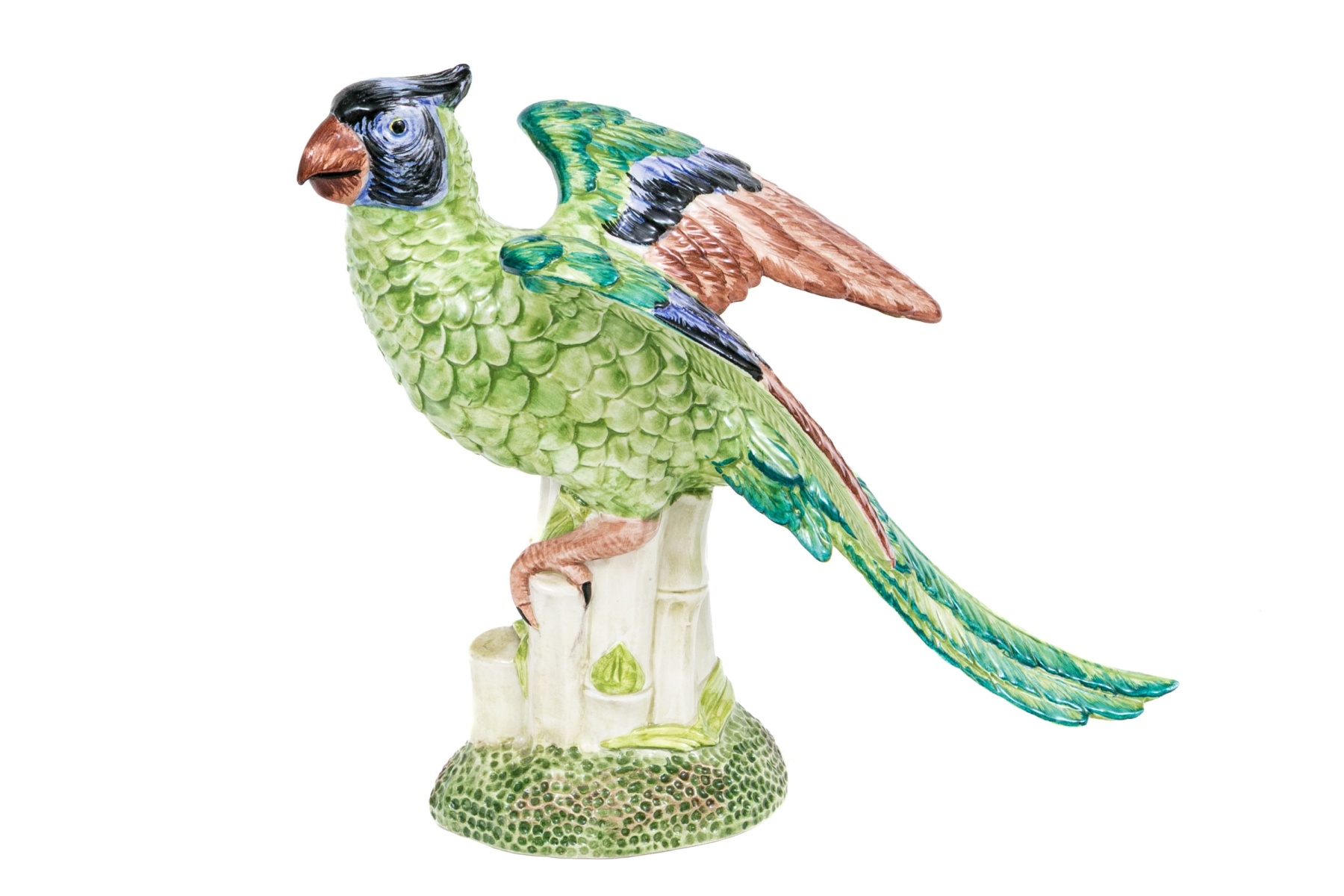 A fabulous and high quality Italian made Chelsea House ceramic majolica figurine of a parrot depicted on a base with bamboo stacks where the bird has perched with talons grasping with the brightly finished bird with wings partially open. Marked underfoot.