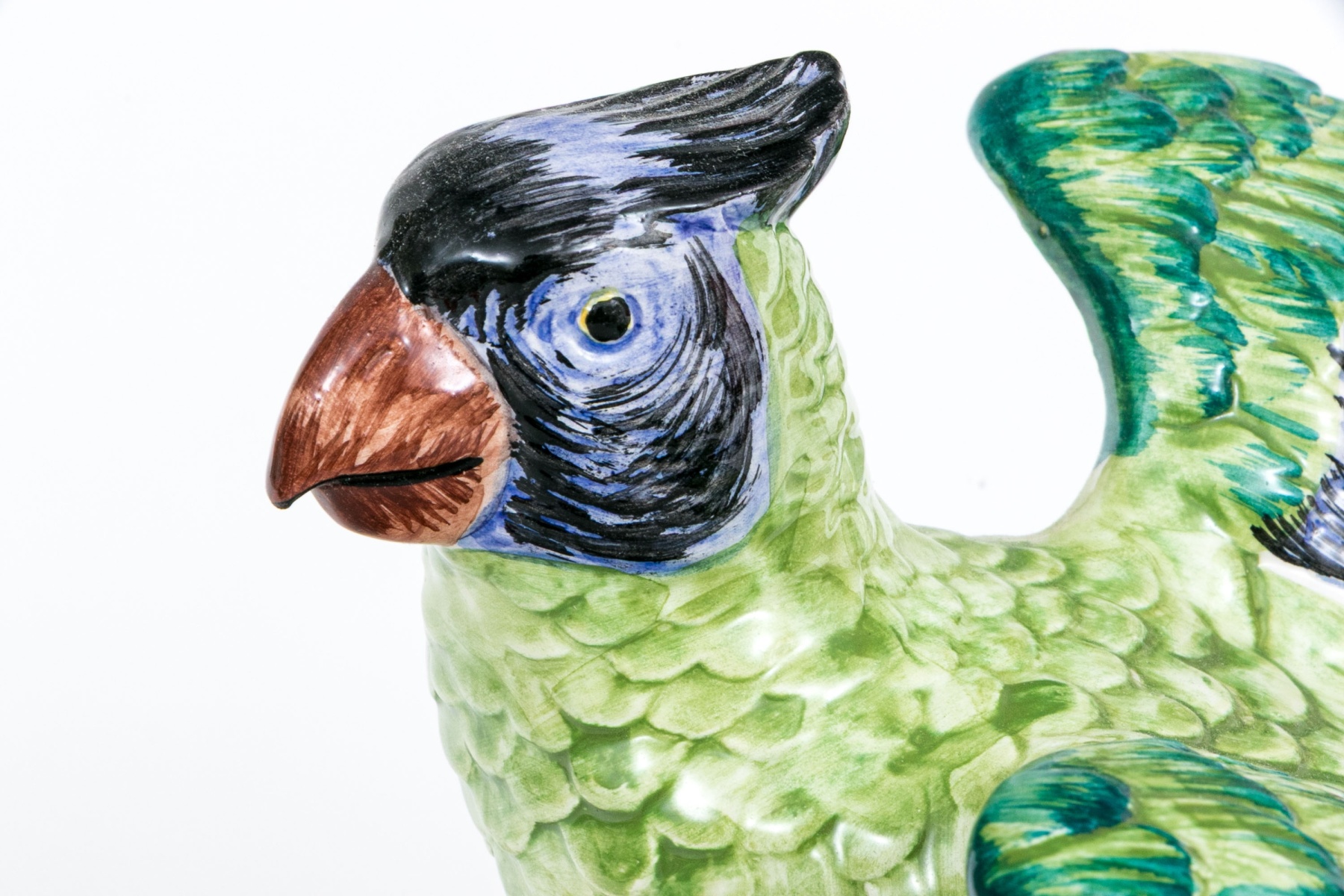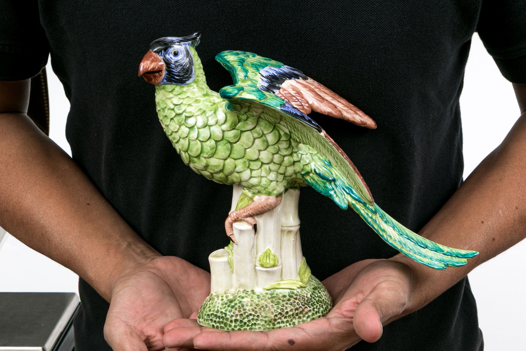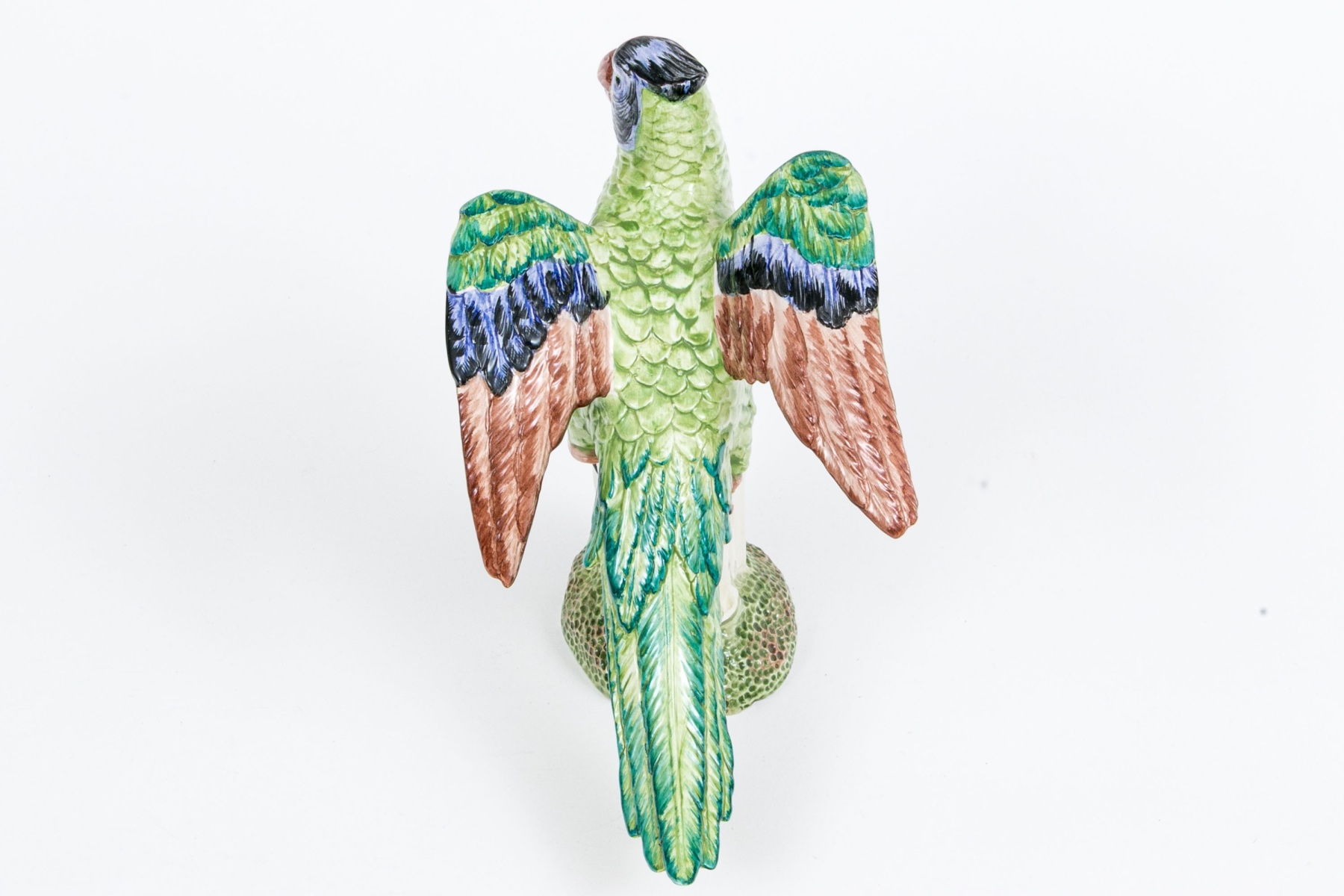 A fabulous and high quality Italian made Chelsea House ceramic majolica figurine of a parrot depicted on a base with bamboo stacks where the bird has perched with talons grasping with the brightly finished bird with wings partially open. Marked underfoot.