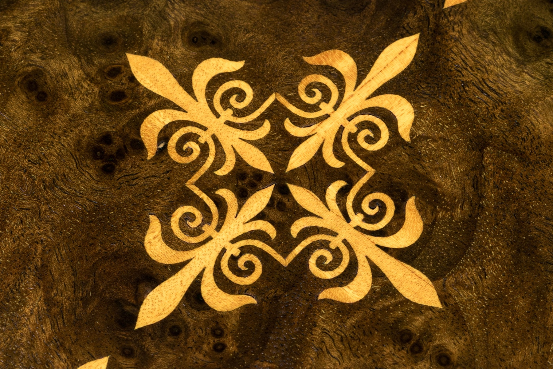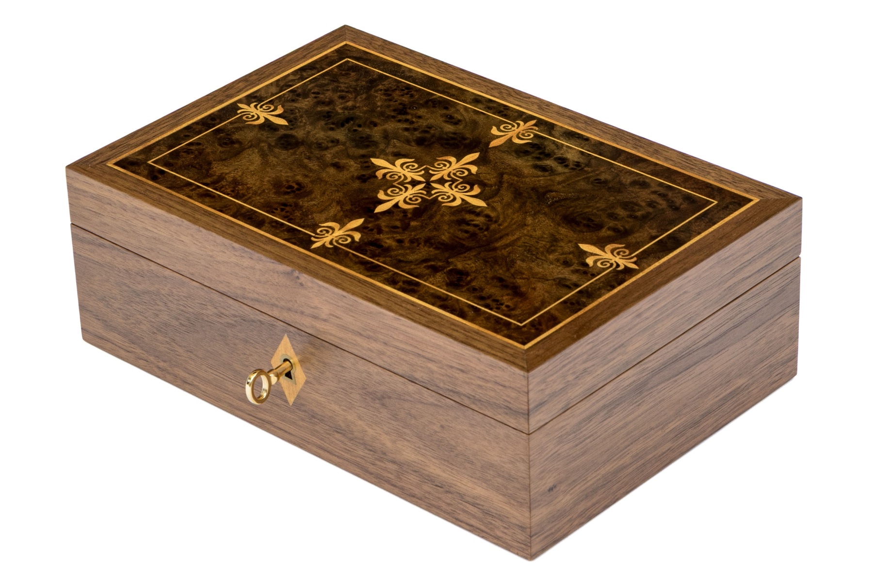 Marquetry inlay, brass hinges with inlaid key escutcheon and key present. Blue velvet lined interior. Labeled with maker to back trim.
