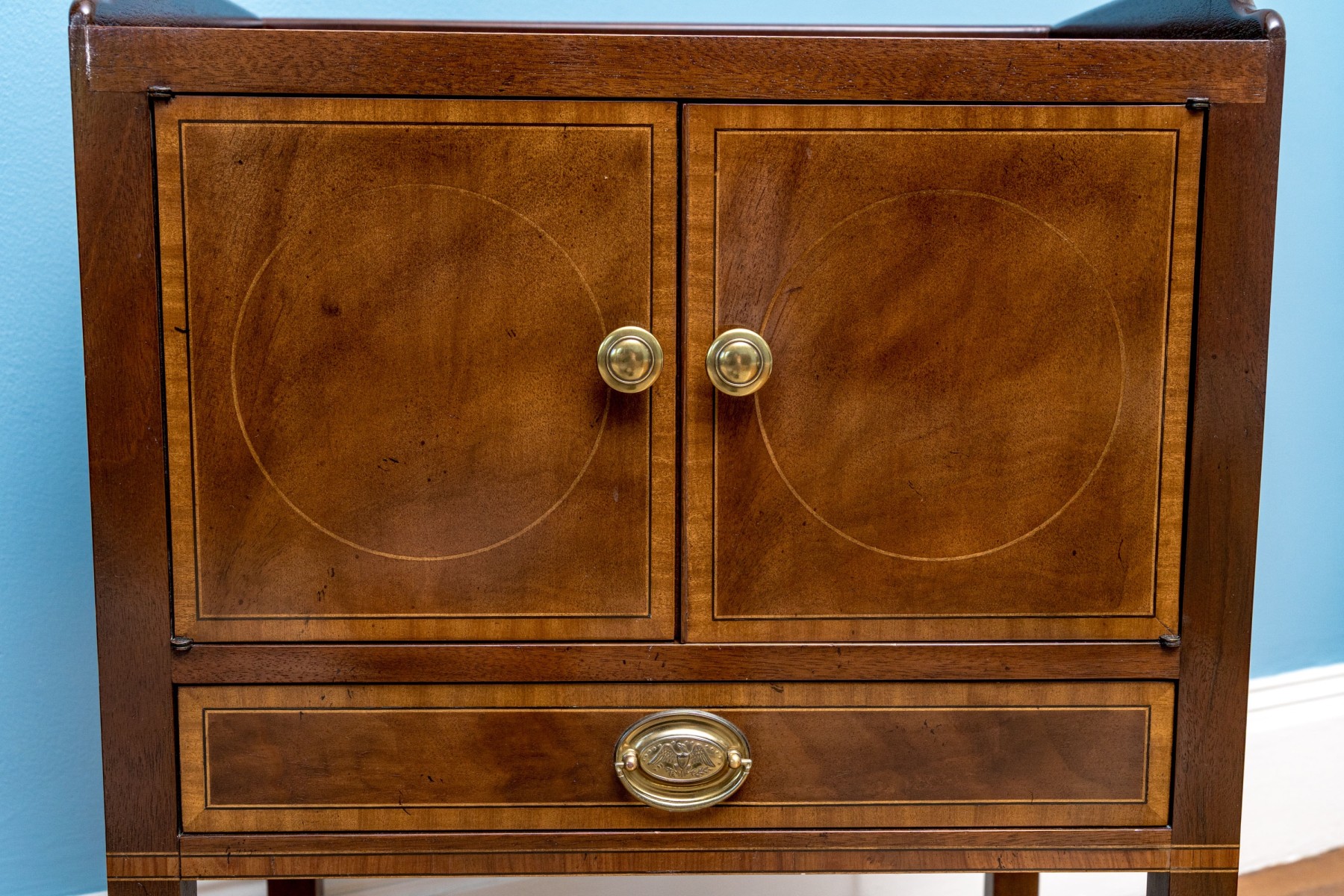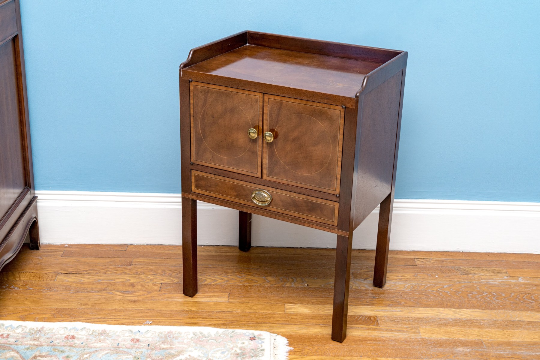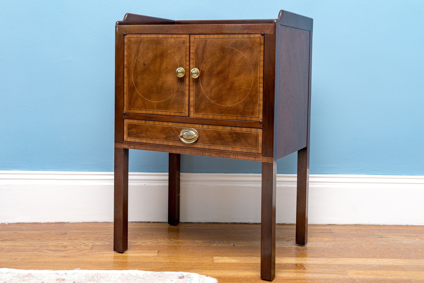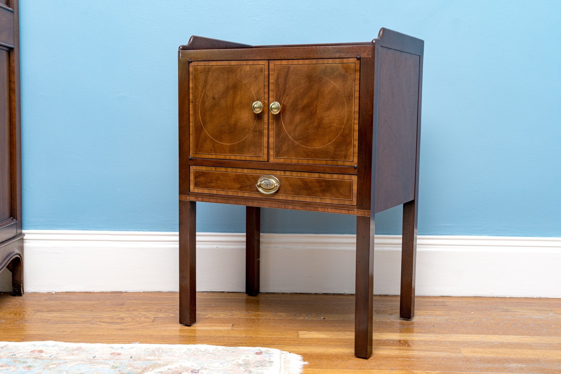A high quality Georgian style commode cabinet in rich, dark brown mahogany with beautiful contrasting lighter hues. The cabinet feature a three-quarter gallery around the rectangular top and a case of double doors over a lower drawer. The cabinet doors are elegantly designed with banded edges and dainty circular inlaid panels, finished with brass knobs. The drawer follows suit with a banded design and a brass bail handle on an oval plaque. Raised over sleek and simple rectangular legs.