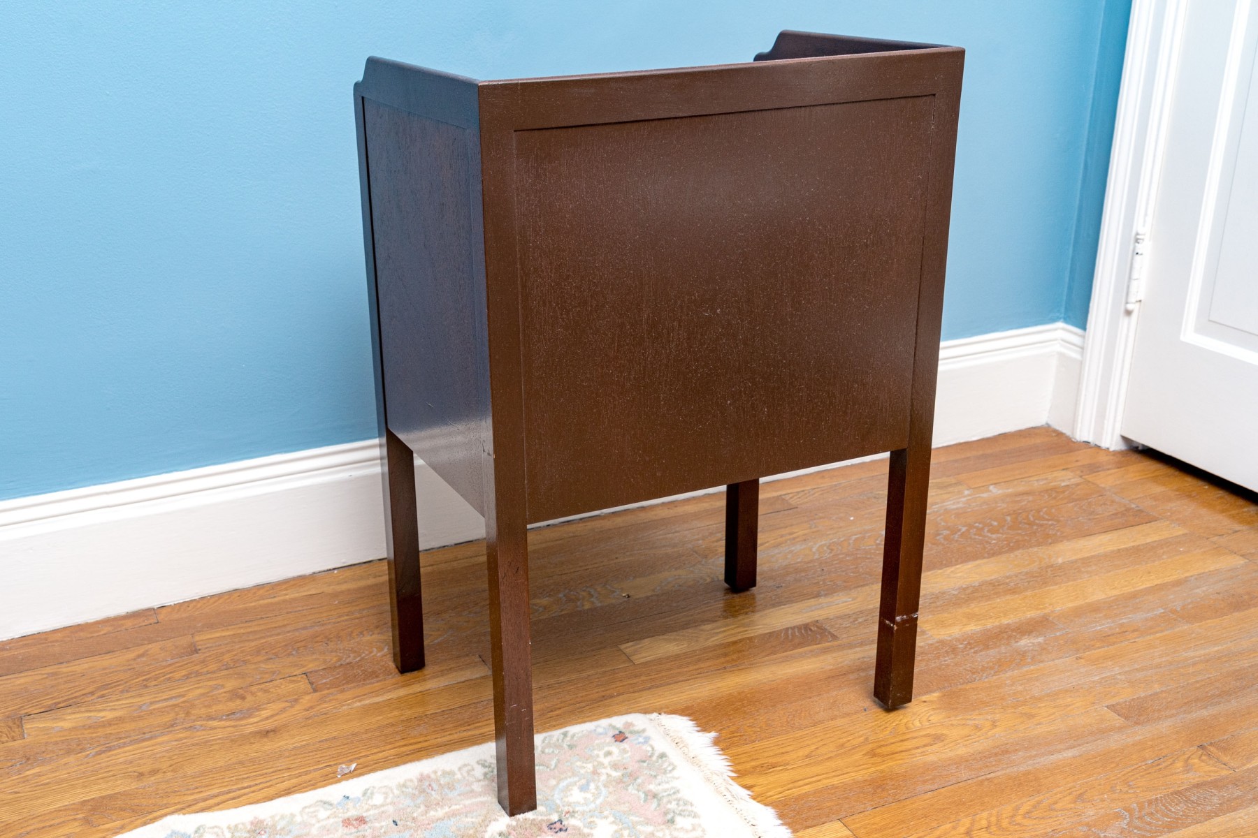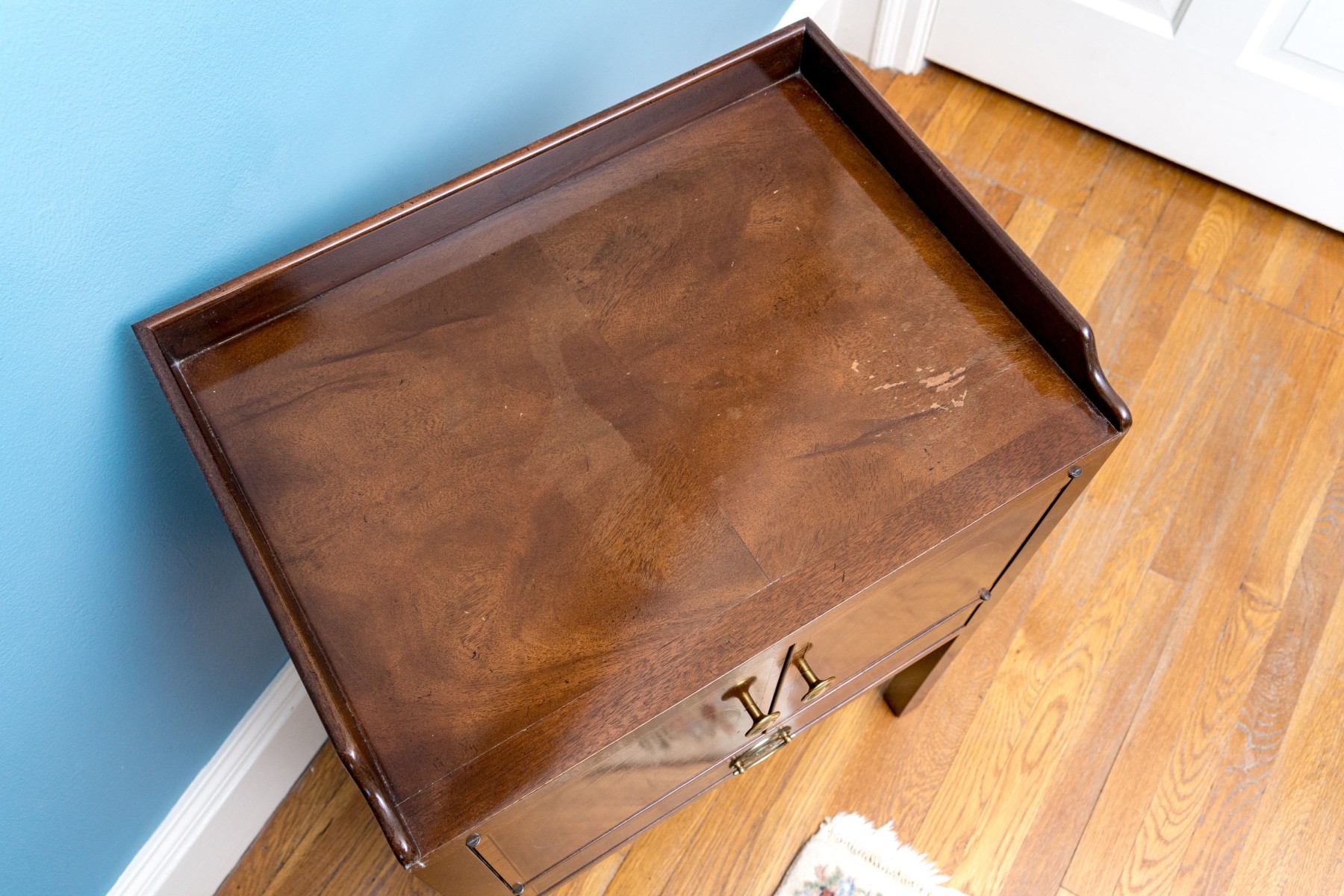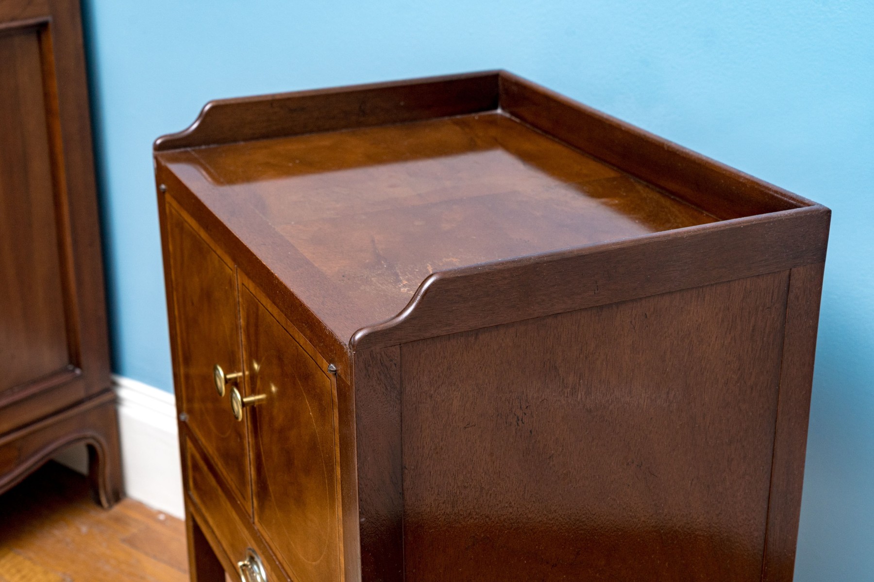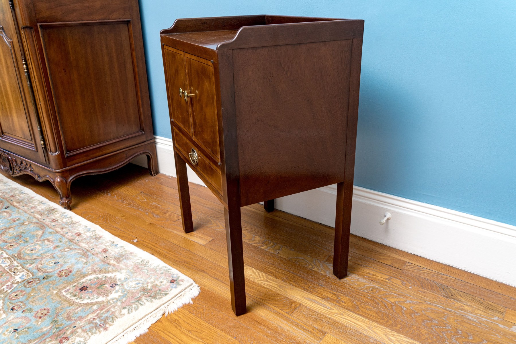 A high quality Georgian style commode cabinet in rich, dark brown mahogany with beautiful contrasting lighter hues. The cabinet feature a three-quarter gallery around the rectangular top and a case of double doors over a lower drawer. The cabinet doors are elegantly designed with banded edges and dainty circular inlaid panels, finished with brass knobs. The drawer follows suit with a banded design and a brass bail handle on an oval plaque. Raised over sleek and simple rectangular legs.