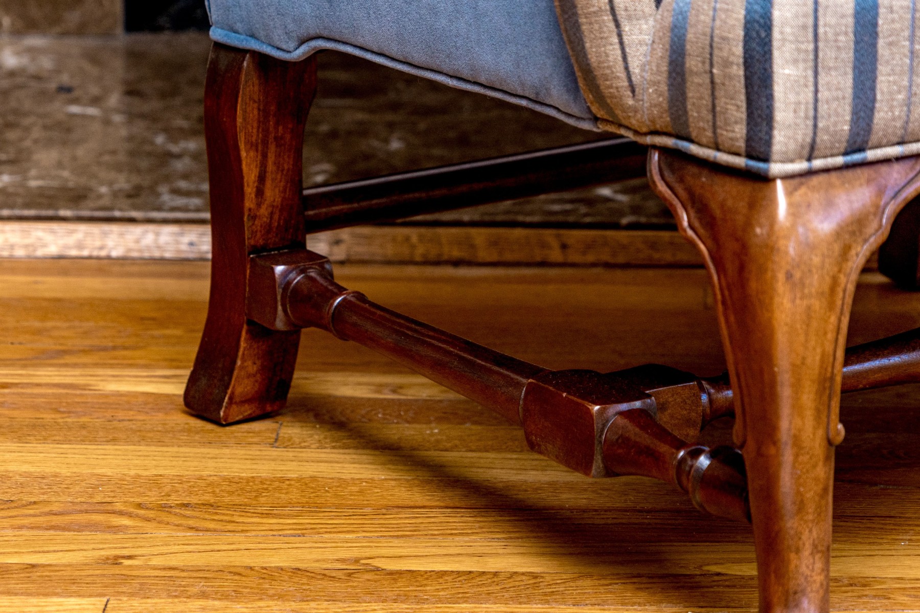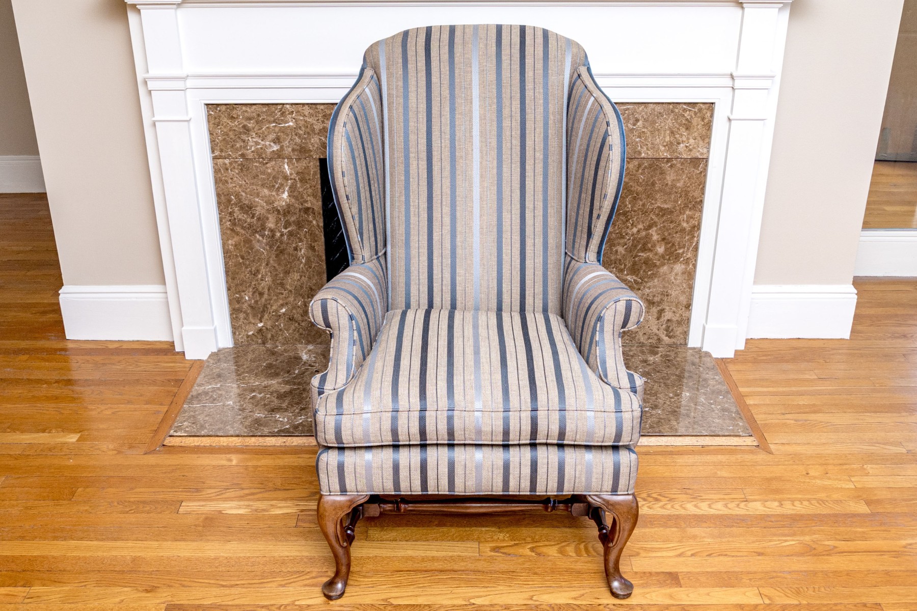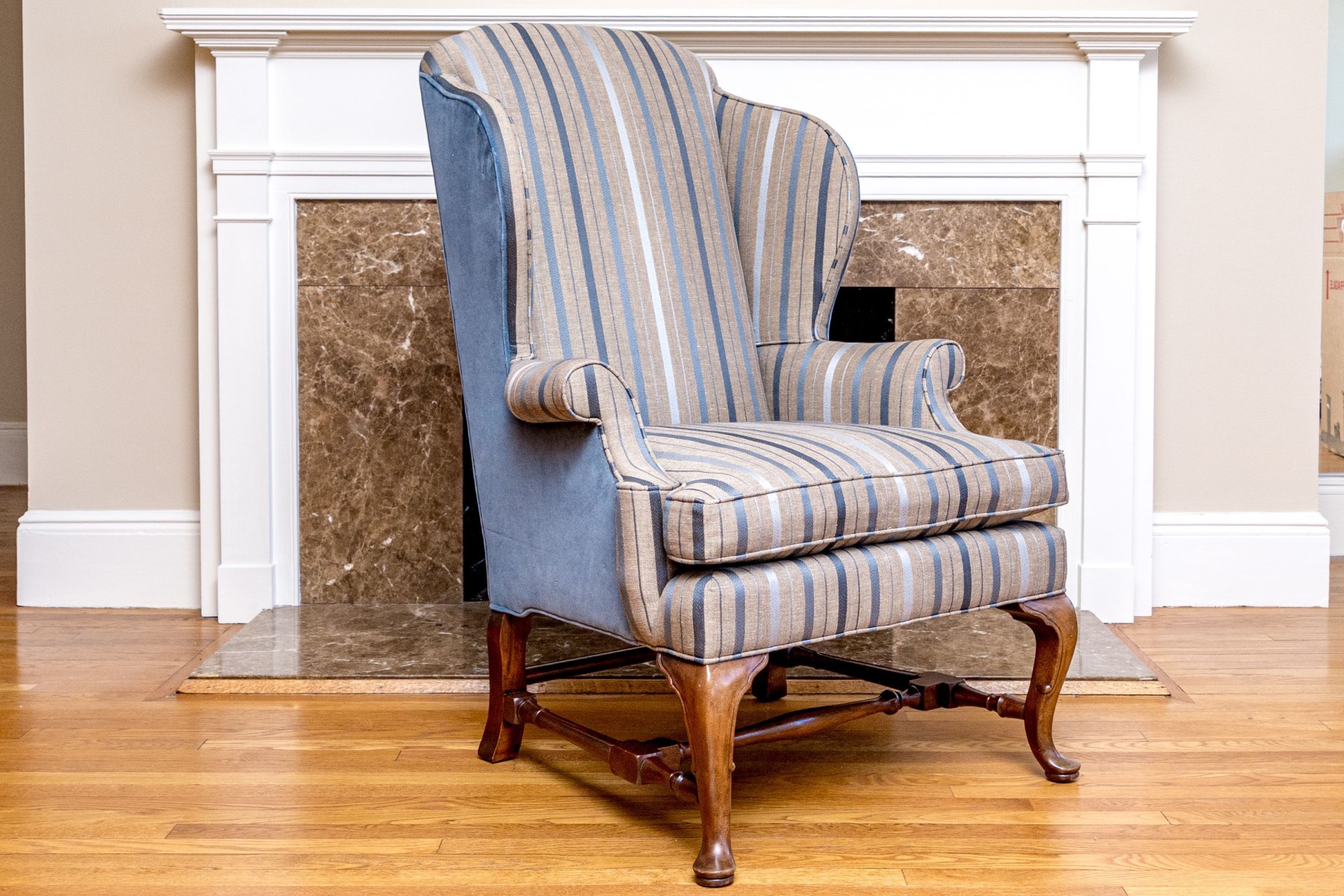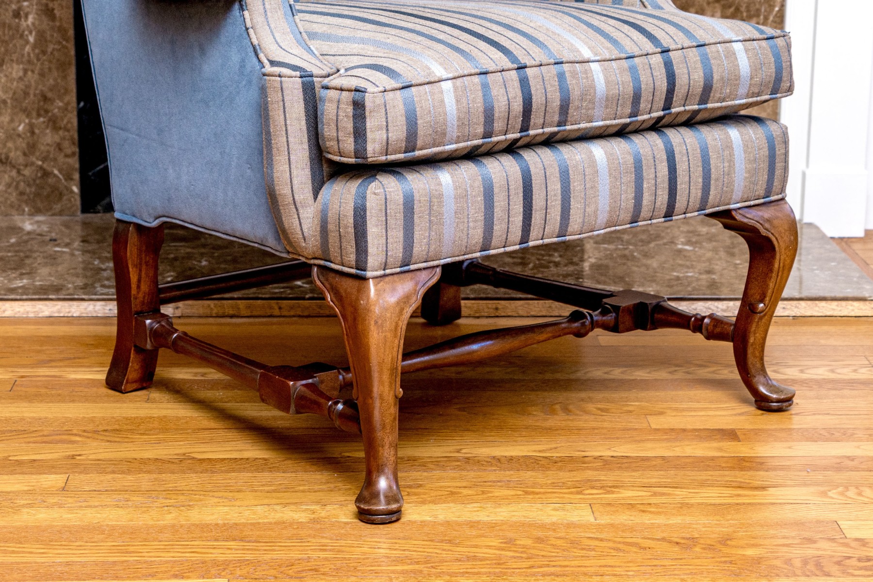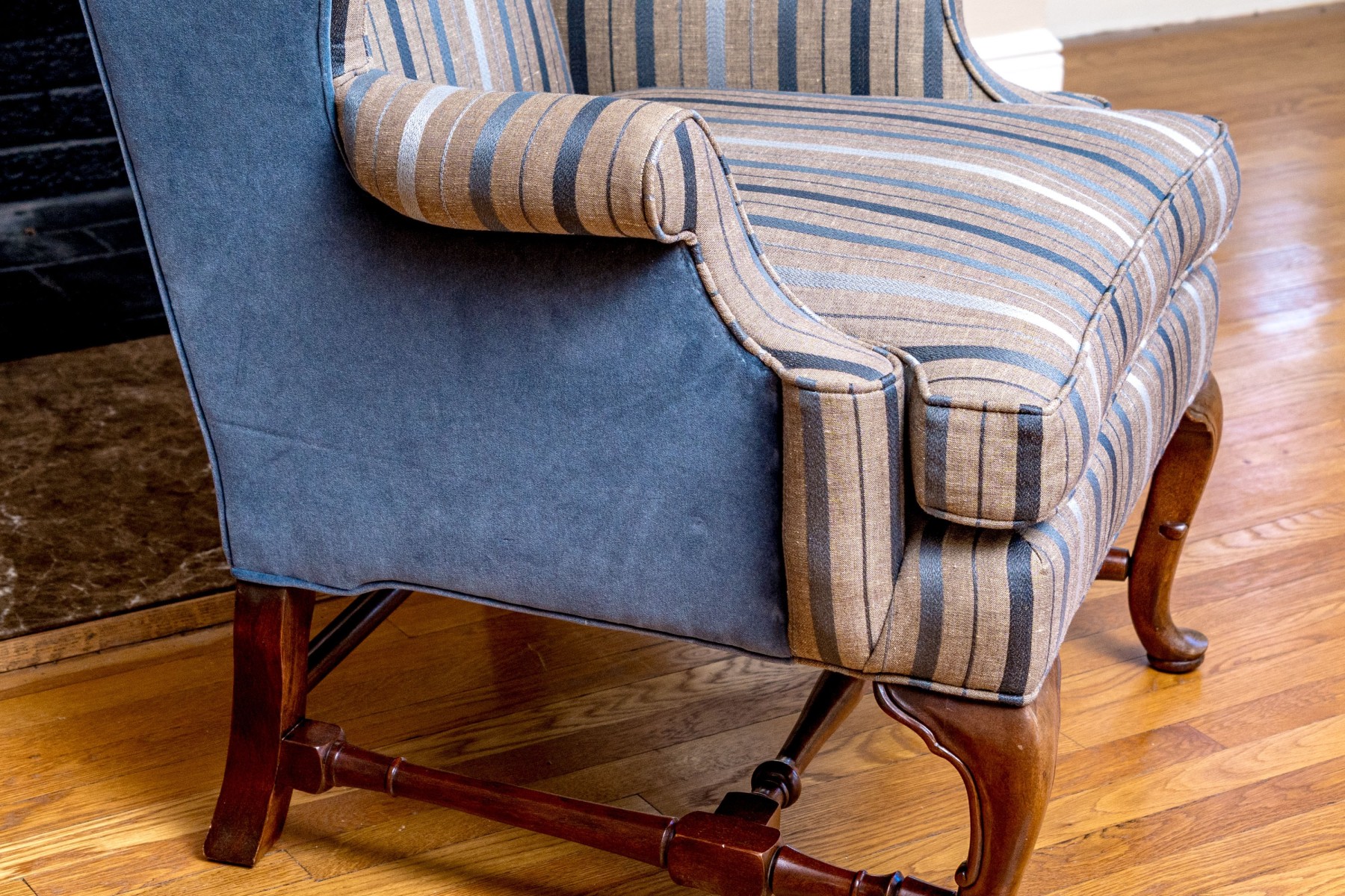 A handsome Queen Anne or Chippendale style wingback chair in classic form, designed with a tall and gently angled back, wide wing sides, and rolled arms leading to a loose seat cushion over a straight apron. Upholstered in gorgeous beige and blue striped fabric suitable for both traditional and contemporary styles. raised over warm-toned medium brown cabriole front legs with a nicely turned H-stretcher.