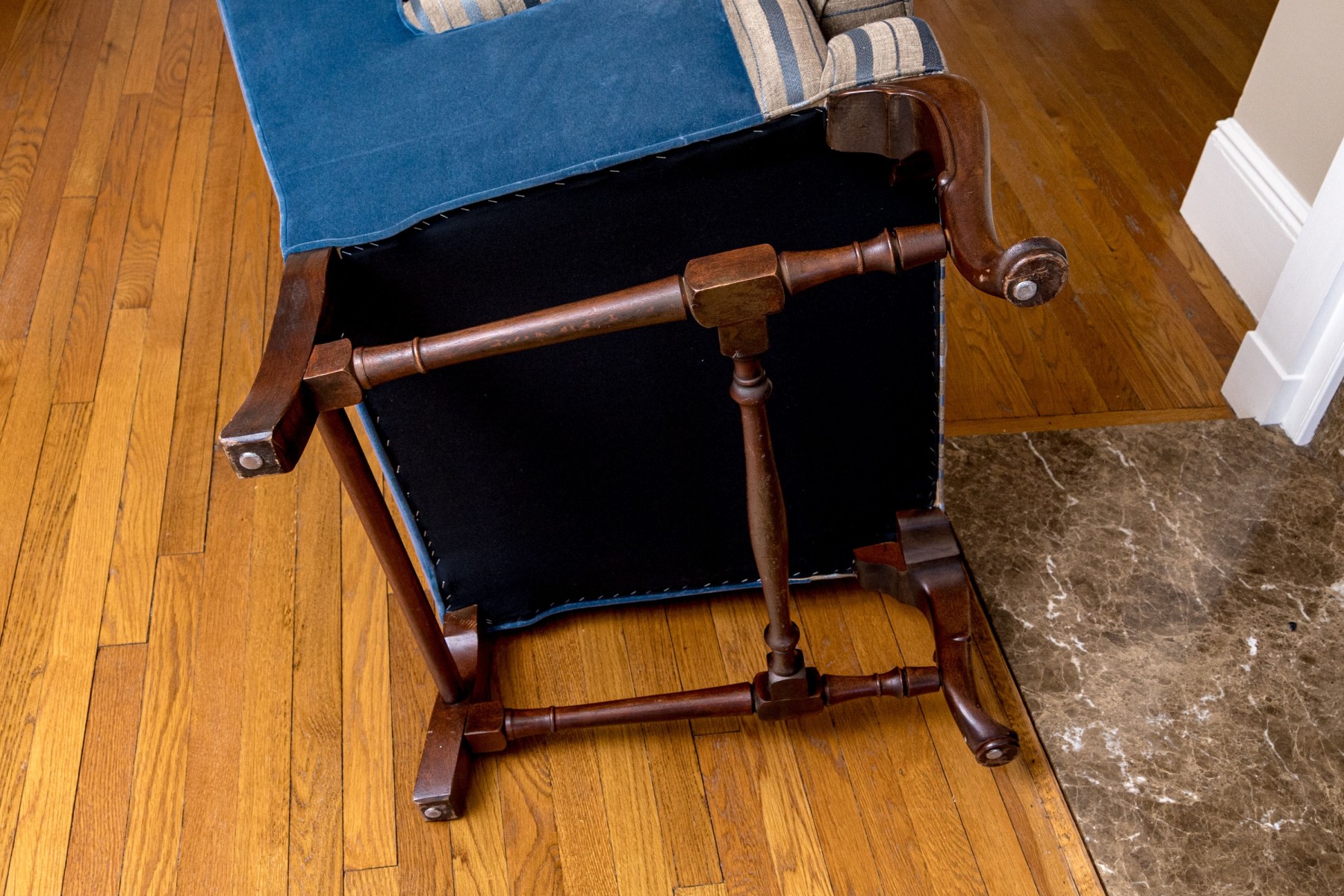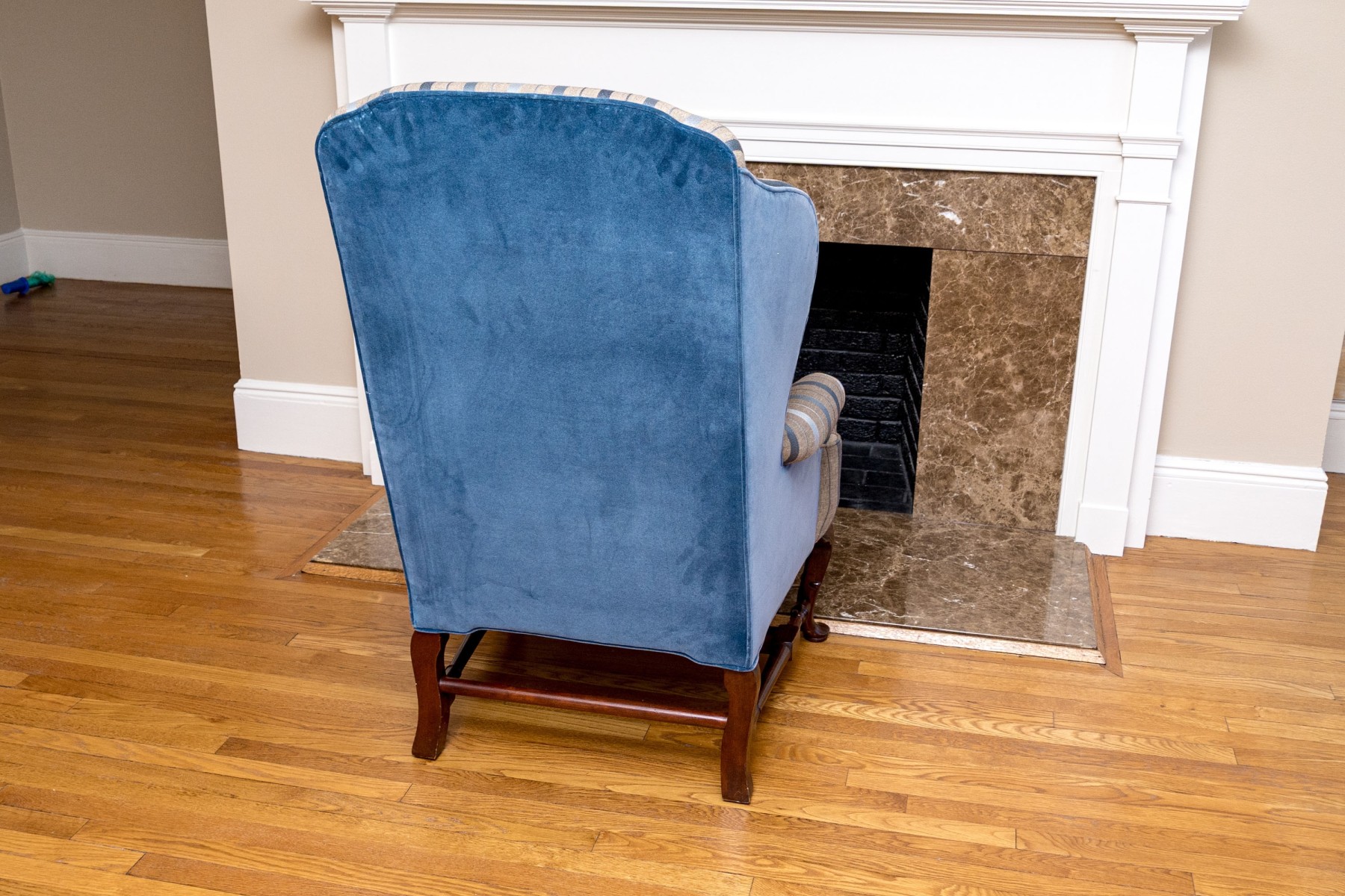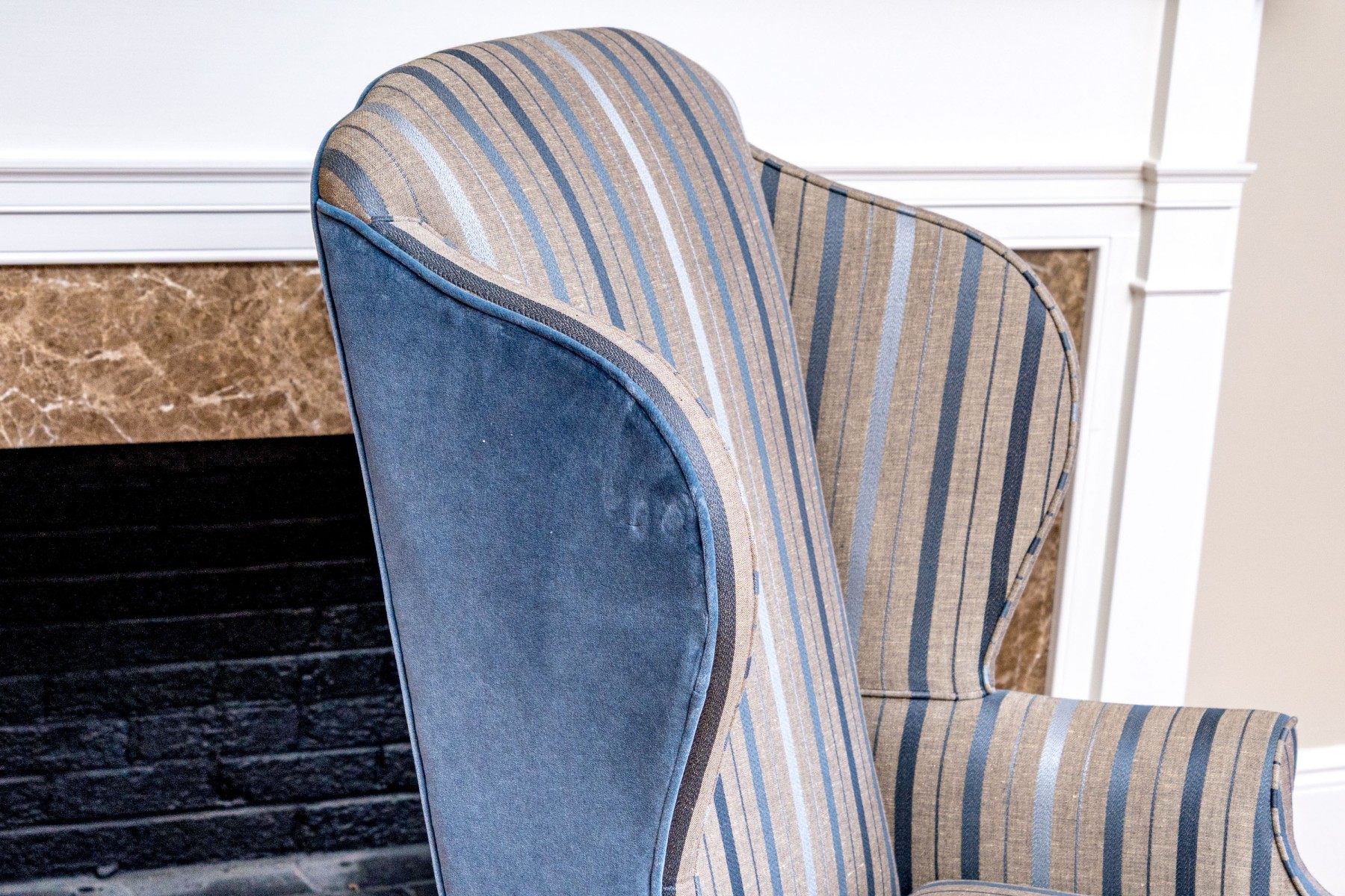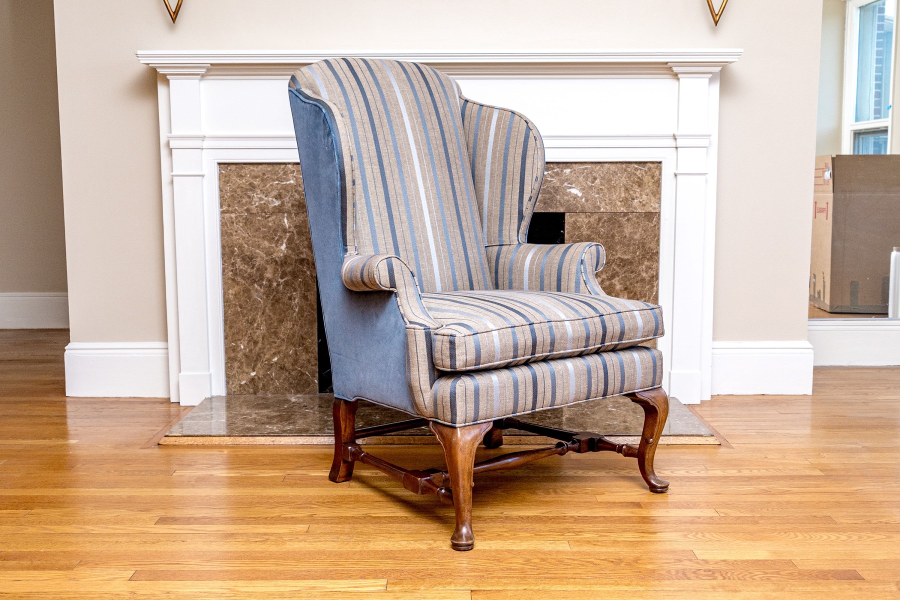 A handsome Queen Anne or Chippendale style wingback chair in classic form, designed with a tall and gently angled back, wide wing sides, and rolled arms leading to a loose seat cushion over a straight apron. Upholstered in gorgeous beige and blue striped fabric suitable for both traditional and contemporary styles. raised over warm-toned medium brown cabriole front legs with a nicely turned H-stretcher.