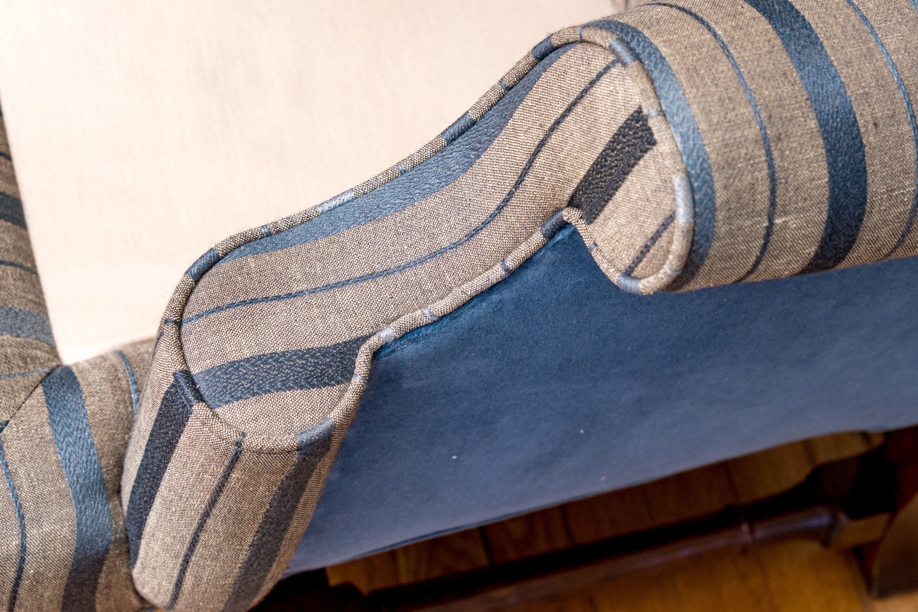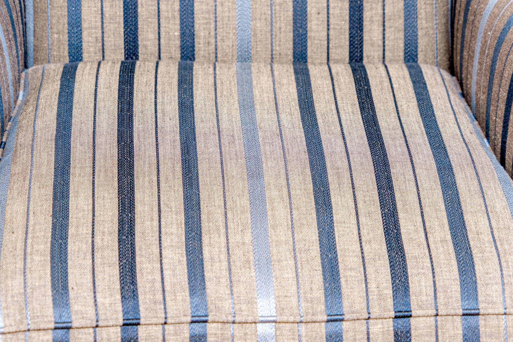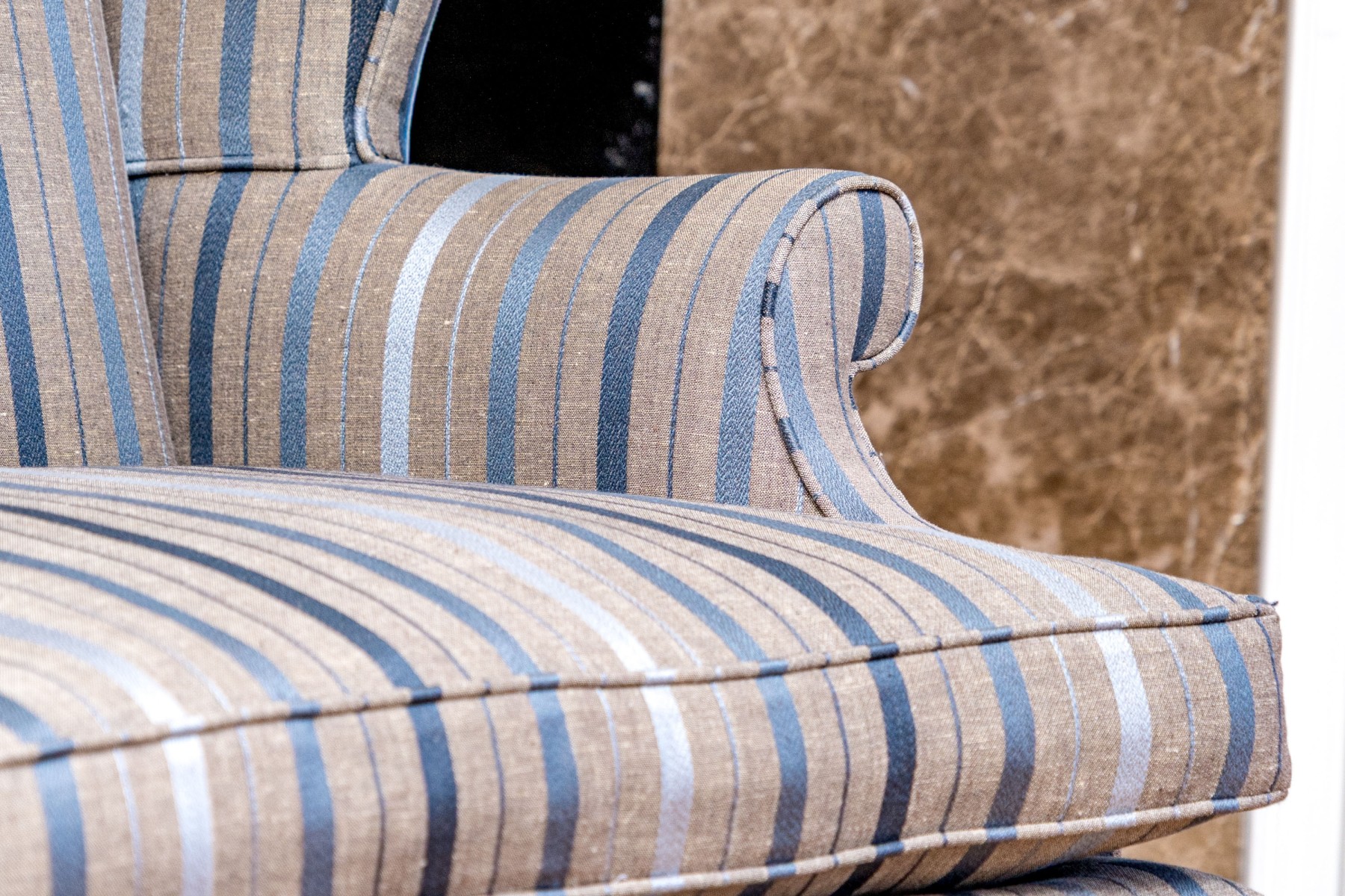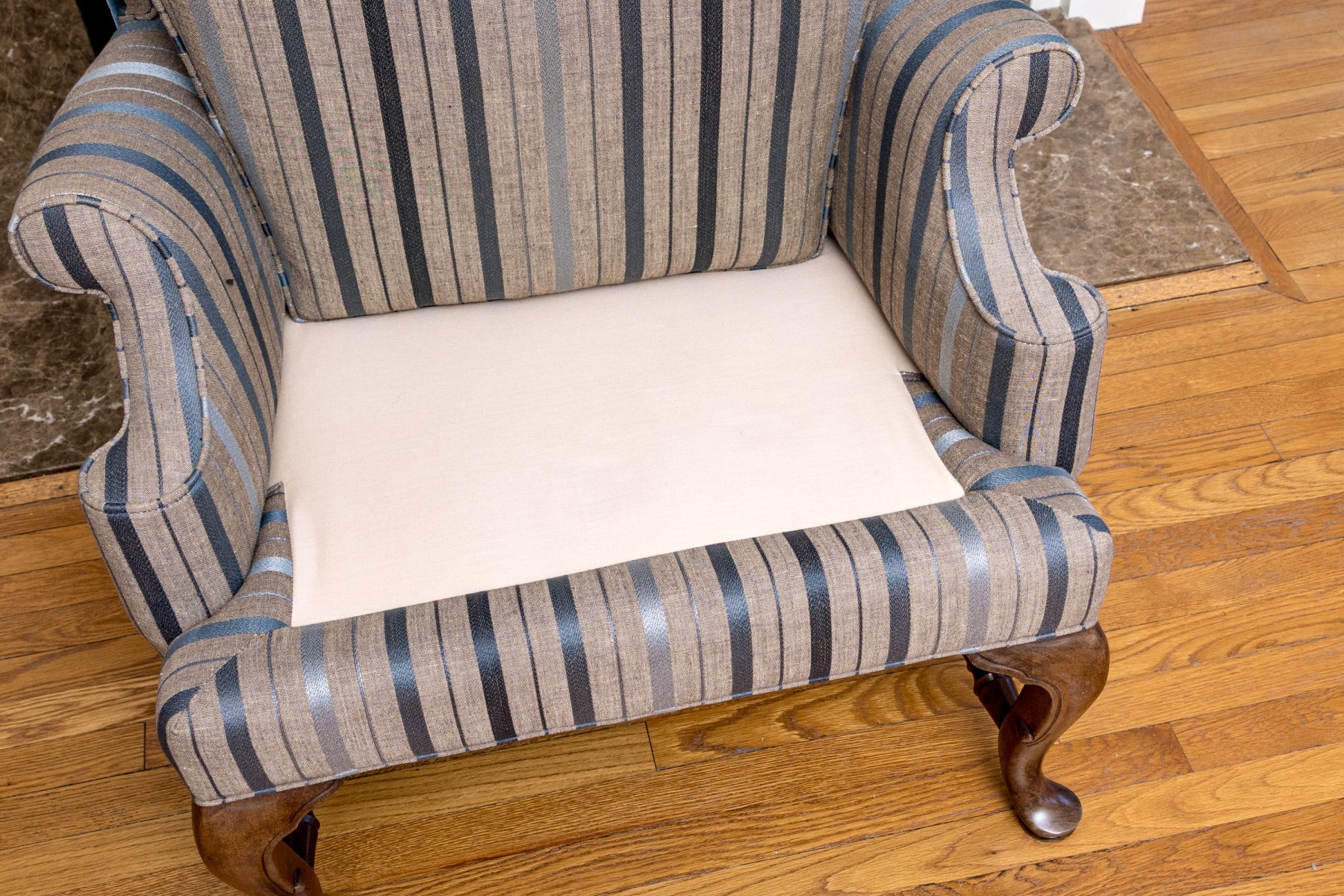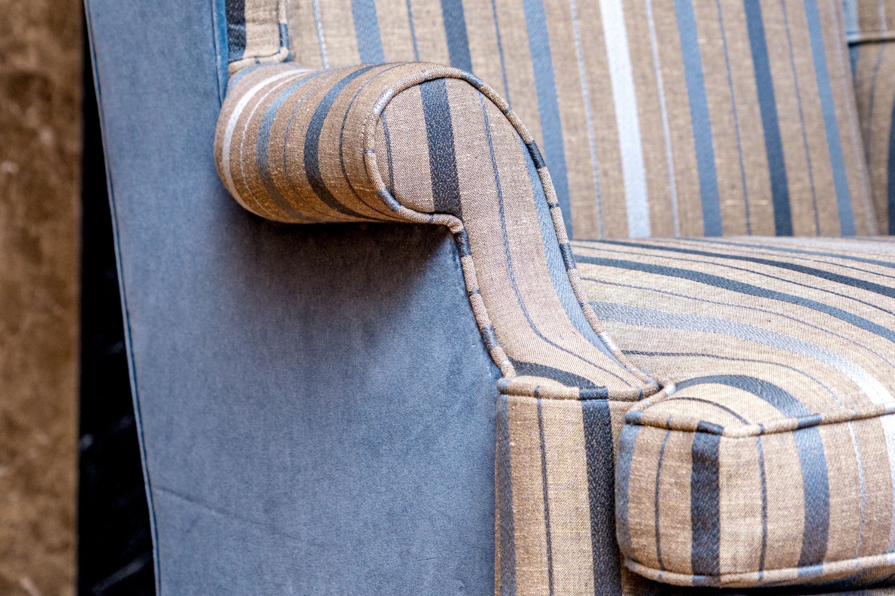 A handsome Queen Anne or Chippendale style wingback chair in classic form, designed with a tall and gently angled back, wide wing sides, and rolled arms leading to a loose seat cushion over a straight apron. Upholstered in gorgeous beige and blue striped fabric suitable for both traditional and contemporary styles. raised over warm-toned medium brown cabriole front legs with a nicely turned H-stretcher.