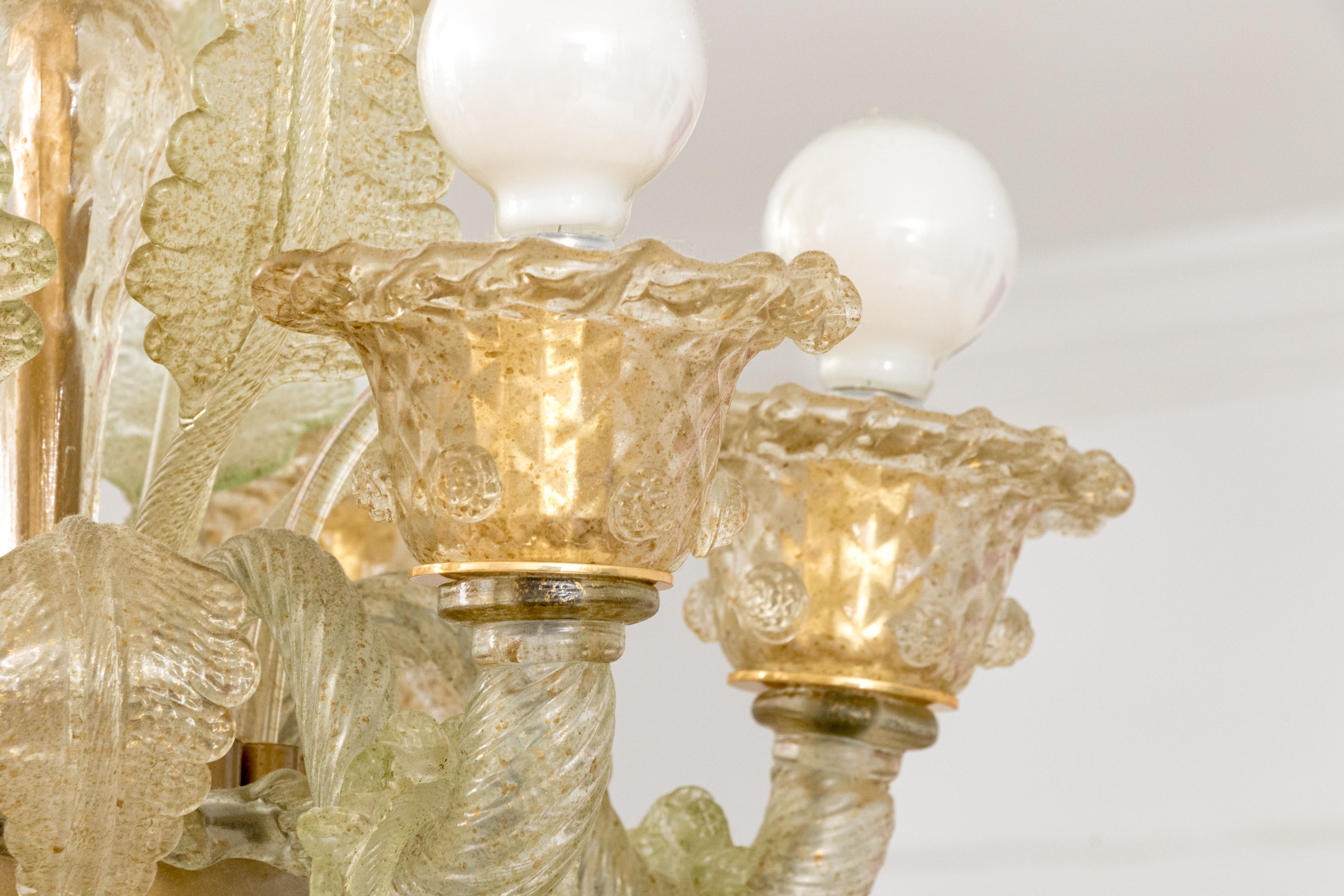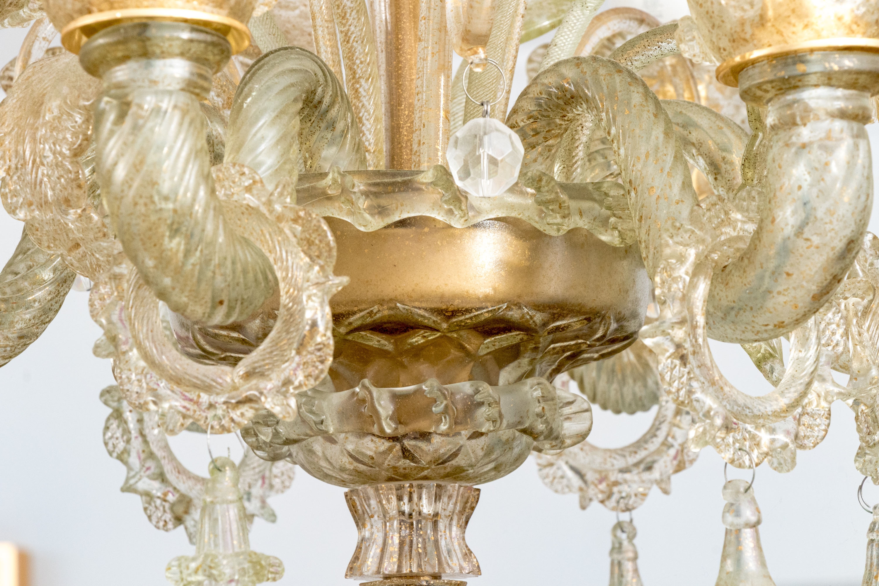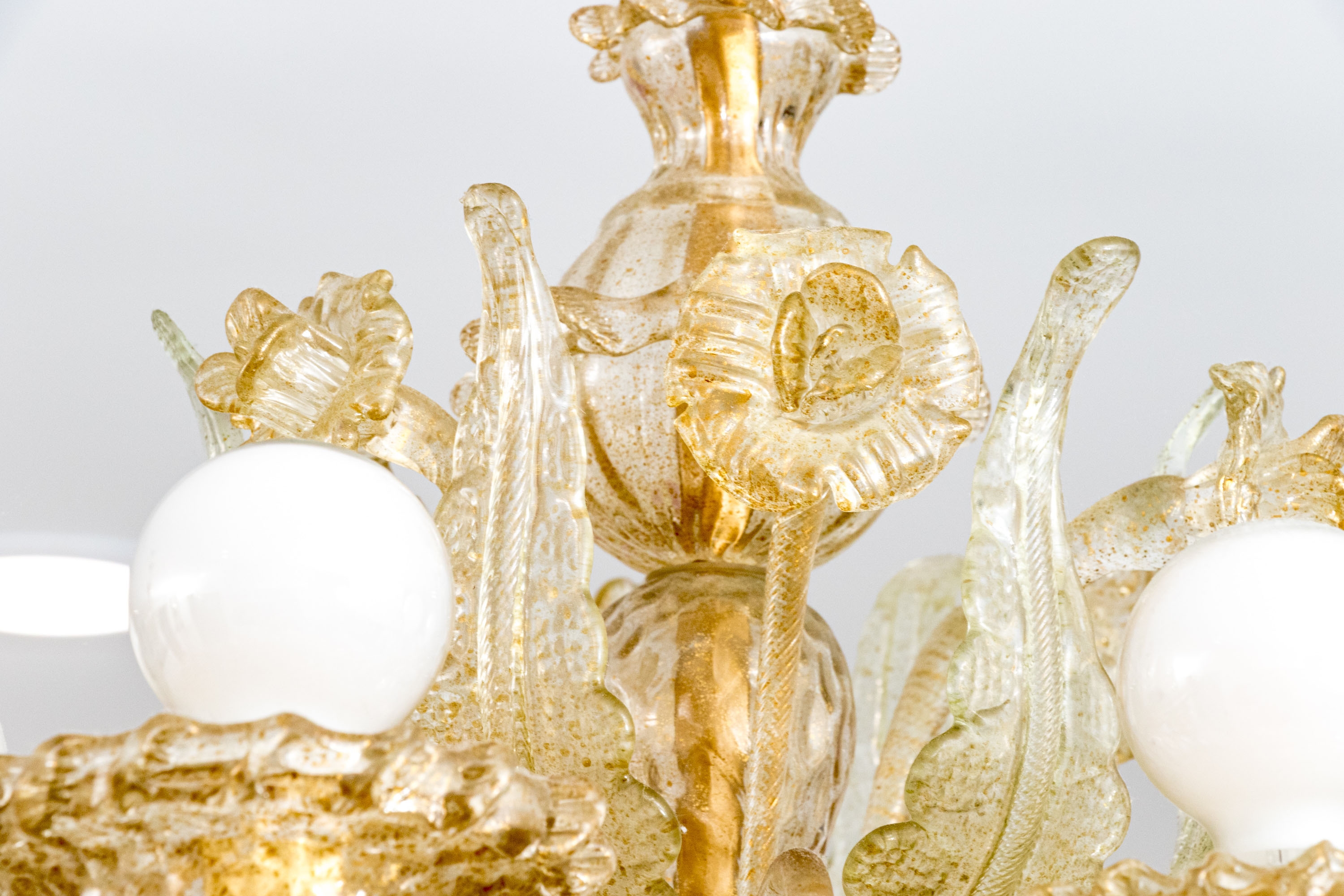 With six arms for six bulbs the chandelier hangs from a gilt metal foliate form ceiling cap with short chain leading to the ornately blown glass chandelier with gilt finish and swirled glass.