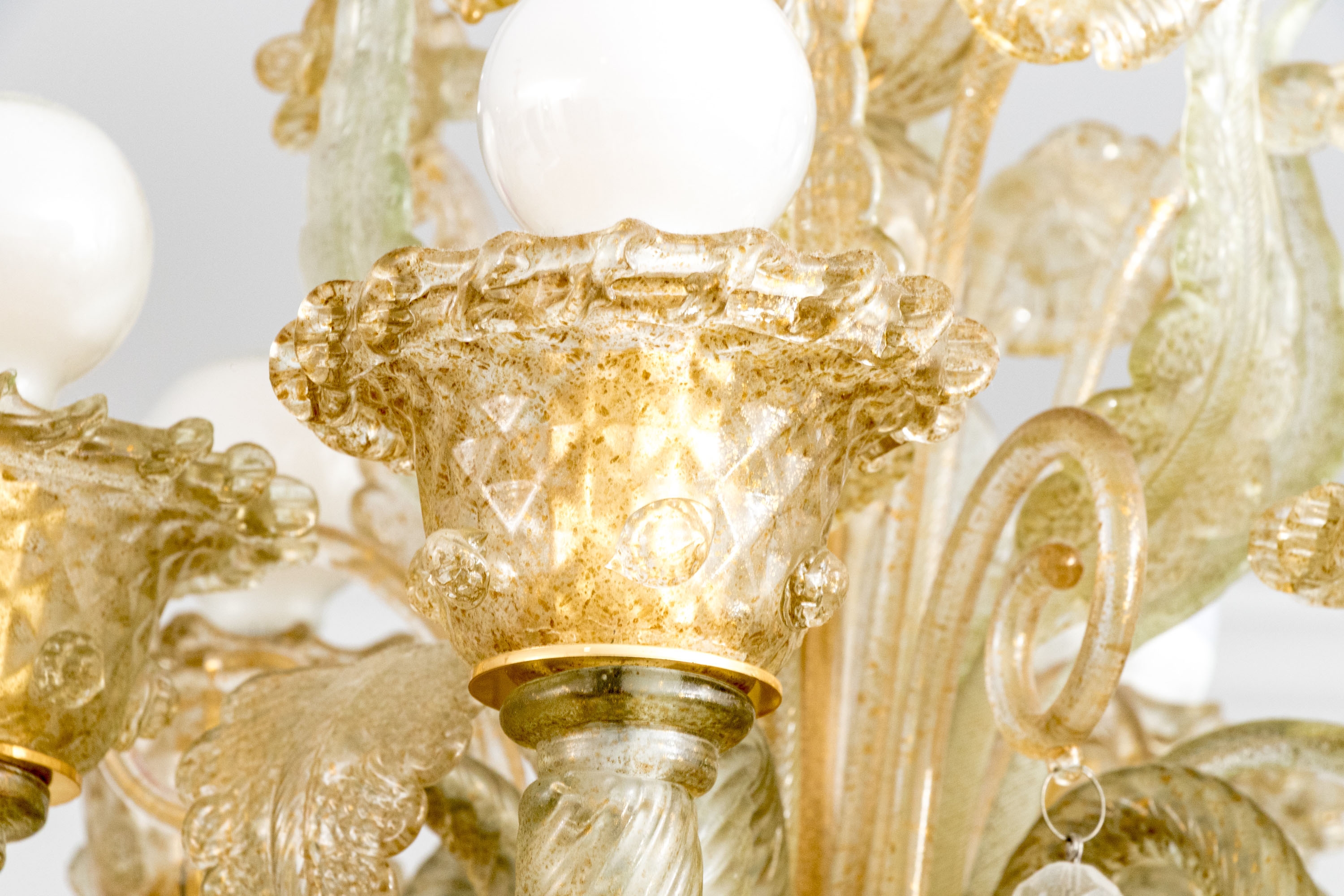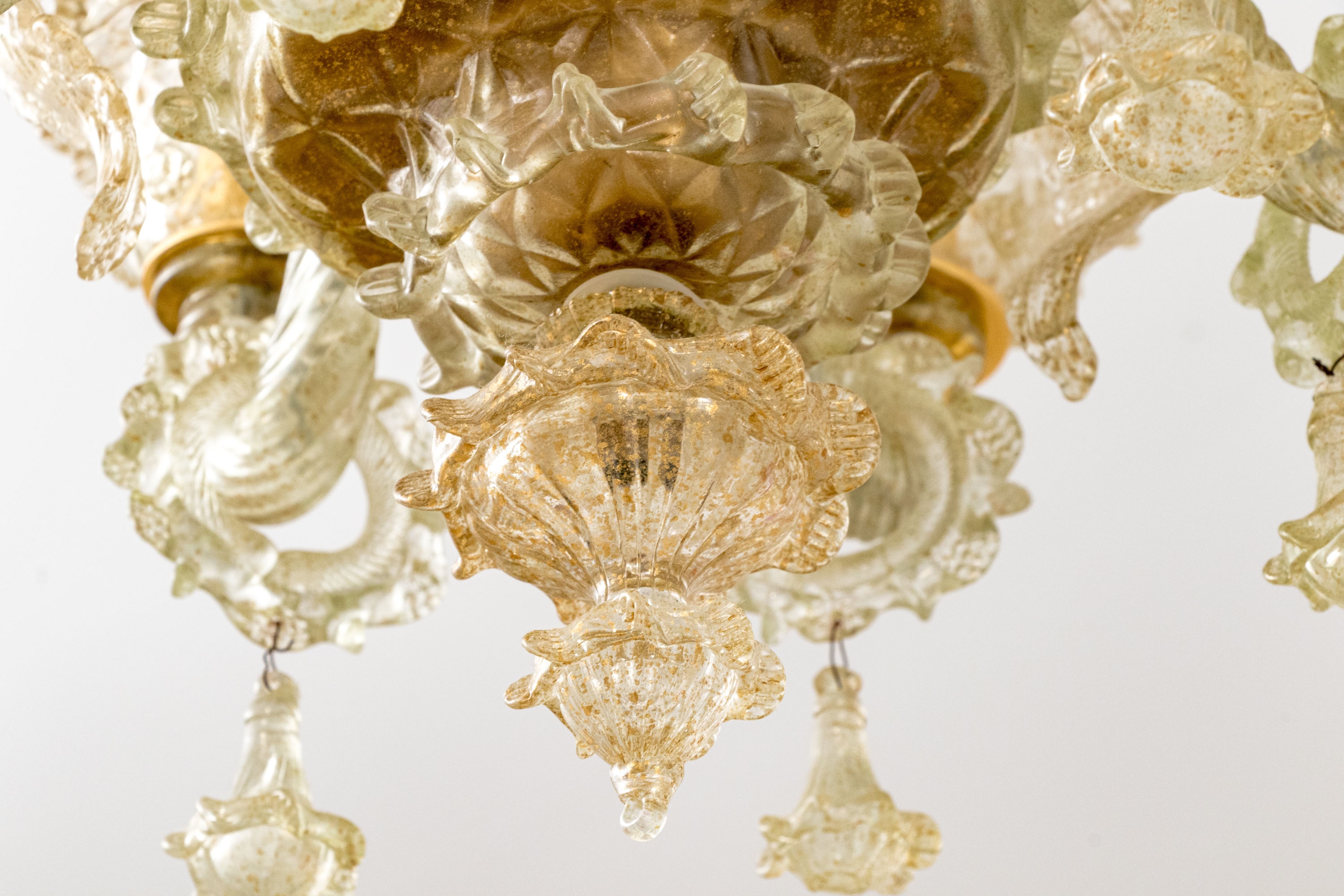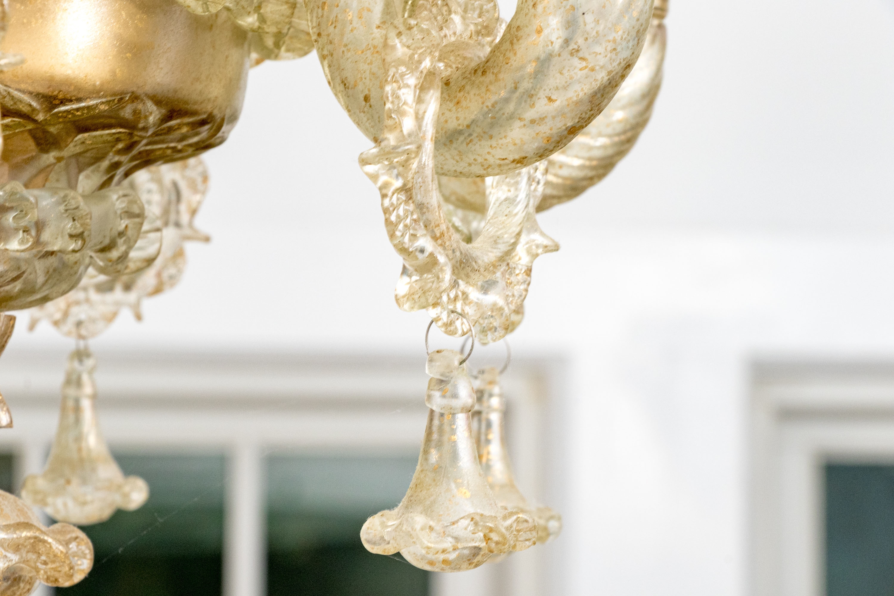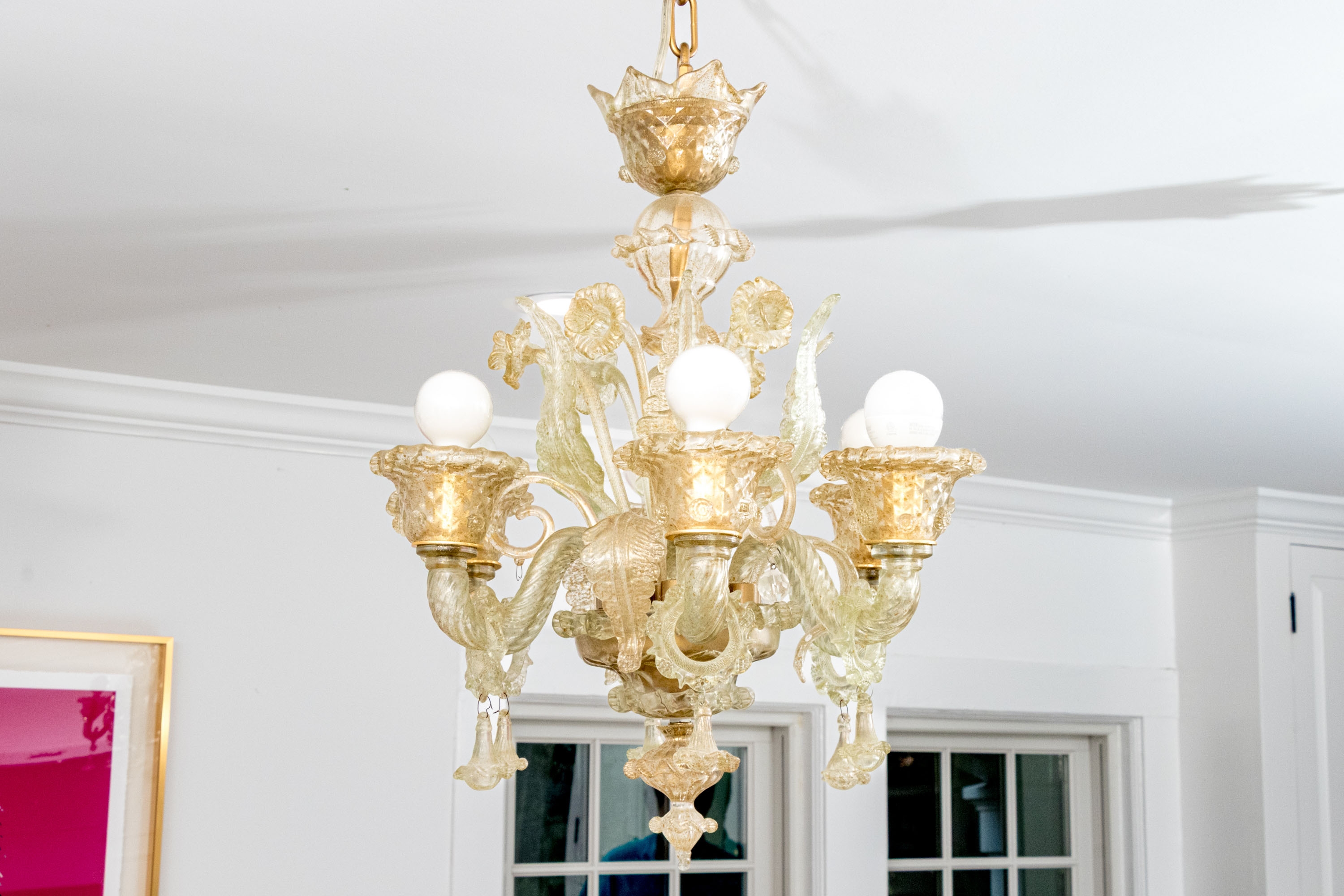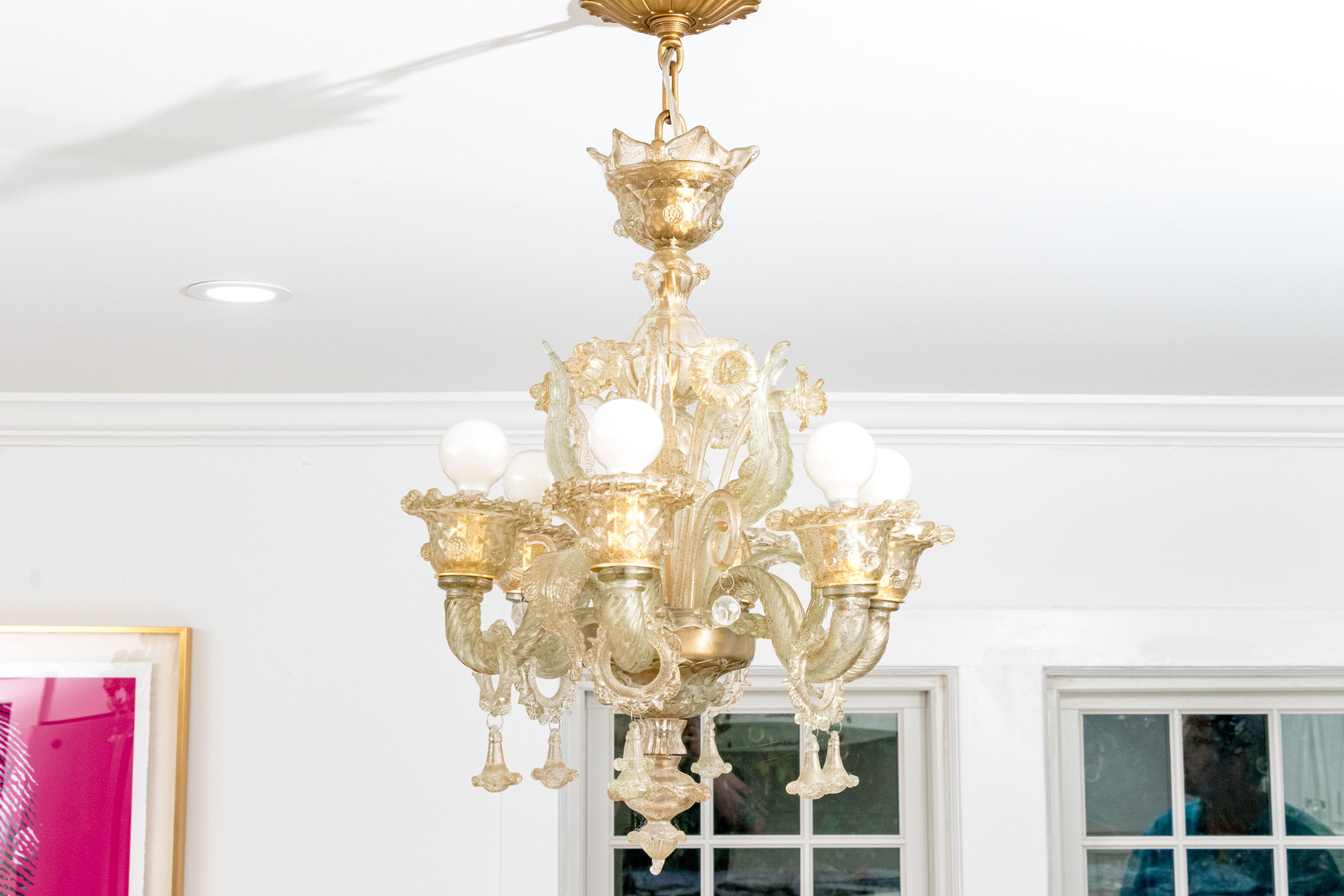 With six arms for six bulbs the chandelier hangs from a gilt metal foliate form ceiling cap with short chain leading to the ornately blown glass chandelier with gilt finish and swirled glass.