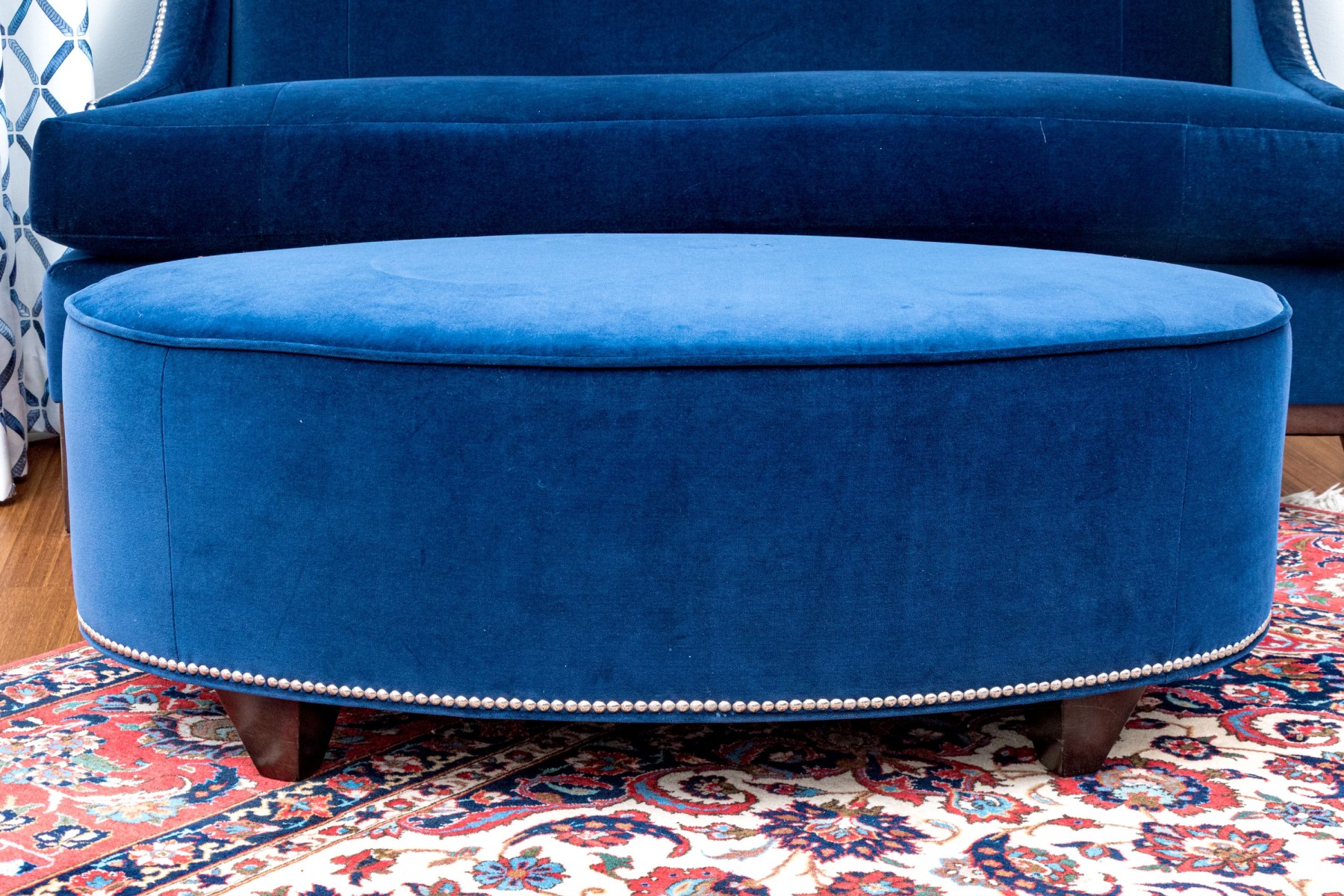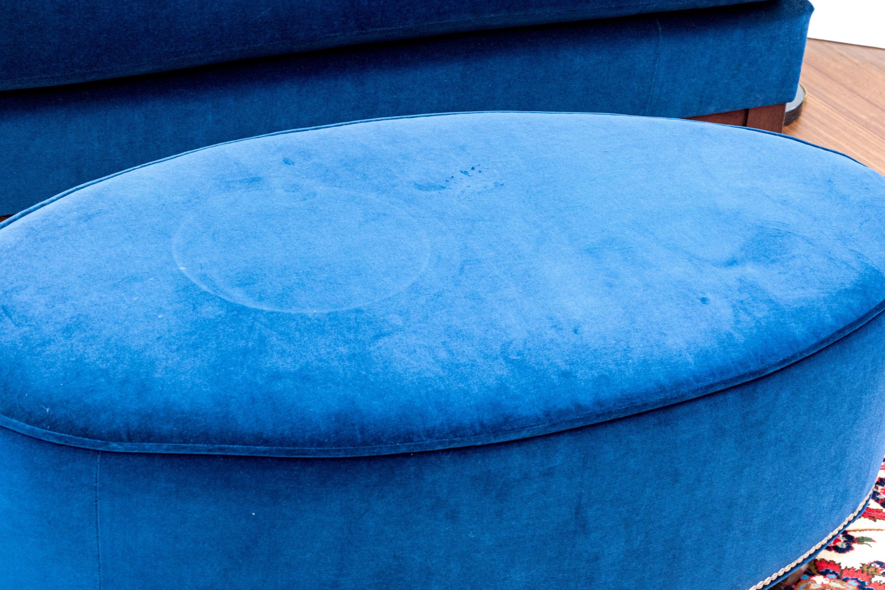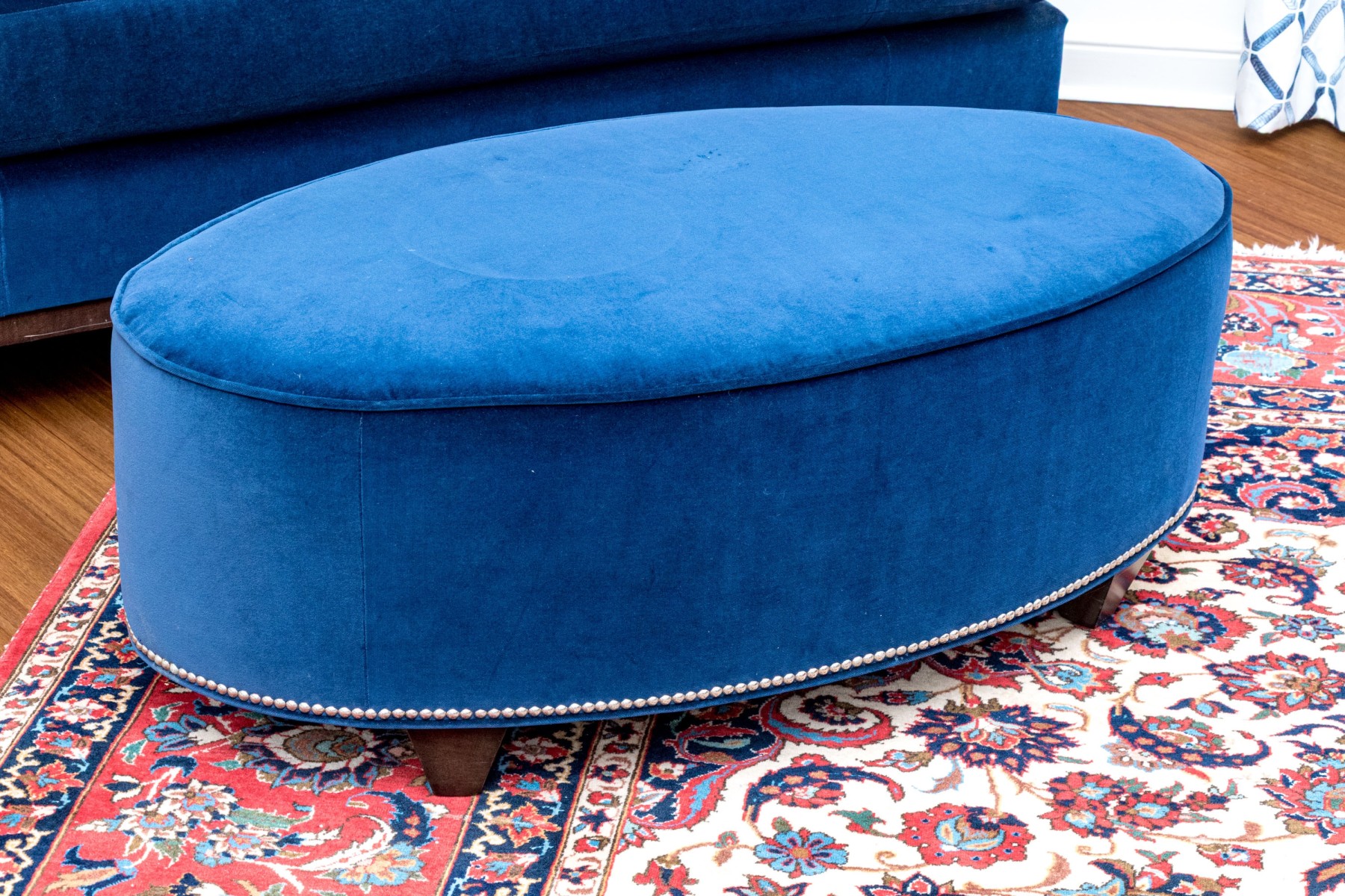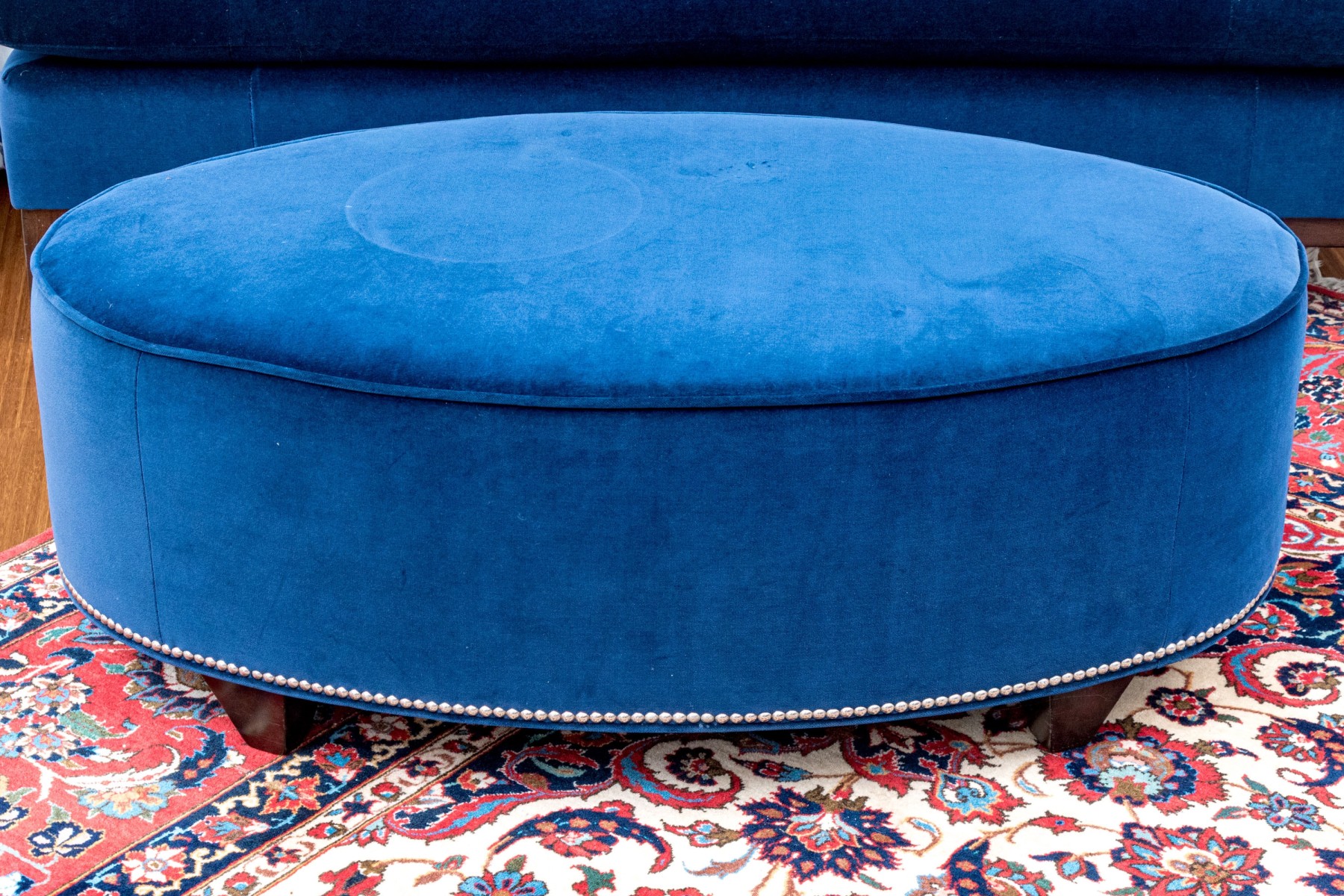 Quality oval blue velvet upholstered oval ottoman standing upon four feet. The oval ottoman with piped trim and with a band of tack nailhead trim to the base adding a layer of visual aesthetic.