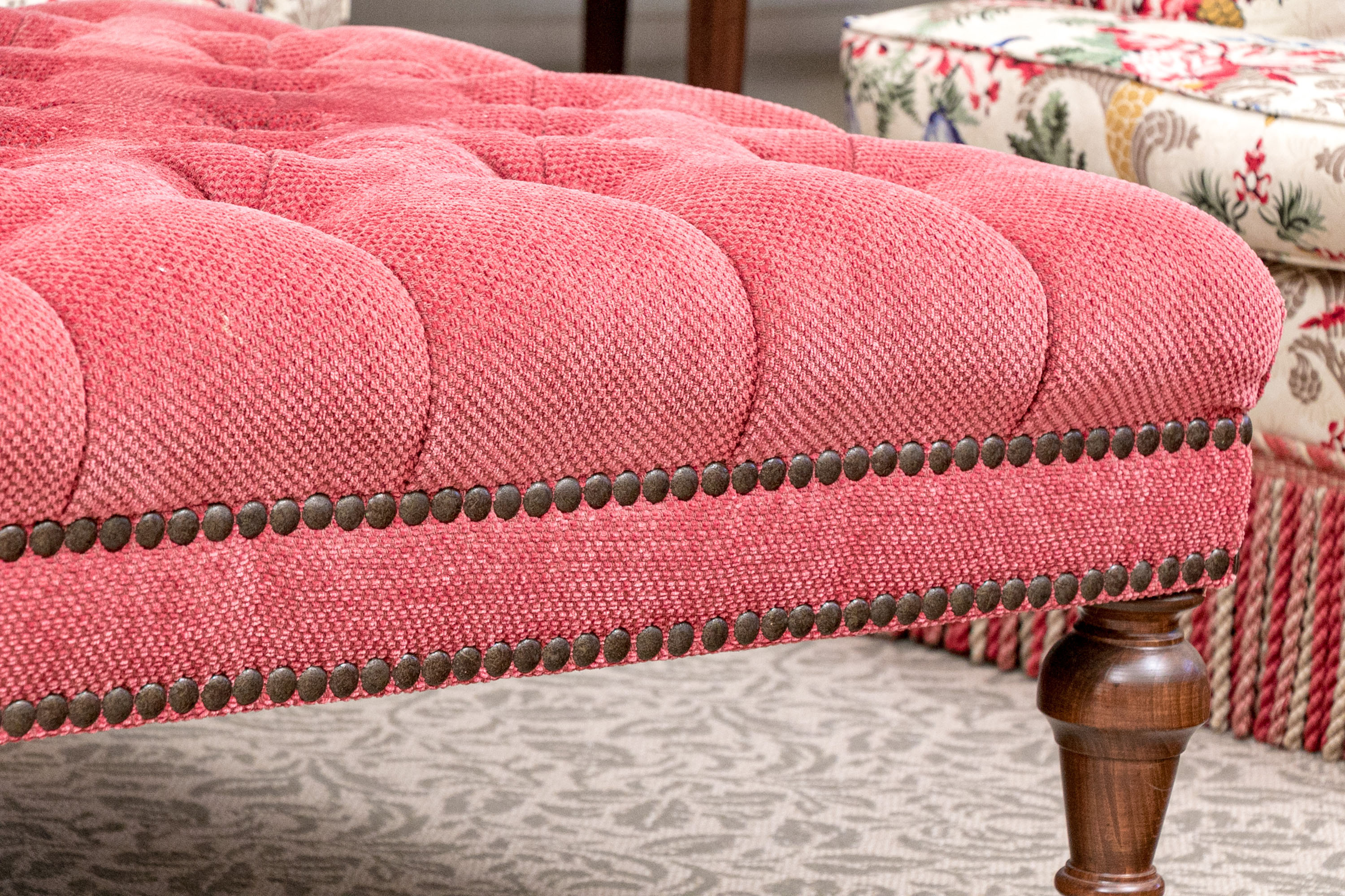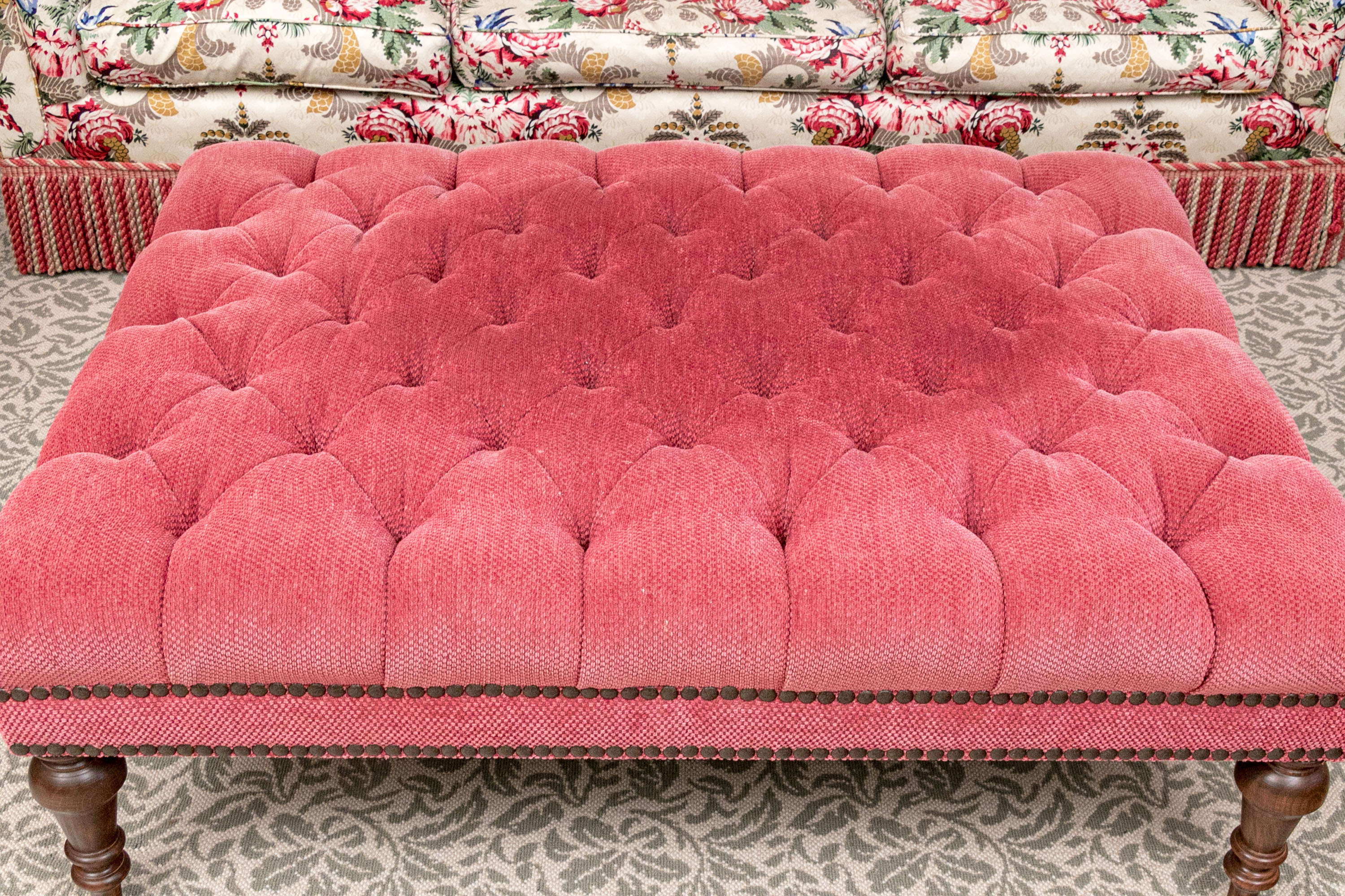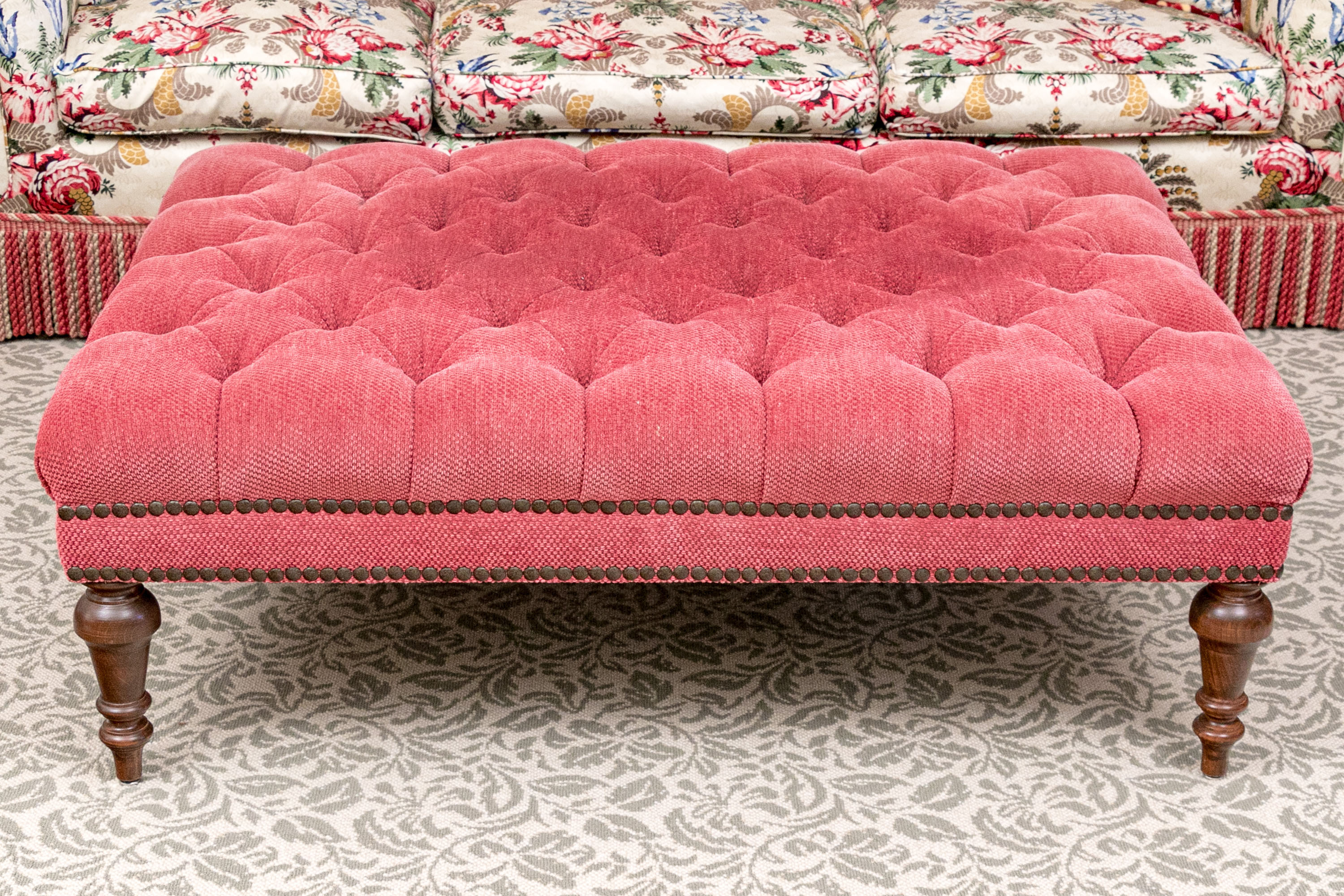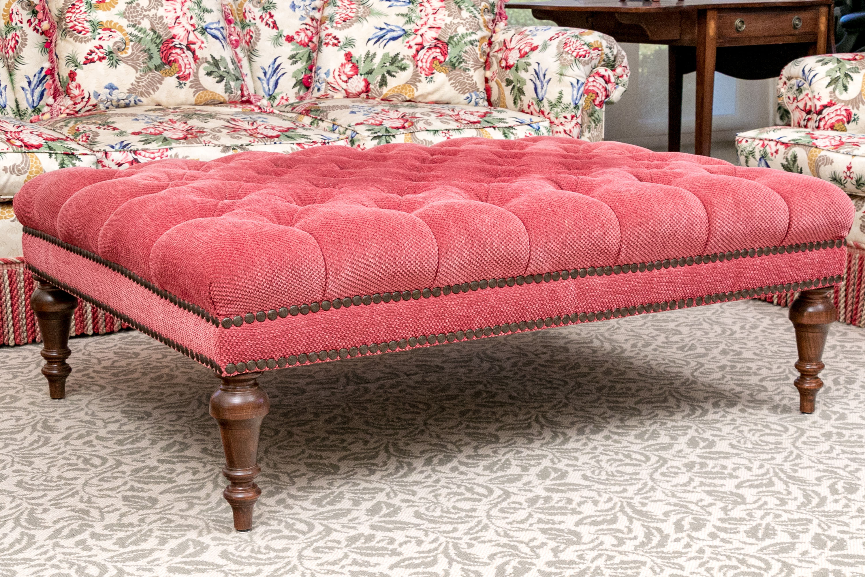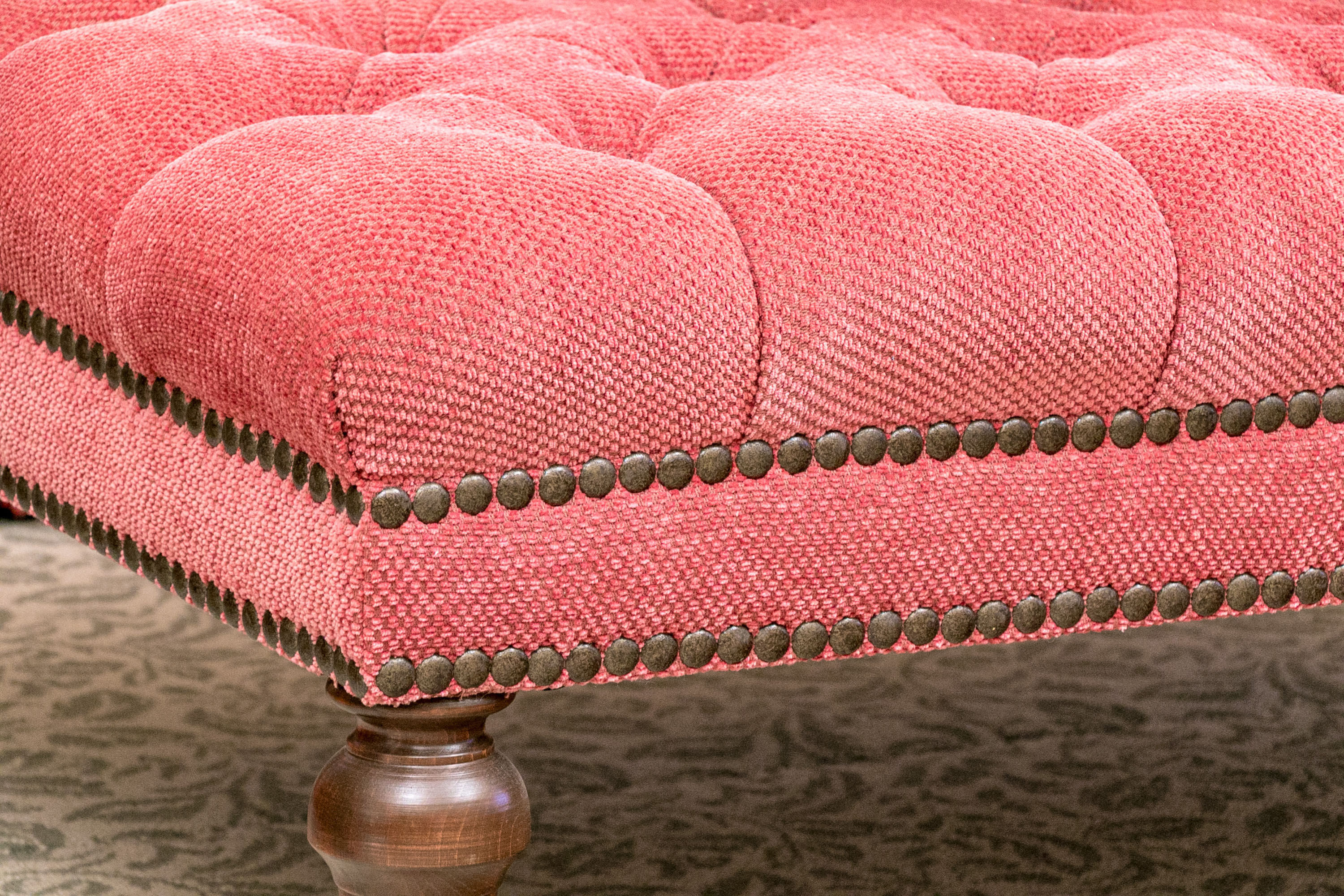 Raised on four turned mahogany legs, the oversized ottoman is luxuriously custom upholstered and tufted. A trim band of brass tack nailhead trim to affix upholstery to frame.