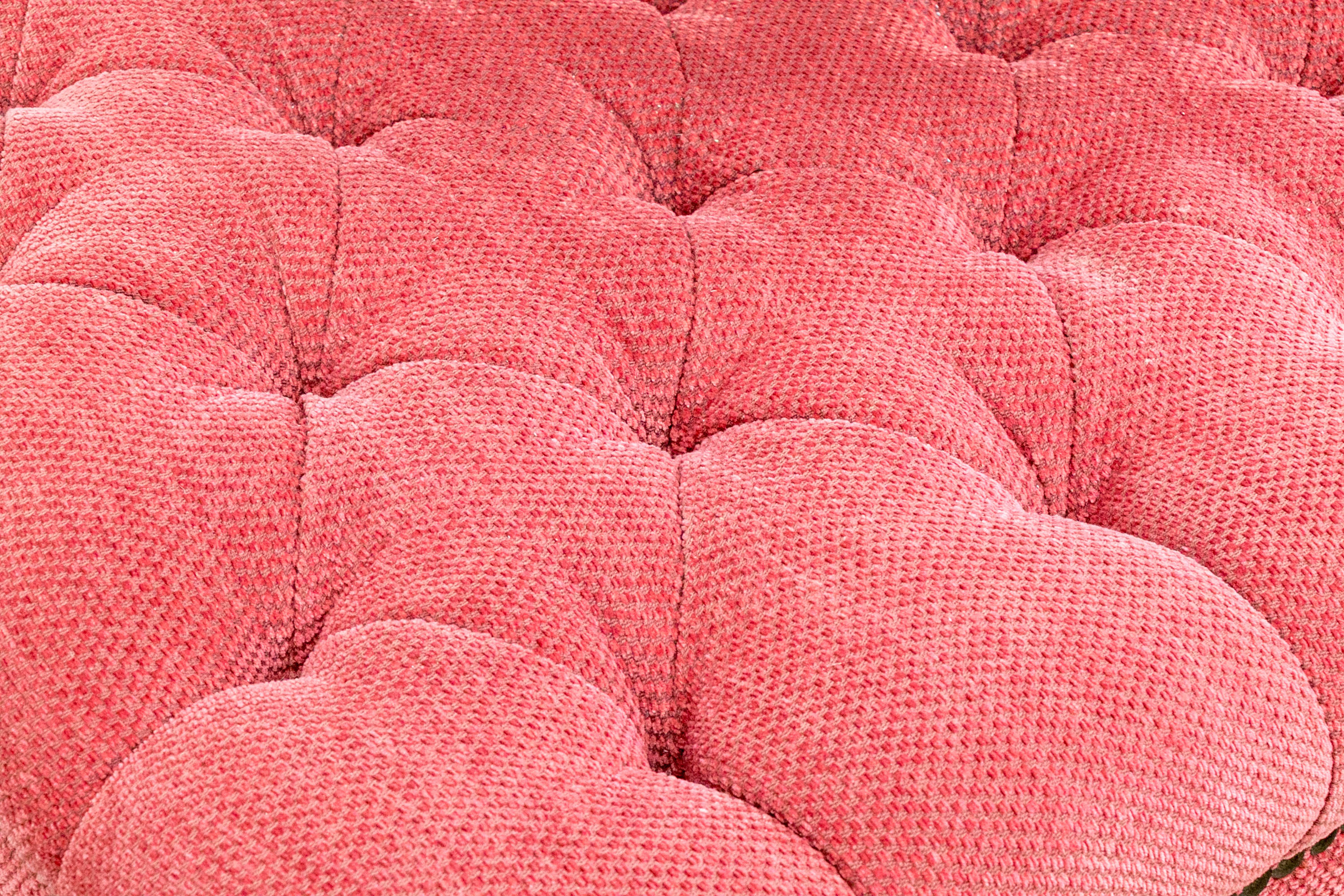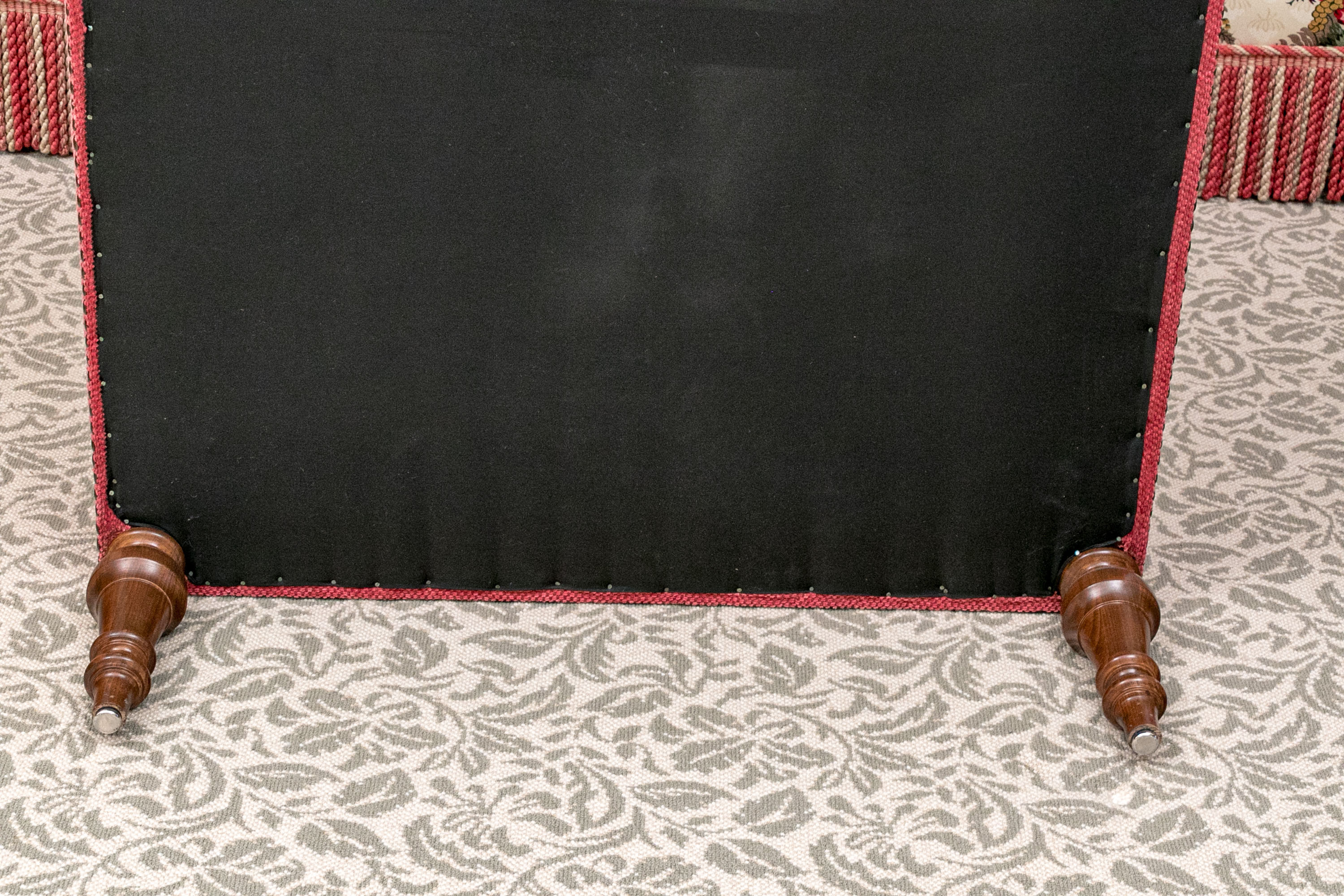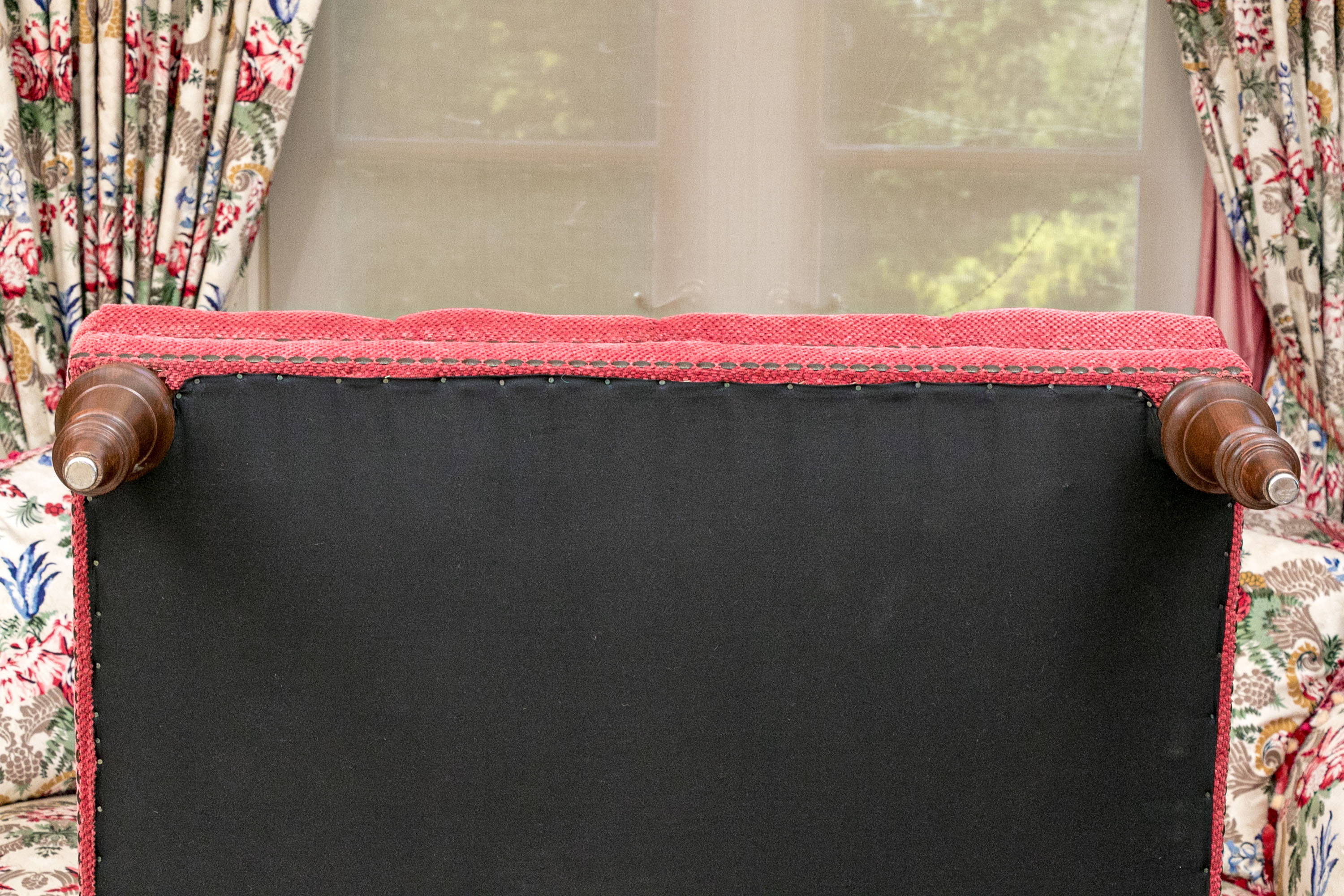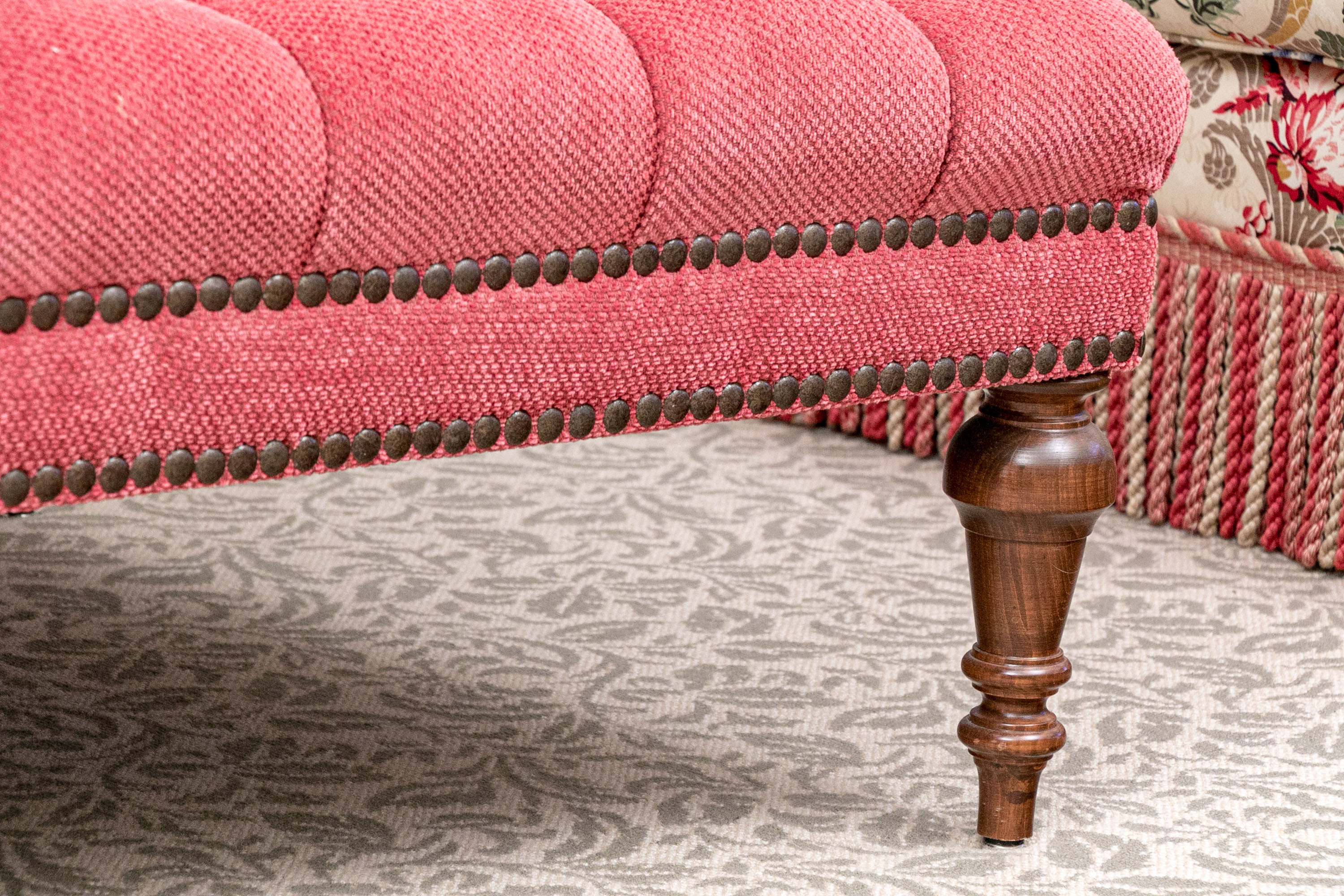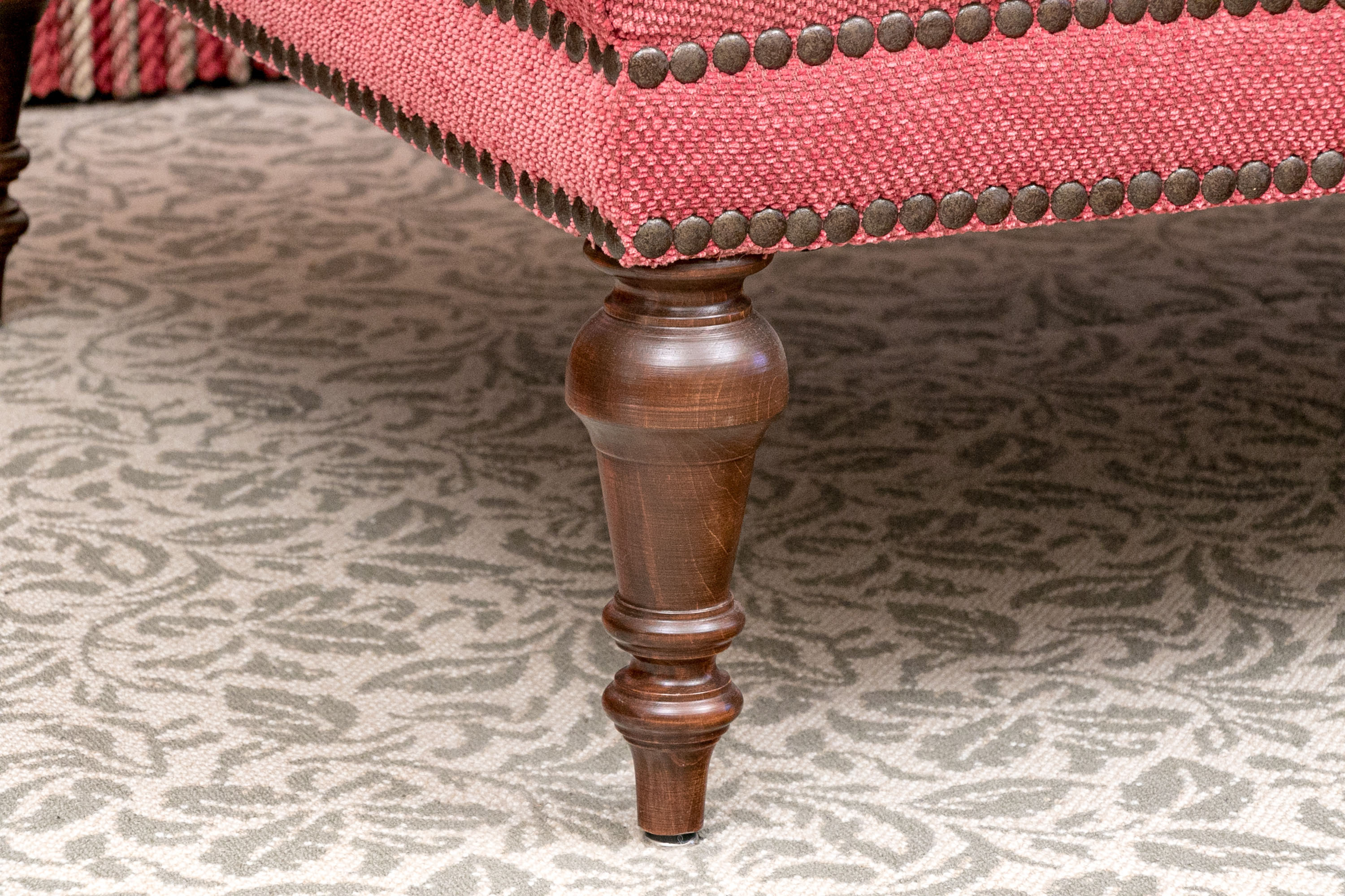 Raised on four turned mahogany legs, the oversized ottoman is luxuriously custom upholstered and tufted. A trim band of brass tack nailhead trim to affix upholstery to frame.