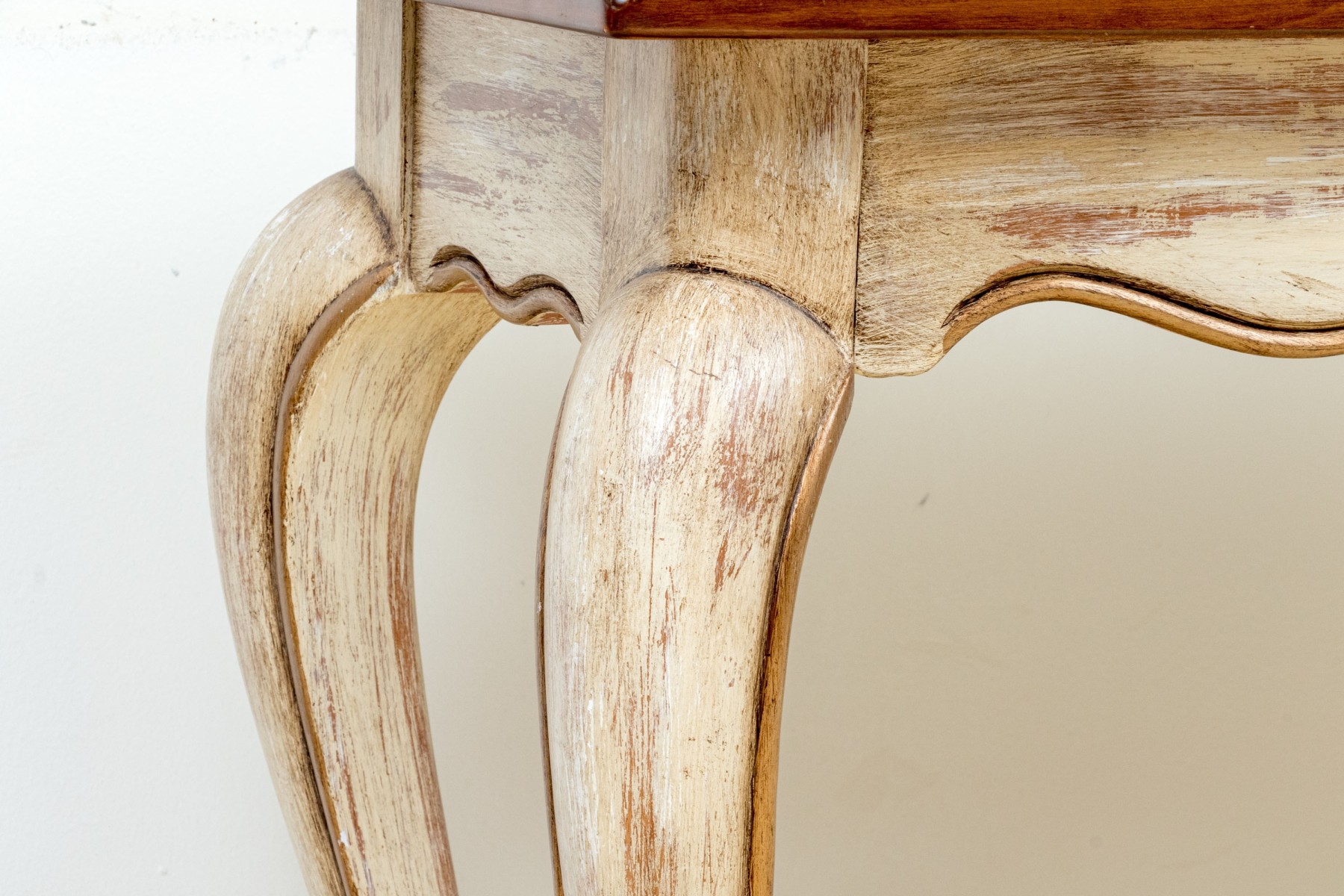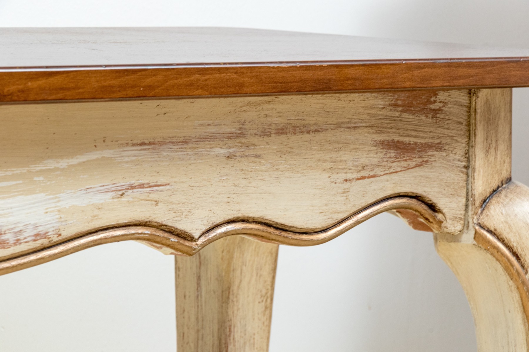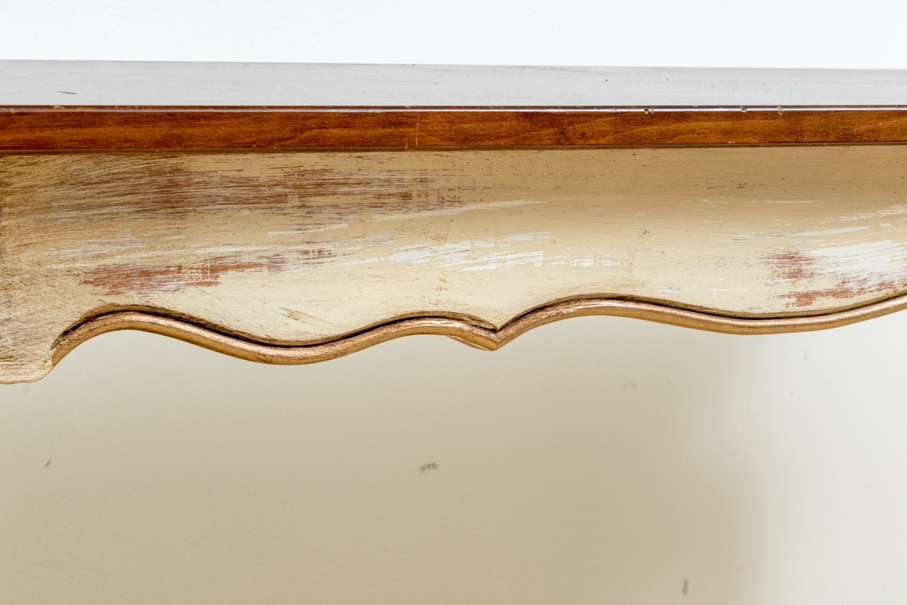 On four cabriole legs with handsomely scalloped base trim with painted finish and stained table top.