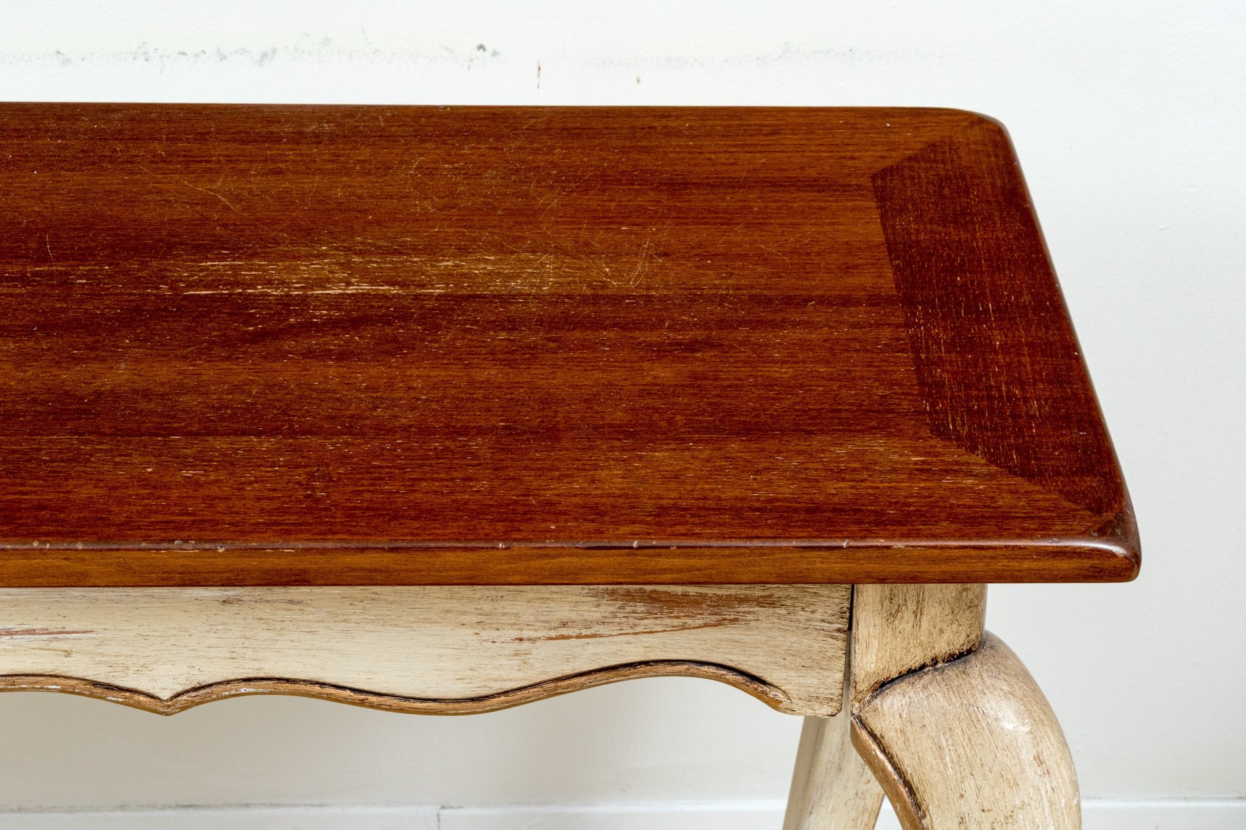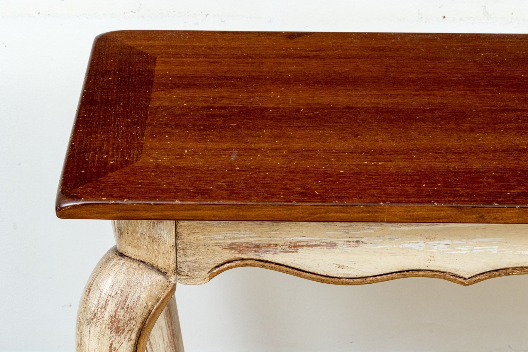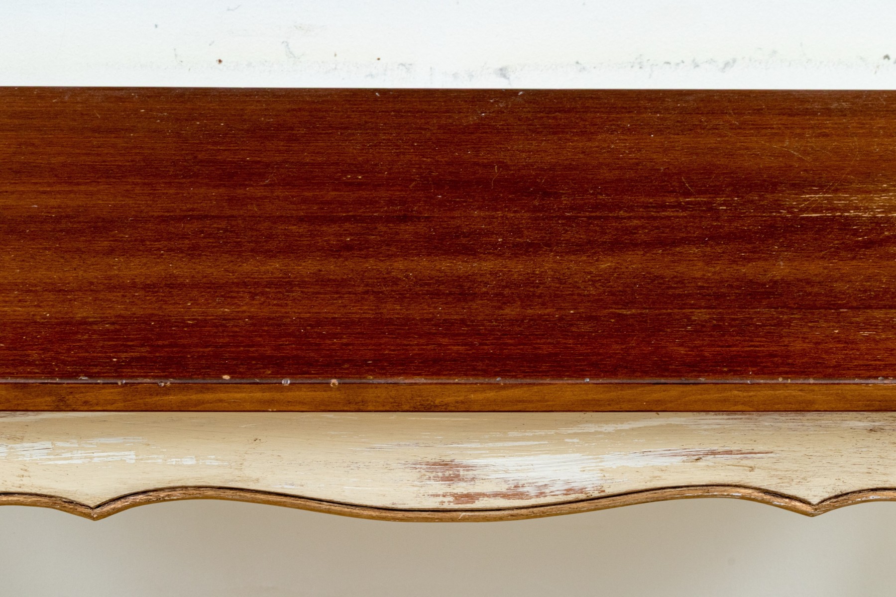 On four cabriole legs with handsomely scalloped base trim with painted finish and stained table top.