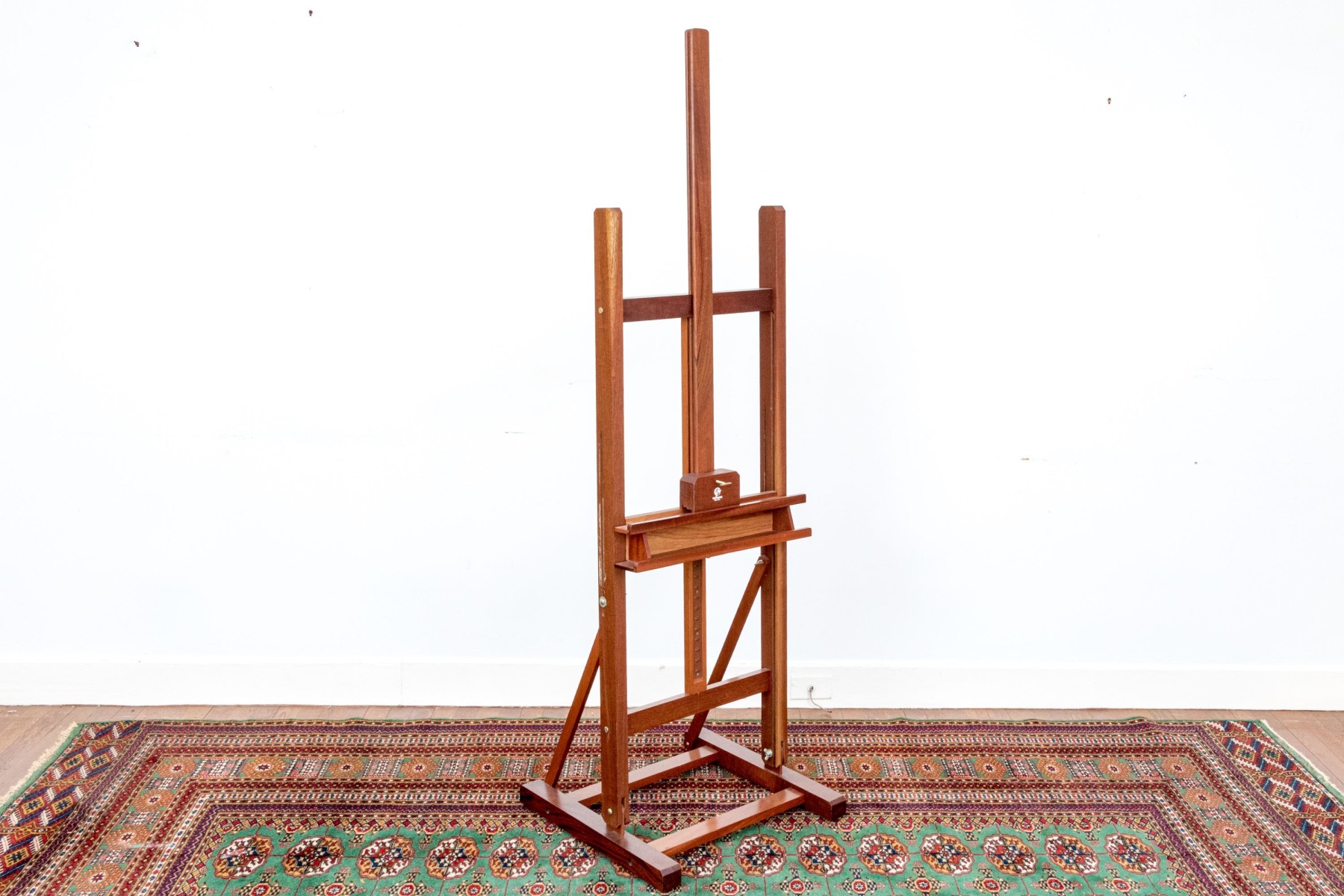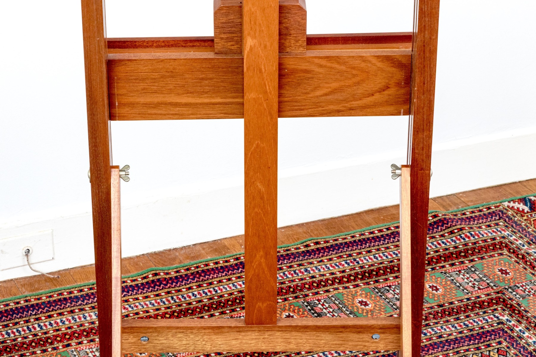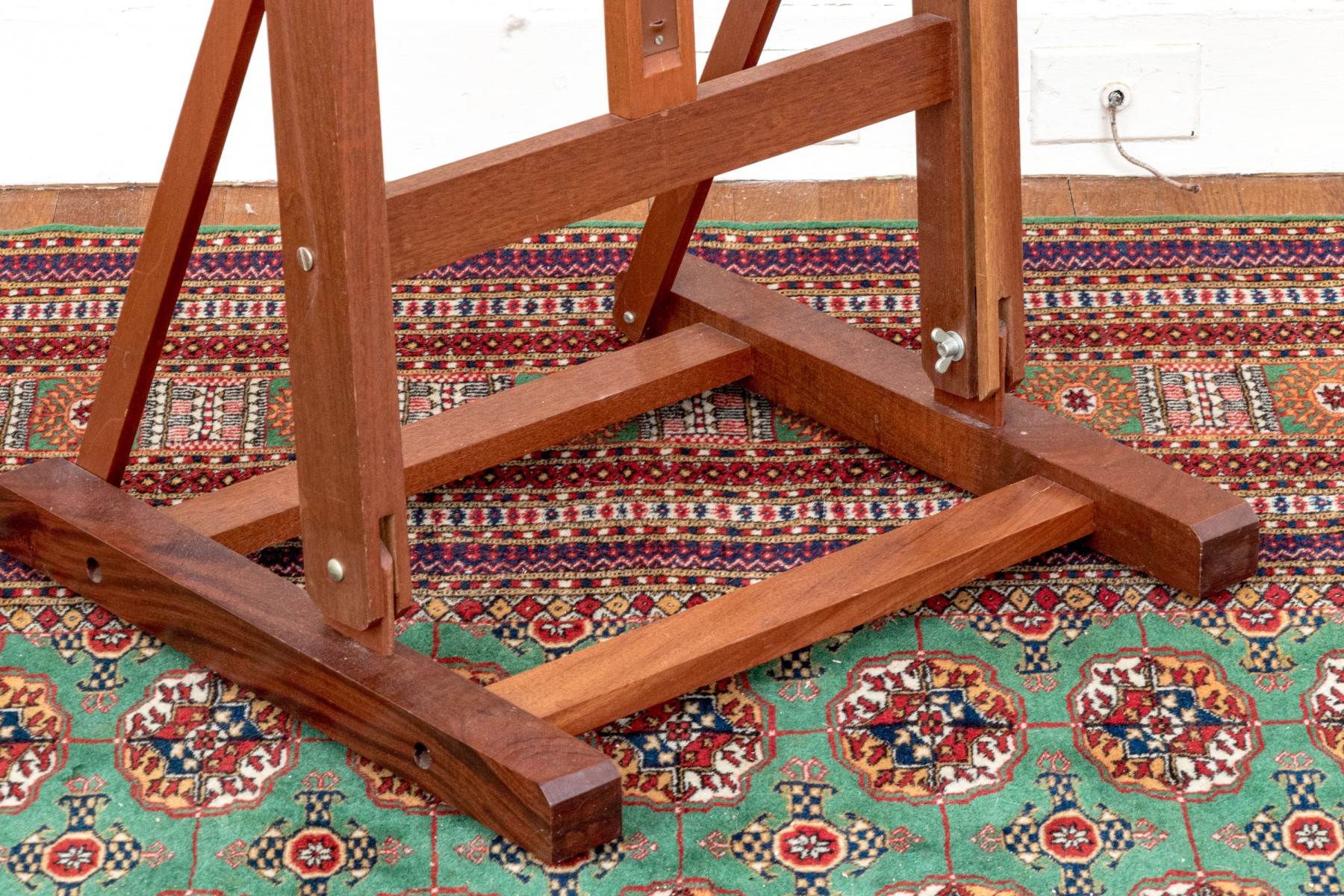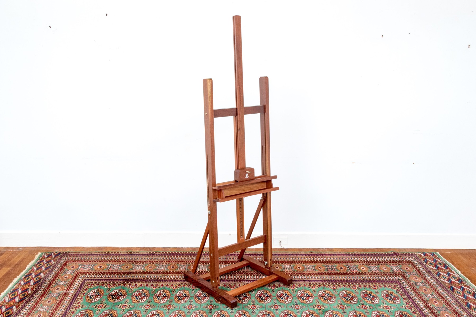 A high quality standing painter's easel crafted in medium brown wood with brass and metallic hardware including wing nuts.