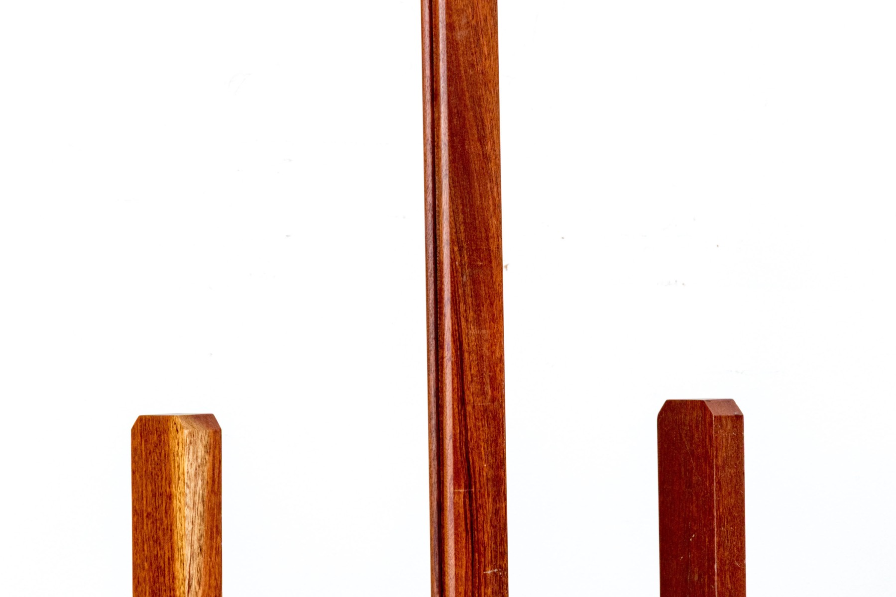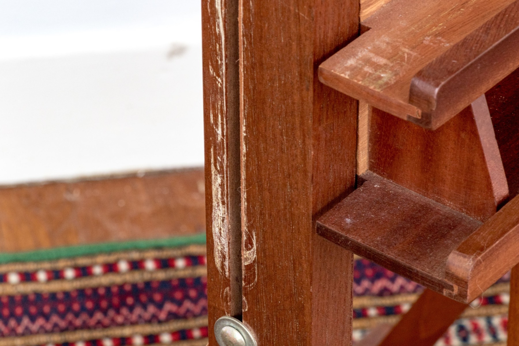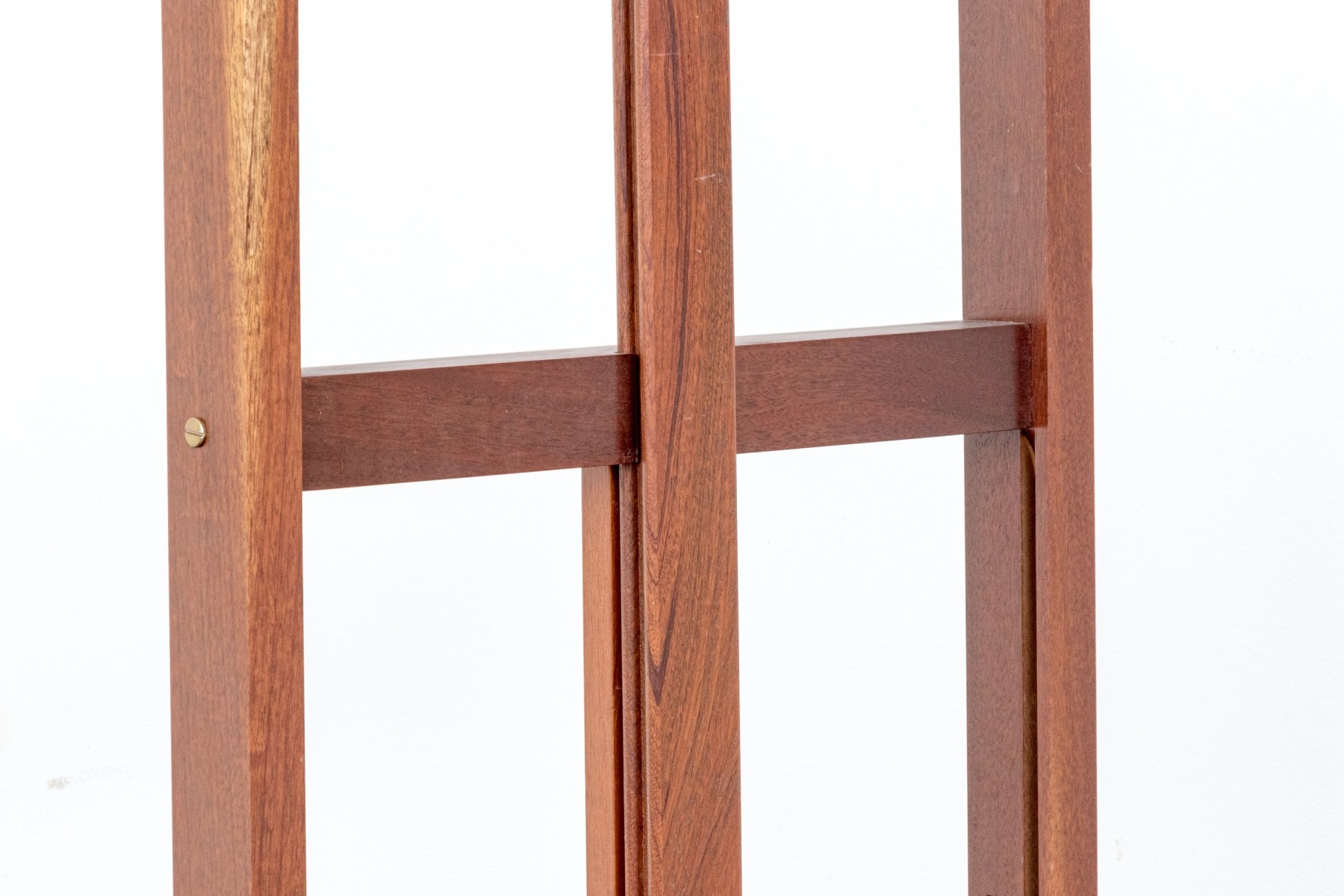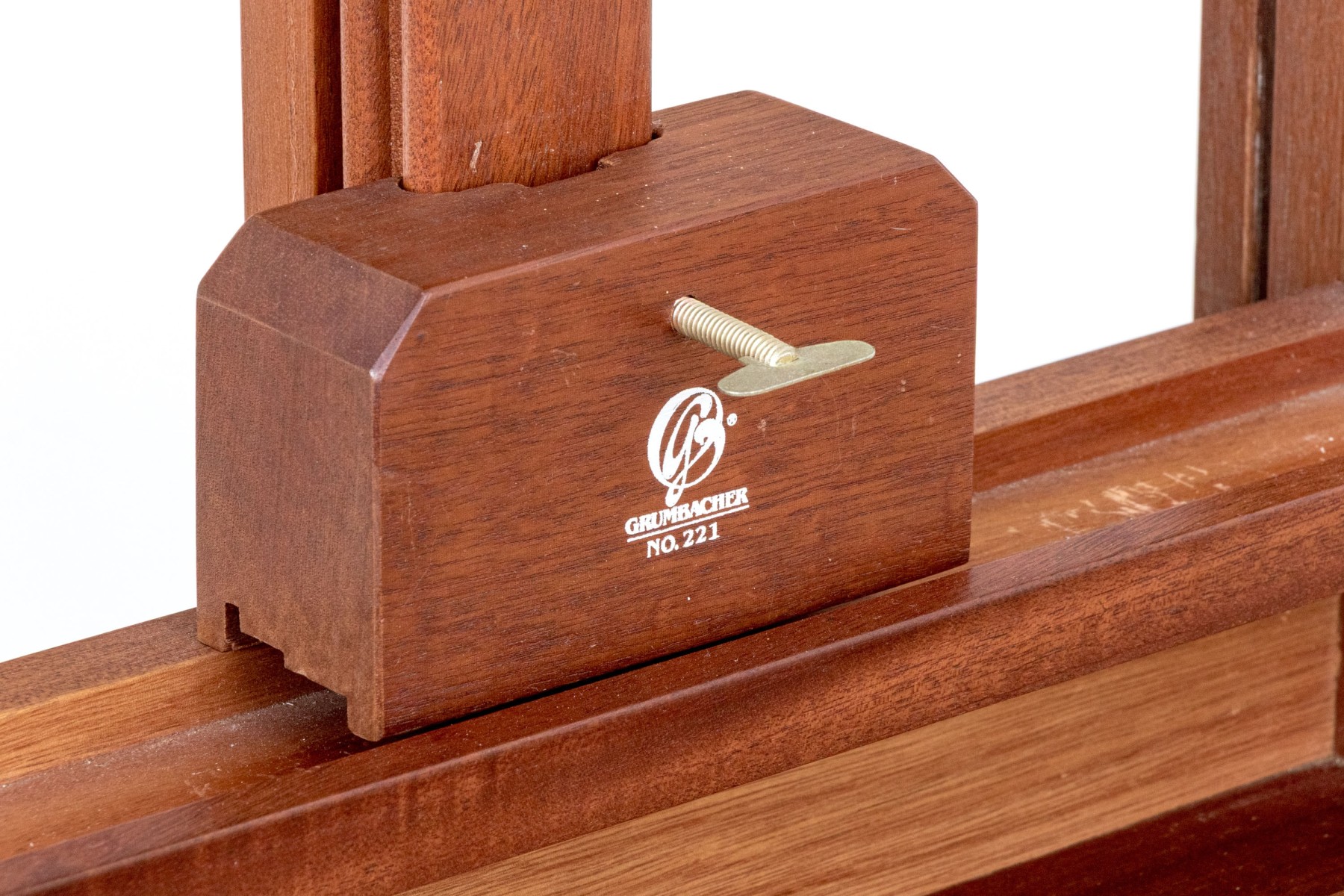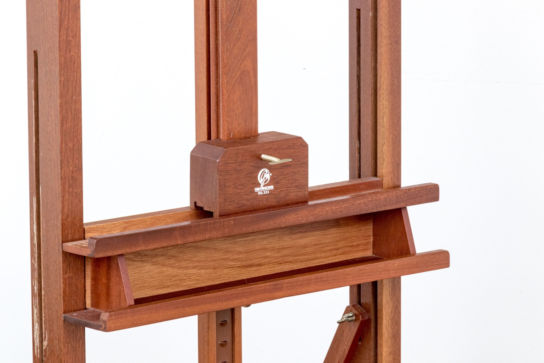 A high quality standing painter's easel crafted in medium brown wood with brass and metallic hardware including wing nuts.