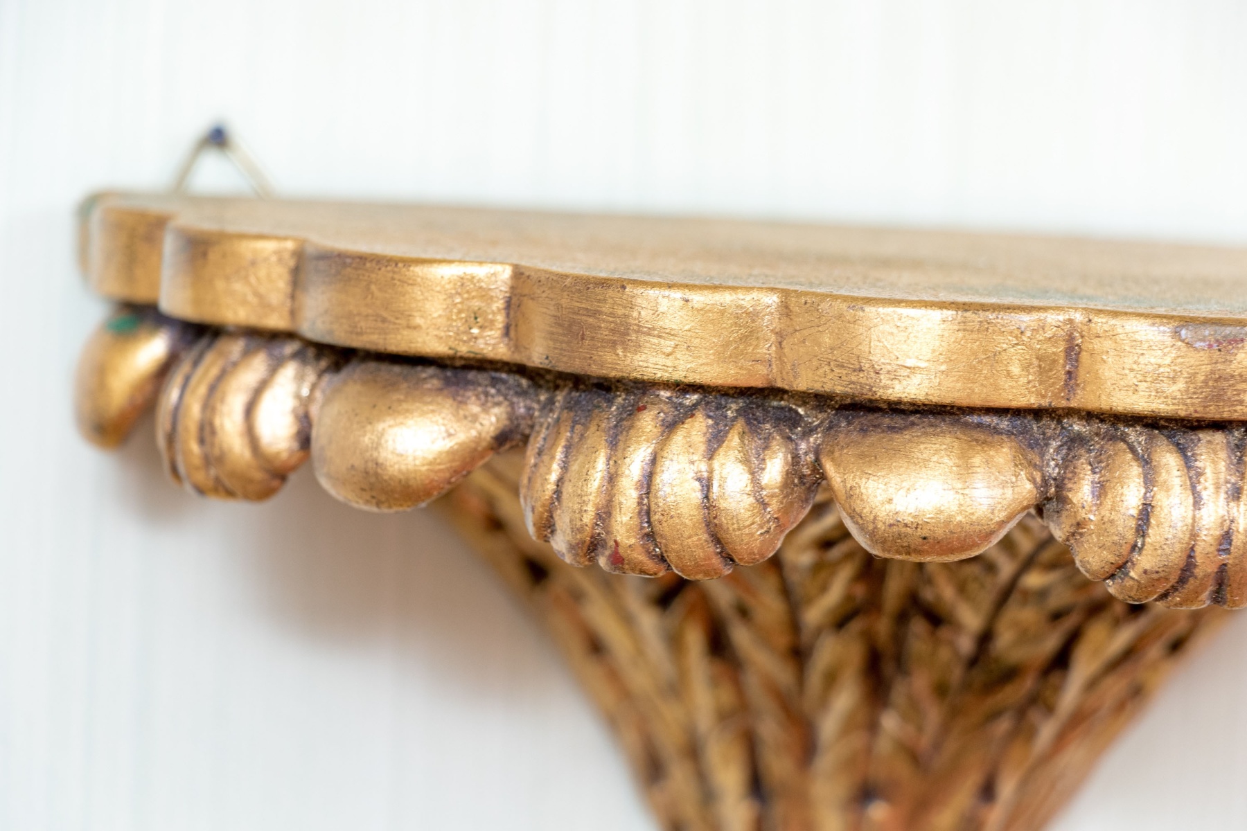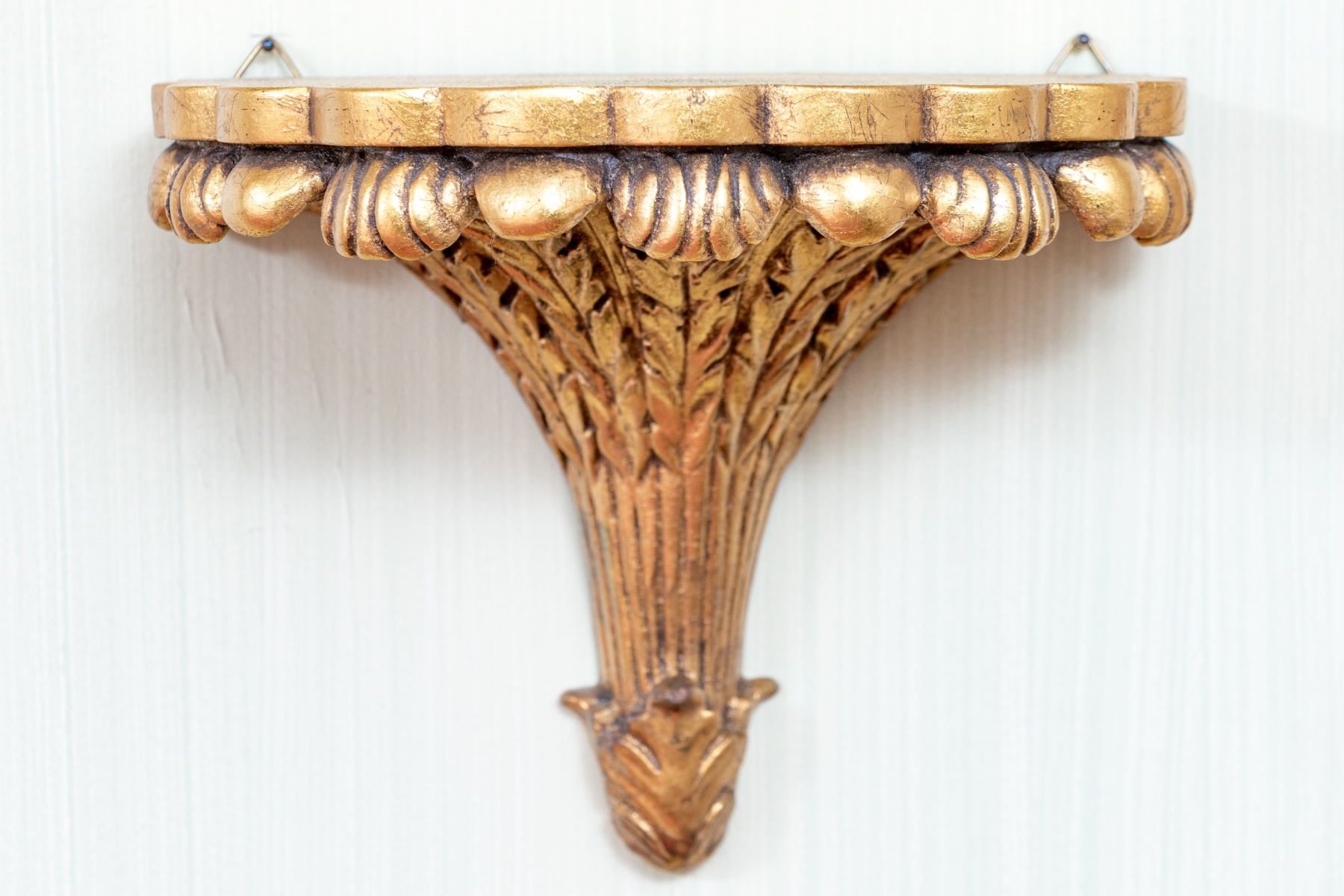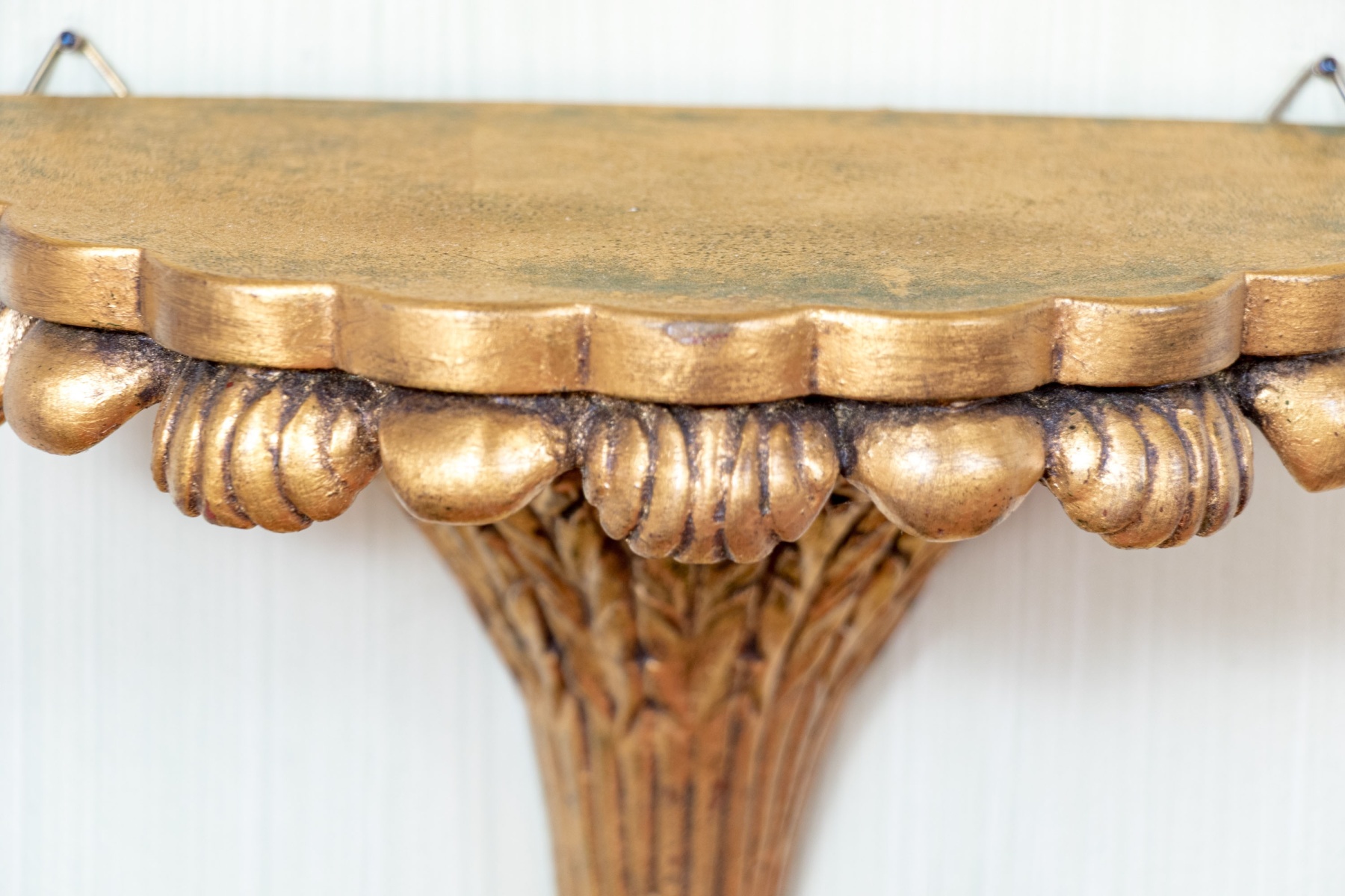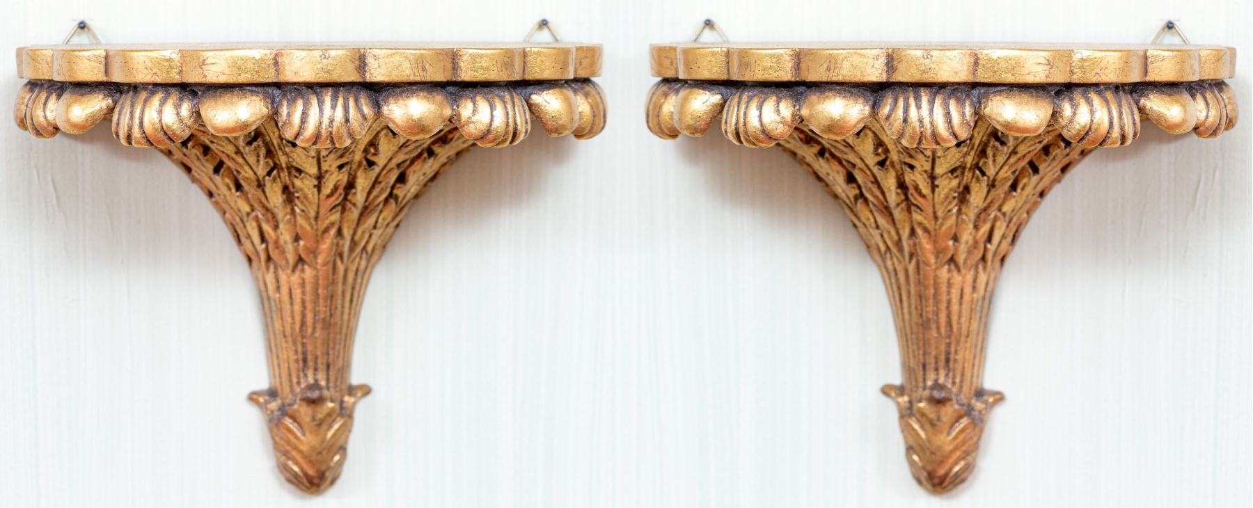 A quality pair of carved gilt wood and gesso wall brackets, each with semi-circular tops and scalloped trims. The shelves are designed with fantastically carved and gilt finished feathered frames extending downward to the terminals.