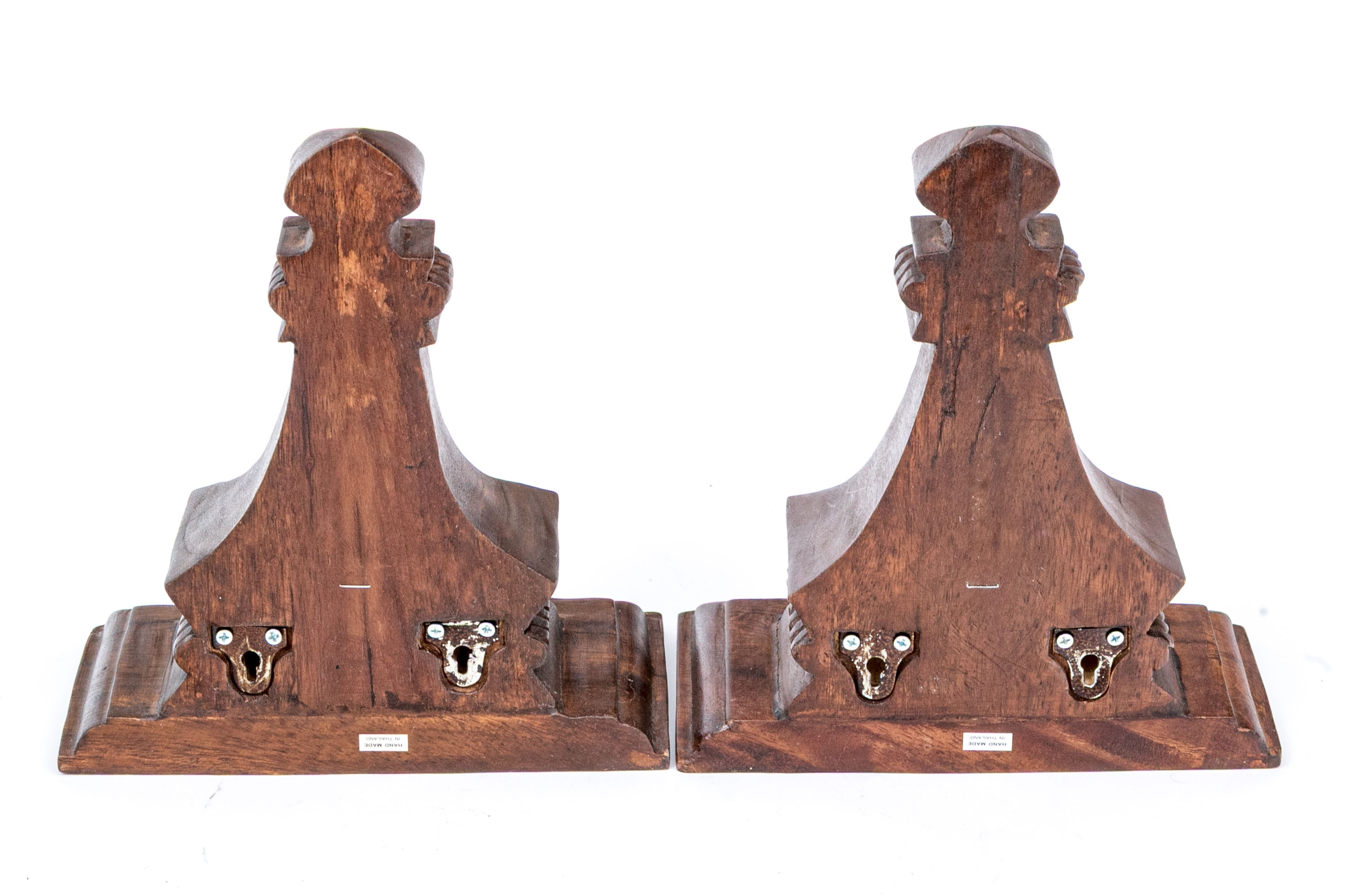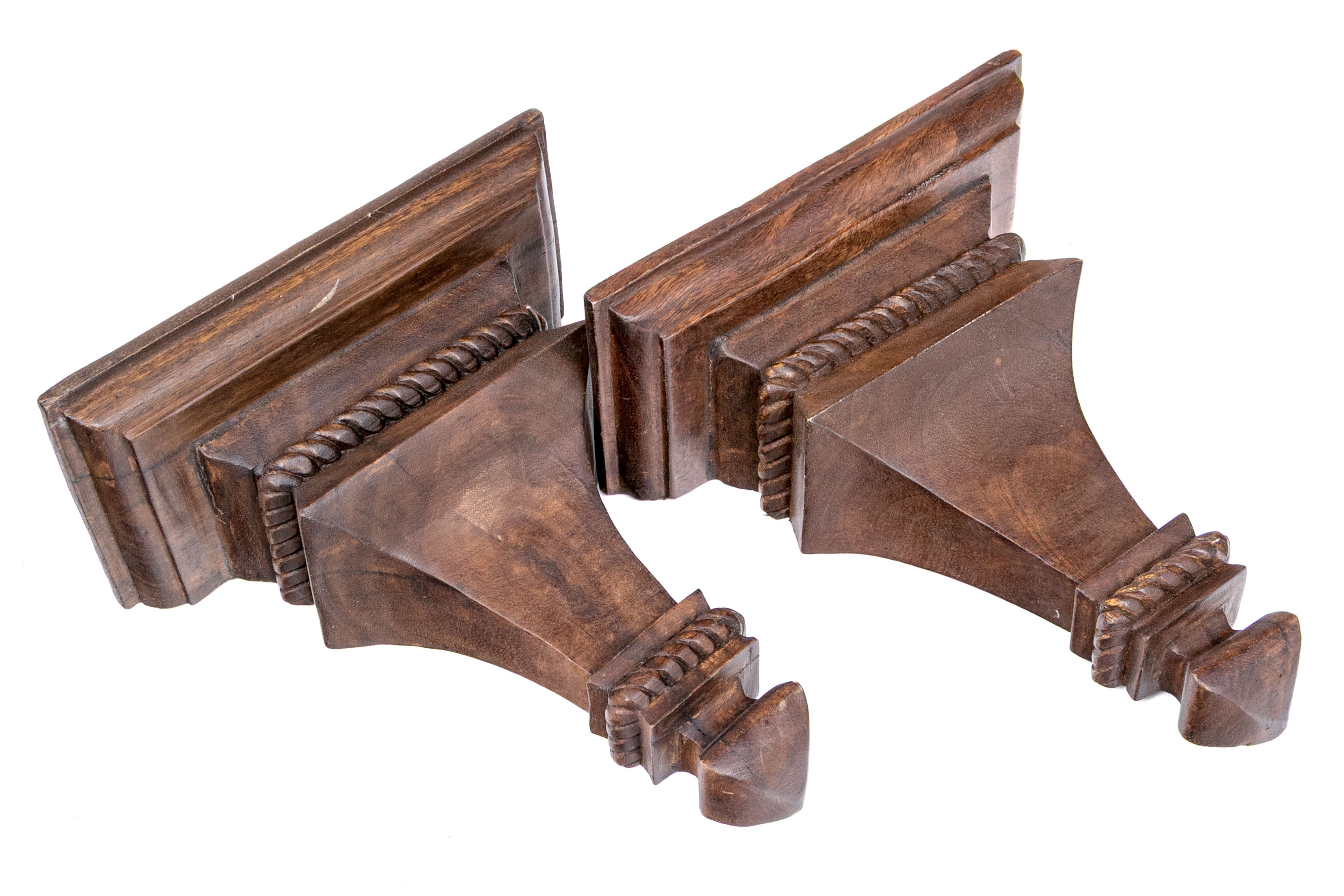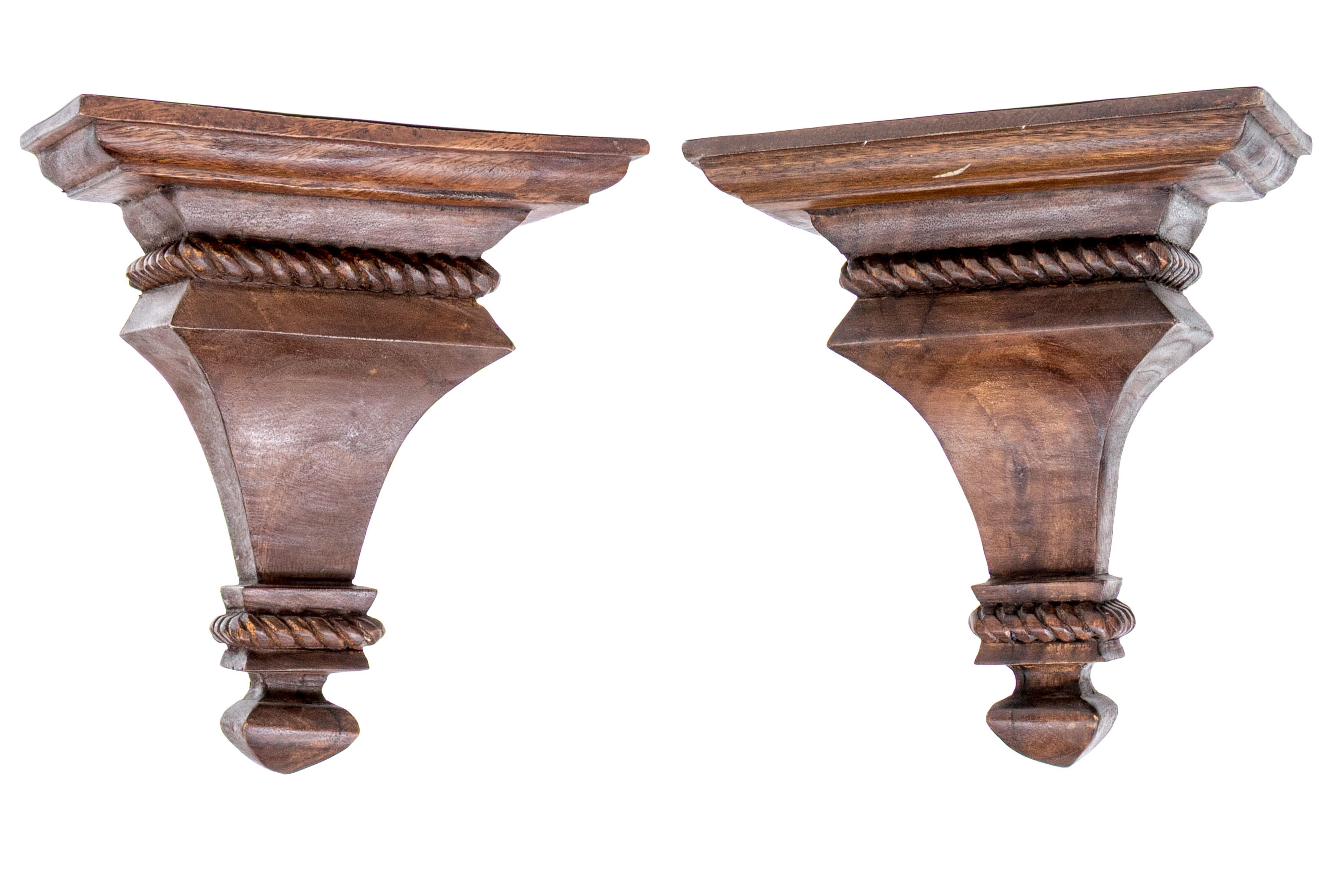 A handsome pair of wall brackets with a touch of Georgian elegance in a rich, medium-dark brown finish. The brackets feature rectangular tops with ogee edges leading to rope twist bands along a shapely bezeled triangular body with square pyramidal bottom finials.