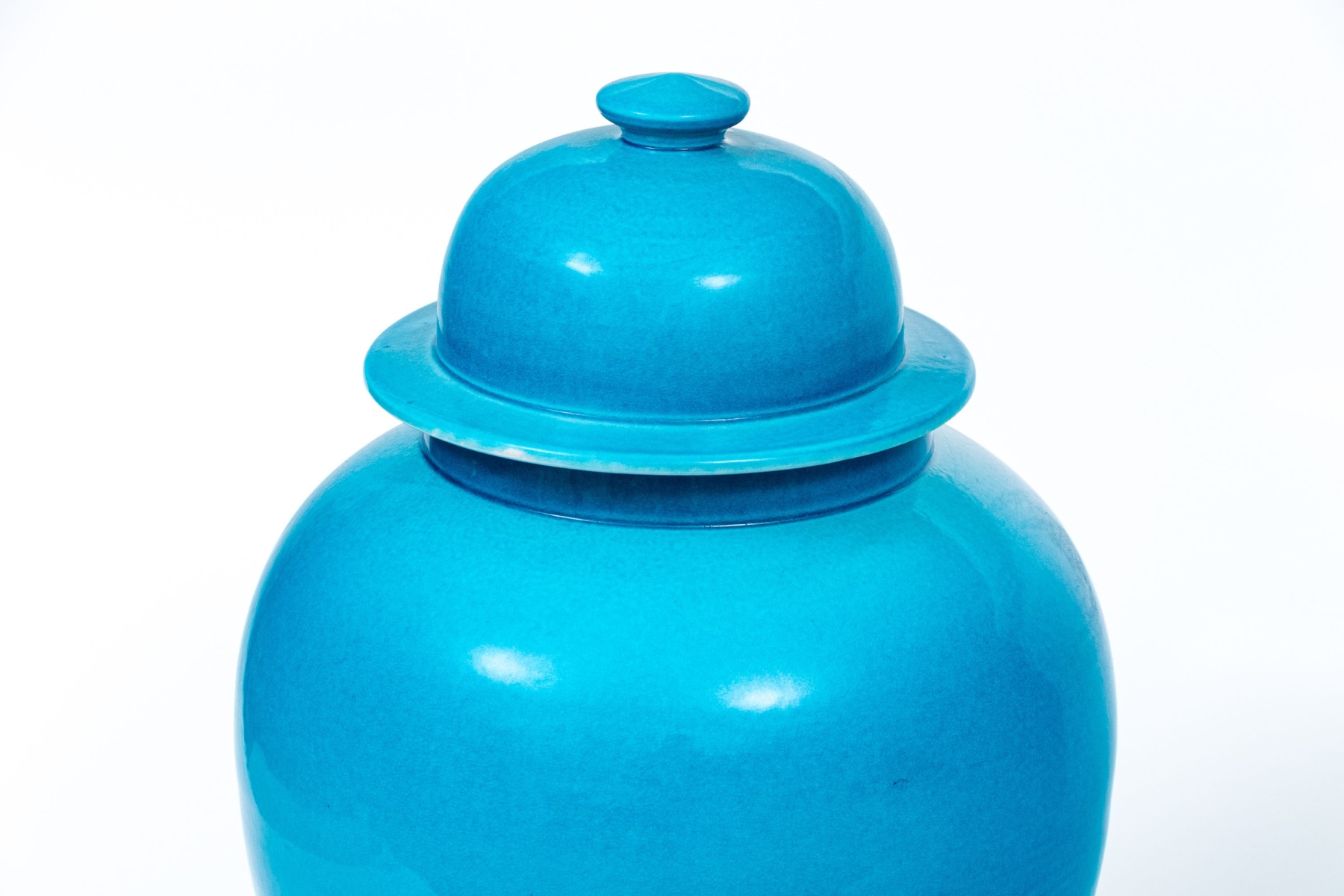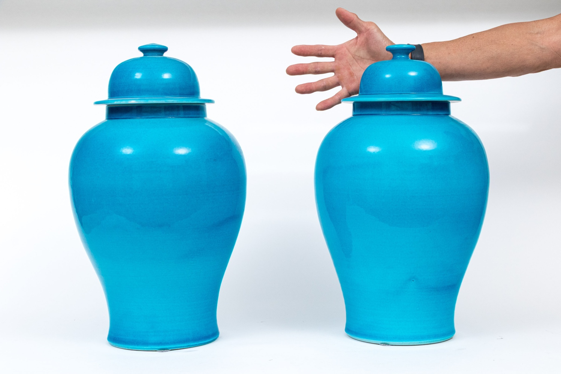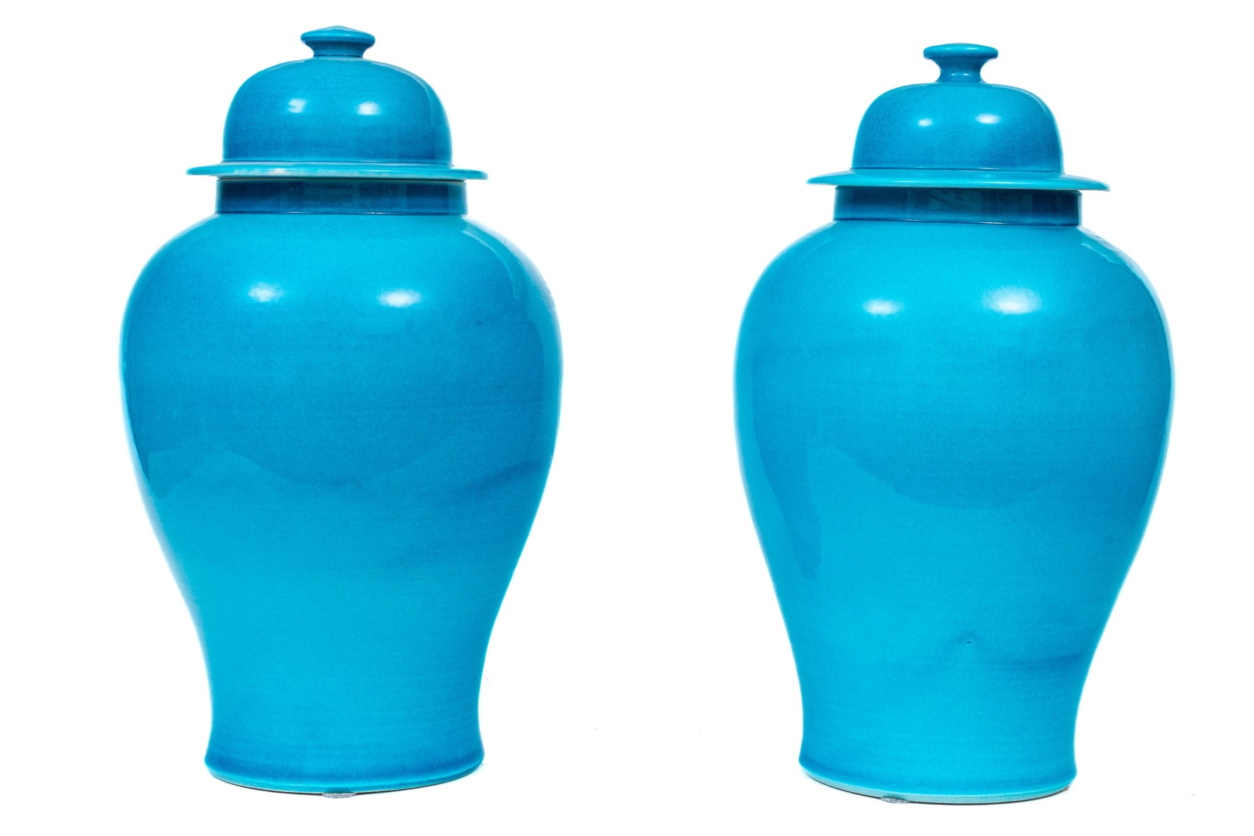 A gorgeous pair of tall ceramic jars with round knobs on high domed lids that flare out around the rims. Lids surmount stout, wide mouths over baluster forms elegantly tapering down to the circular feet. Glazed in gorgeous cerulean blue with white interiors.