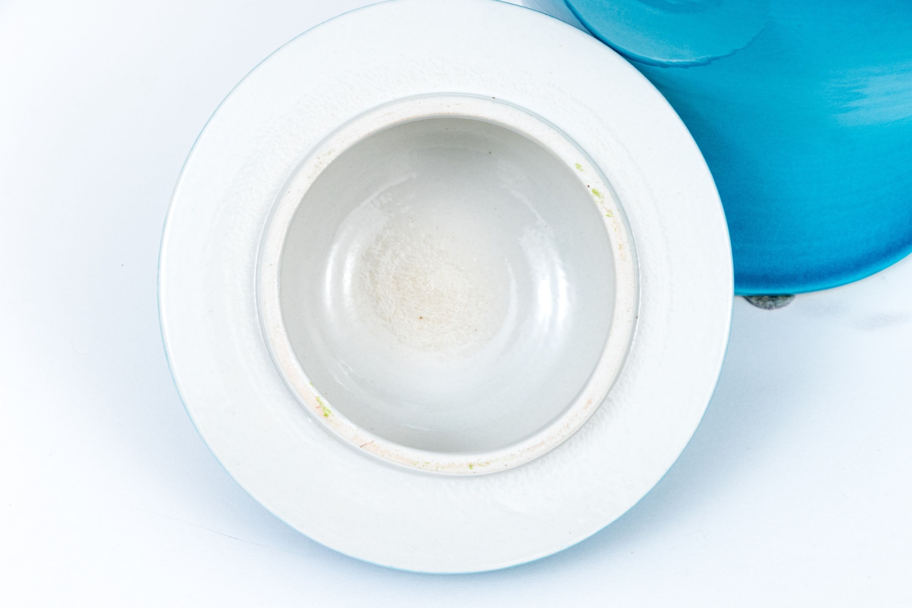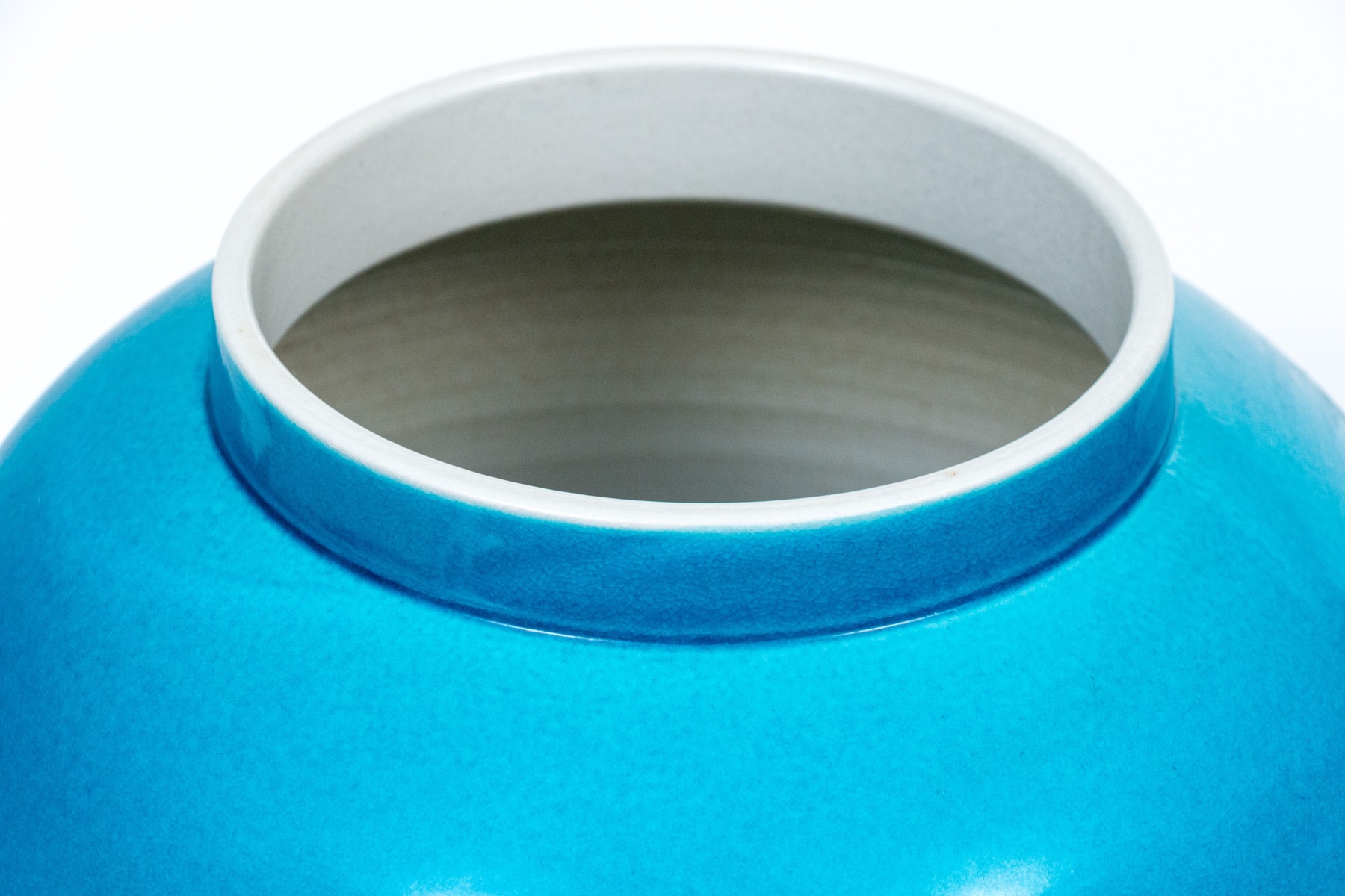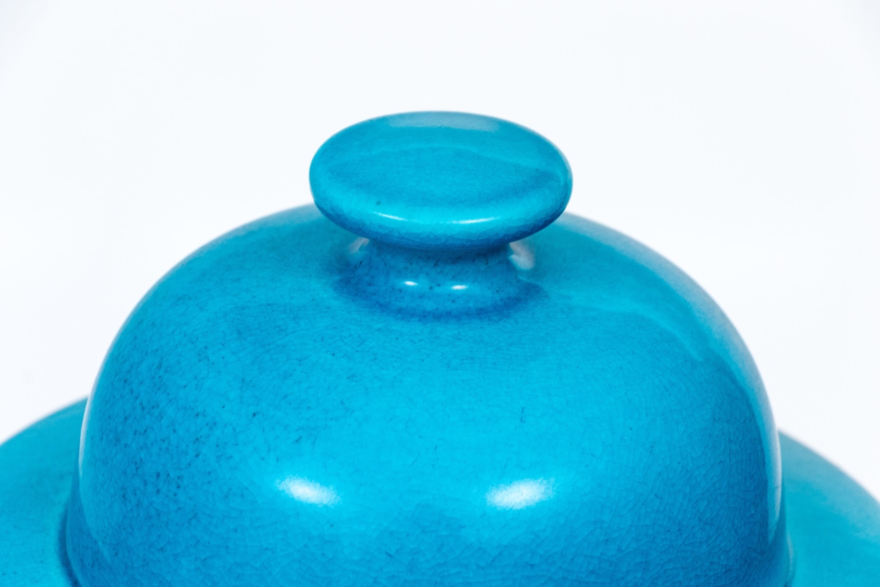 A gorgeous pair of tall ceramic jars with round knobs on high domed lids that flare out around the rims. Lids surmount stout, wide mouths over baluster forms elegantly tapering down to the circular feet. Glazed in gorgeous cerulean blue with white interiors.
