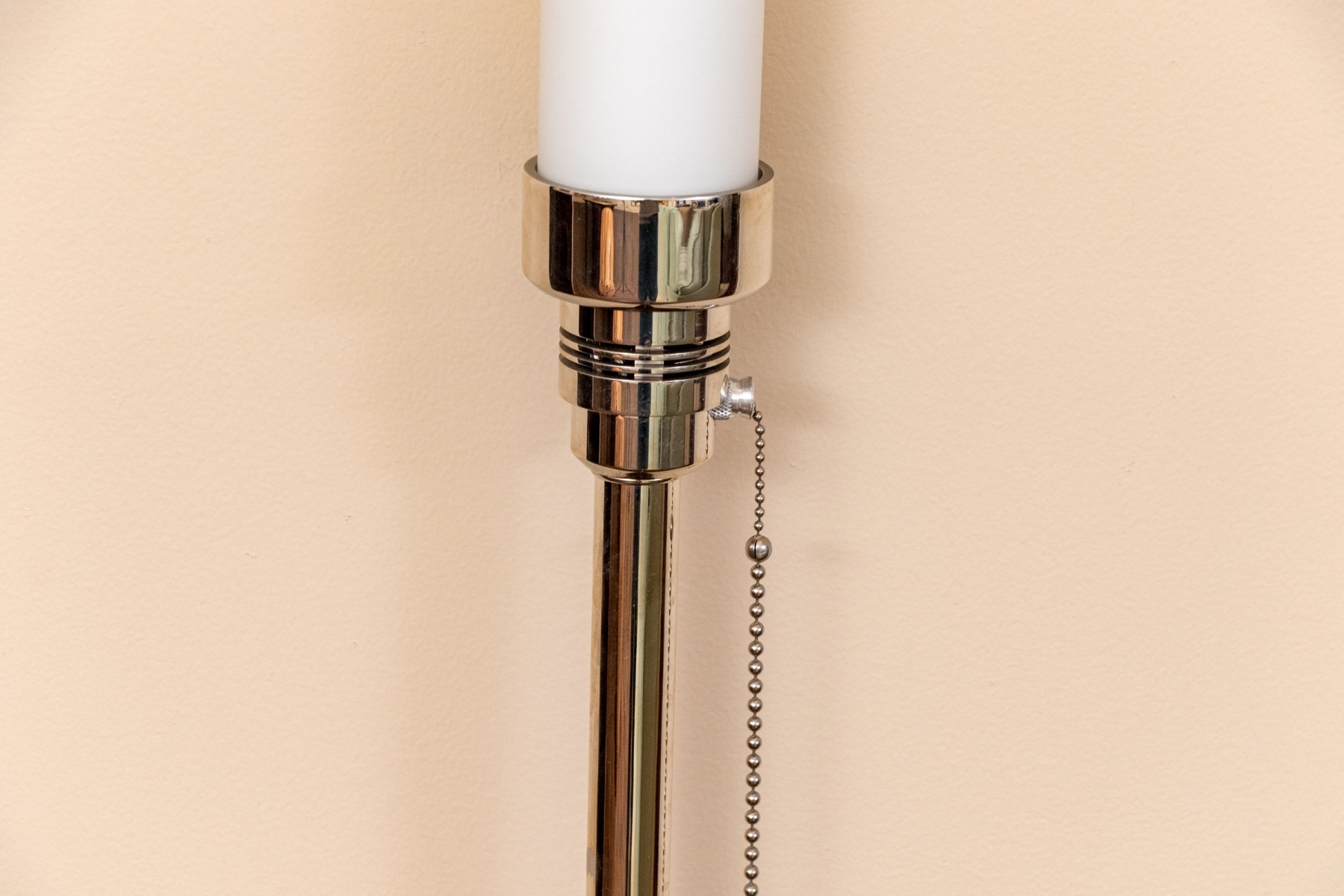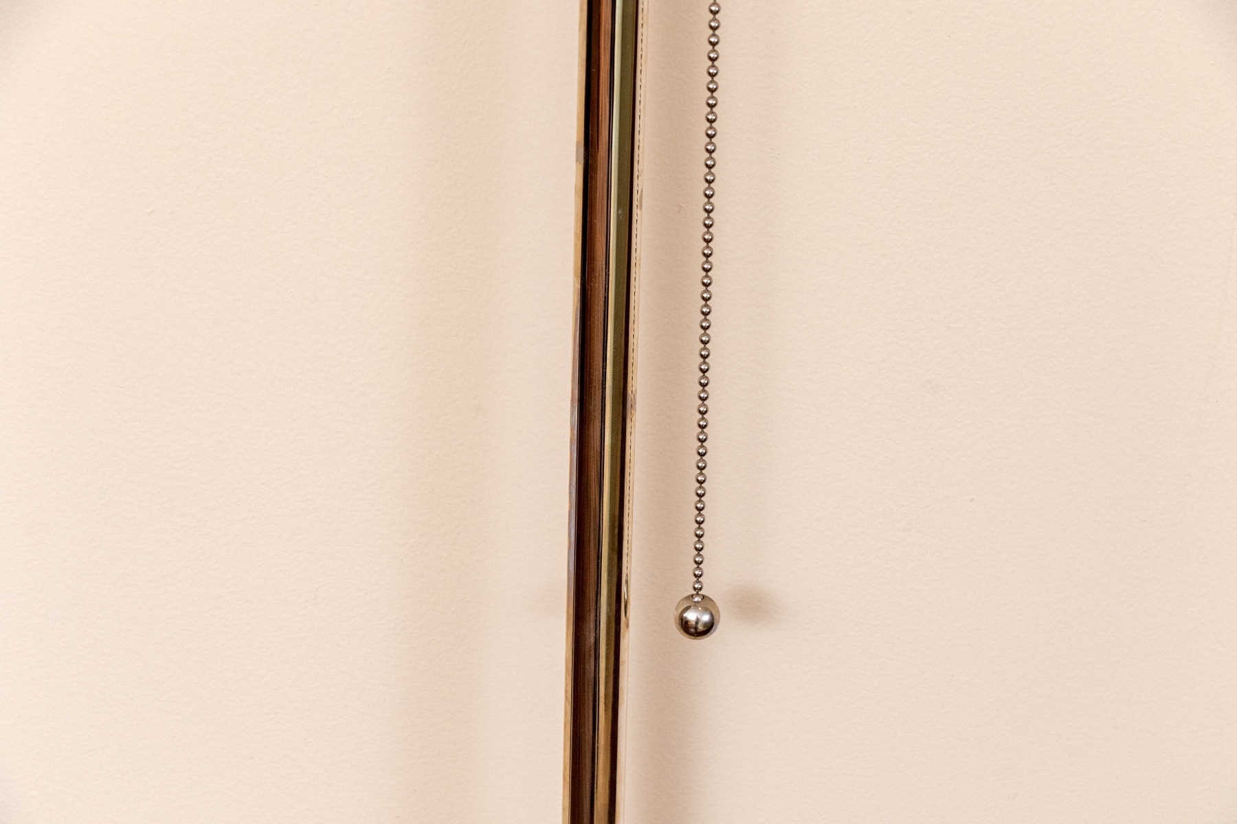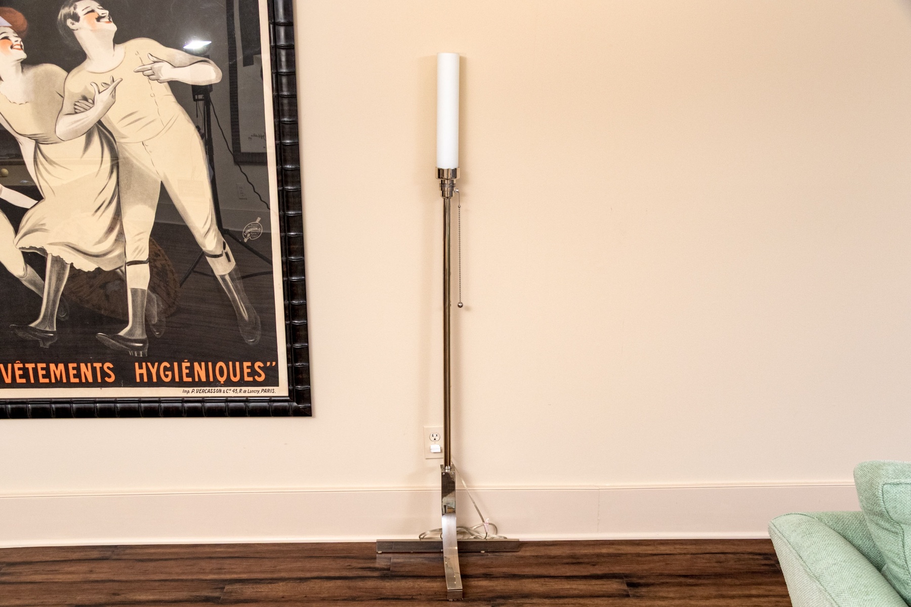 A quality pair of floor lamps, each standing on three feet with central chrome post and chain pull. A single bulb nozzle with opaque white cylindrical shade.