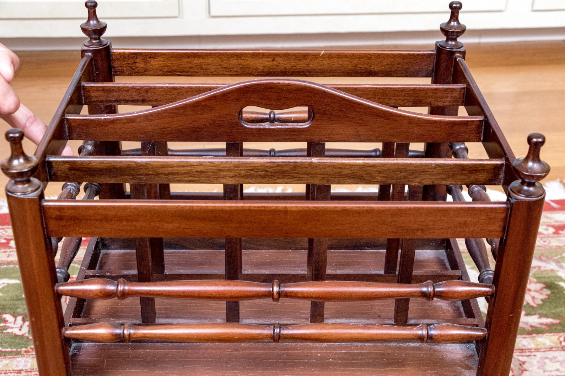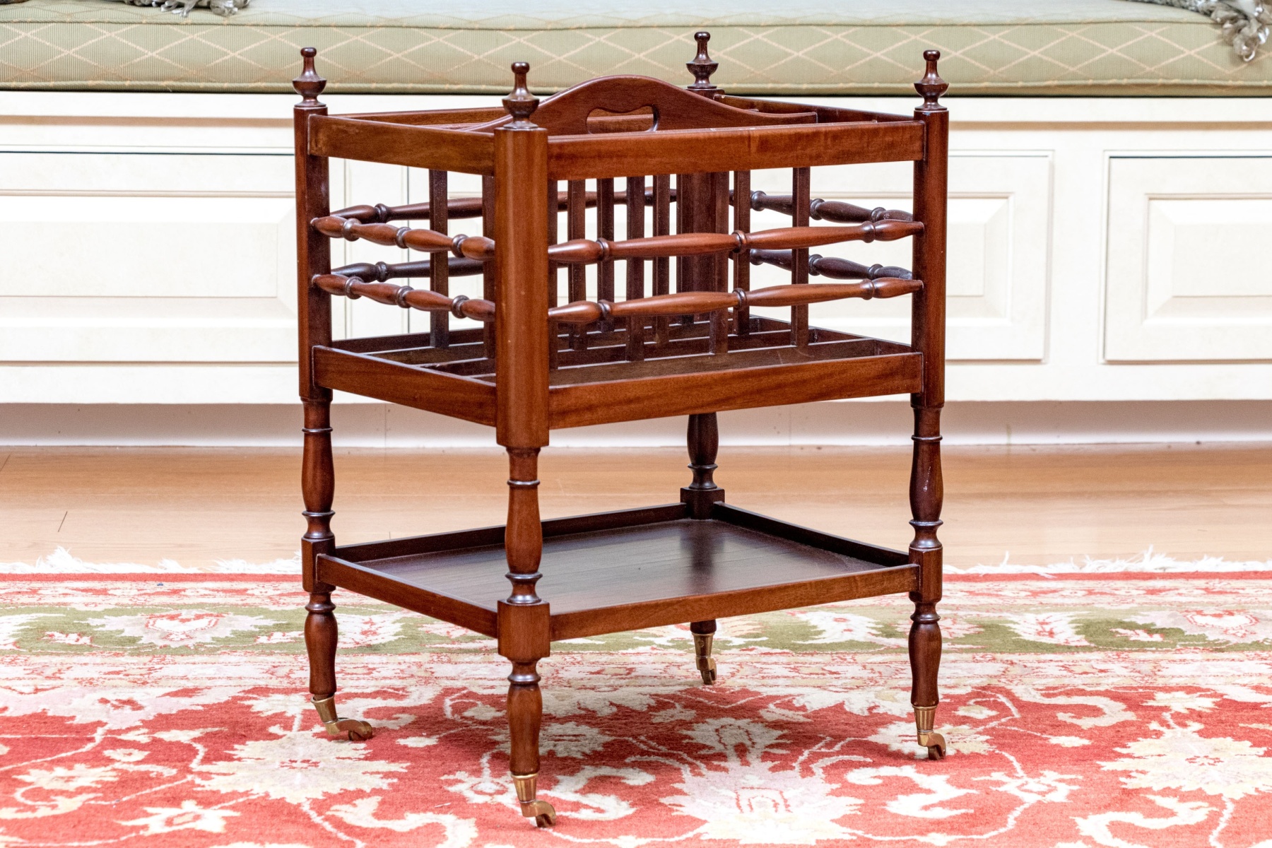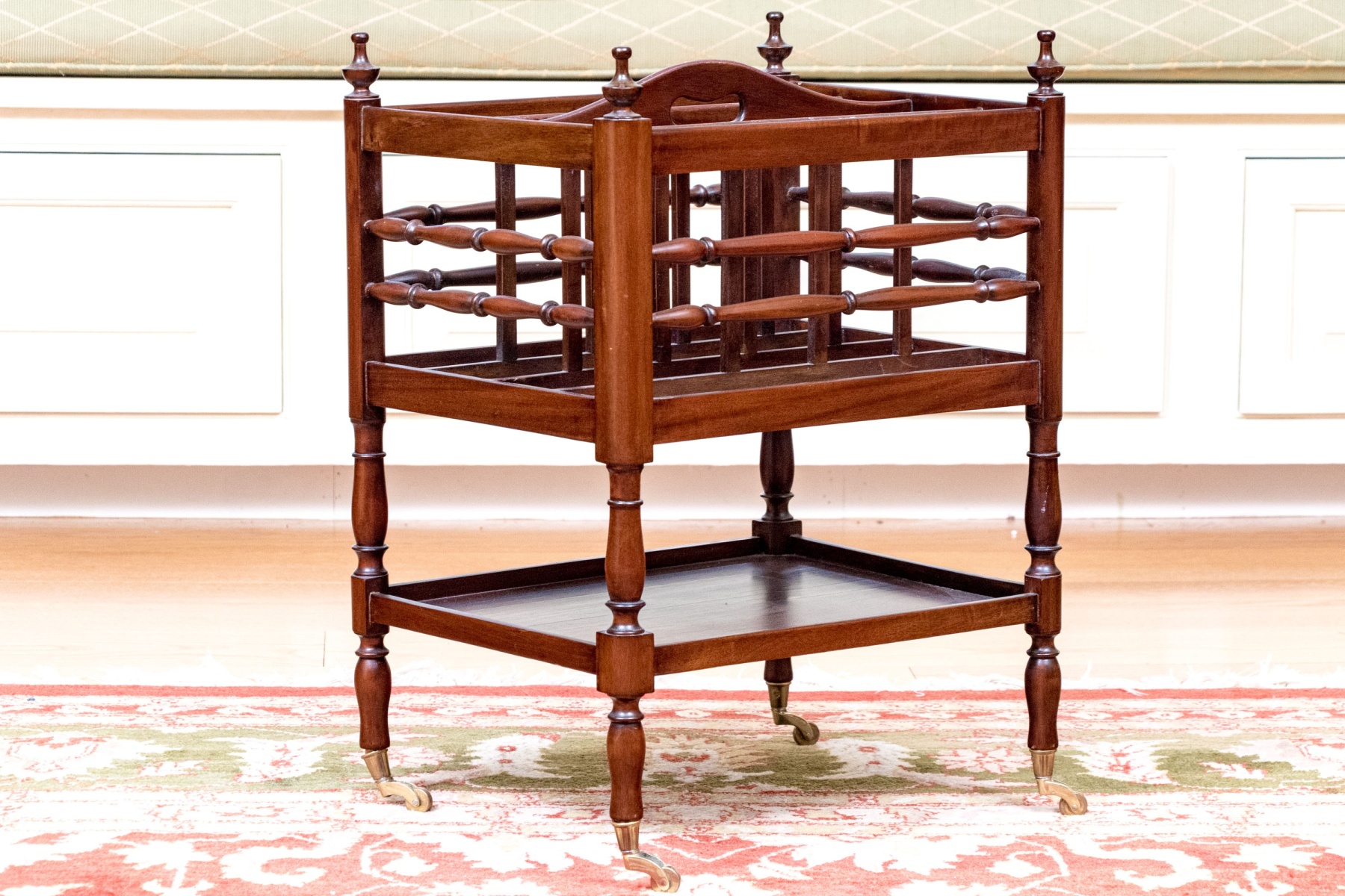 Bearing a label denoting the canterbury as having been made in Indonesia for Pelamat Designs in San Francisco, CA. Standing upon four legs with brass toe caps and casters with lower shelf and the slotted open case above with four finials and central carved handle.