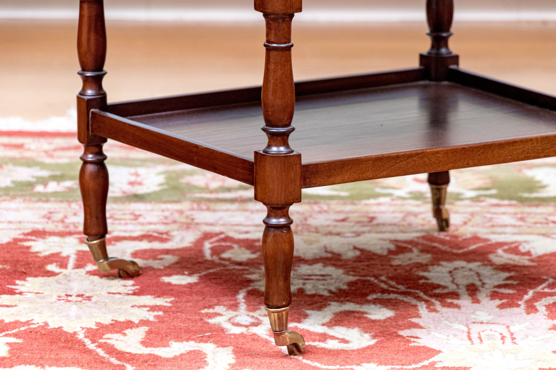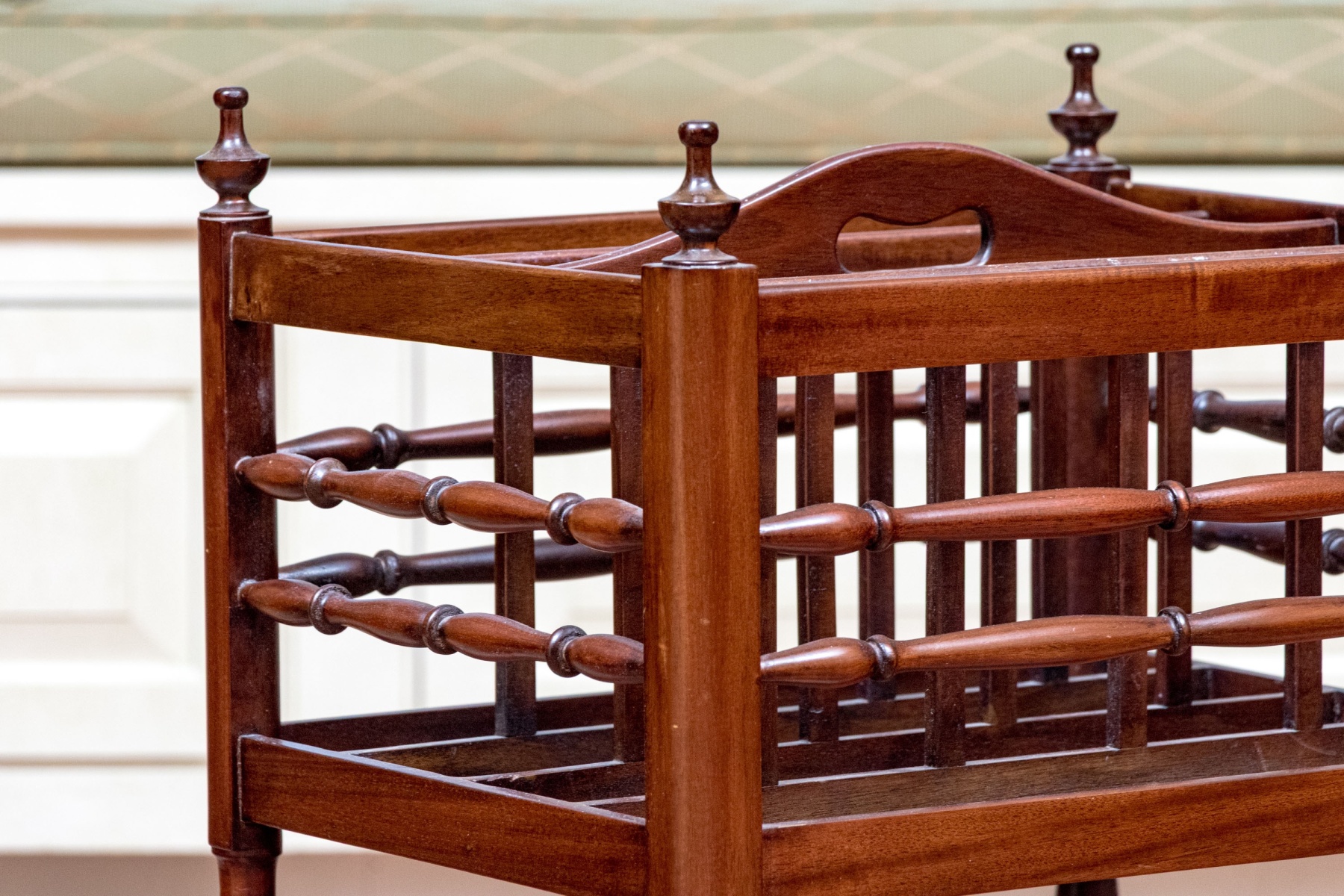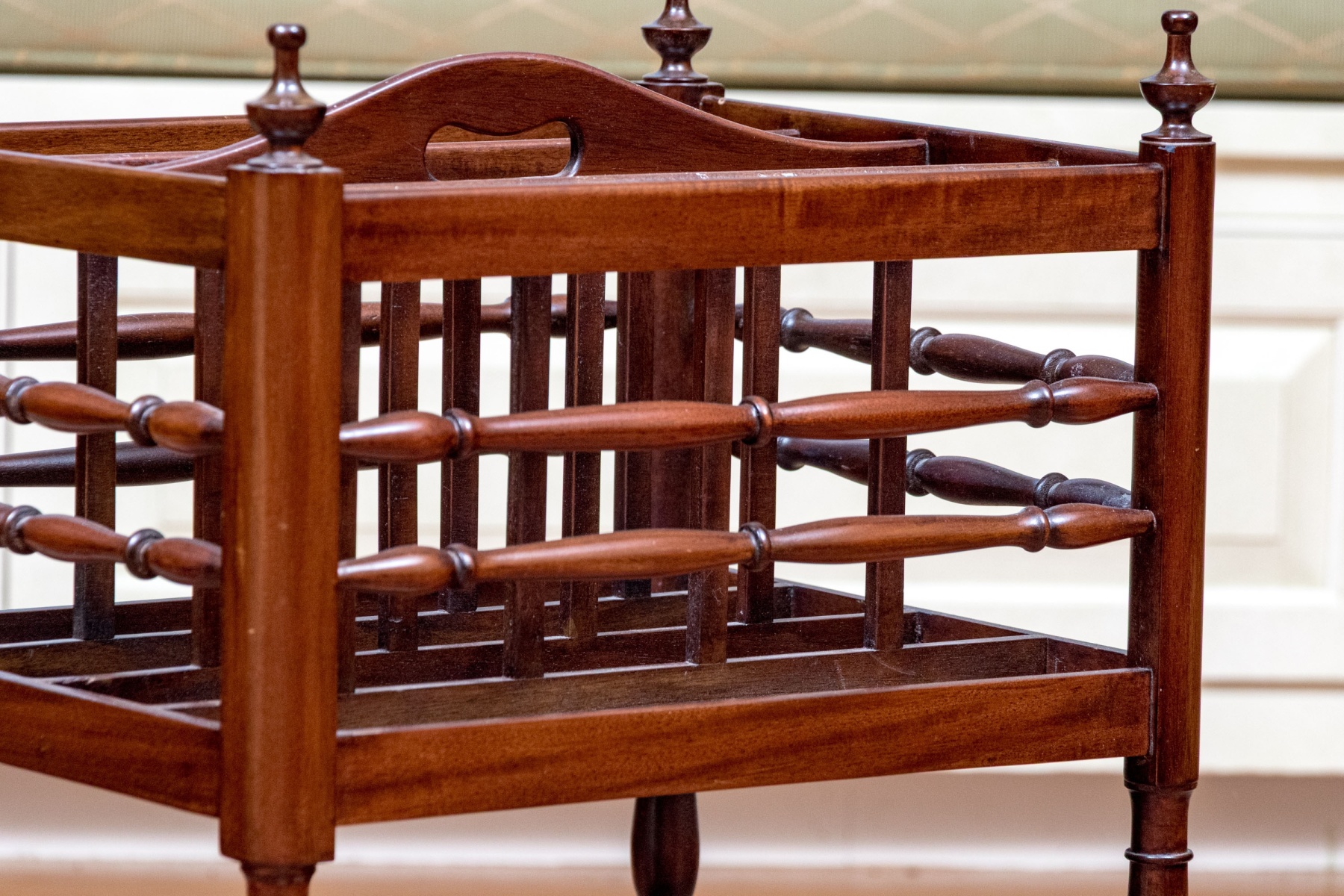 Bearing a label denoting the canterbury as having been made in Indonesia for Pelamat Designs in San Francisco, CA. Standing upon four legs with brass toe caps and casters with lower shelf and the slotted open case above with four finials and central carved handle.
