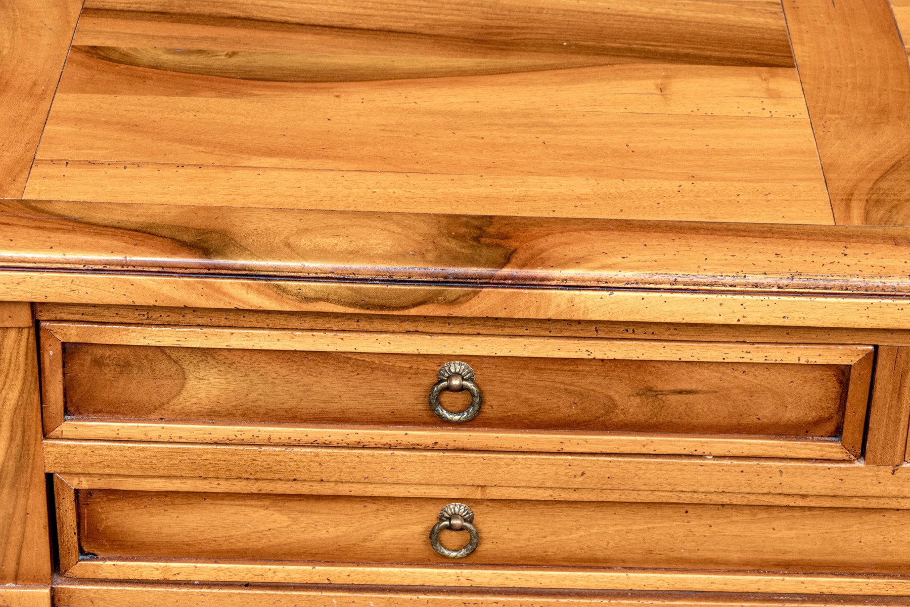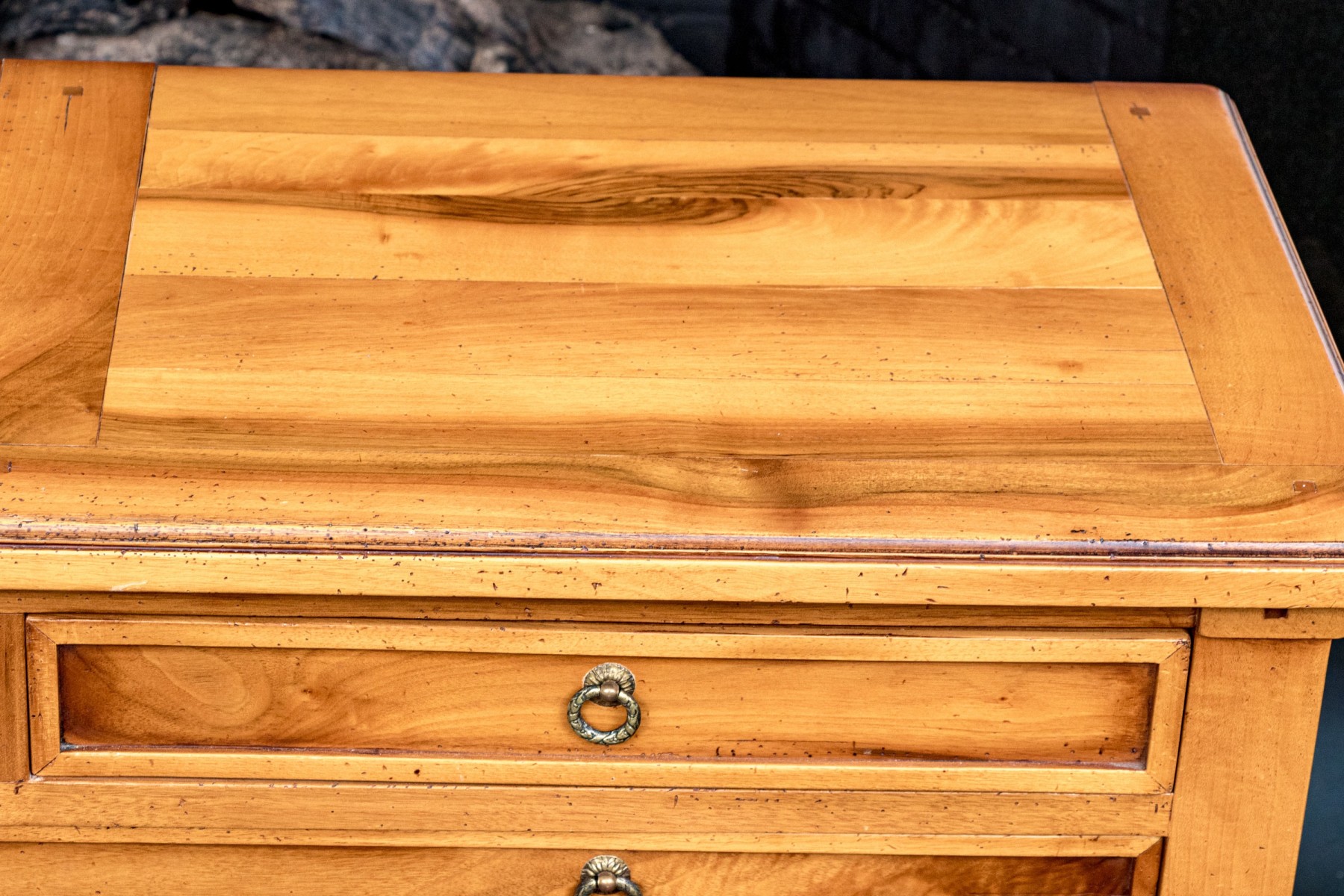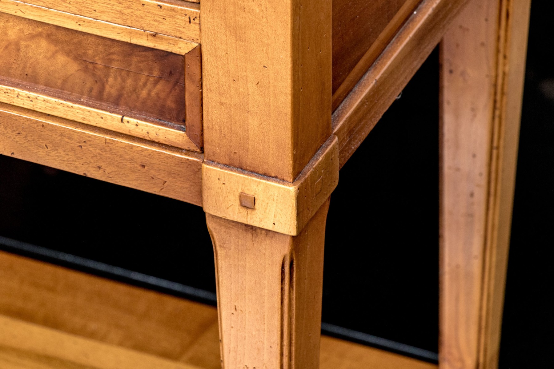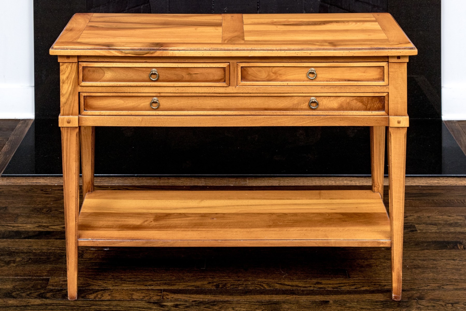 On four square tapered legs with lower tiered shelf. Upper case with one long drawer below a pair of short drawer. All with brass loop handles.