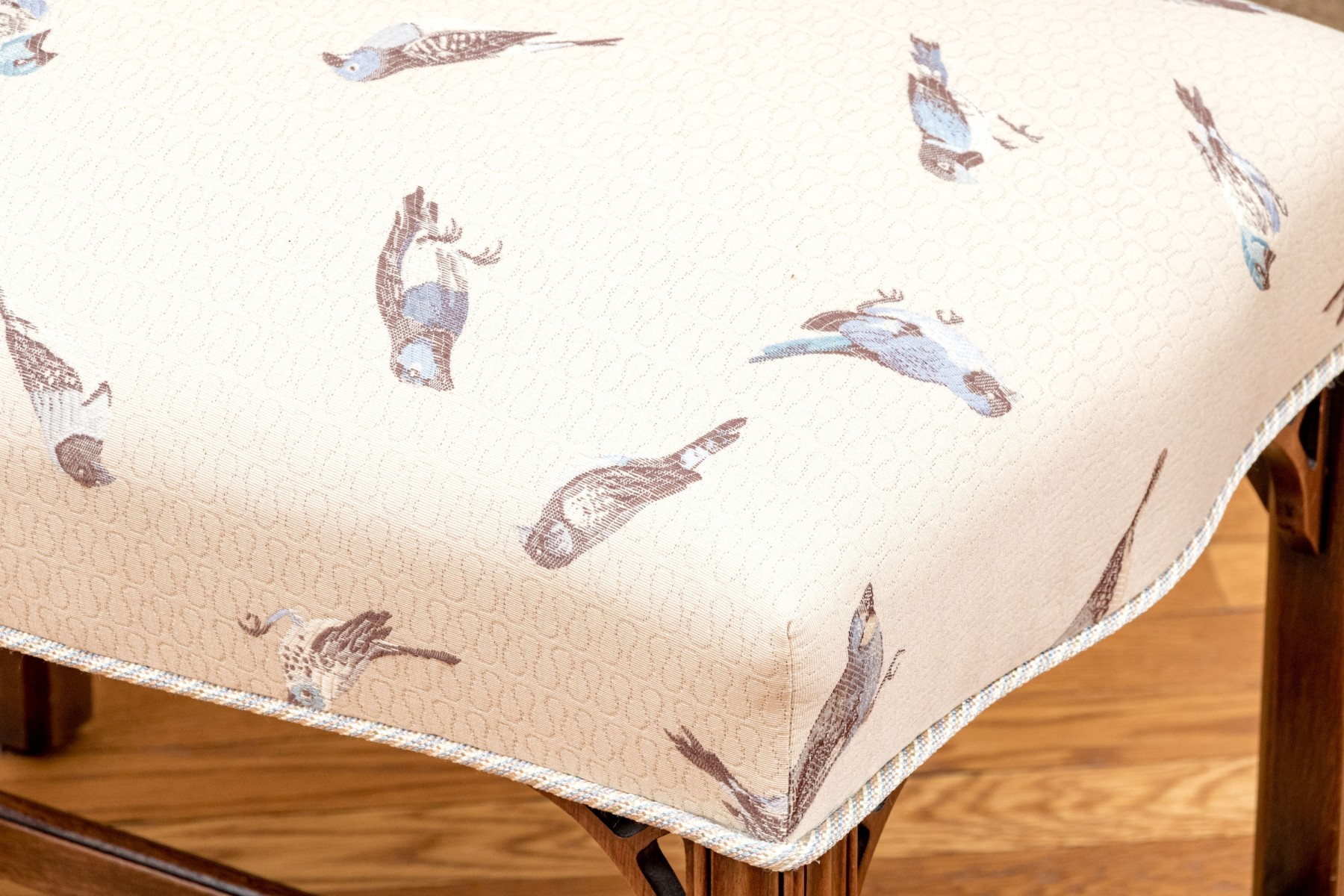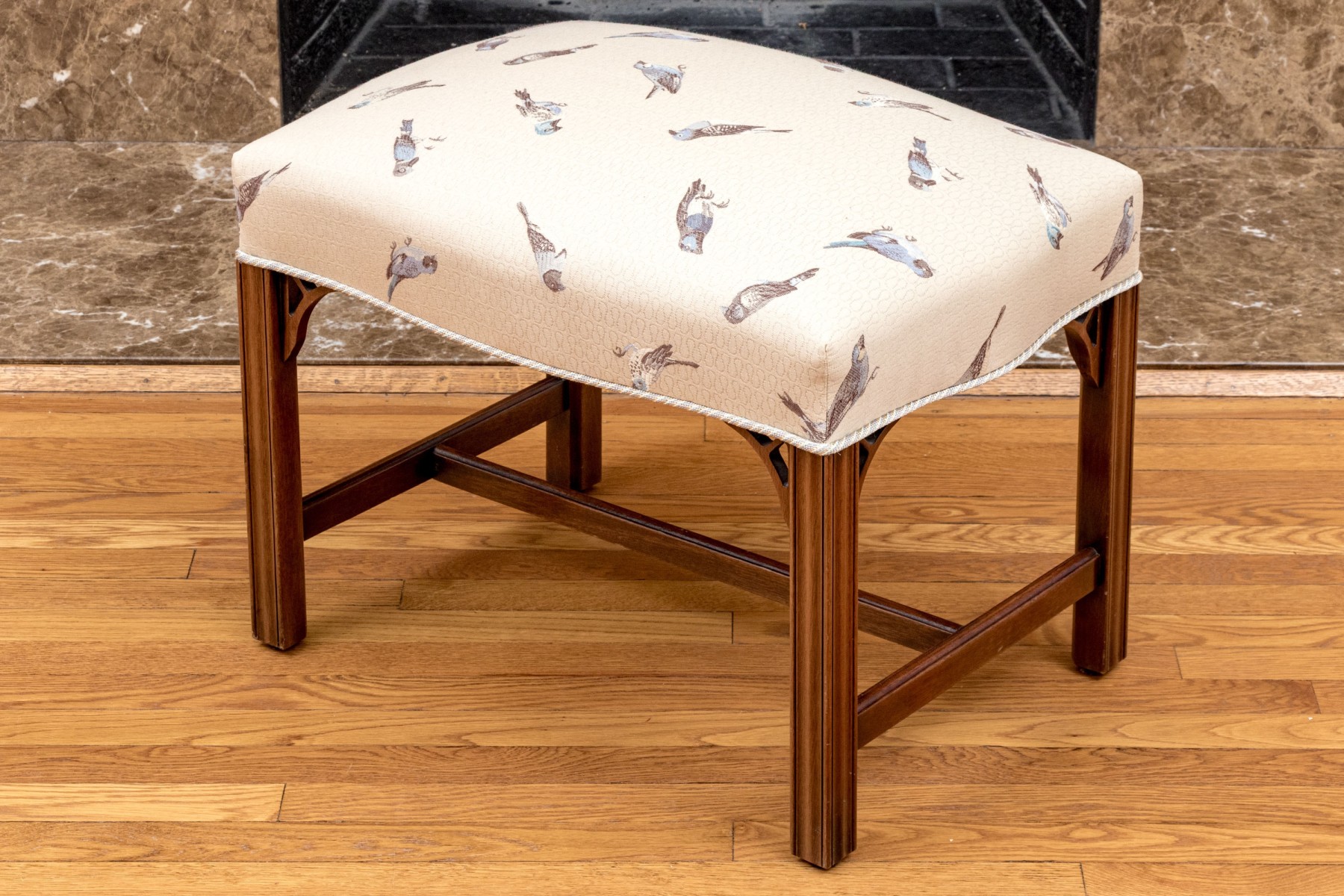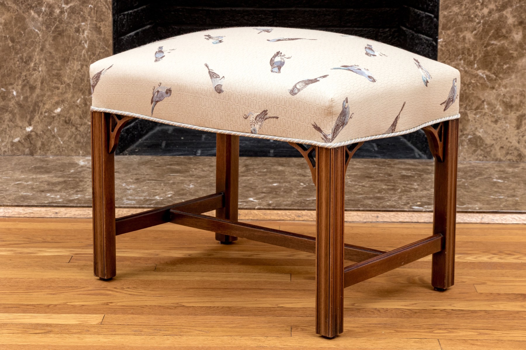 A quality stool or ottoman in elegant Chippendale style raised on four carved lets with pierced bracket supports with trestle style stretcher and lovely upholstered pillow with perched birds and brocade stye piped trim.