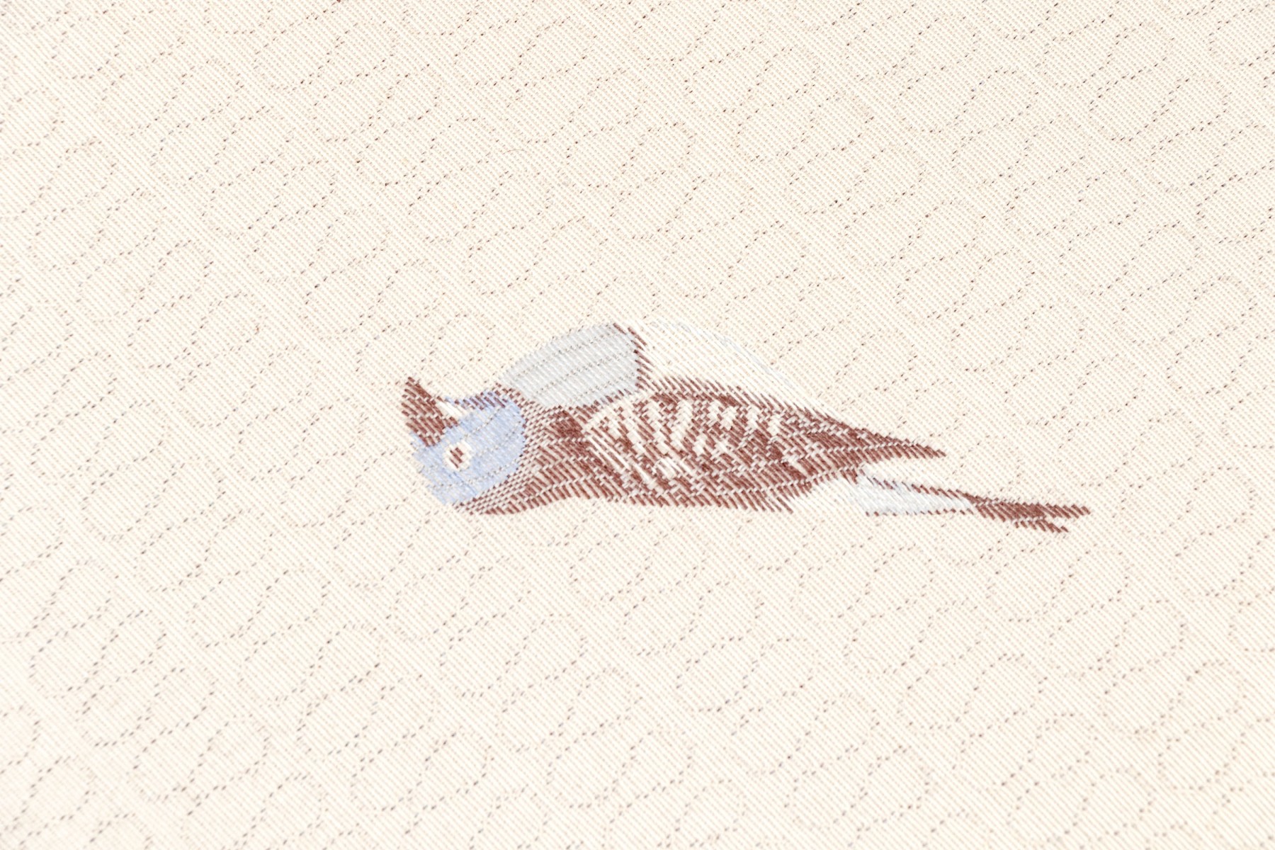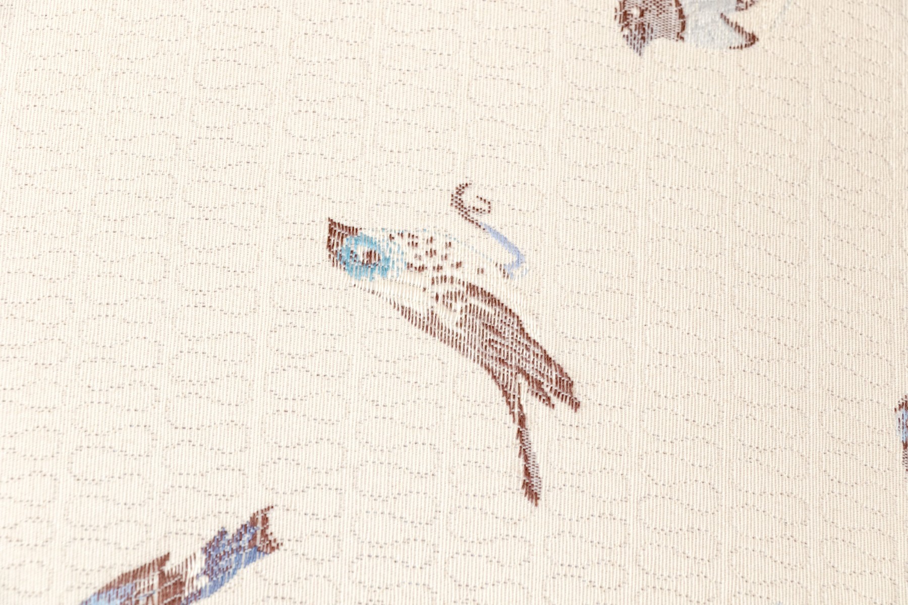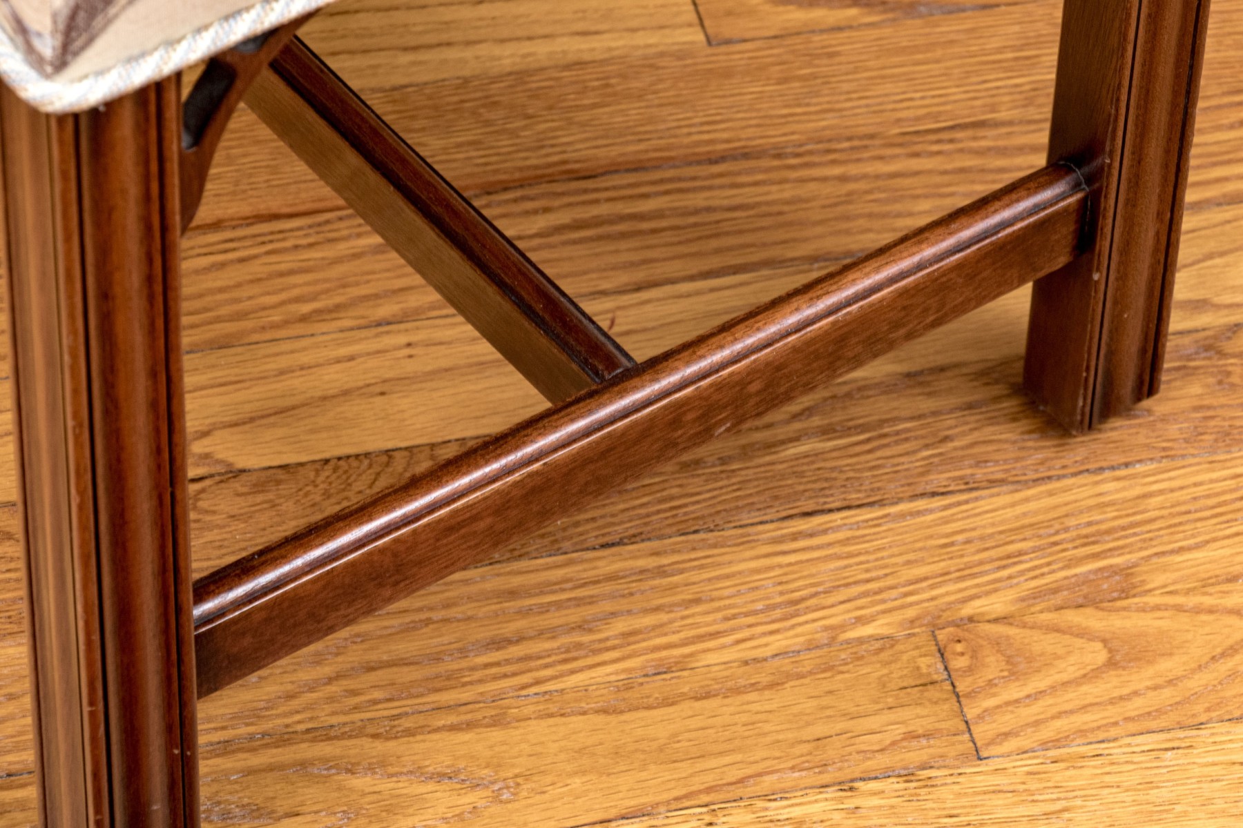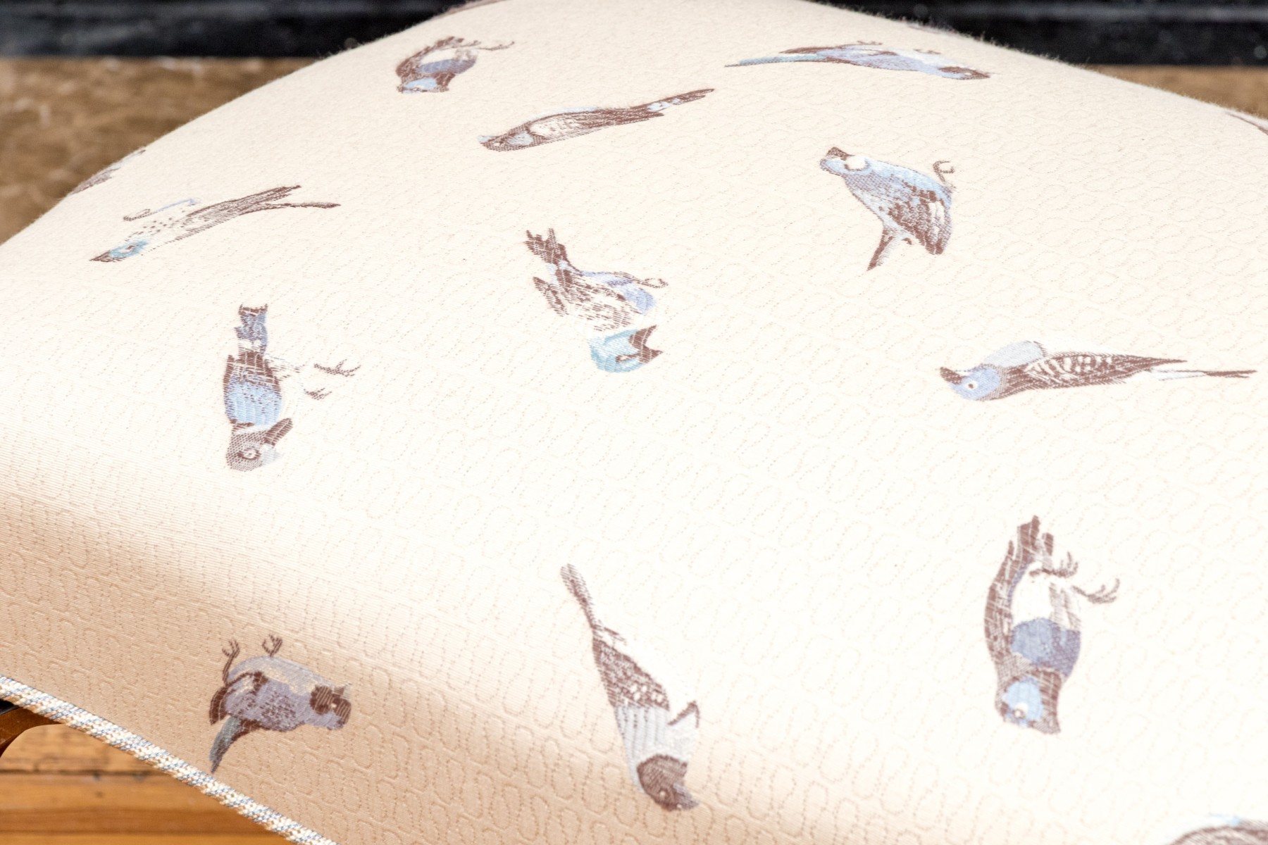A quality stool or ottoman in elegant Chippendale style raised on four carved lets with pierced bracket supports with trestle style stretcher and lovely upholstered pillow with perched birds and brocade stye piped trim.