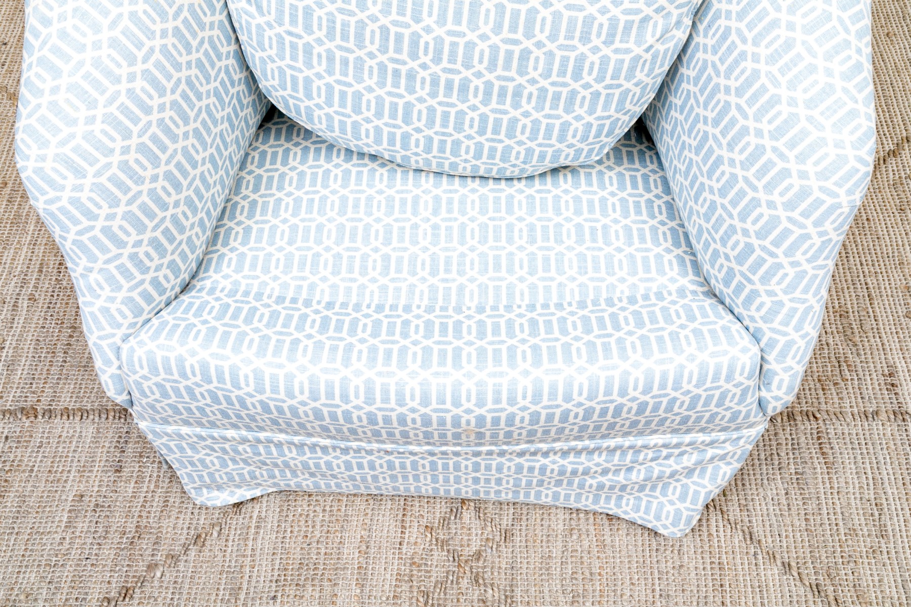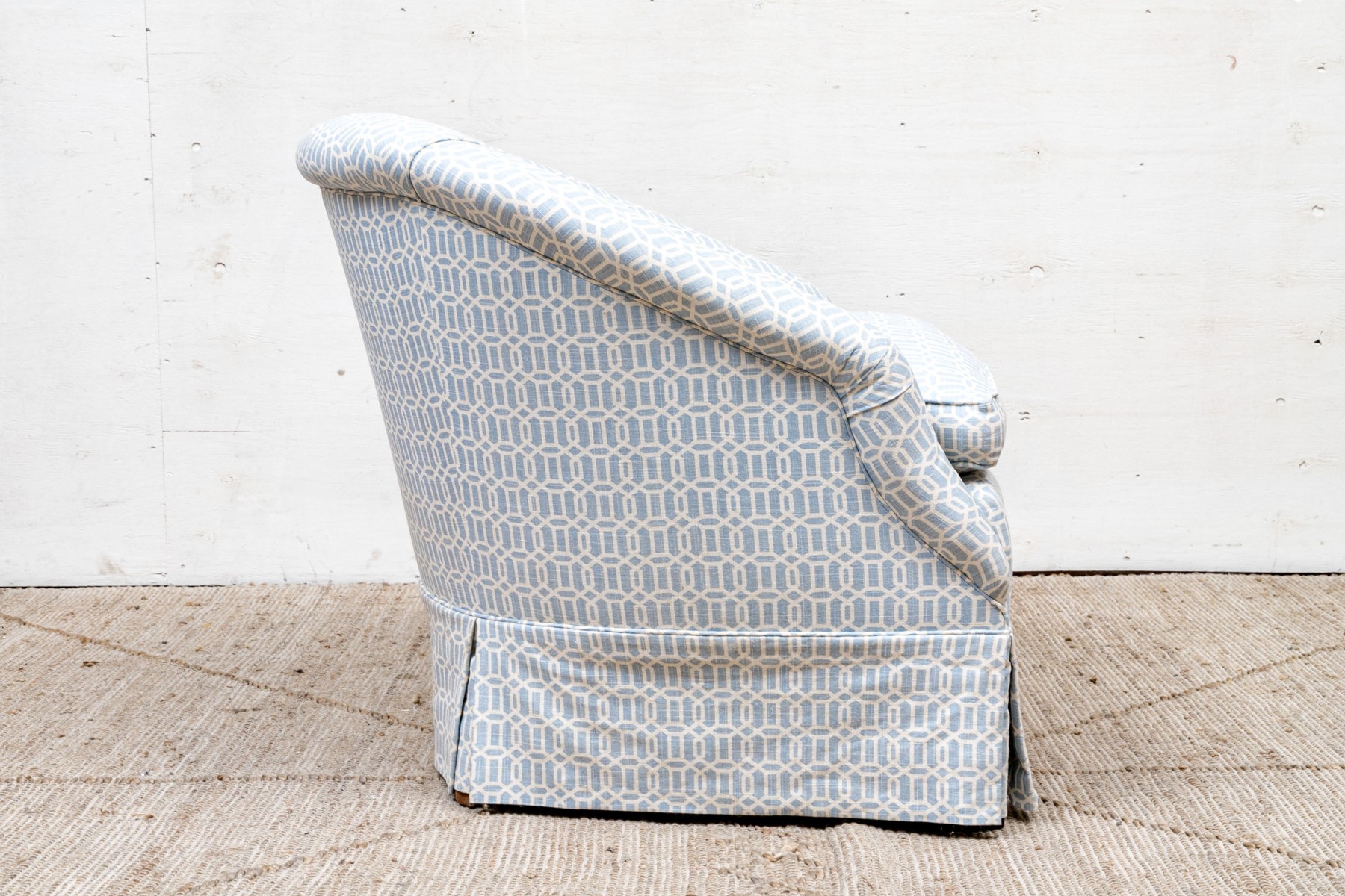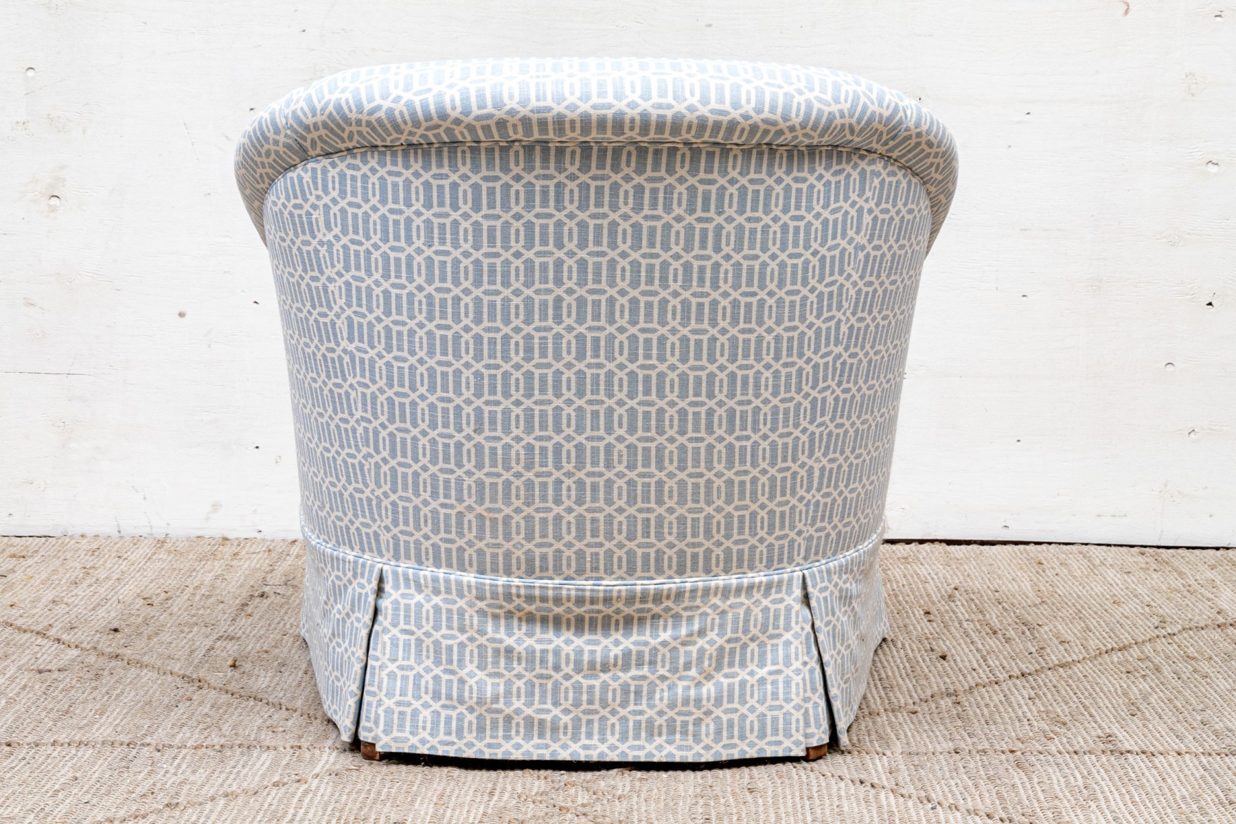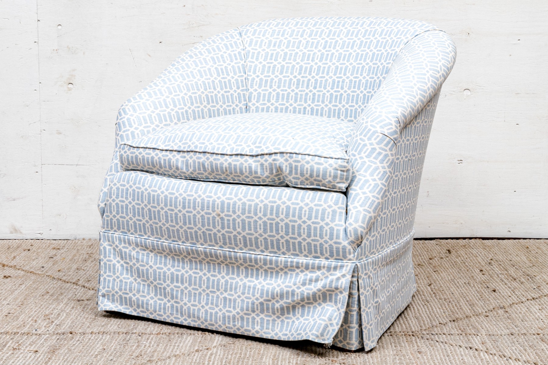 A tub chair with sloping back and rolled arms, a comfortable soft cushion and tailored skirt. Upholstered in a fine white and blue trellis pattern fabric.