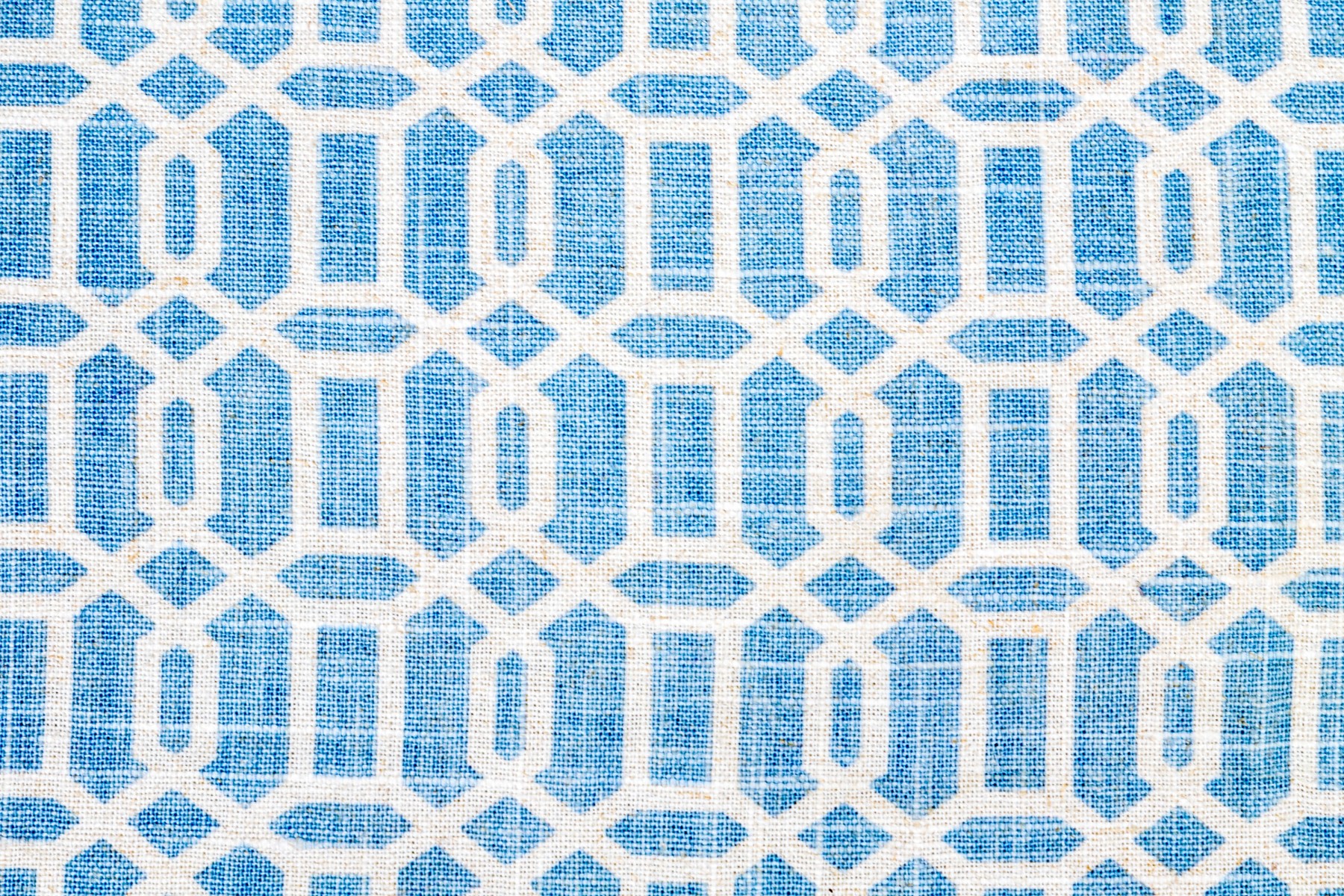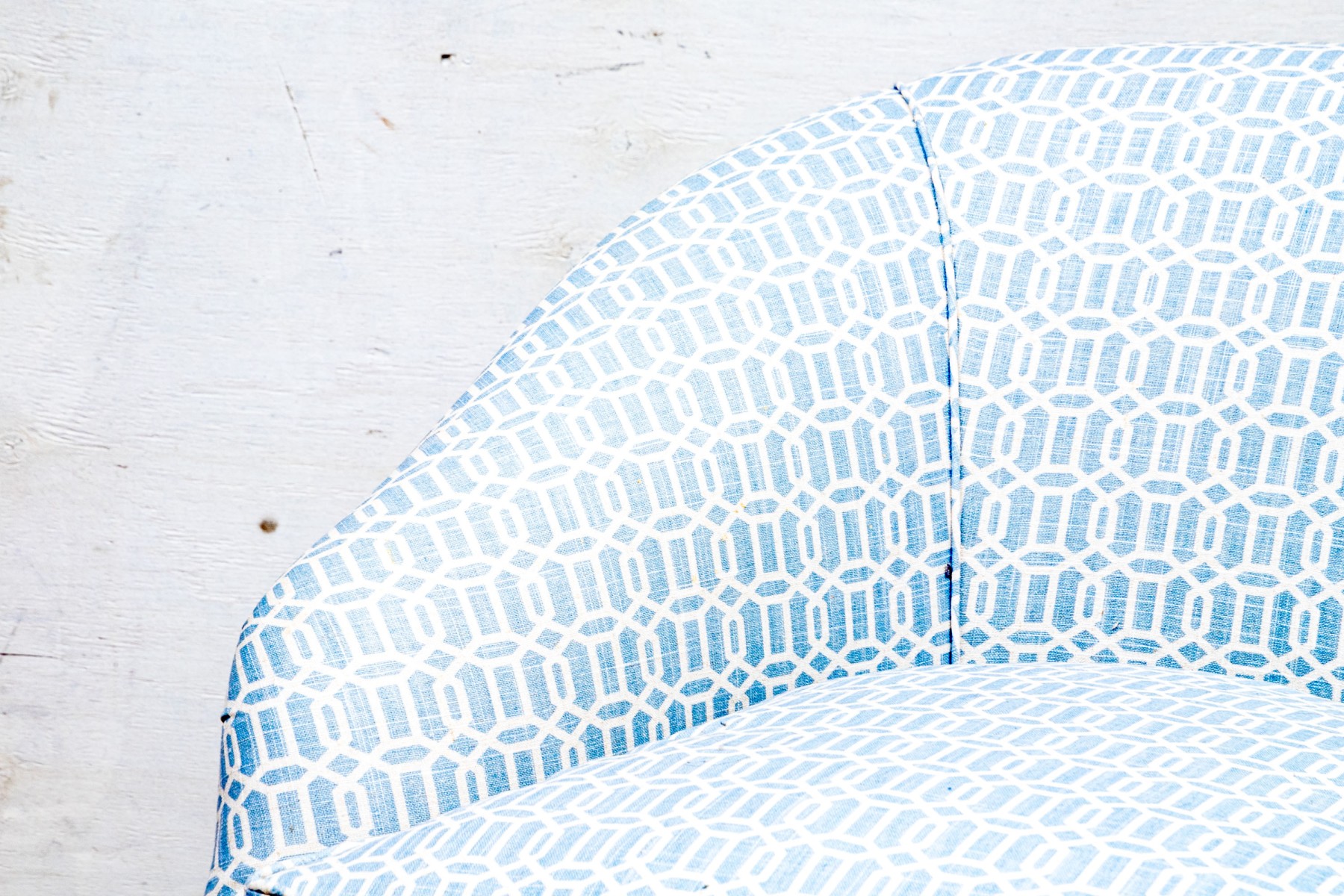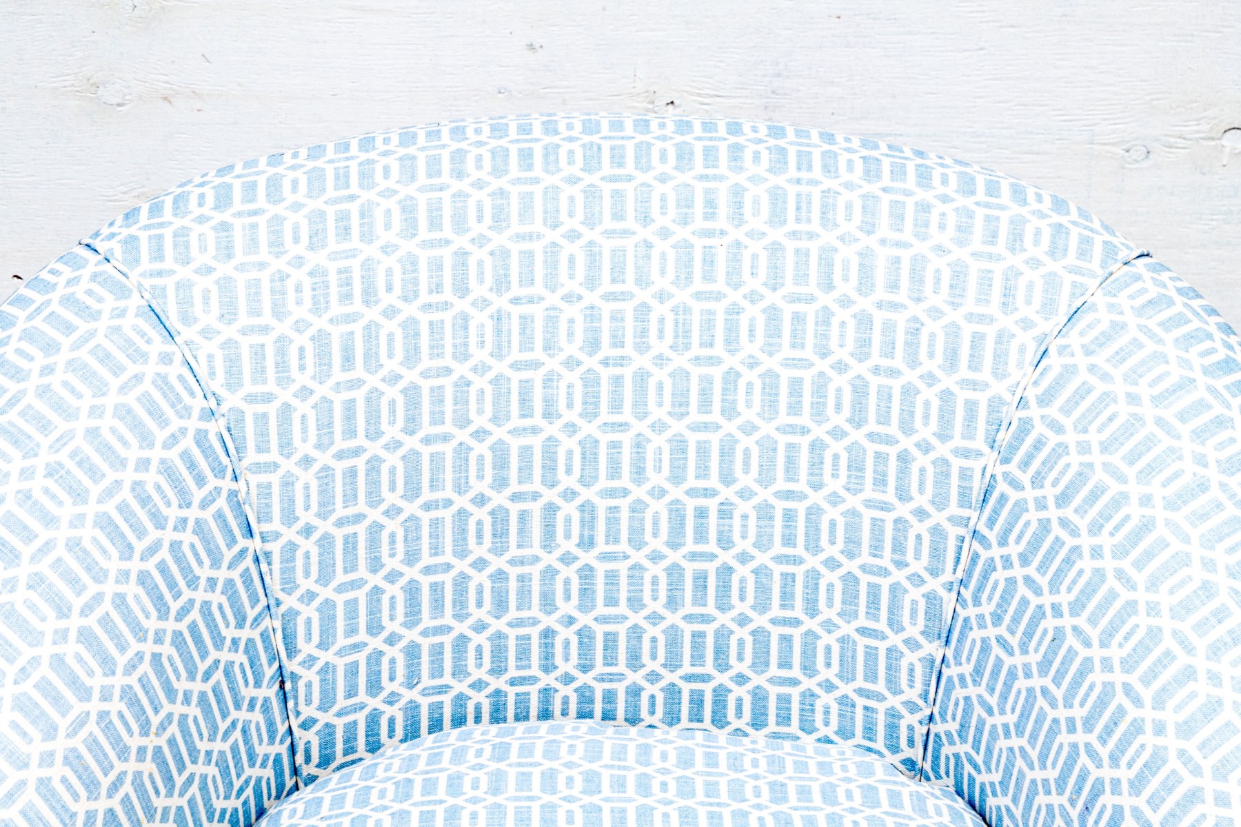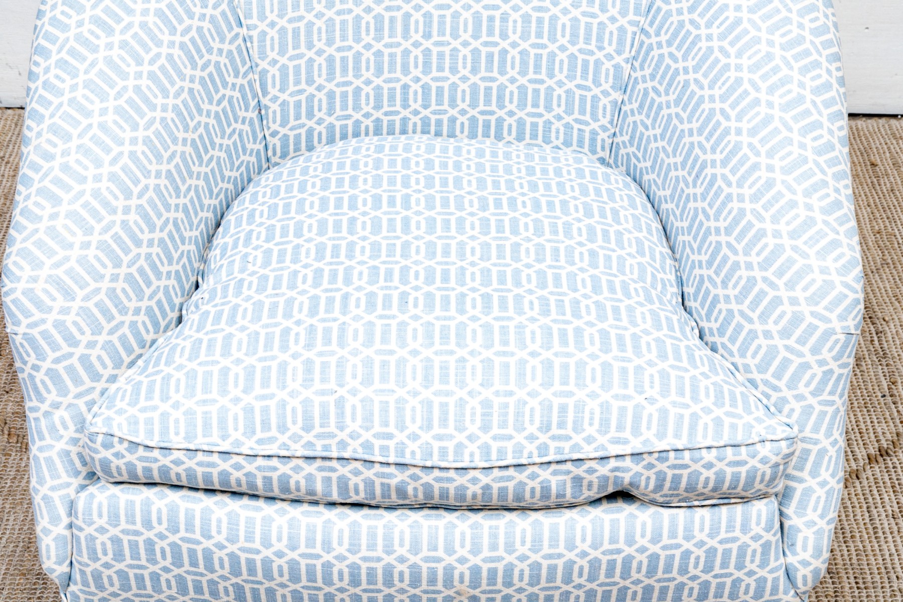 A tub chair with sloping back and rolled arms, a comfortable soft cushion and tailored skirt. Upholstered in a fine white and blue trellis pattern fabric.