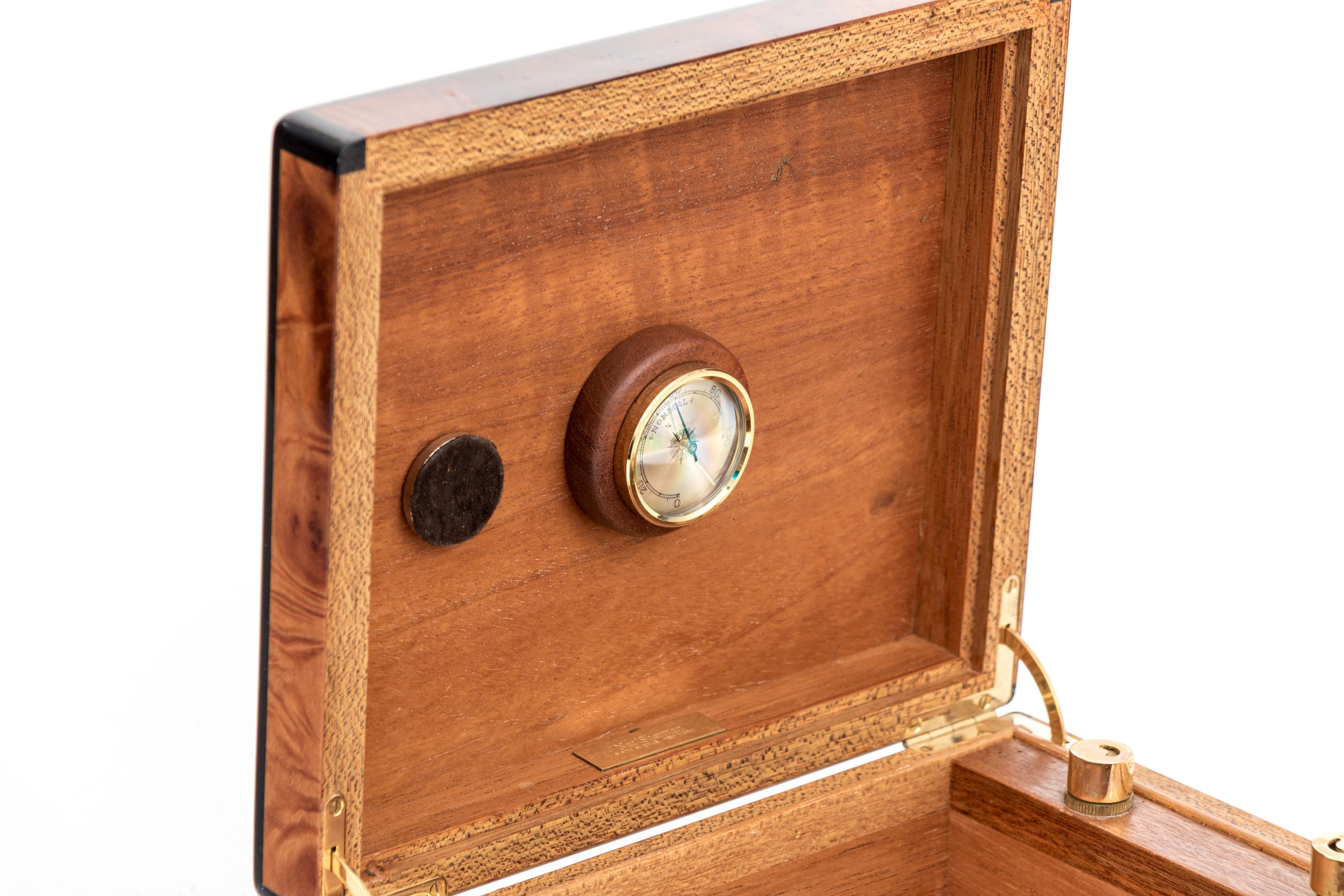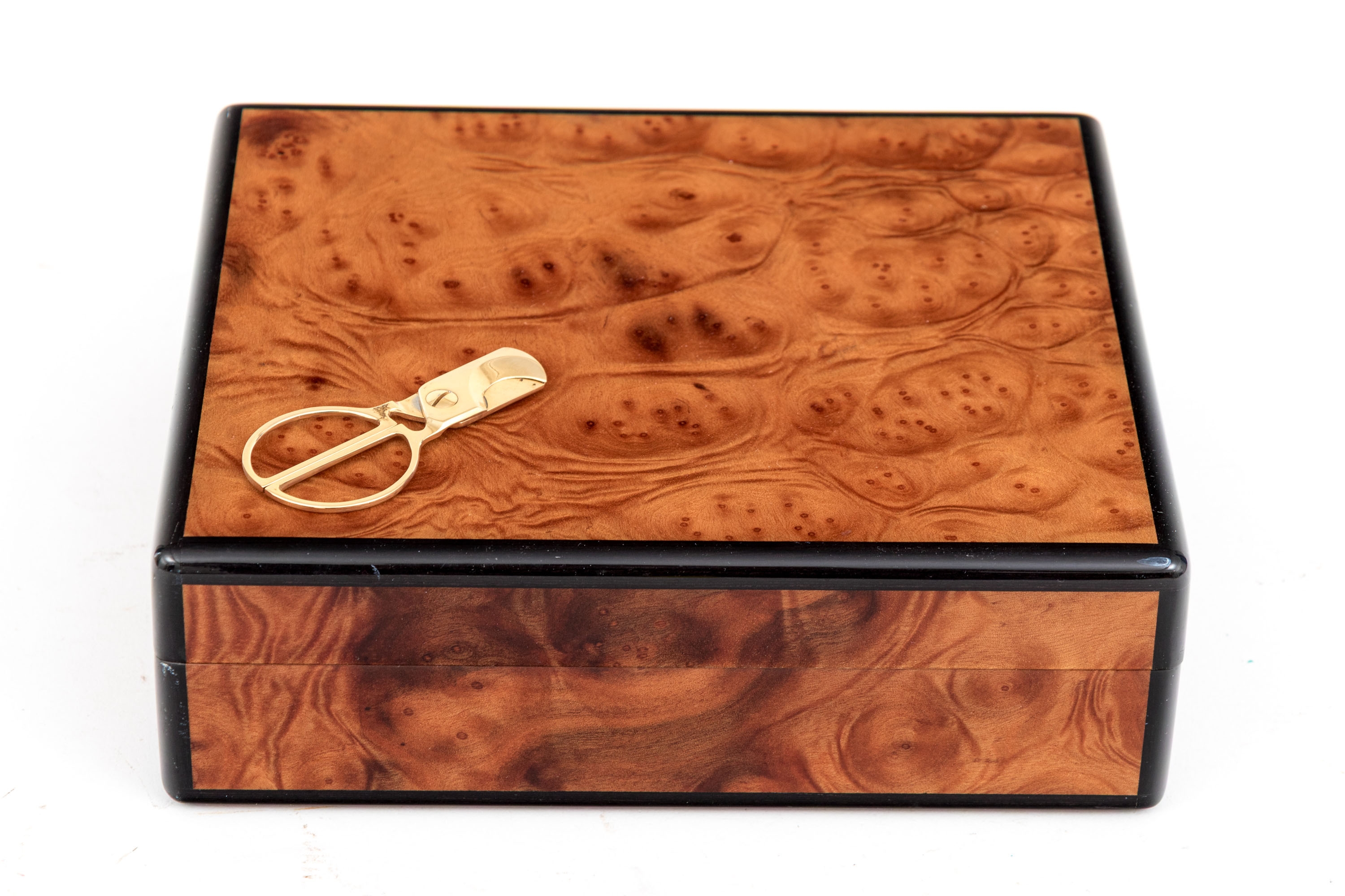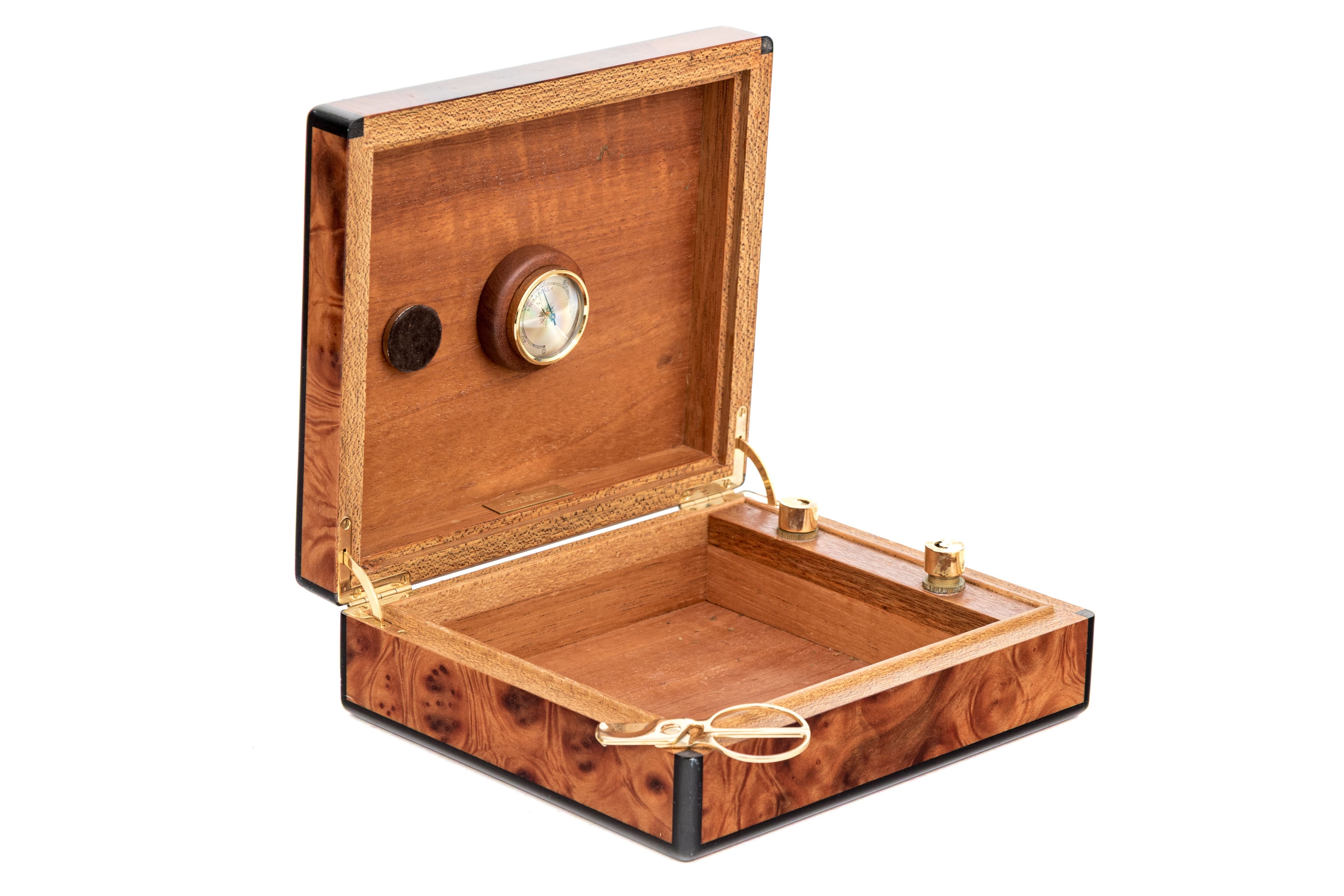 A quality cigar humidor box beautifully veneered in warm-toned, orange-brown wood with dark inlaid edges. The hinged lid opens to a hygrometer within. Include two brass mounted glass cases and a pair of brass cigar snips.