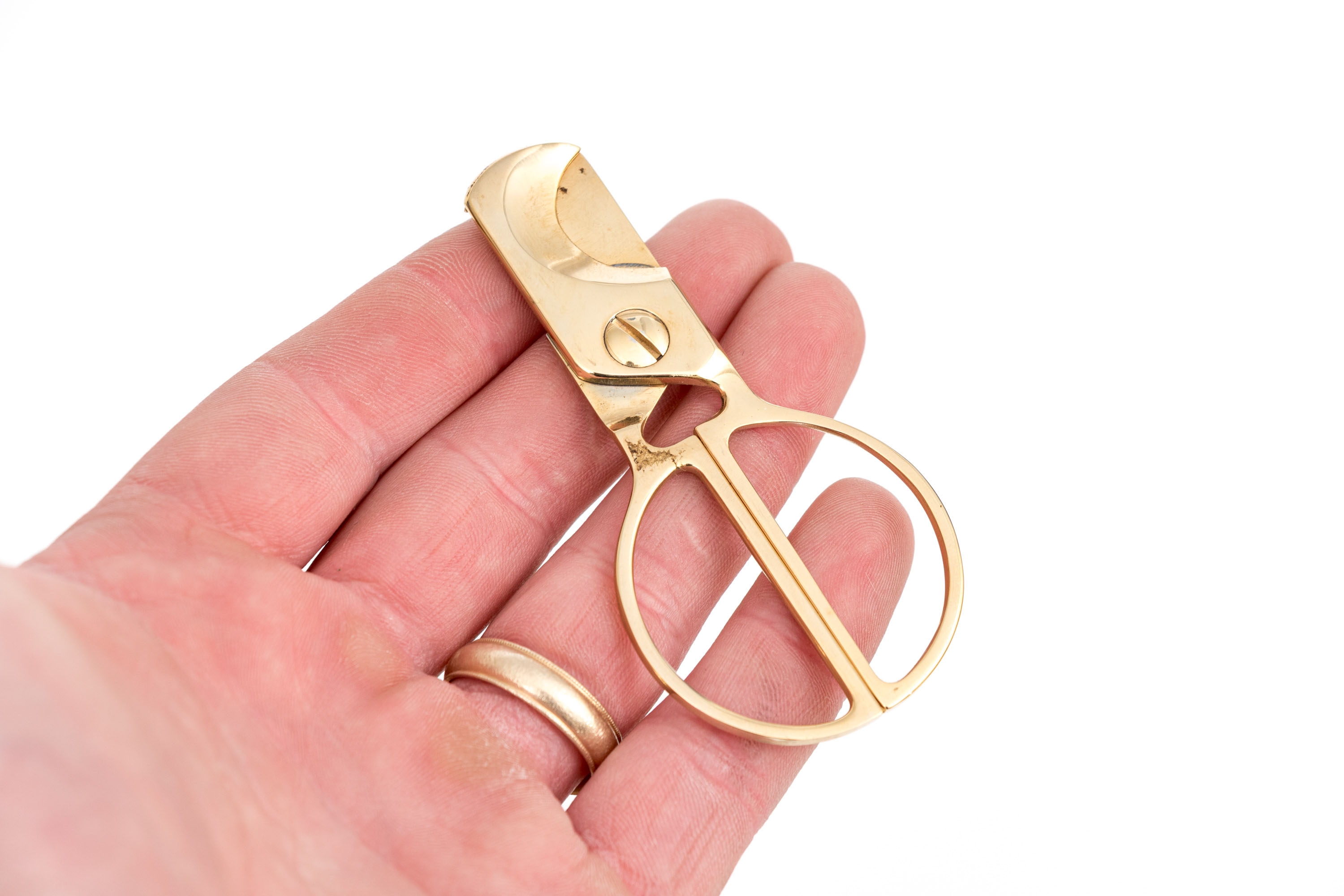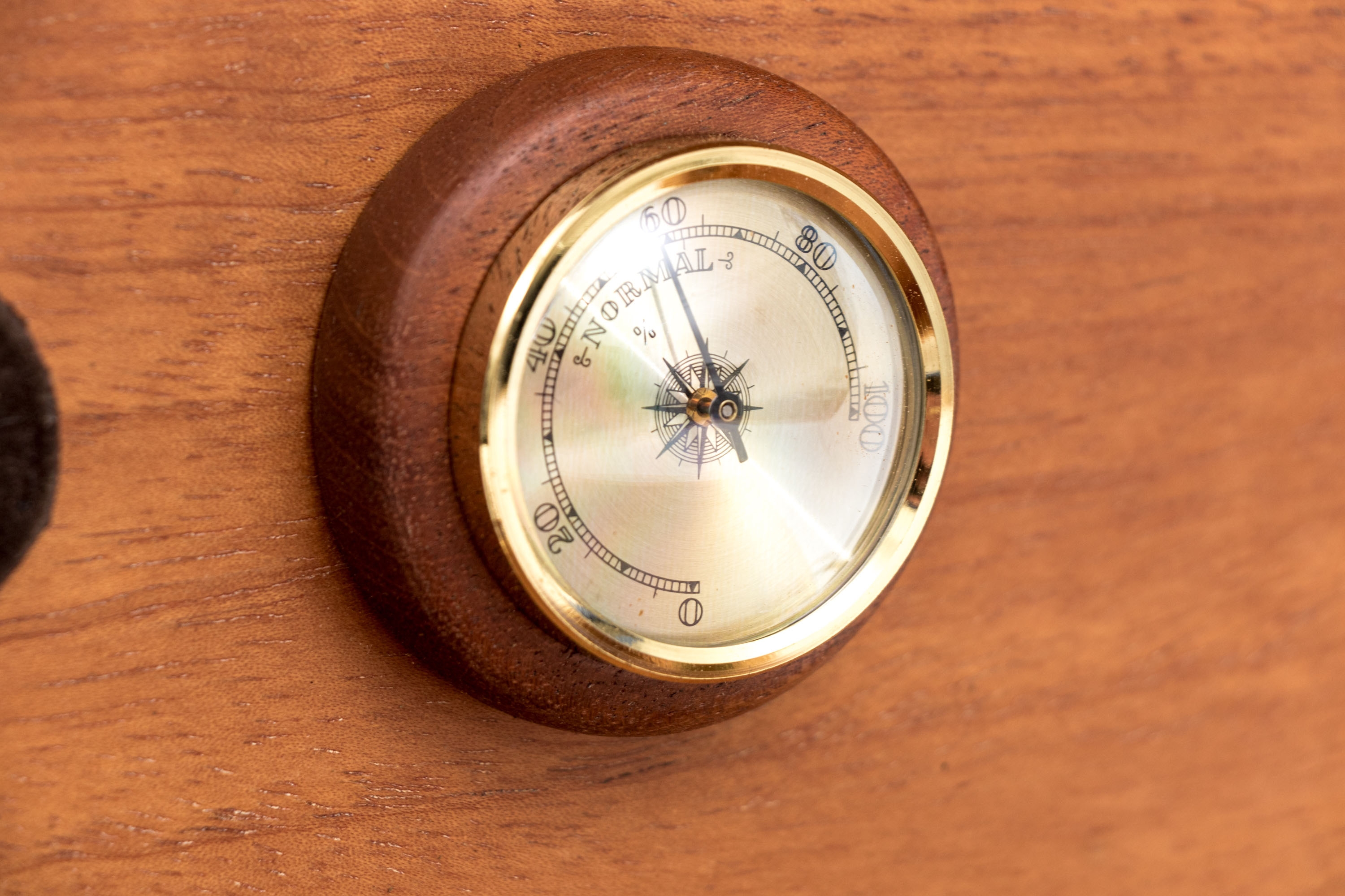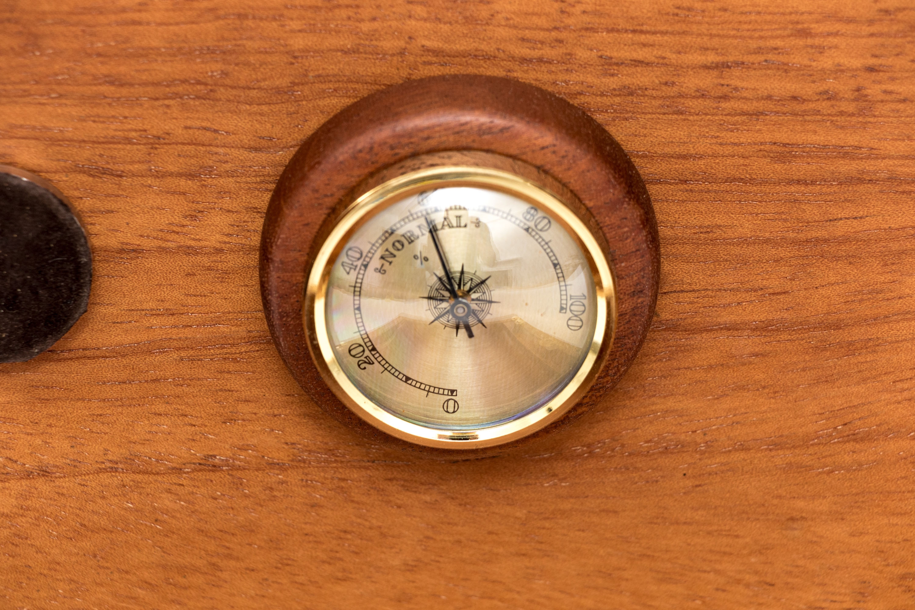 A quality cigar humidor box beautifully veneered in warm-toned, orange-brown wood with dark inlaid edges. The hinged lid opens to a hygrometer within. Include two brass mounted glass cases and a pair of brass cigar snips.