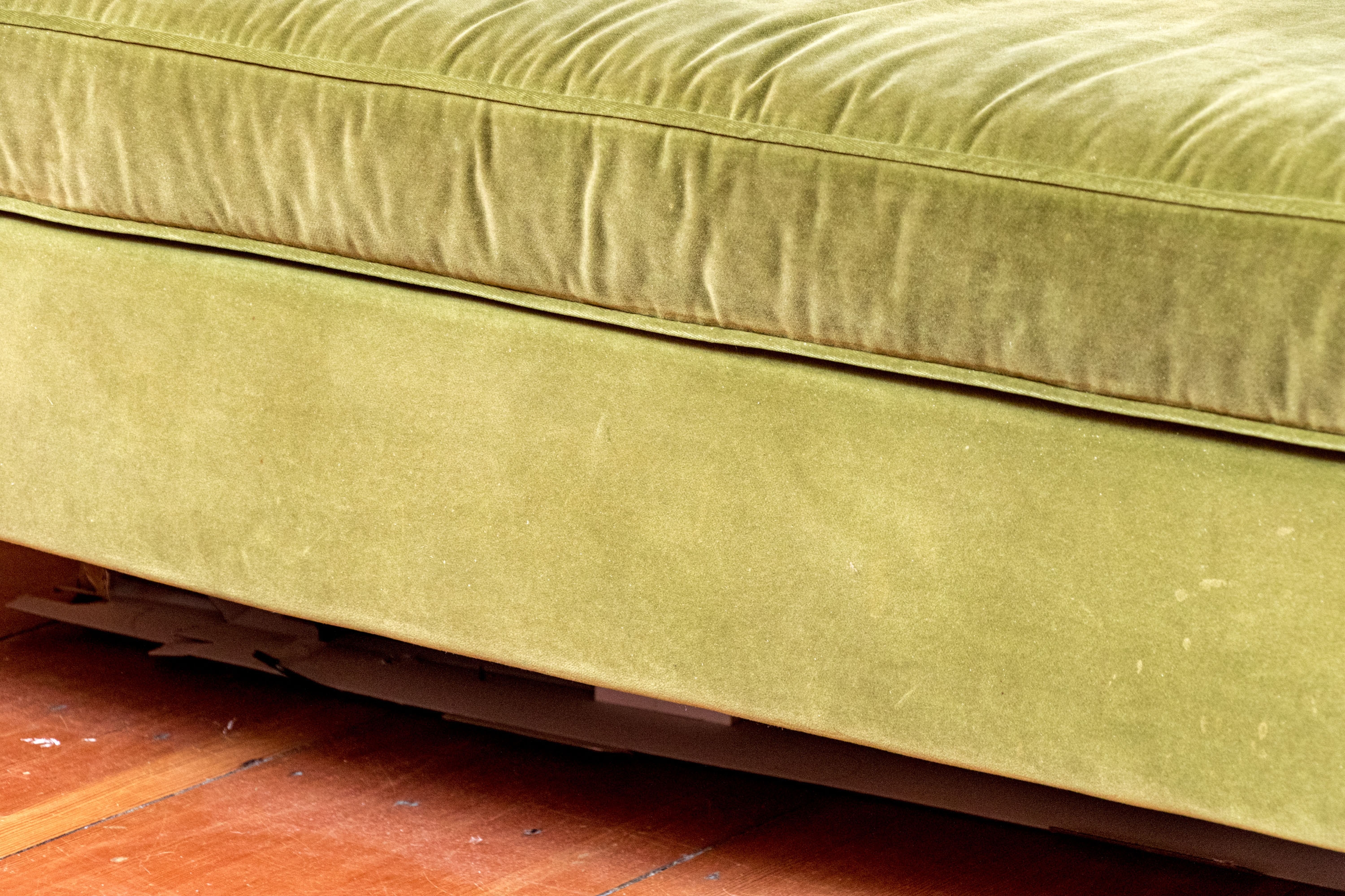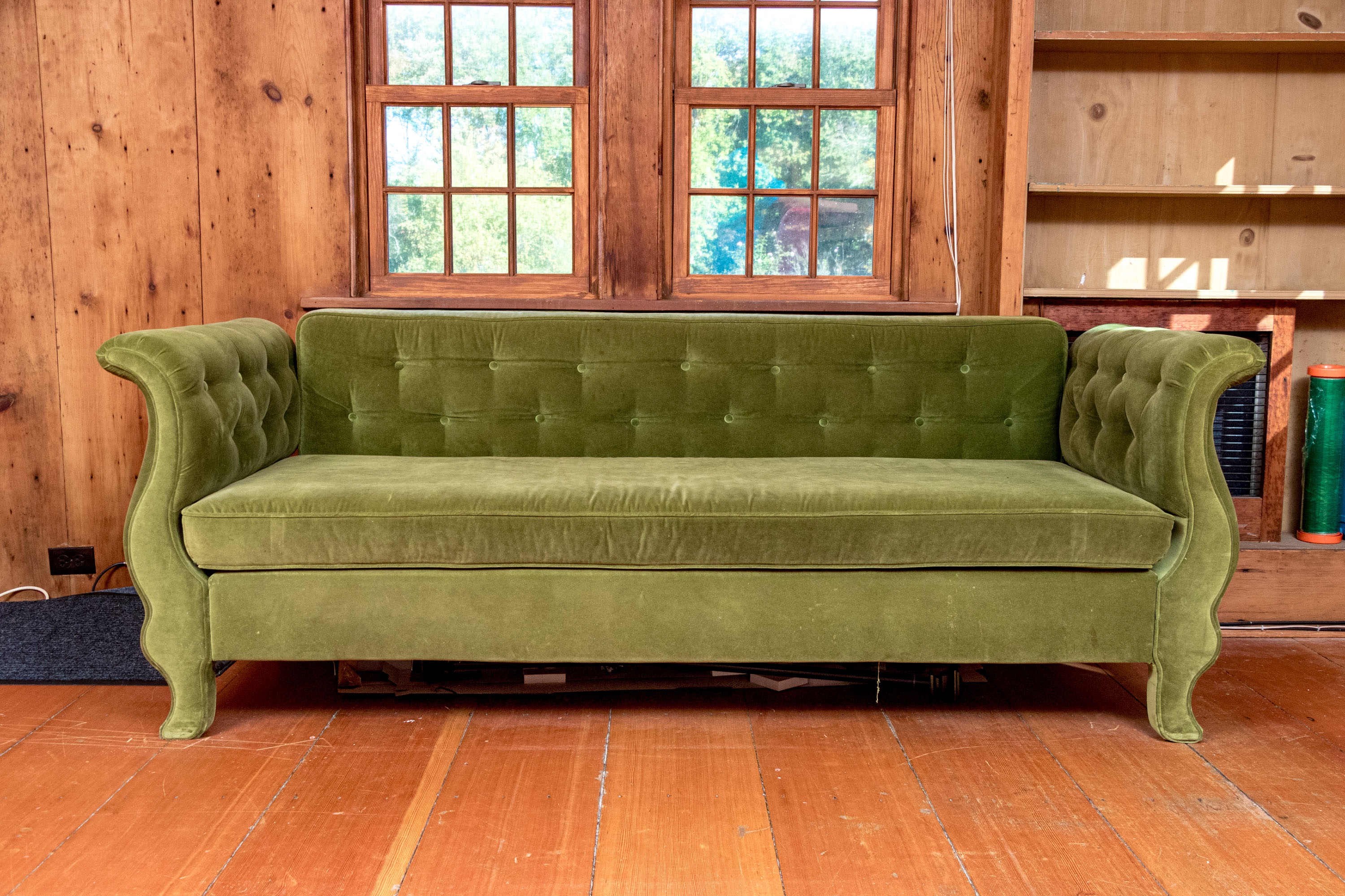 On four cabriole legs with scrolled arms and button tufted arms. The sofa has a single loose upholstered seat cushoin. Provenance: Purchased at the auction for Gramercy Hotel.