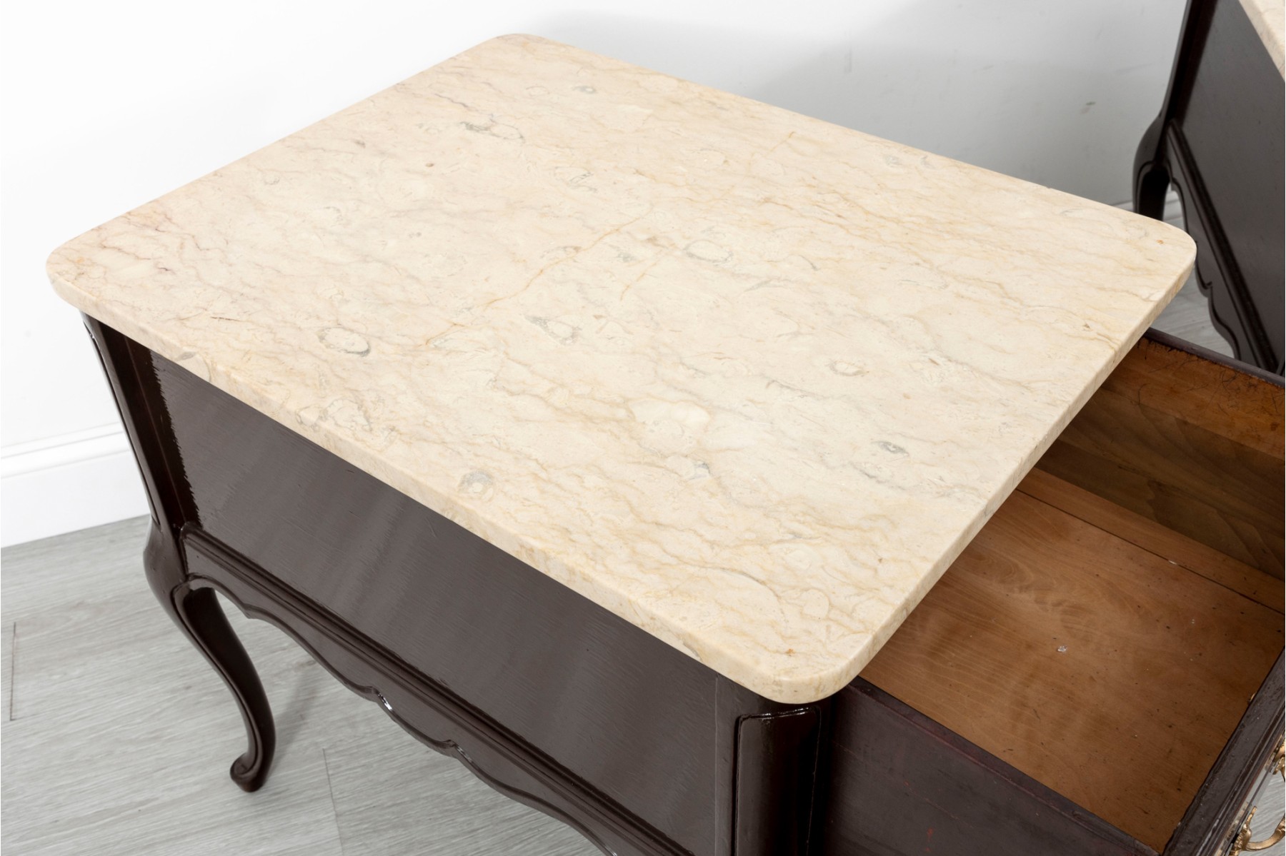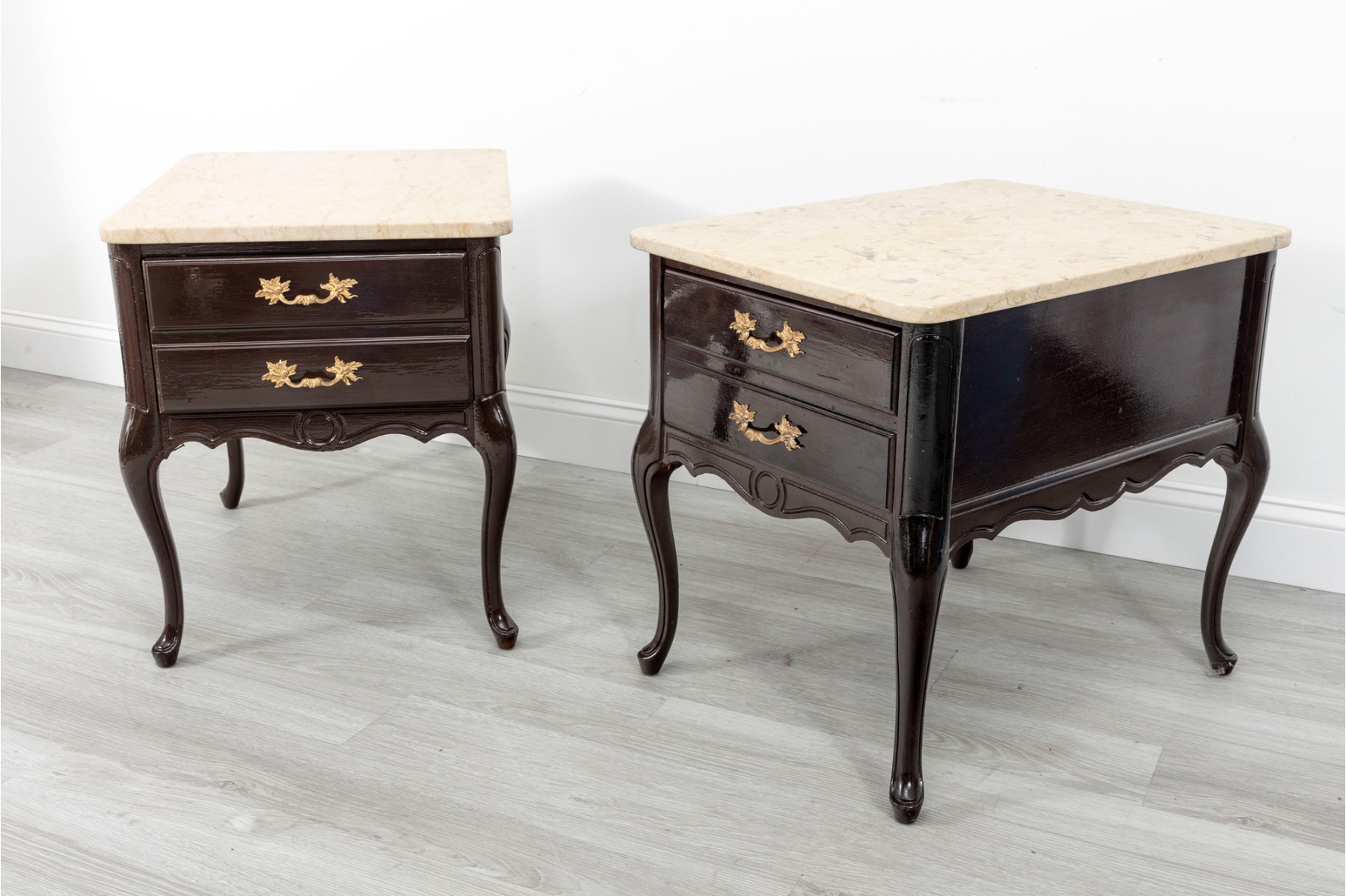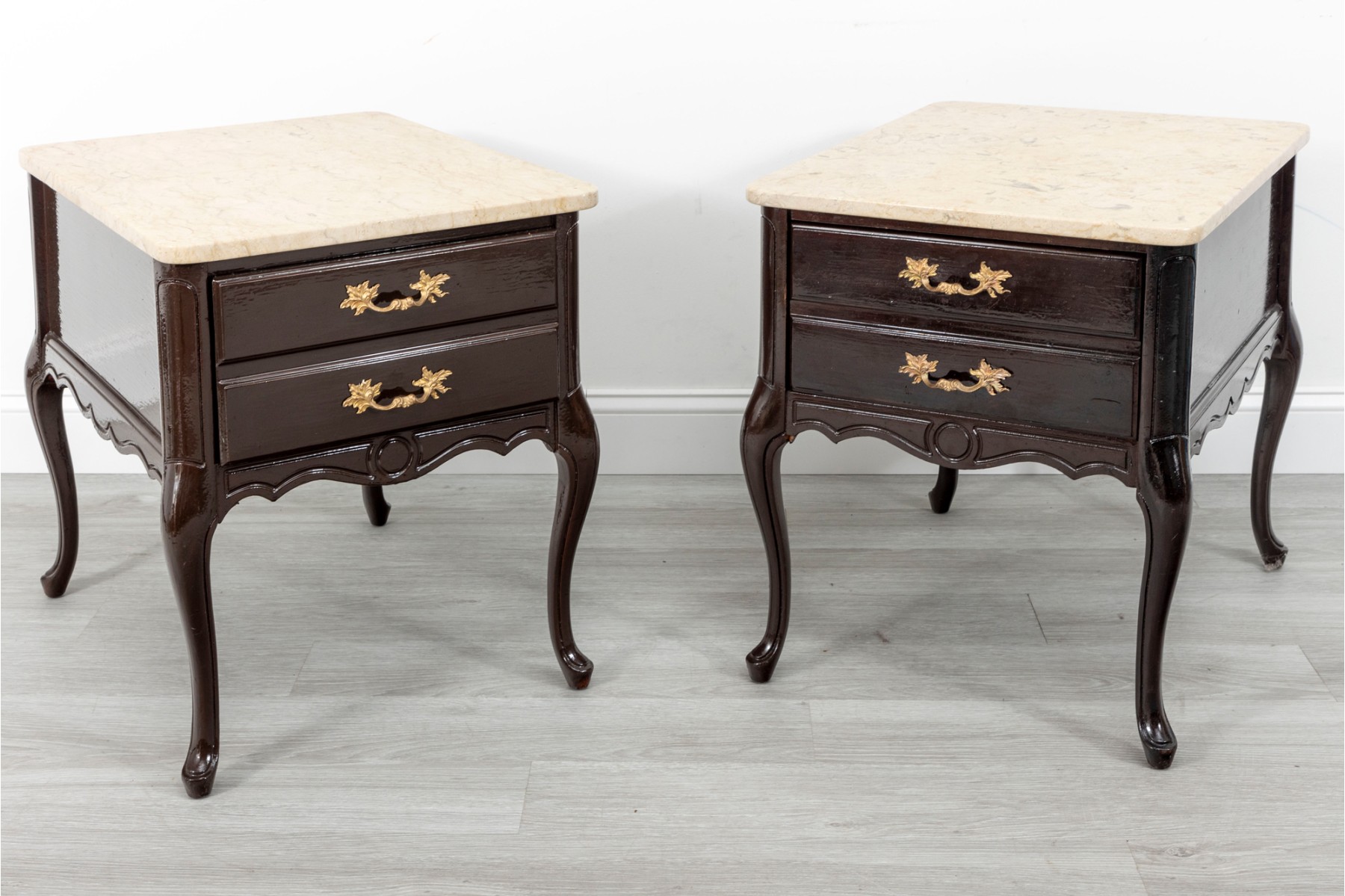 A handsome pair of Queen Anne style night stands in a glossy, dark brown finish featuring cream stone tops. The tables sport single dovetail drawers with two-drawer facades, opening to spacious storage space. Finished with simply detailed aprons and cabriole legs.