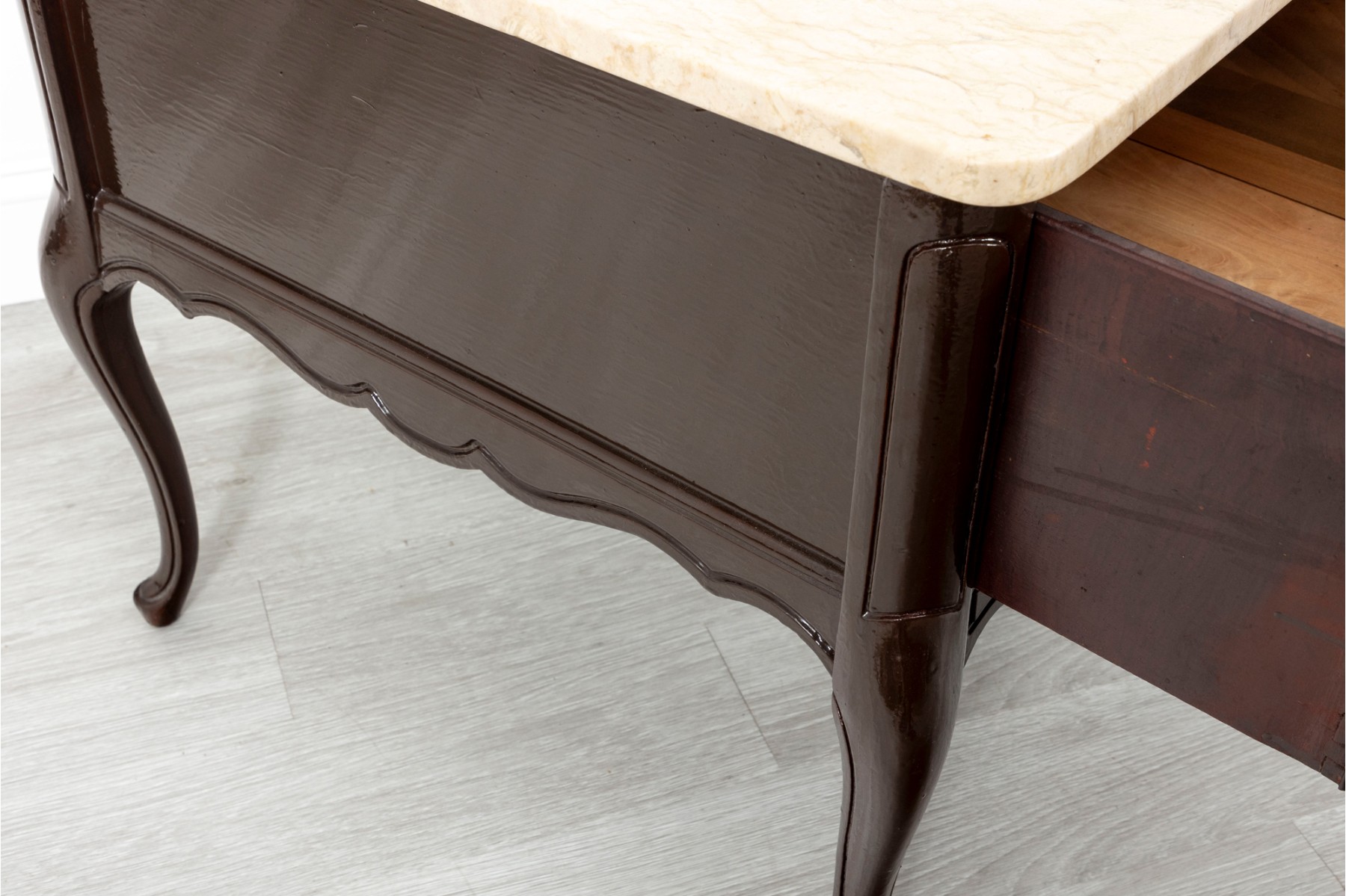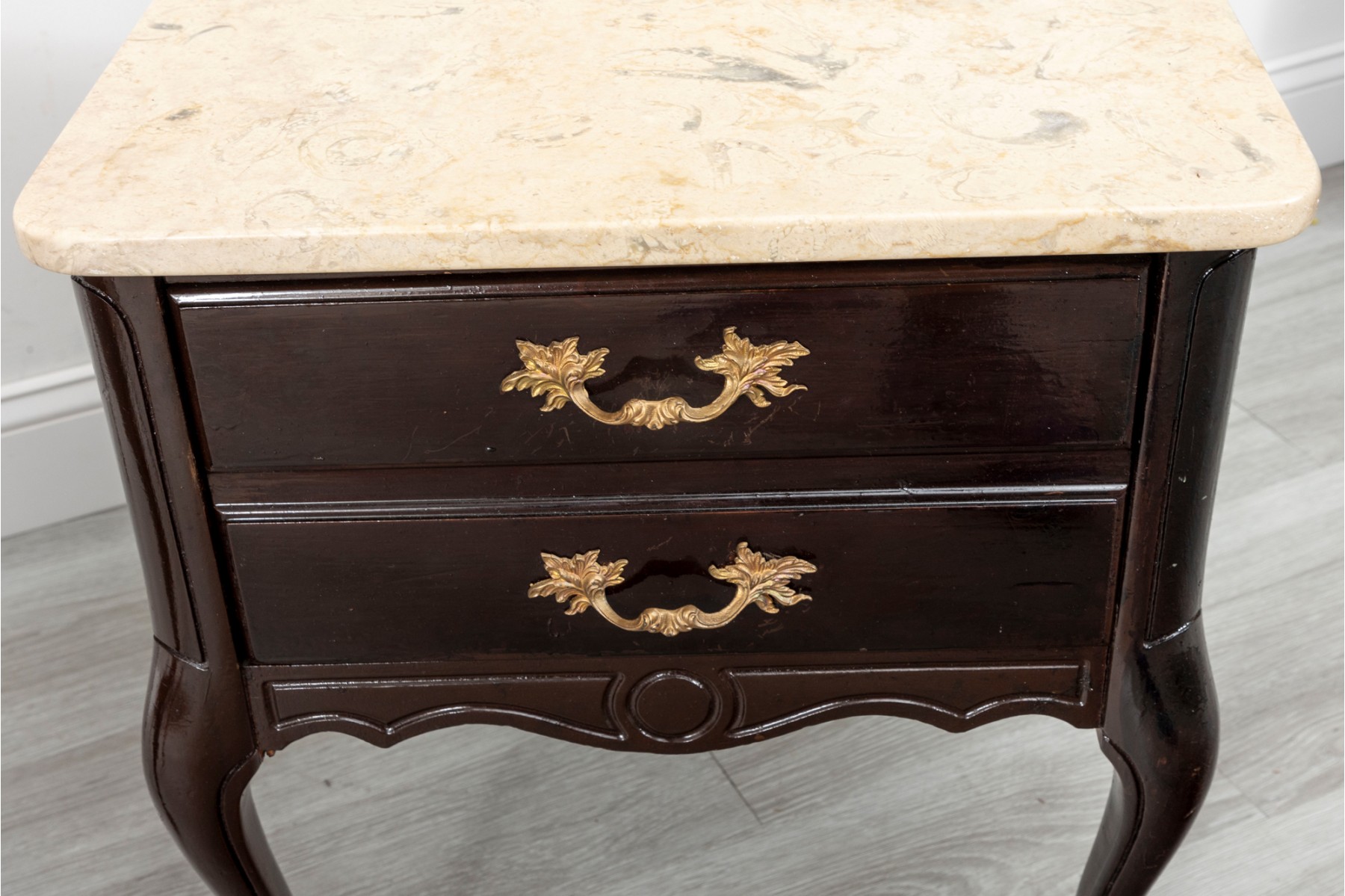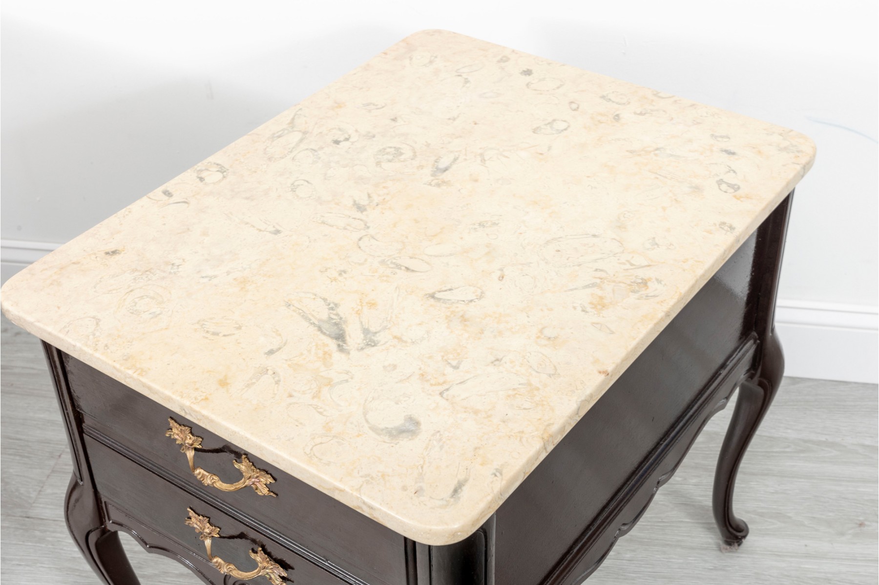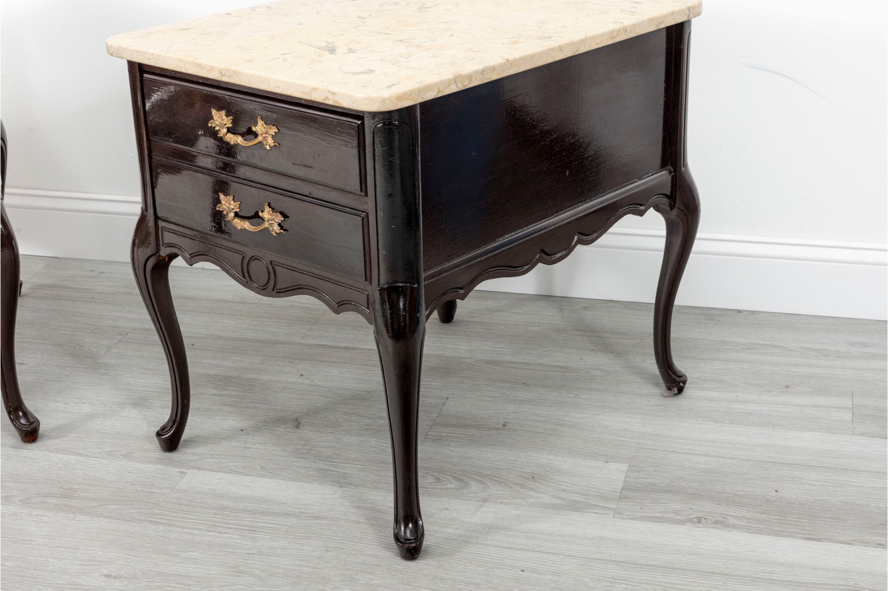 A handsome pair of Queen Anne style night stands in a glossy, dark brown finish featuring cream stone tops. The tables sport single dovetail drawers with two-drawer facades, opening to spacious storage space. Finished with simply detailed aprons and cabriole legs.