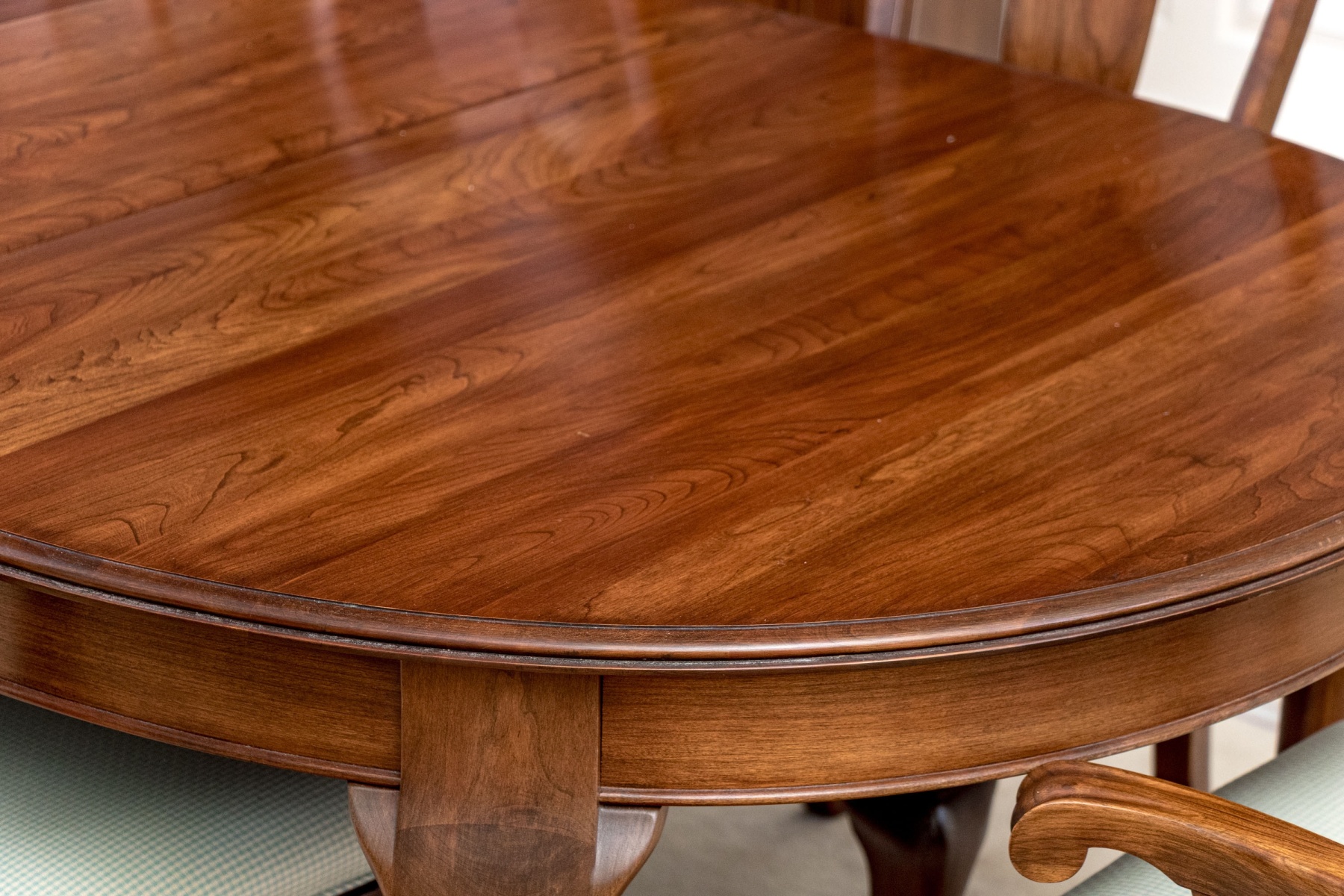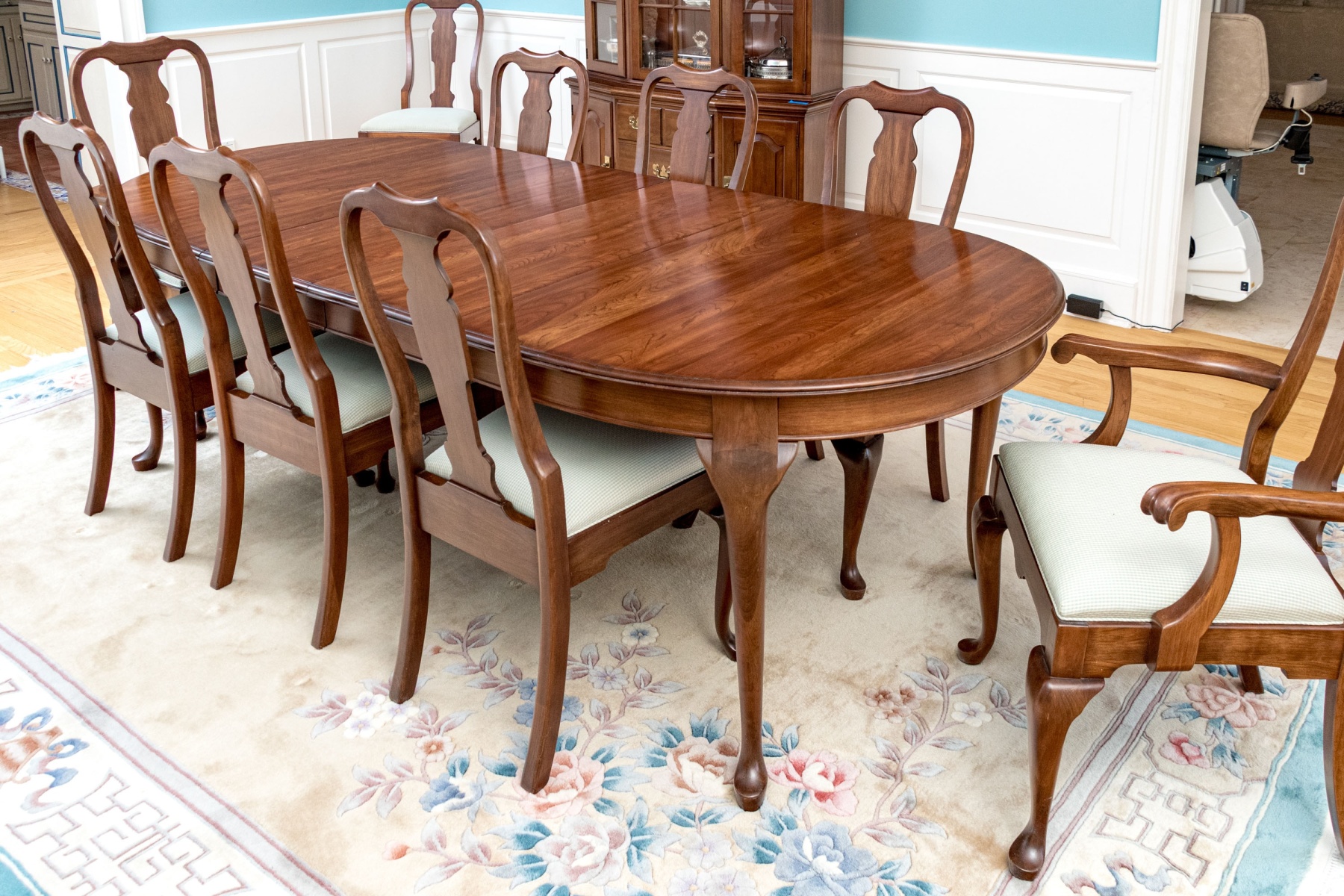 An excellent Queen Anne style dining suite well crafted in warm-toned medium brown cherry, including an extension dining table, two leaves, and ten chairs comprised of eight side chairs and two end armchairs. The table features a sleek oval form with a gently beveled edge overhanging classic cabriole legs on slipper feet. The chairs follow suit with shapely vertical splats, rounded ears, and seats upholstered in fine teal and white plaid.