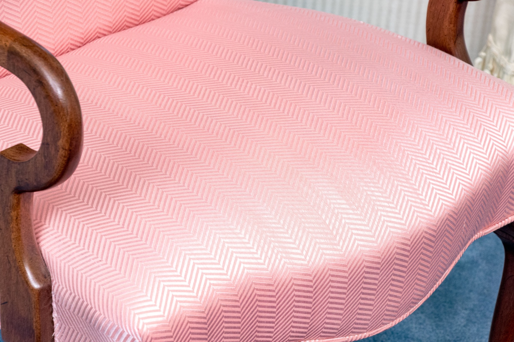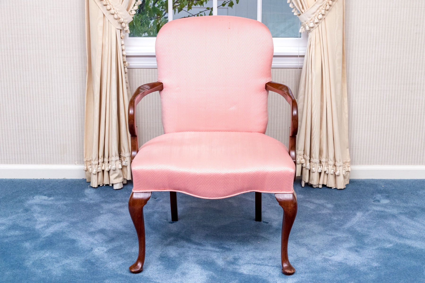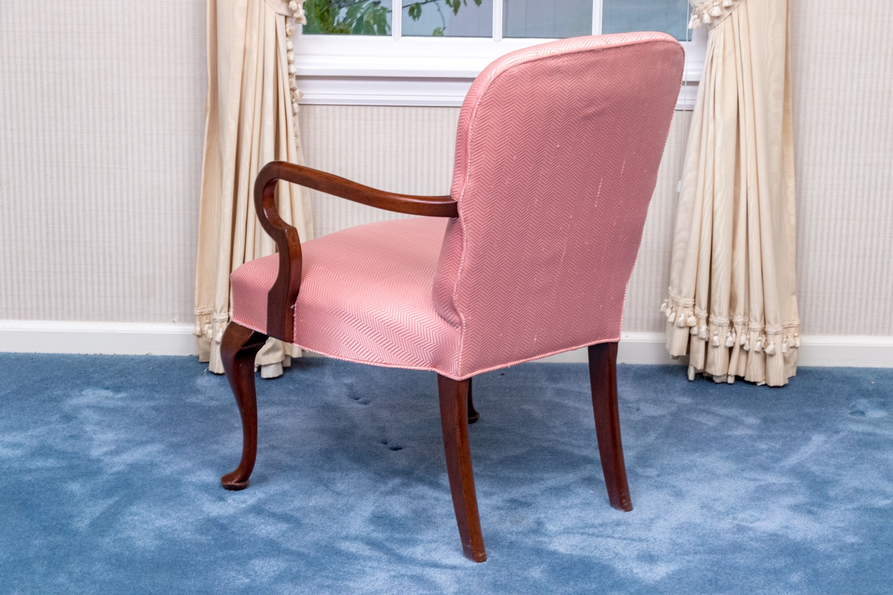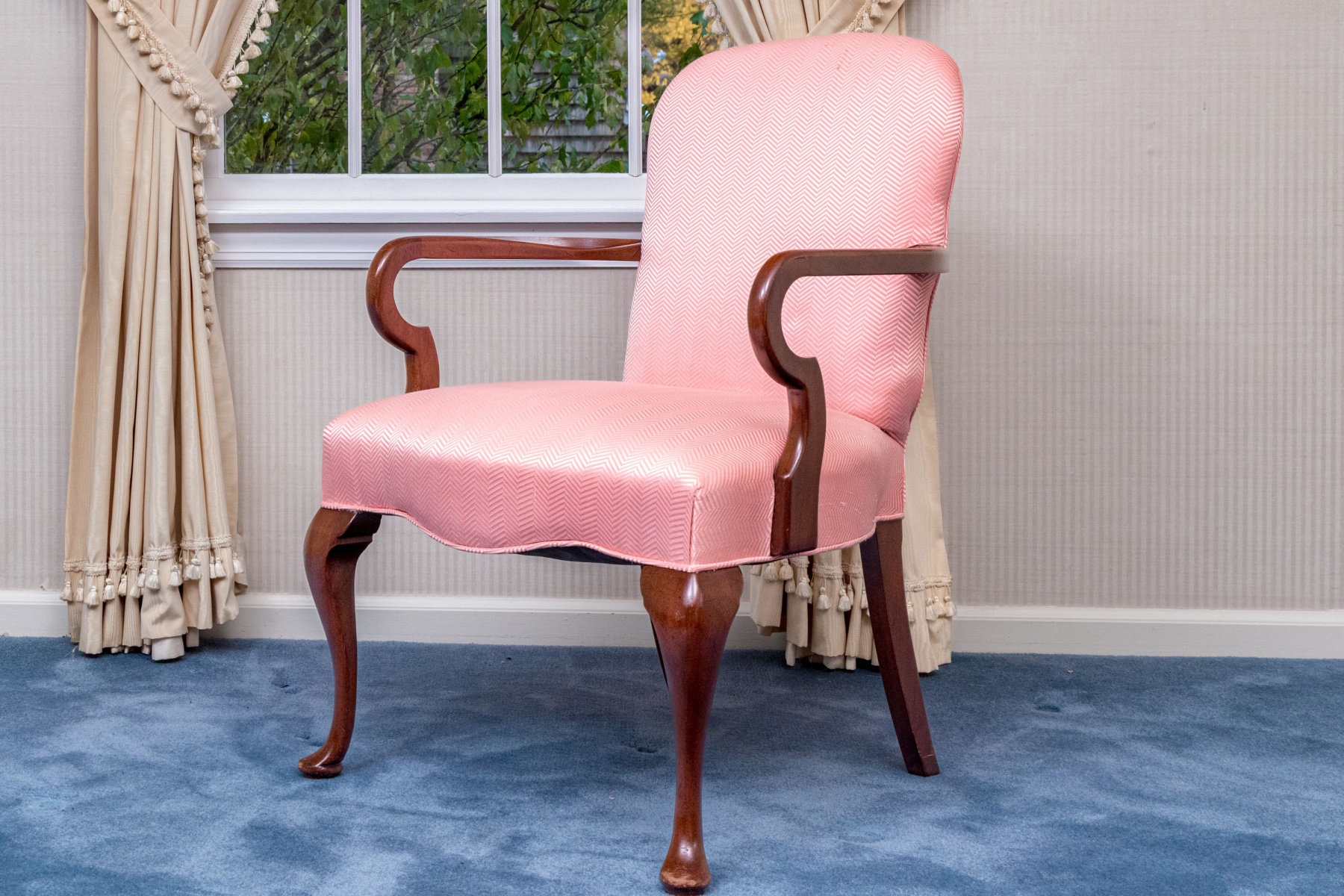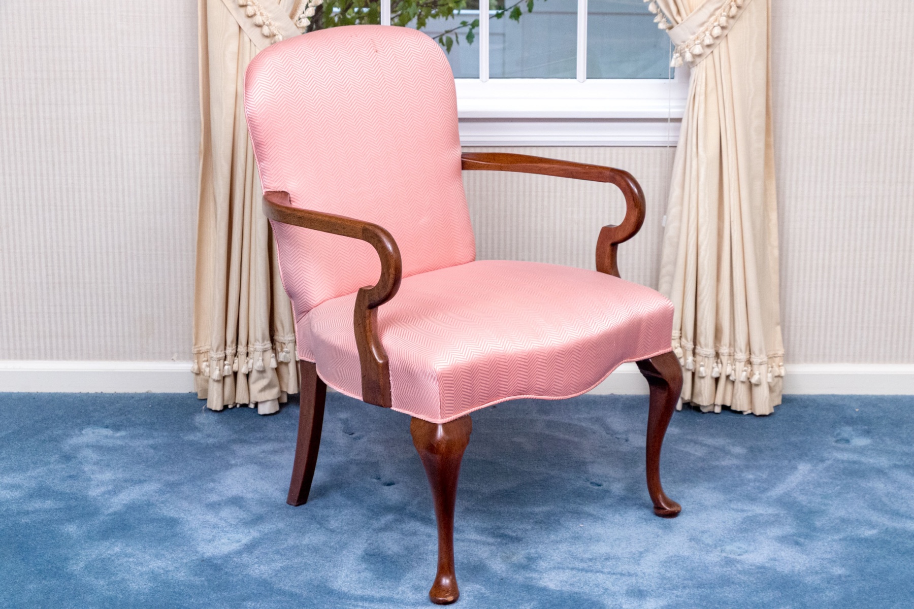 A beautiful Queen Anne style shepherds crook armchair in mahogany raised on front carved cabriole legs with slipper feet; having back square saber form legs. Upholstered seat and seat back with a pink-salmon hued ground and herringbone pattern.