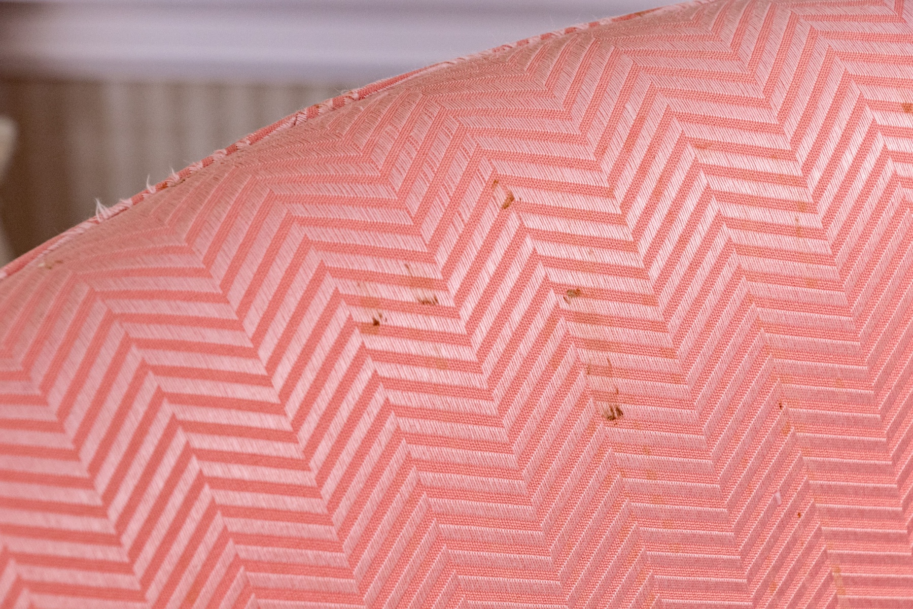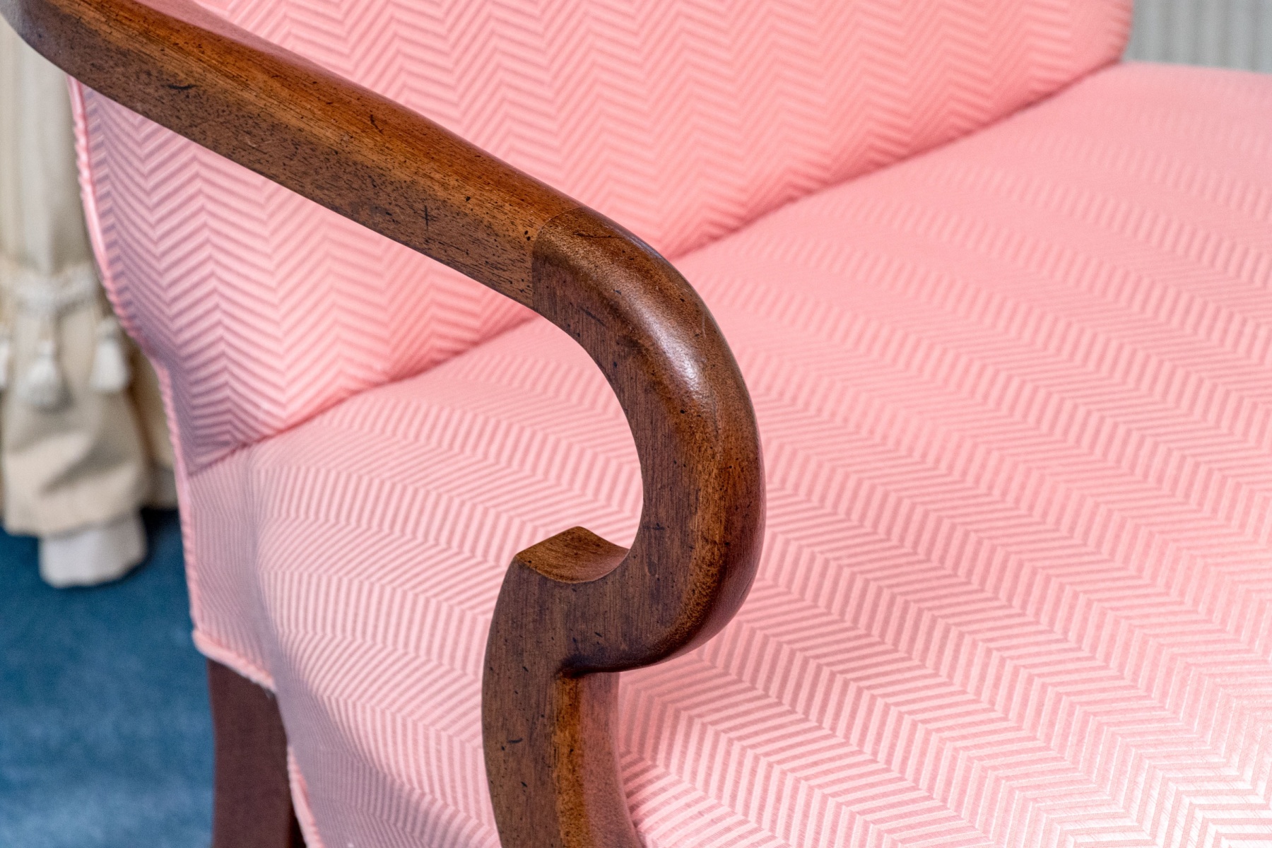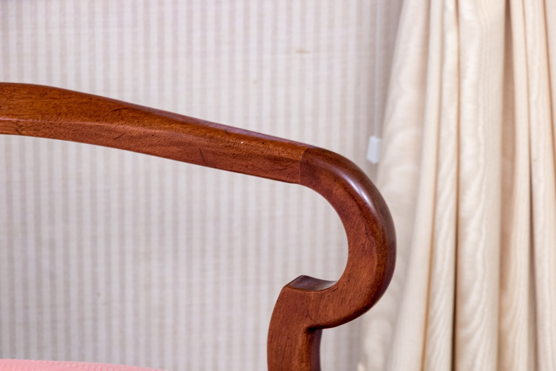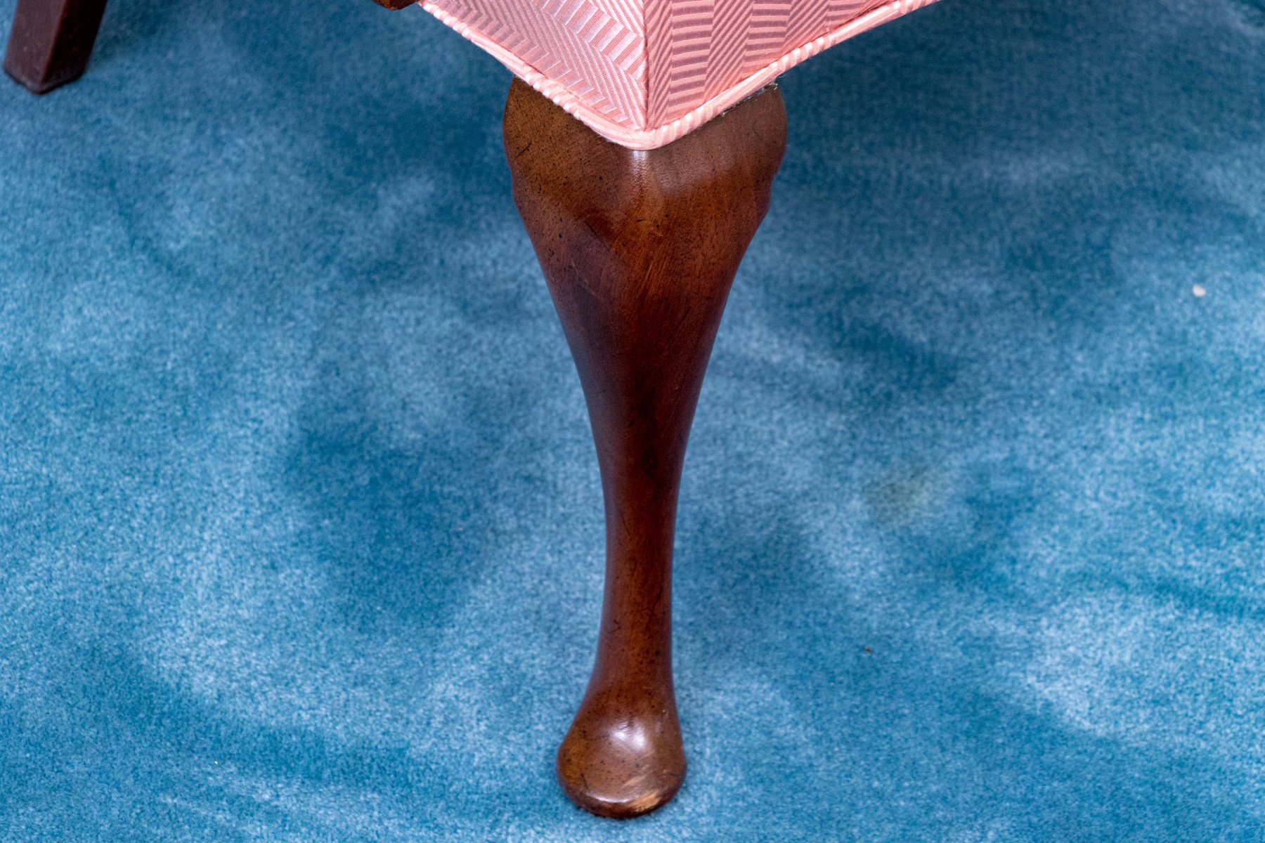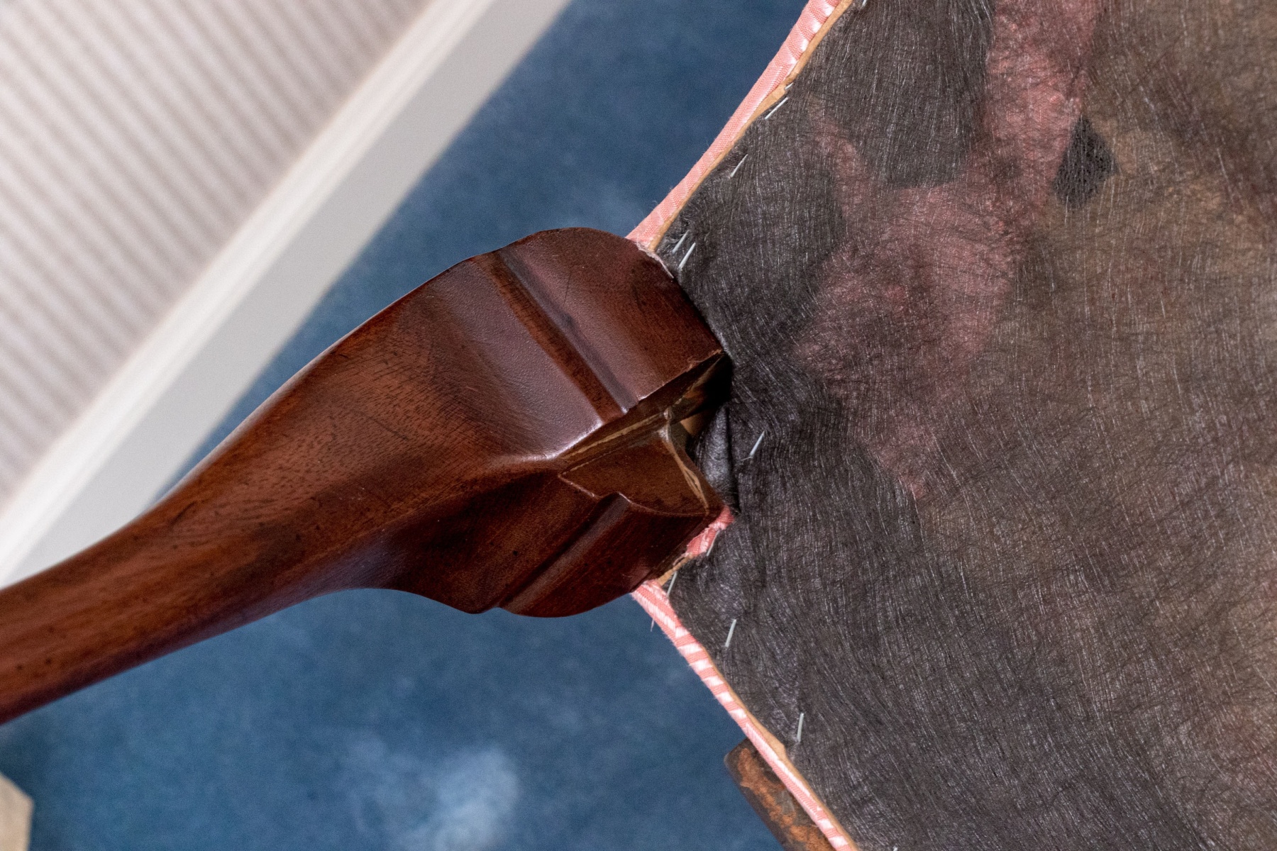 Stain spots to the seat back near top rail. Would make for a wonderful reupholstery project or can easily be enjoyed as is.