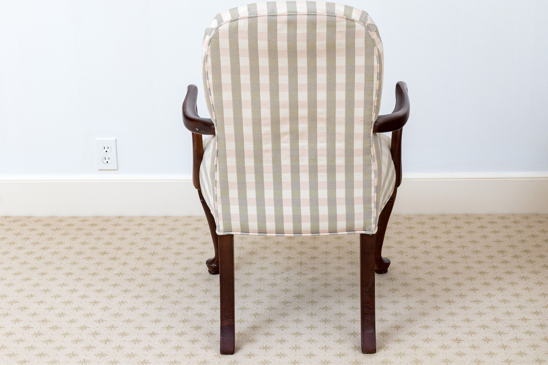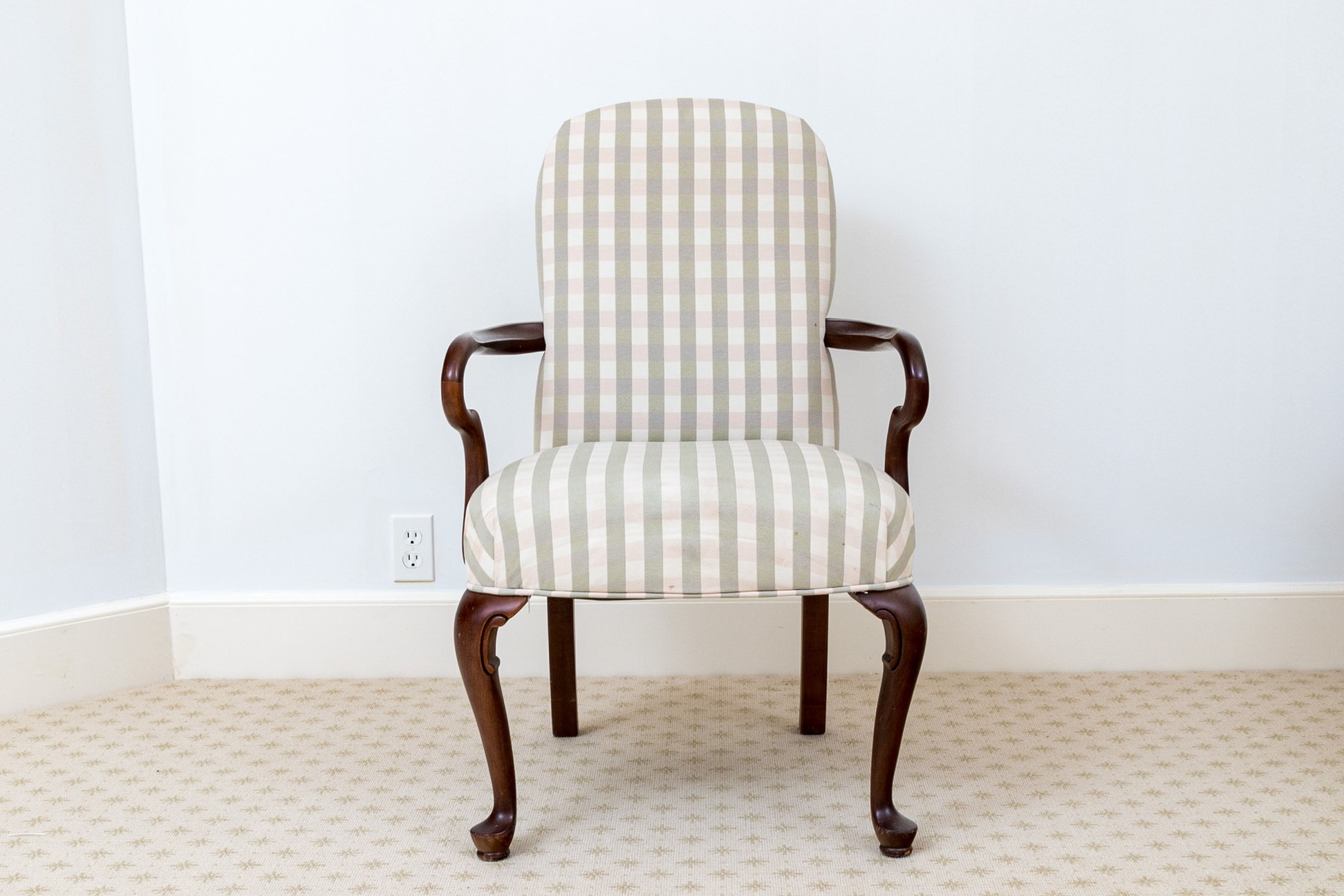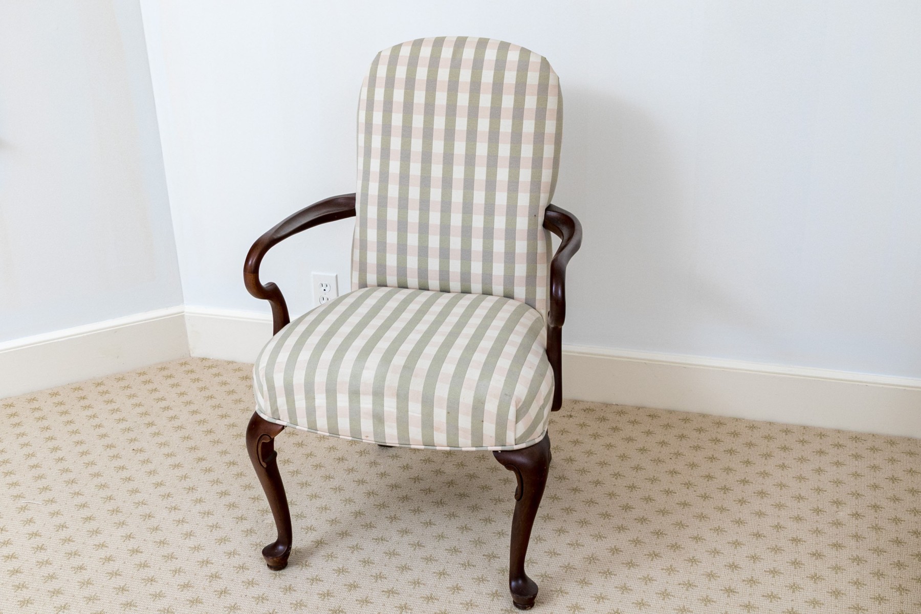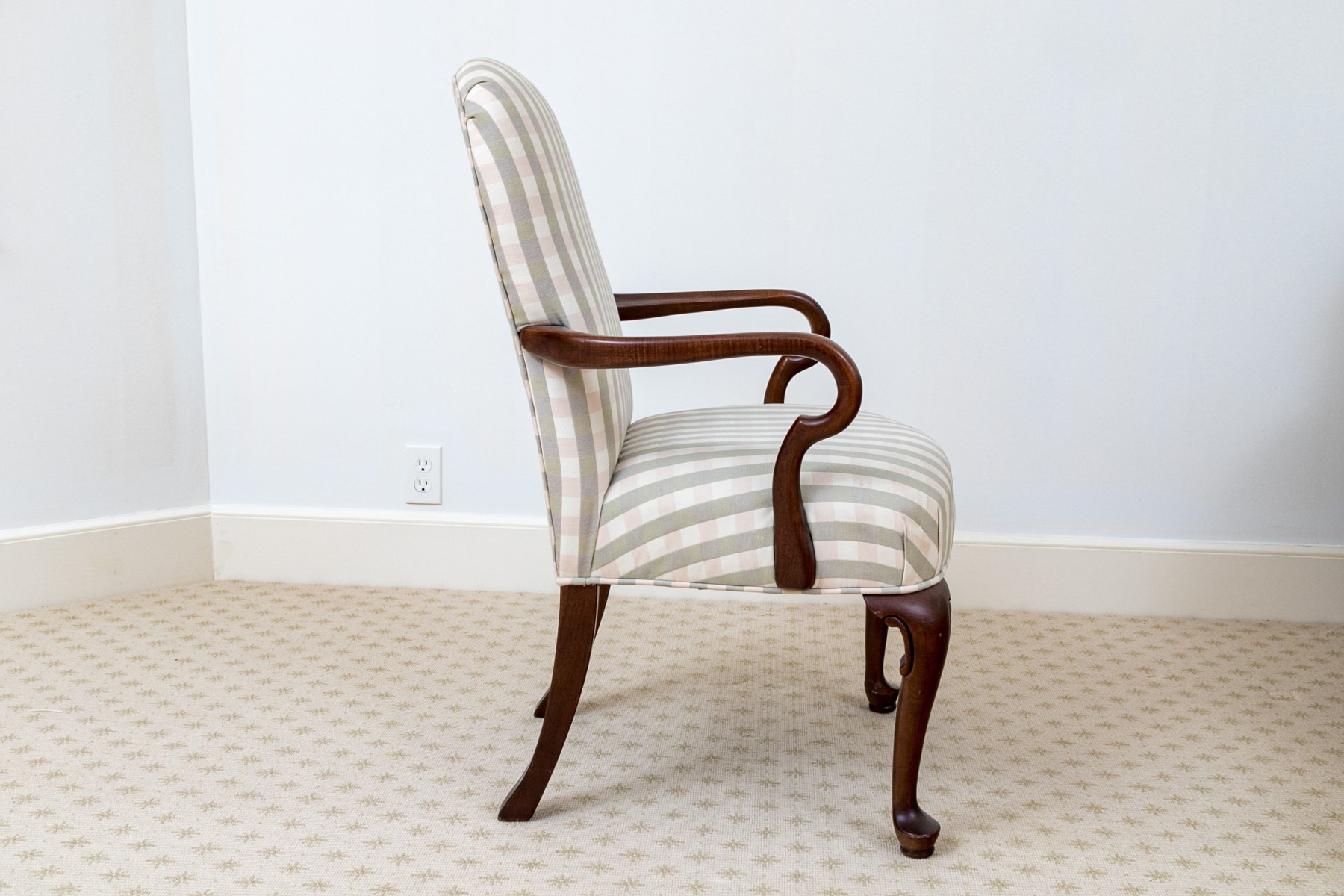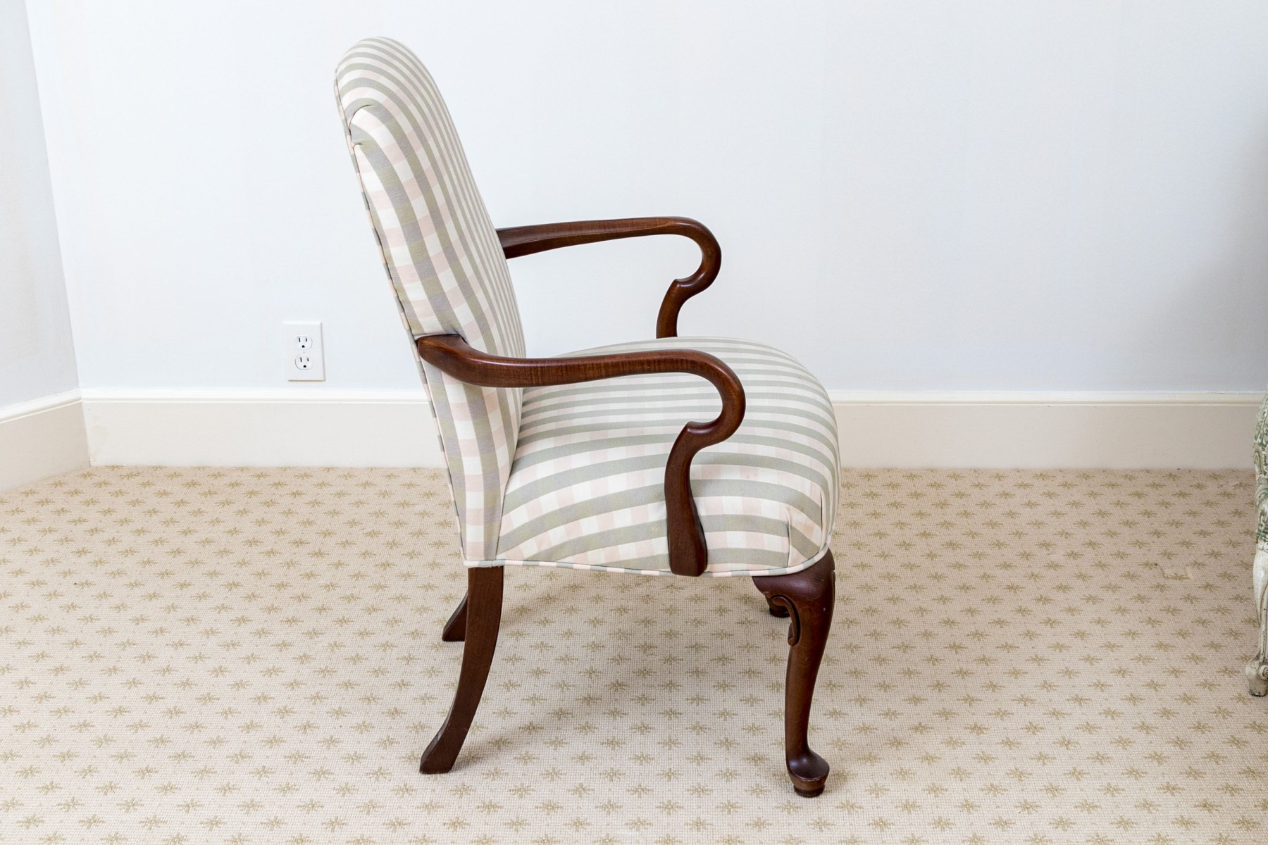 A charming Queen Anne style armchair showcasing a tall, arched back and rounded seat upholstered in appealing pale sage, pink, and white plaid fabric. Elegantly designed with a richly hued red-brown mahogany frame including shapely gooseneck arms and cabriole front legs on spade feet.