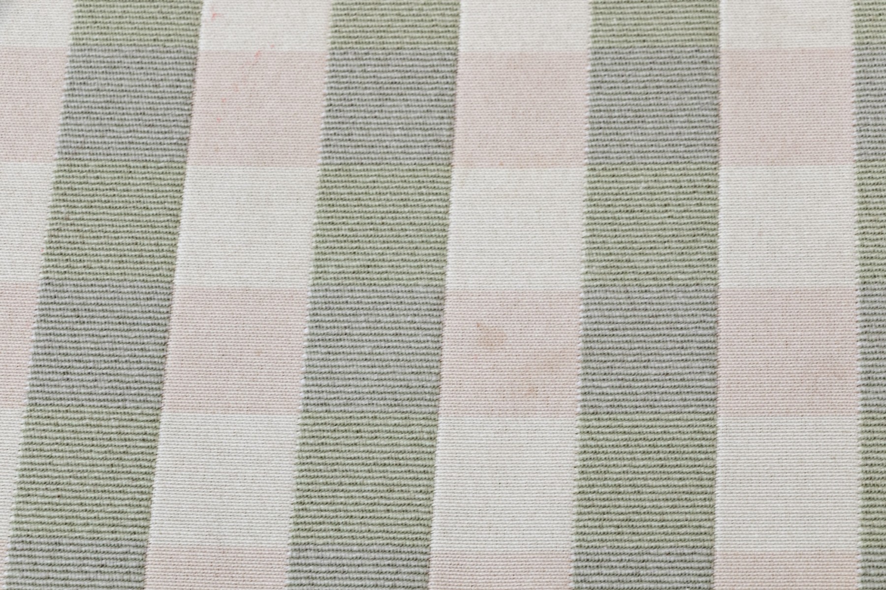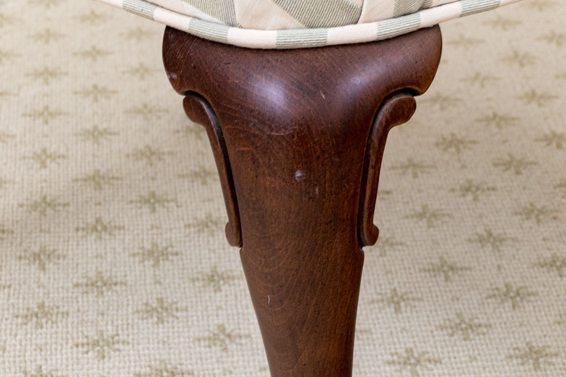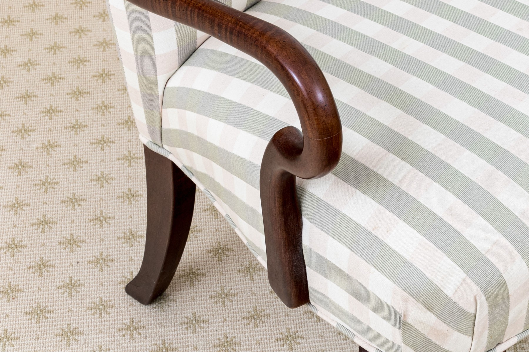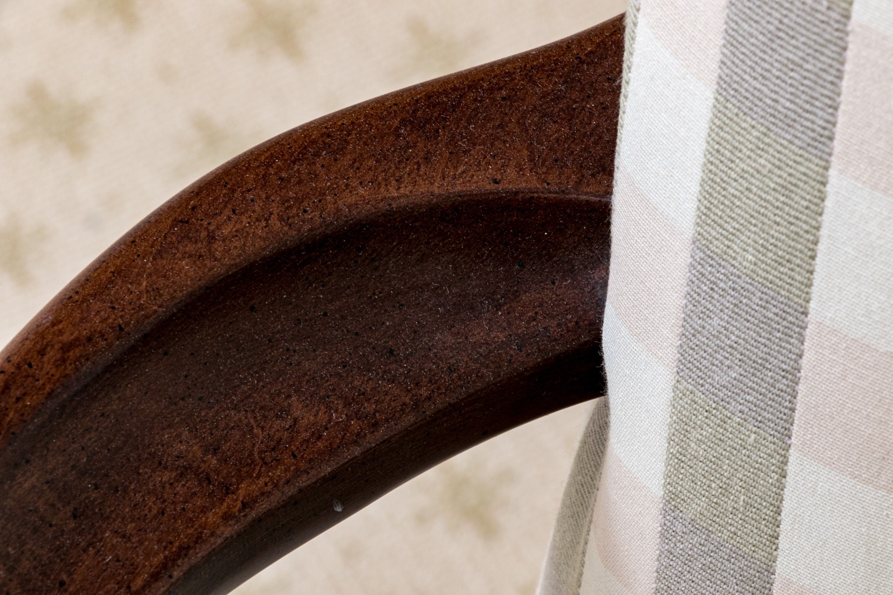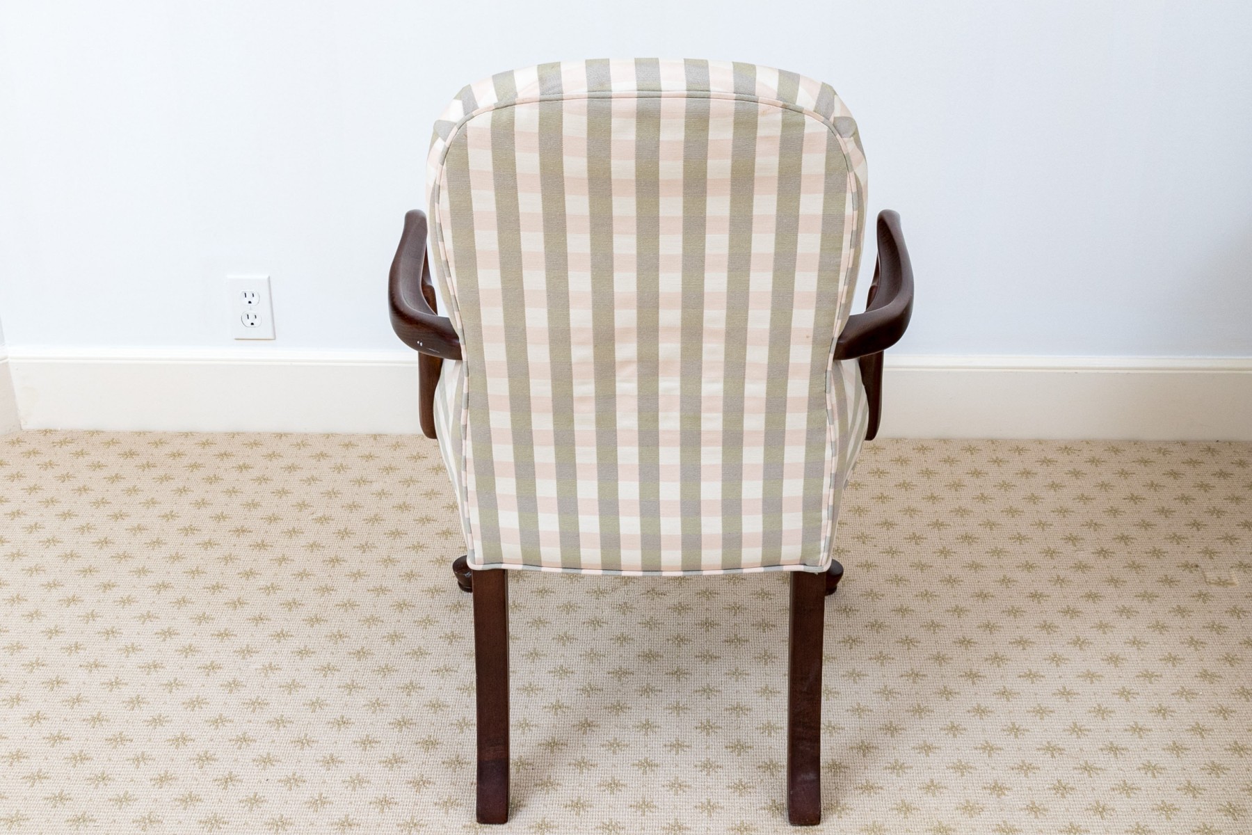 A charming Queen Anne style armchair showcasing a tall, arched back and rounded seat upholstered in appealing pale sage, pink, and white plaid fabric. Elegantly designed with a richly hued red-brown mahogany frame including shapely gooseneck arms and cabriole front legs on spade feet.