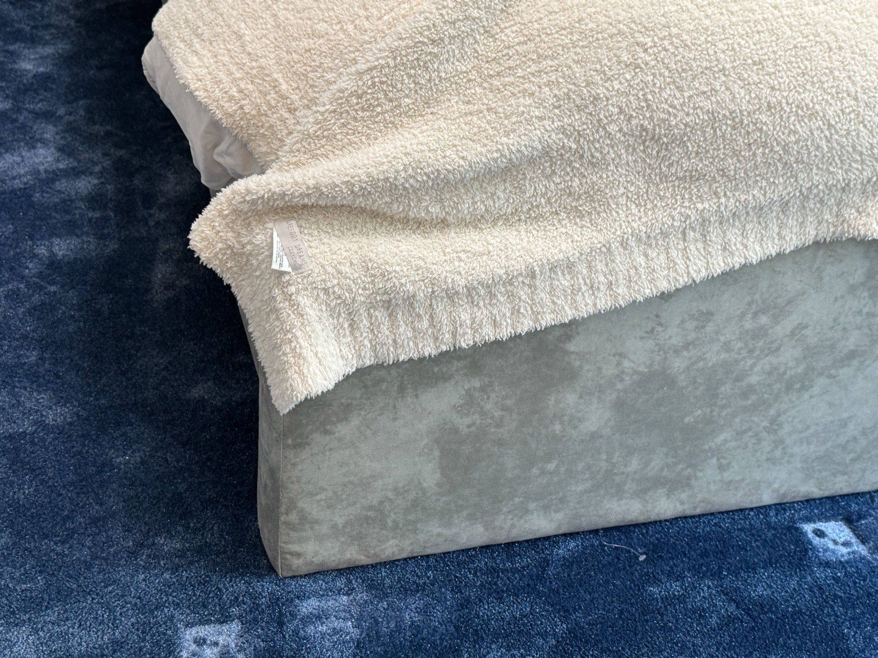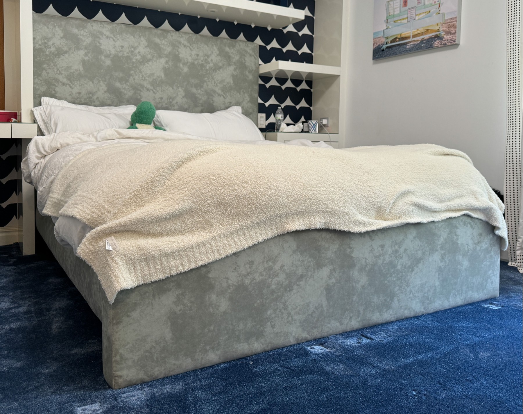 A modern queen size platform bed upholstered in mottled gray fabric over a minimalist form with a sleek rectangular headboard and footboard.