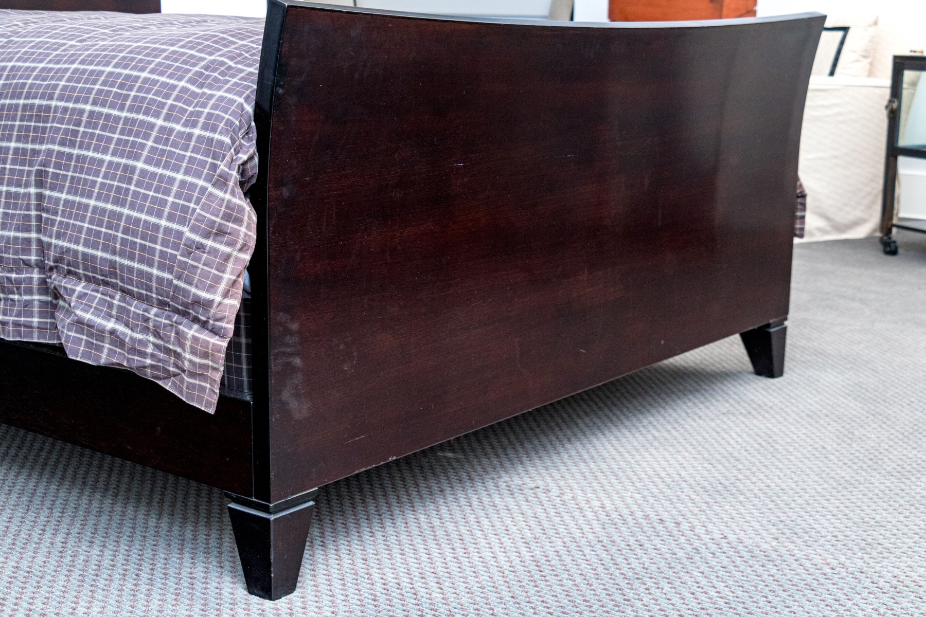 A stylish queen size bed frame with a sleek, angular sleigh form crafted from dark purple-brown wood with clean lines perfectly combining traditional elegance and contemporary flair. Raised on straight rectangular legs at the head and tapered wedge legs at the foot.