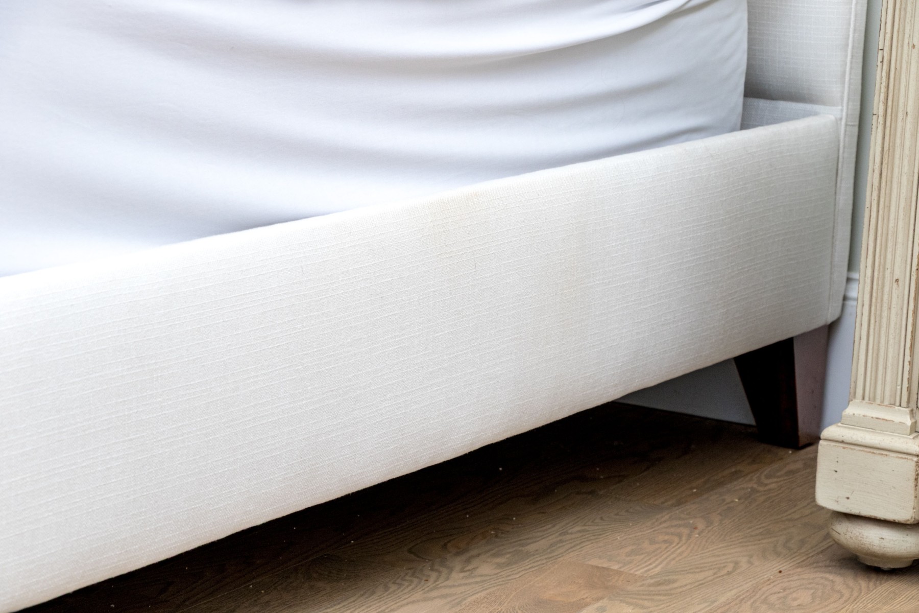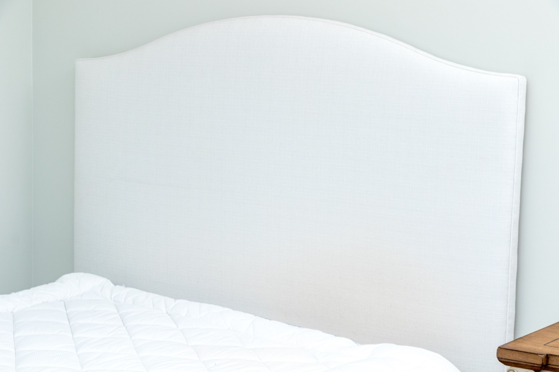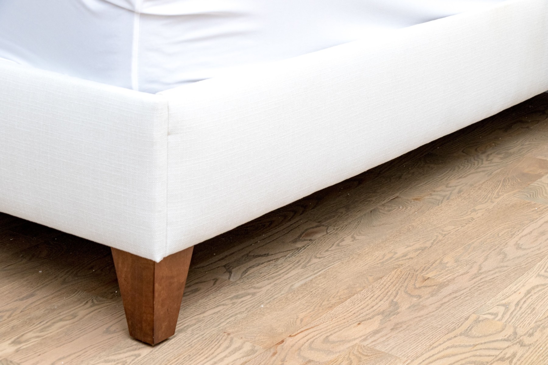 *Please note does not include box spring and mattress with bedding. Upholstered headboard with arched top rail. With upholstered frame and stained, carved legs.  Three bars underneath to support the box spring.