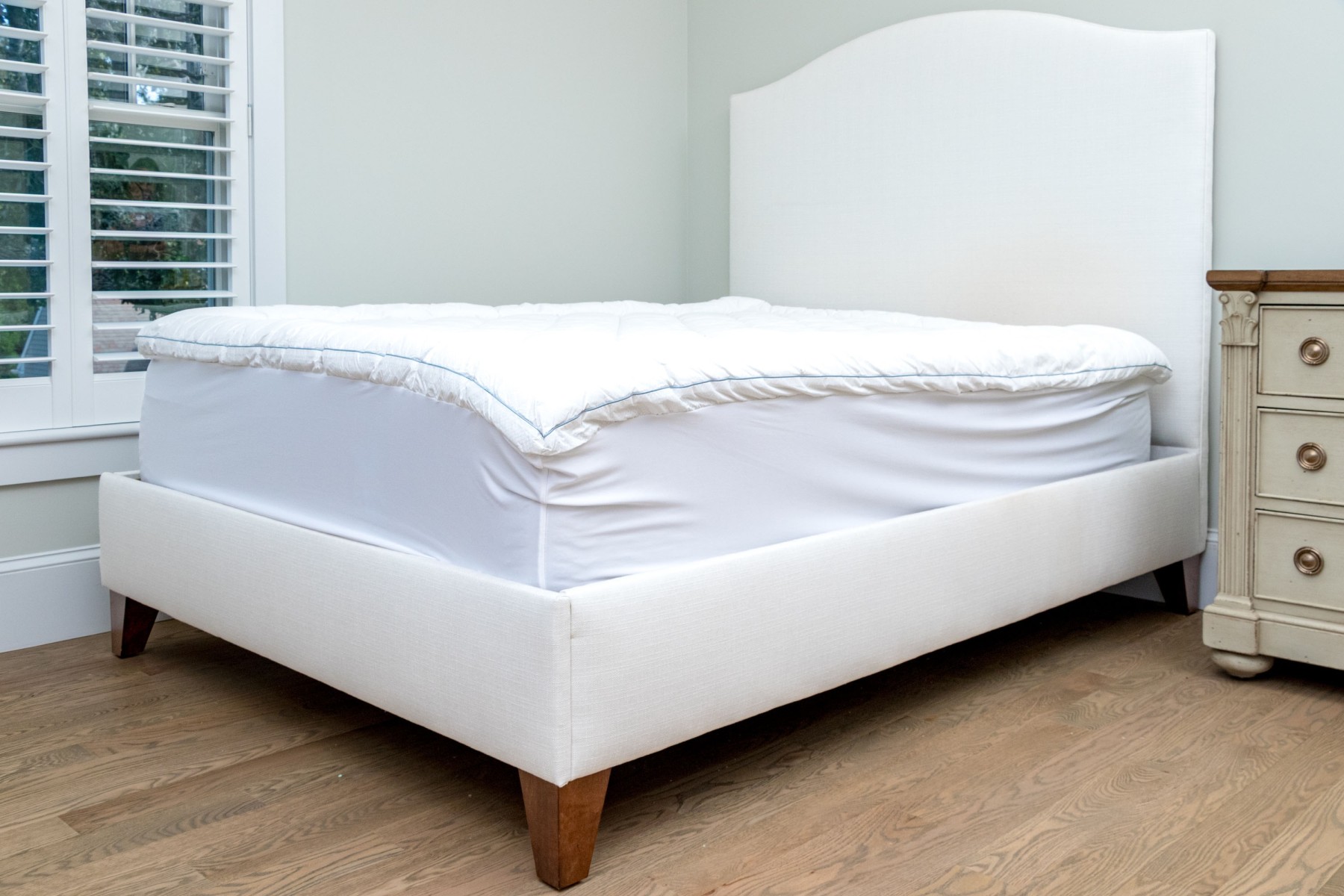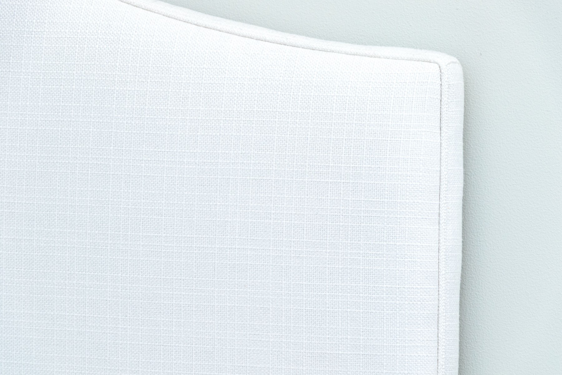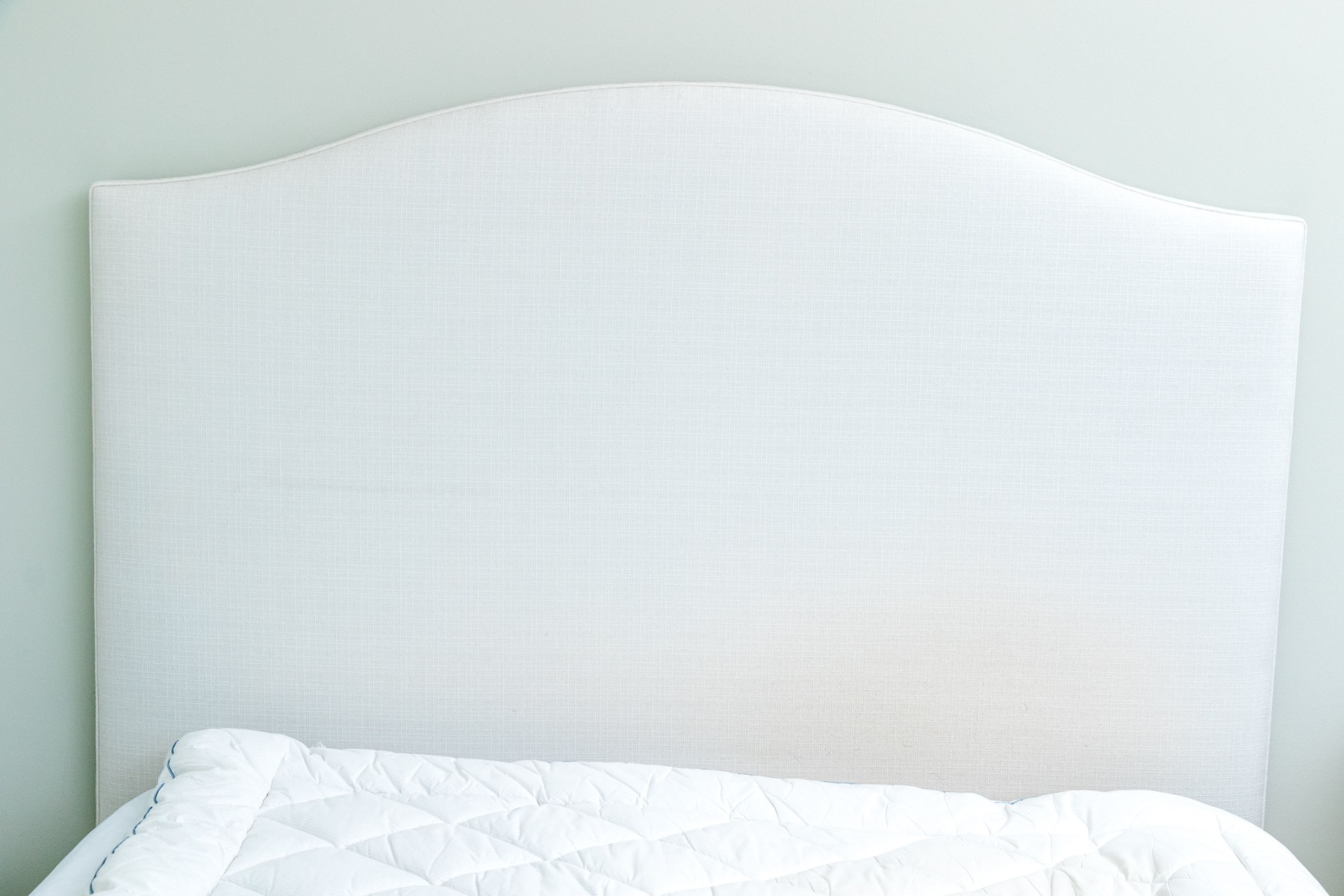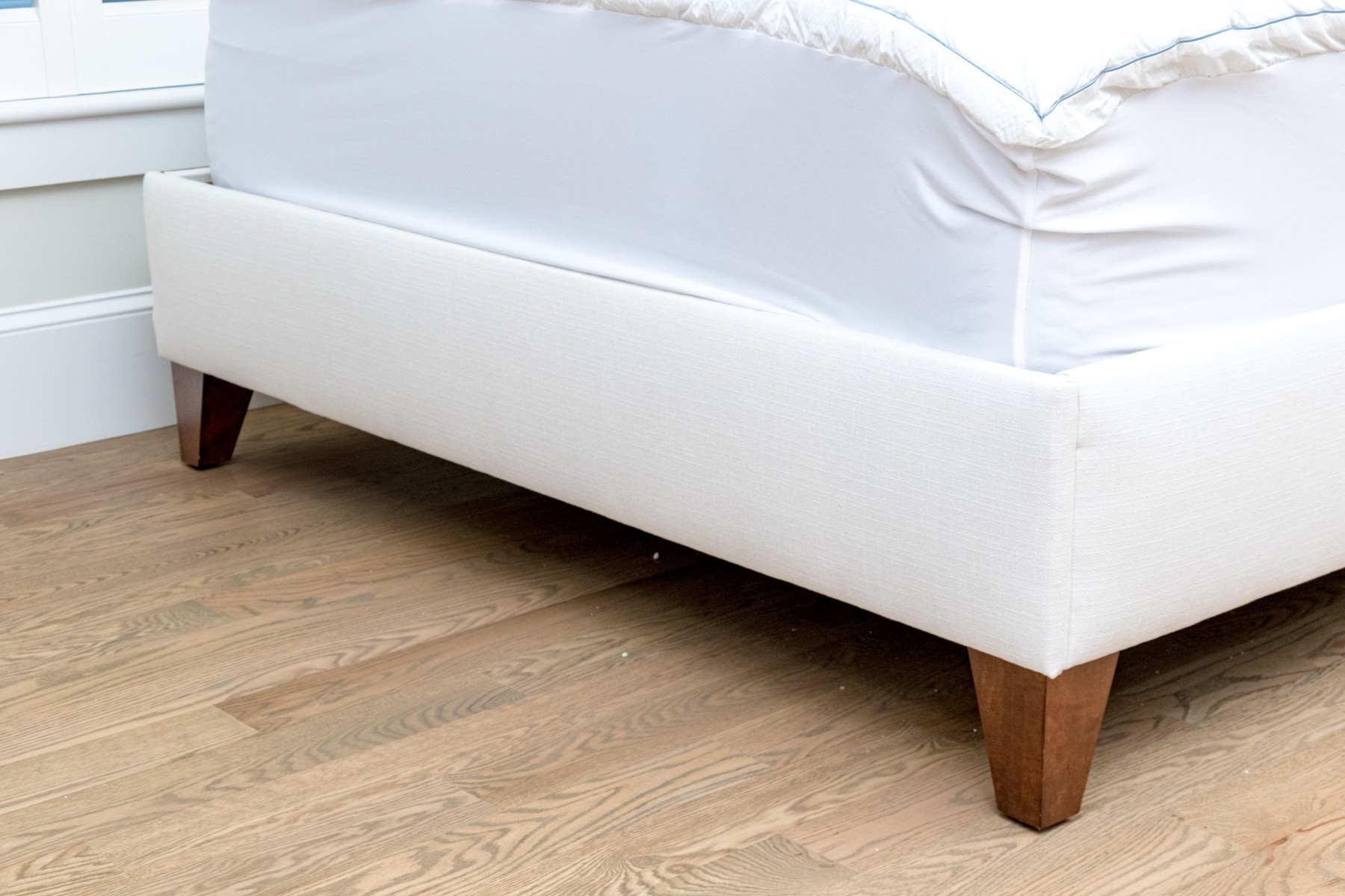 *Please note does not include box spring and mattress with bedding. Upholstered headboard with arched top rail. With upholstered frame and stained, carved legs.  Three bars underneath to support the box spring.